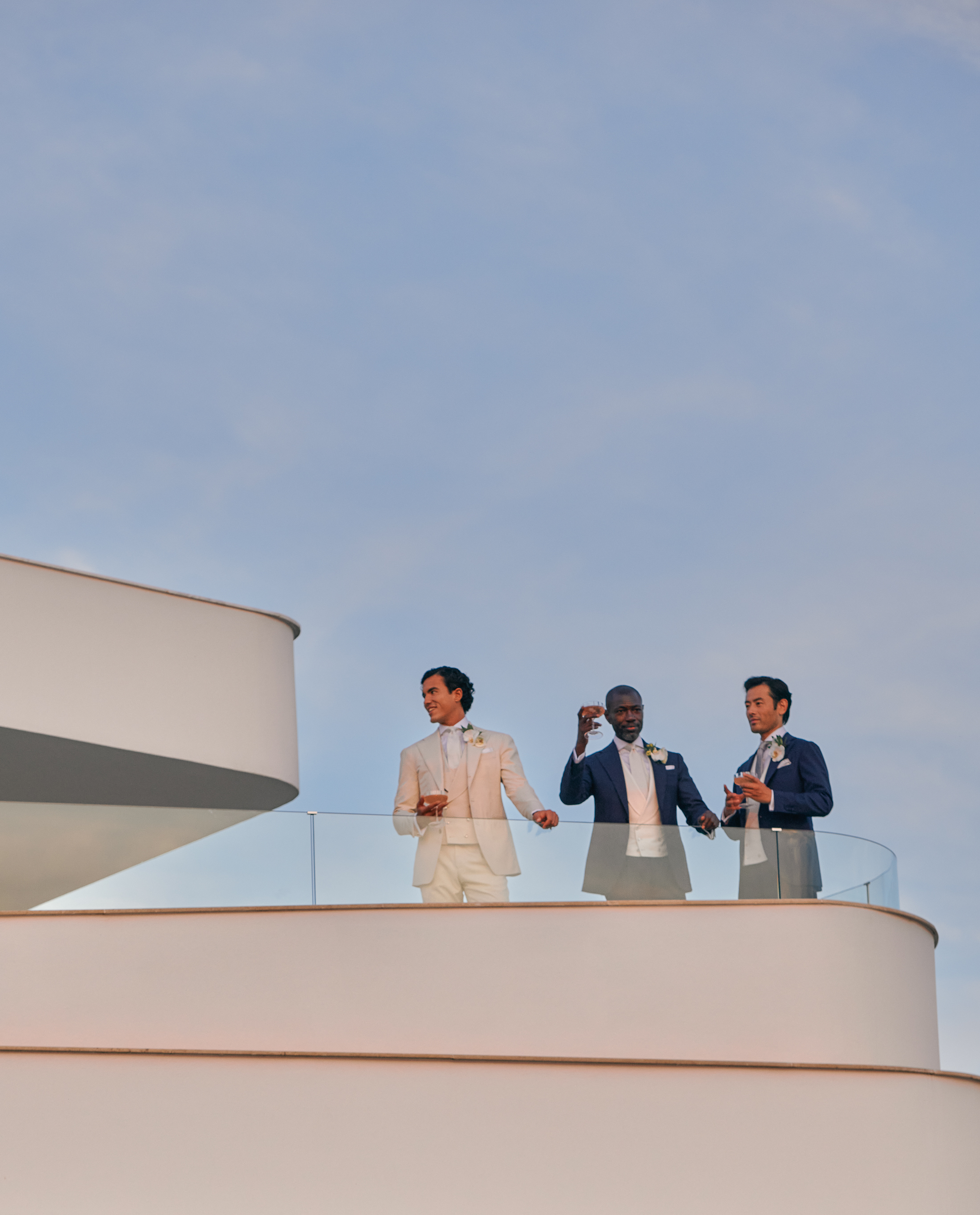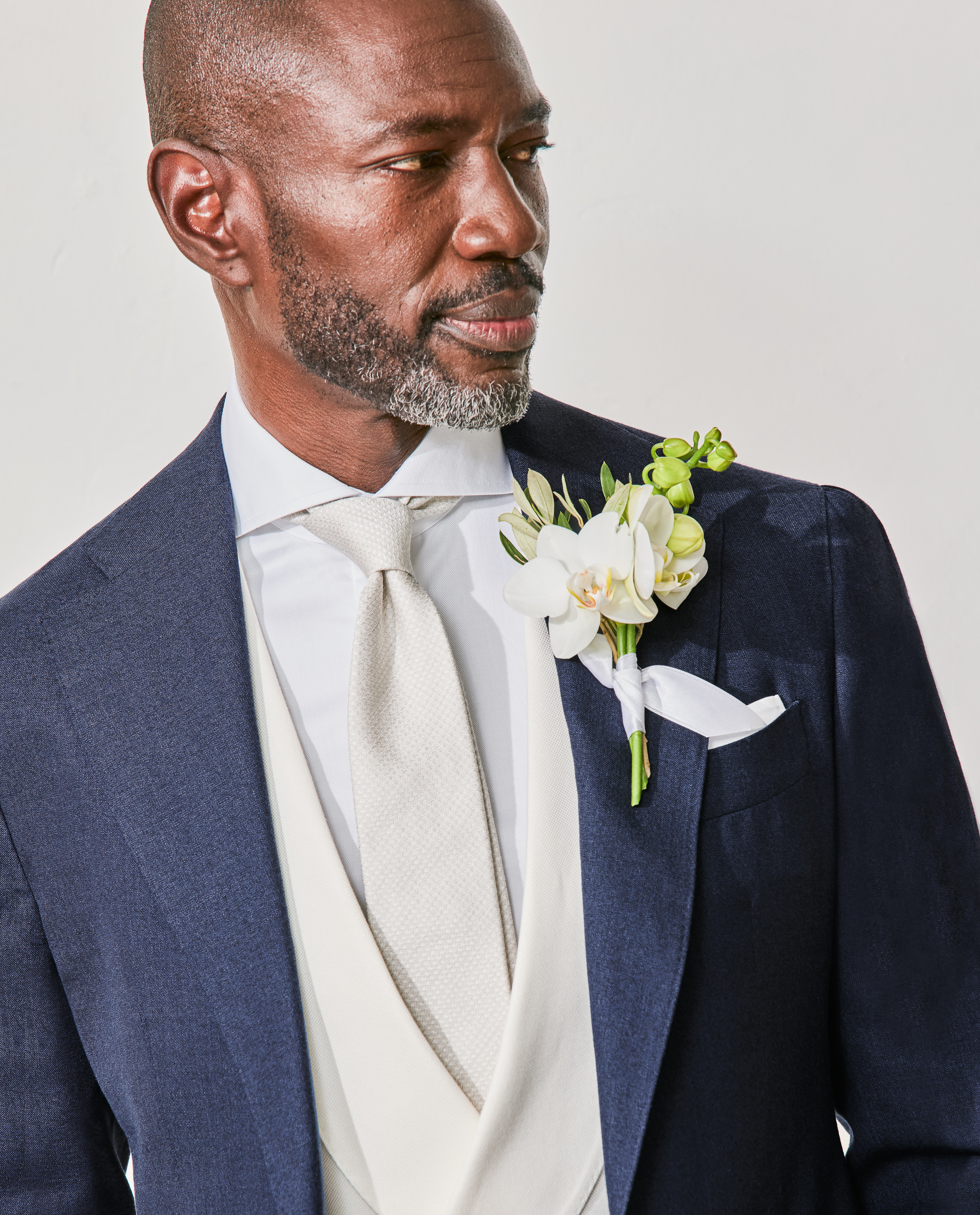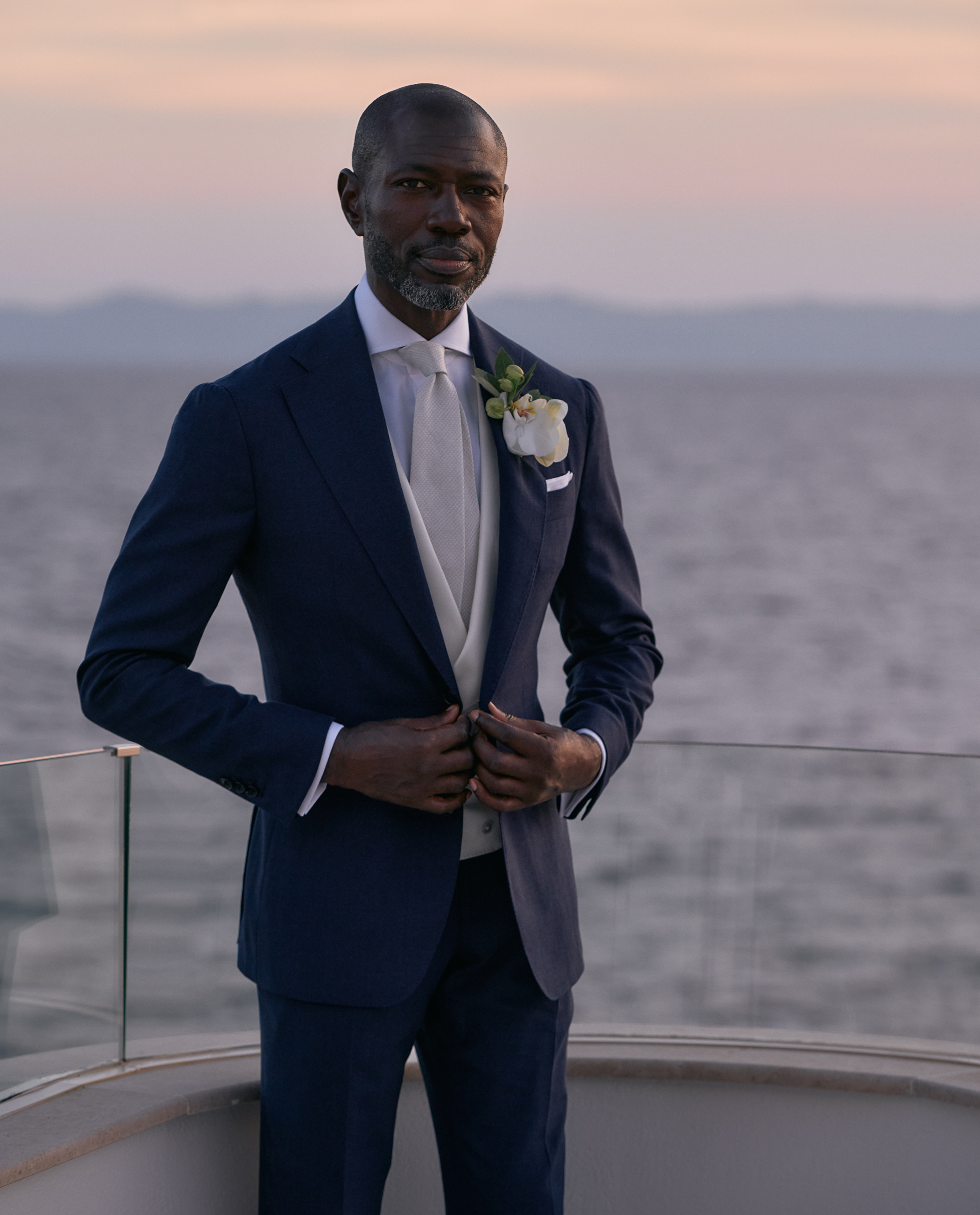 If blue and white are your colors, look no further than this wool-silk-linen suit in calming Neapolitan blue, elevated by a subtle, elegant sheen and paired with an off-white double-breasted waistcoat. Created with tropical and destination weddings in mind from cooling Summertime® fabric, made in Italy by Loro Piana. Styled here for peak luxury with a white shirt, champagne tie, and polished blue penny loafers.