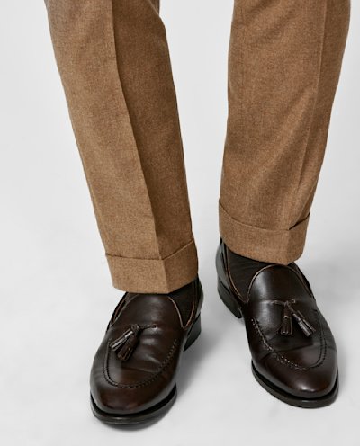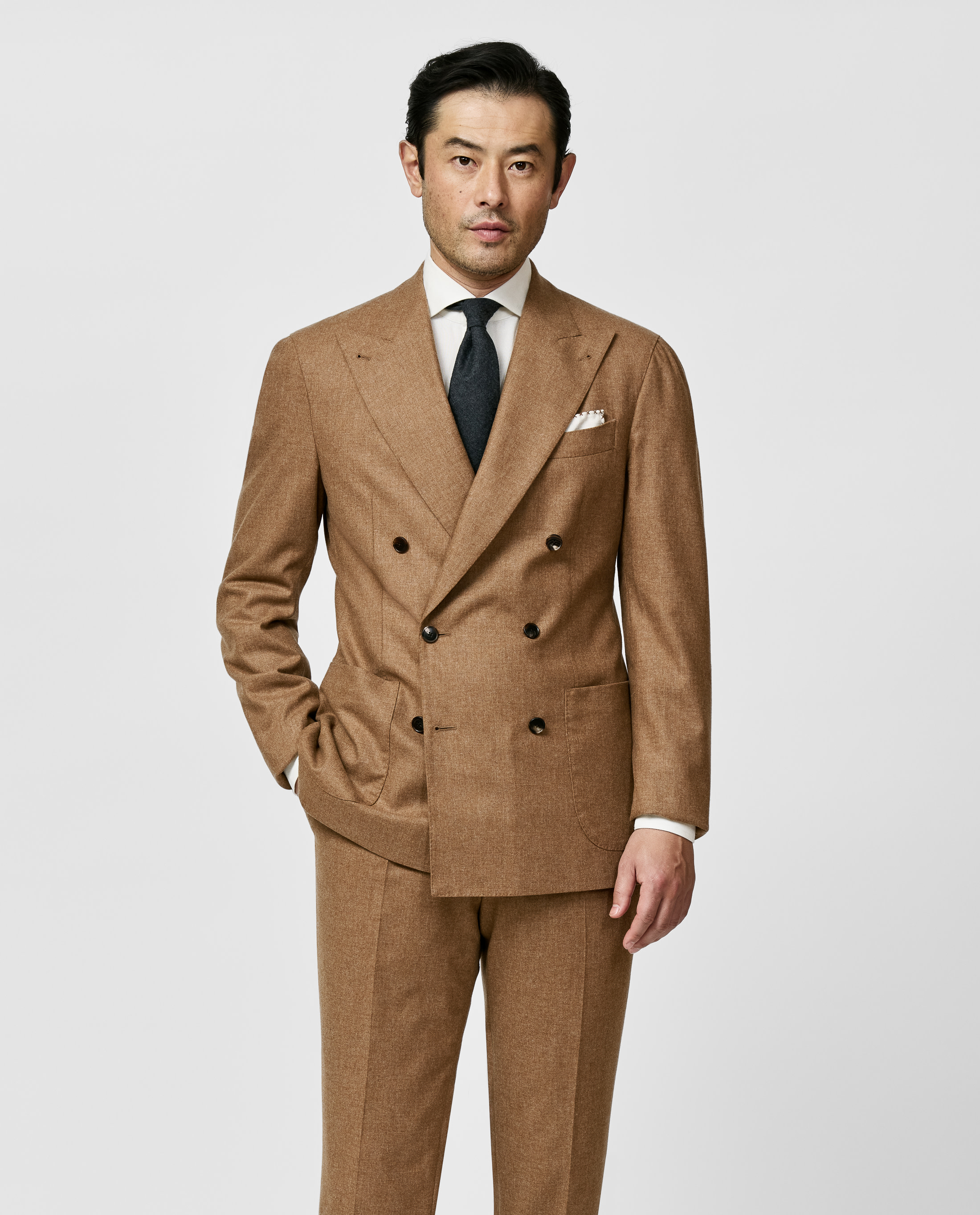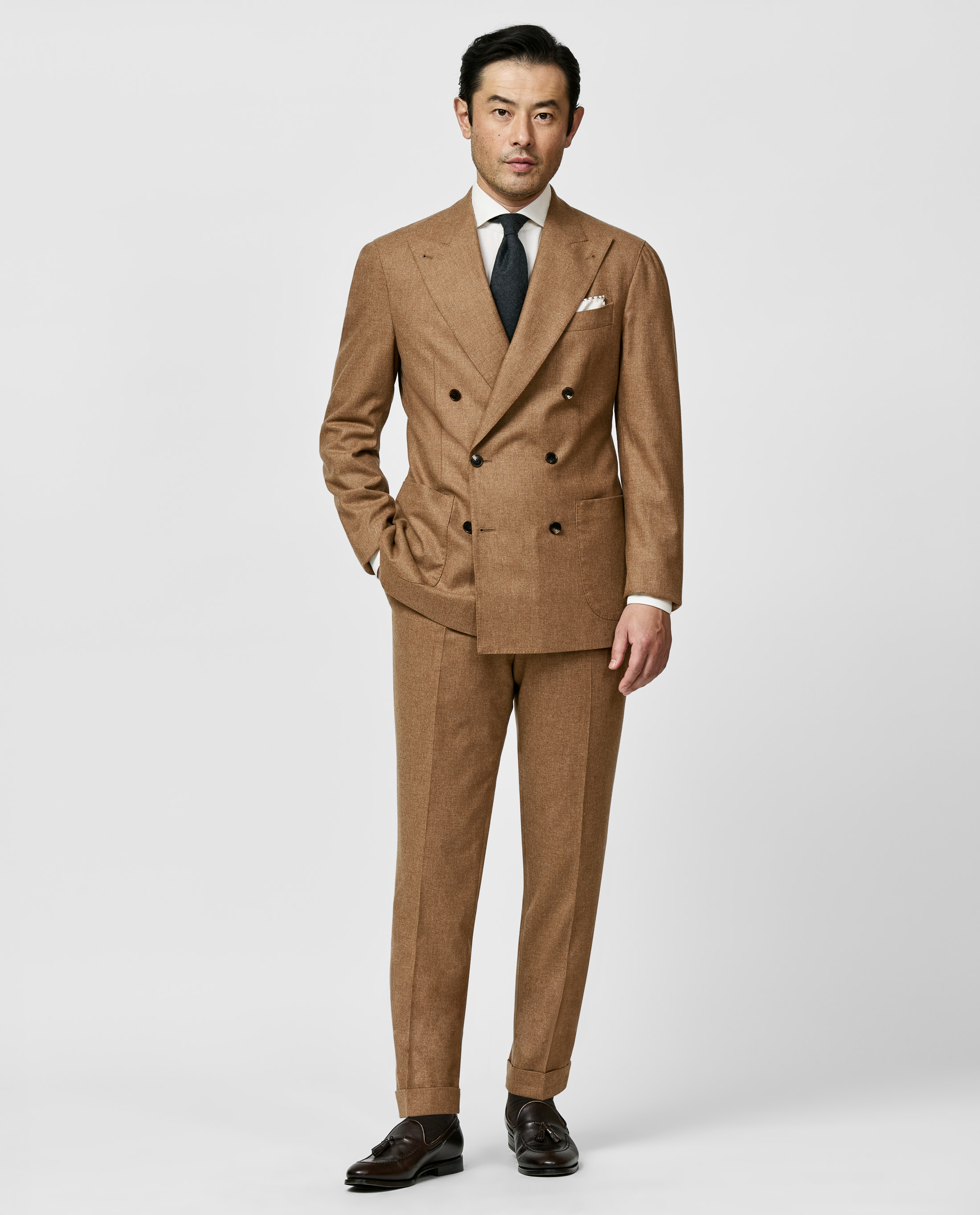 Crafted from a tropical plain weave, this camel wool-cashmere suit offers the softness of flannel with a brushed finish, creating a winter-ready fabric that balances breathability and refinement. Ideal for special occasions, the breathable construction ensures durability and comfort for formal wear that transitions seamlessly from refined to relaxed. Combine this suit with an ivory modal-wool shirt, beige pocket square, gray tie, and dark brown polished antique calk tassel loafers for a cohesive look. Make this suit your own with our many customization options to choose from.
