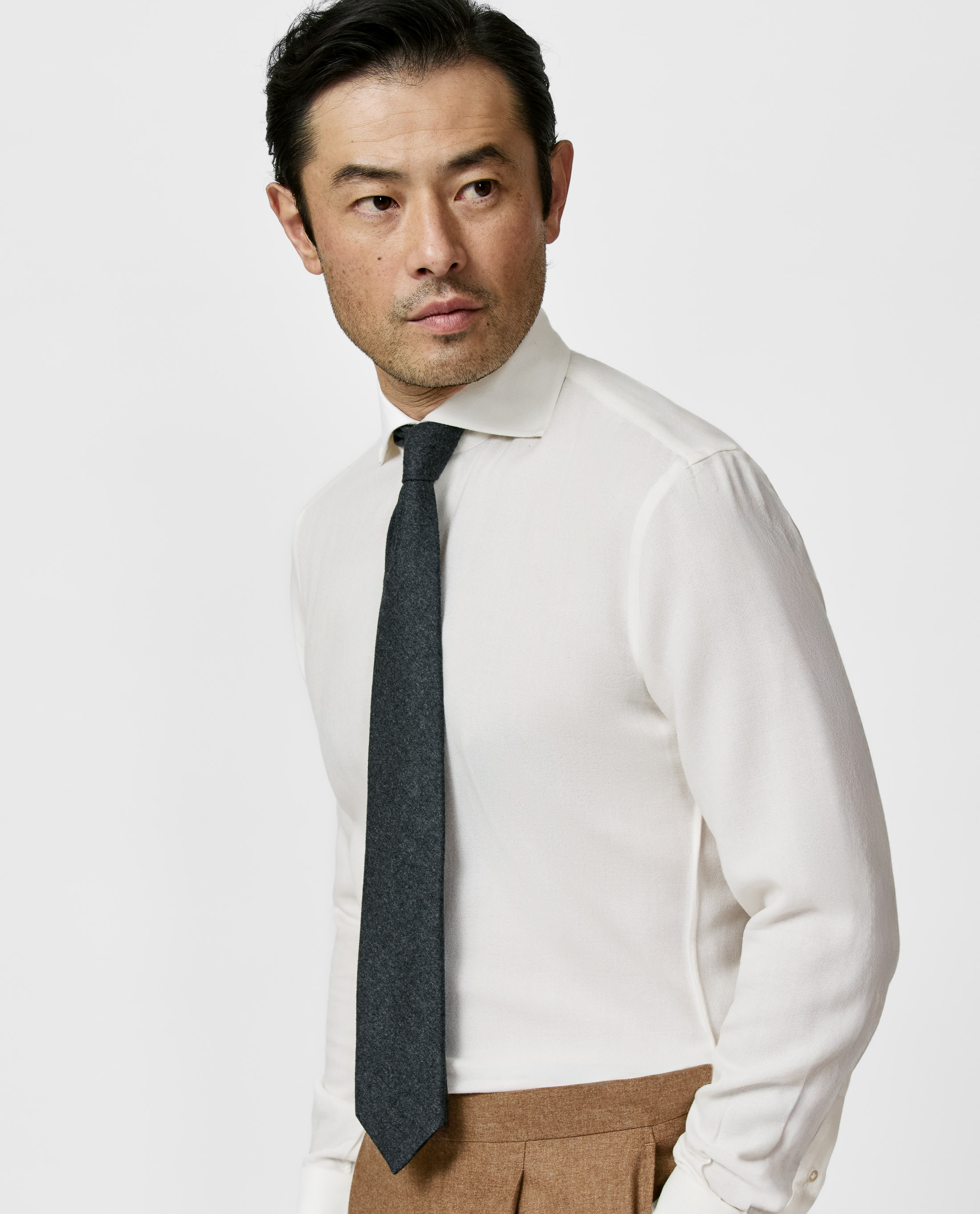 Relaxed summer days are complete with this multi-functional mouliné shirt in ivory. The unique blend combines the softness and elegant drape of modal with the thermoregulation and moisture management of merino wool. Together the fabric possesses a natural stretch for enhanced crease resistance and comfort too. Designed here with a cut-away collar. Make this shirt your own with our many customization options to choose from.