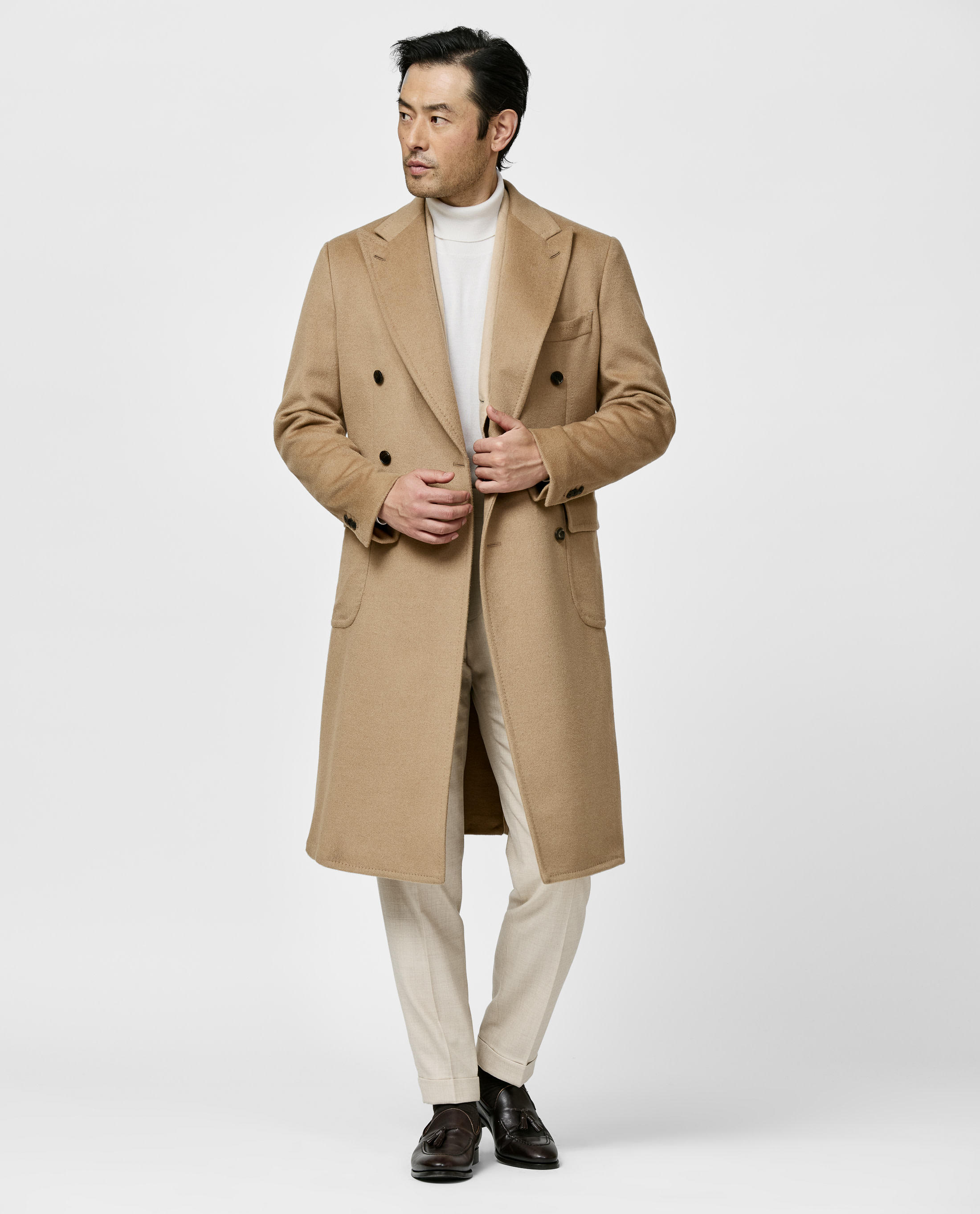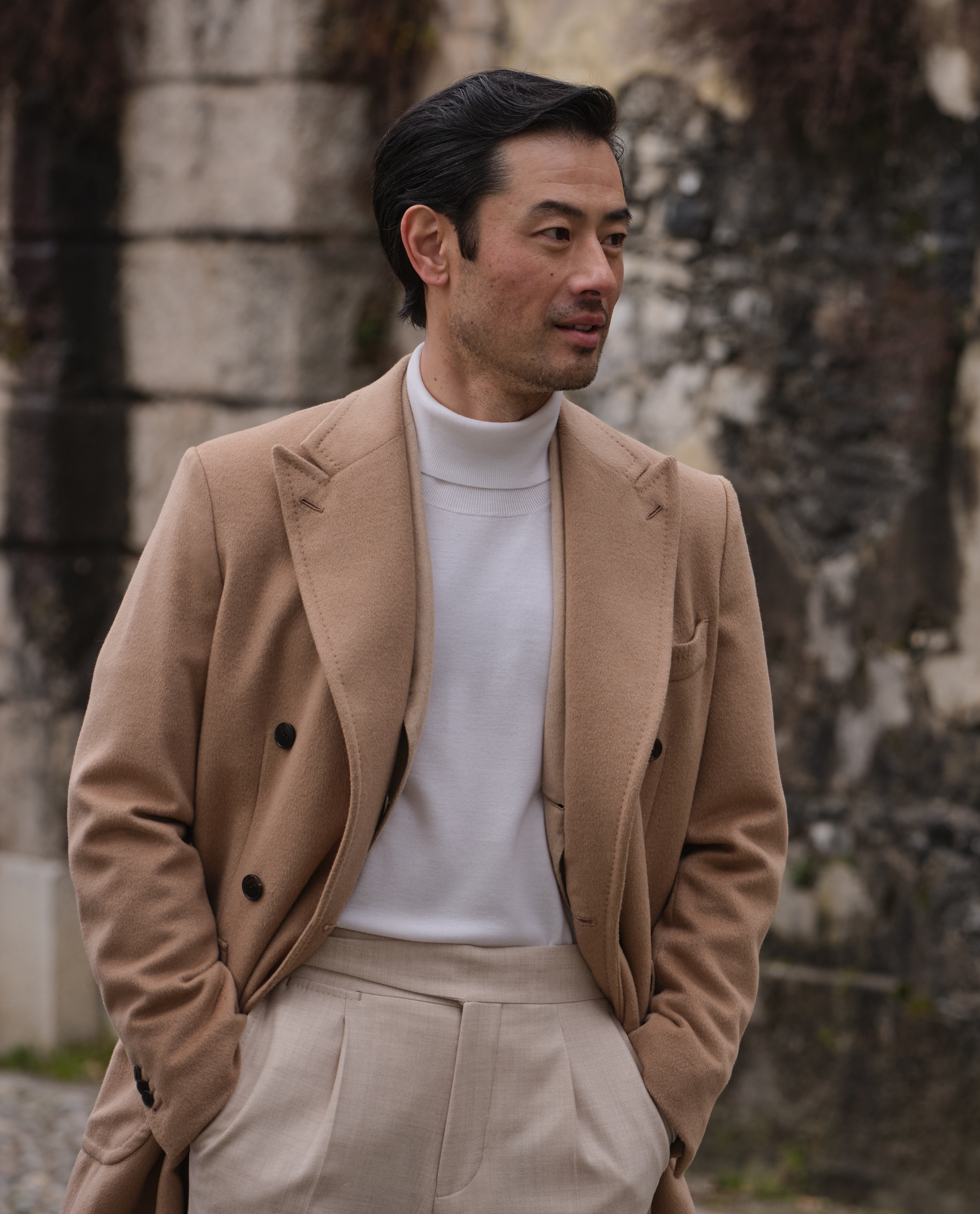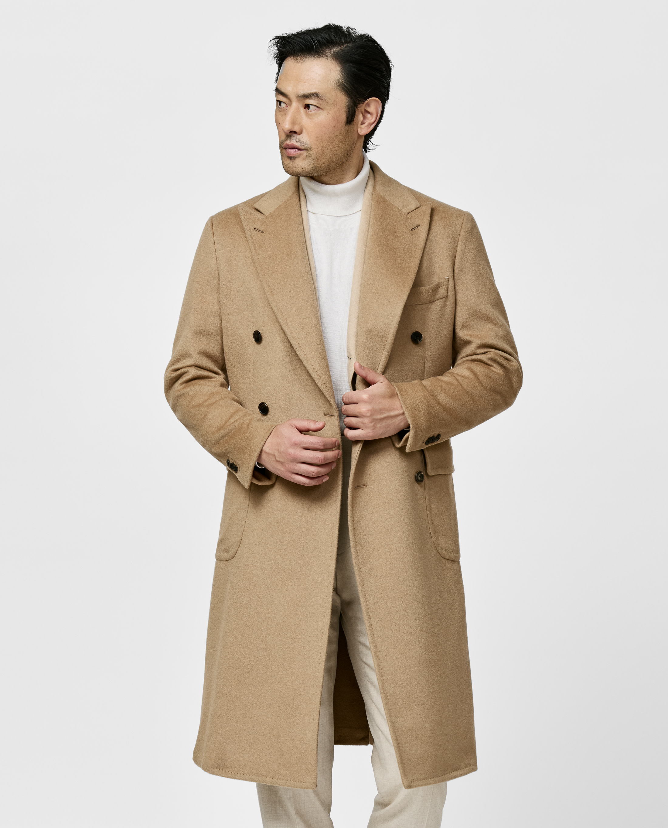 This soft caramel overcoat is crafted from the luxurious Bactrian camel fleece fabric made in Italy by Loro Piana. Sourced from the rare, noble fibers of baby camels in Mongolia, this ancestral quality is known for its exceptional softness, insulation, and natural color. Make this coat your own with our many customization options to choose from.