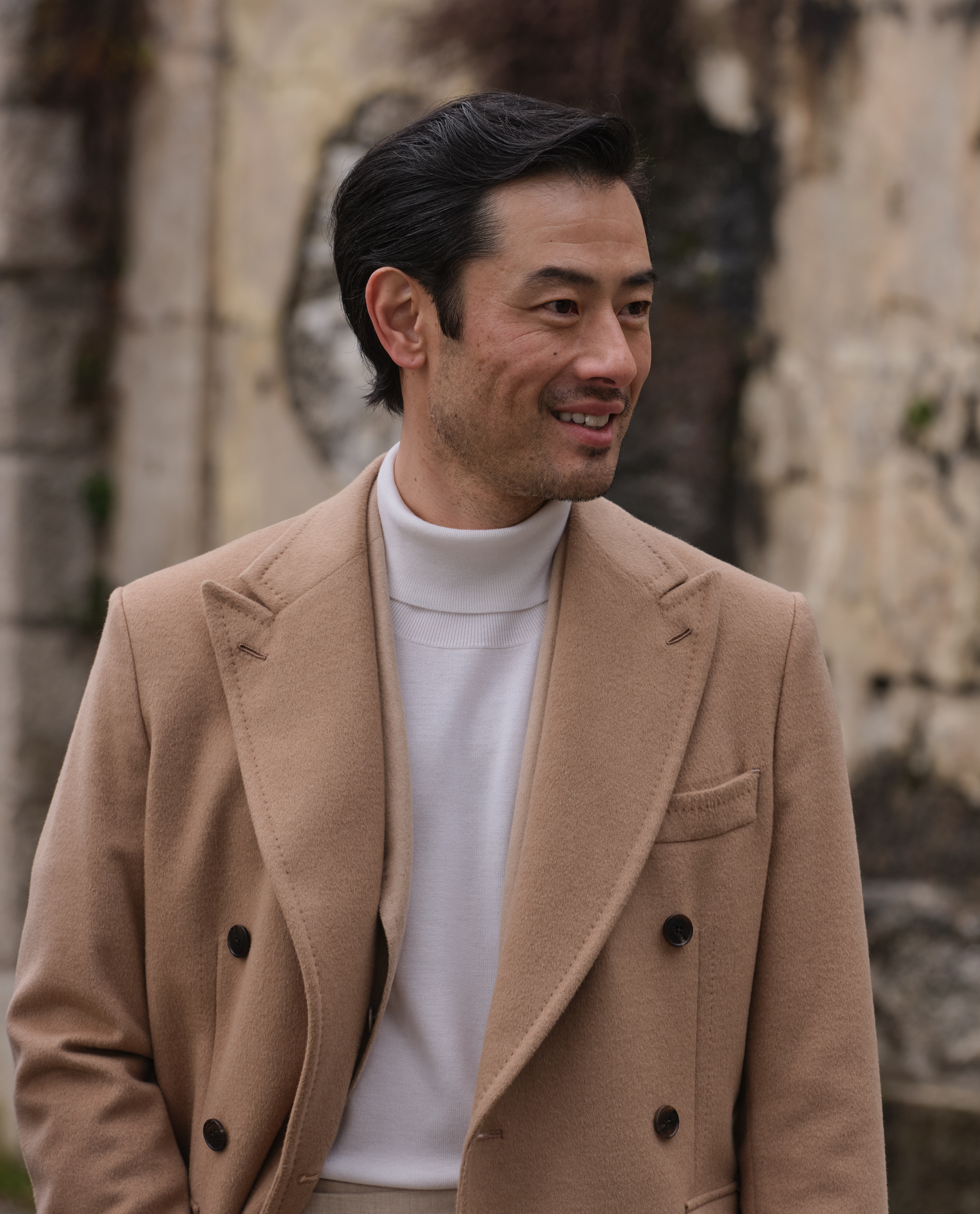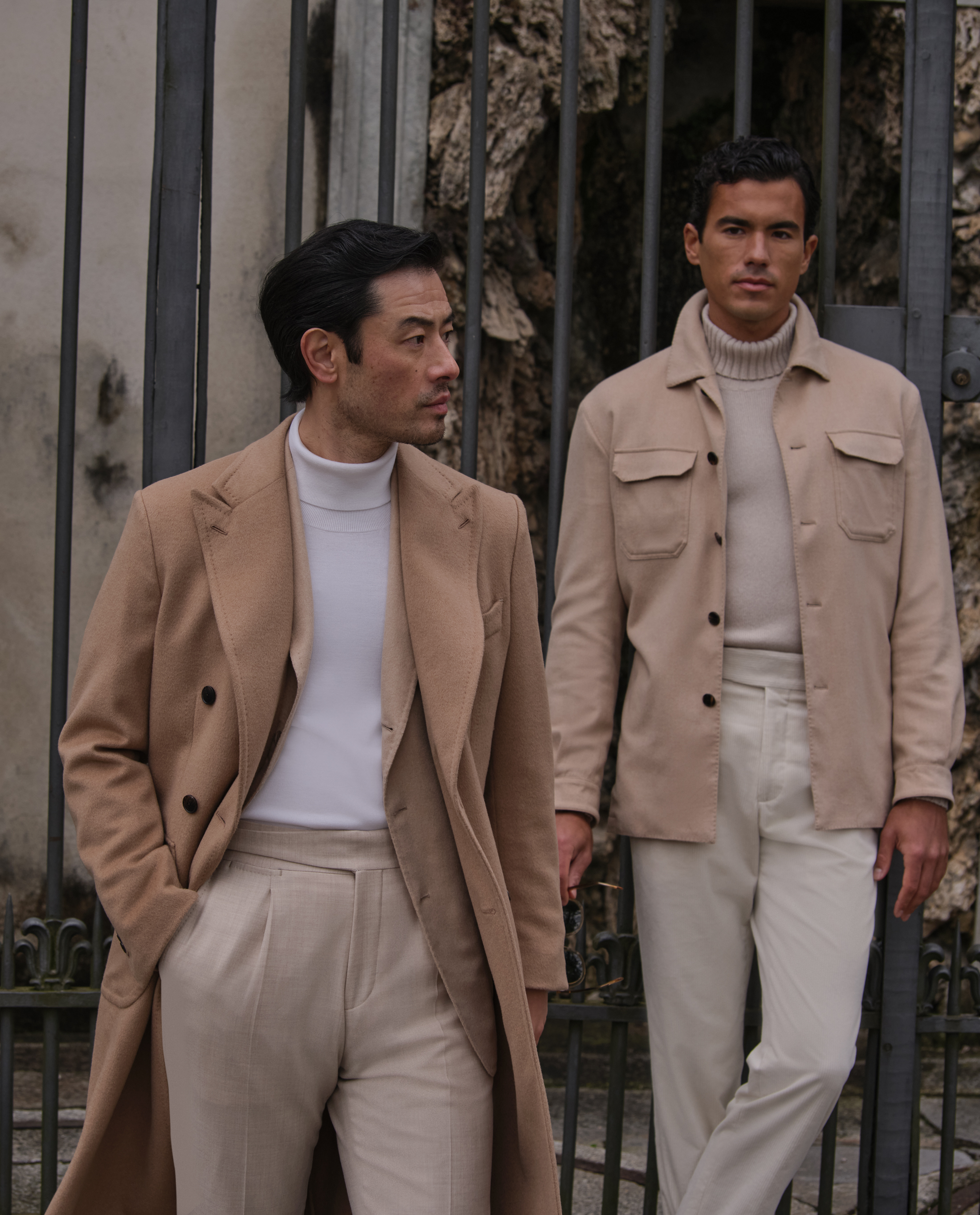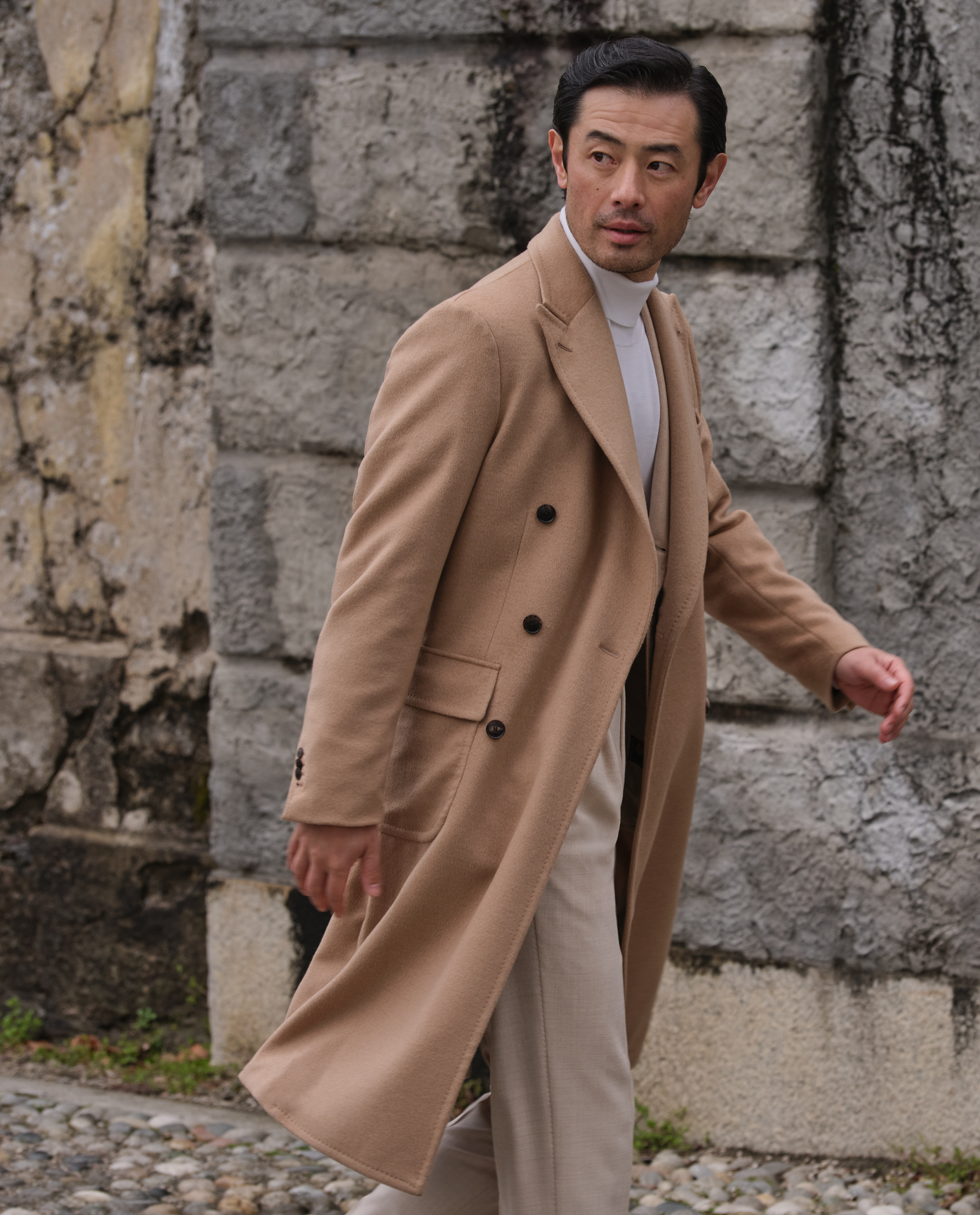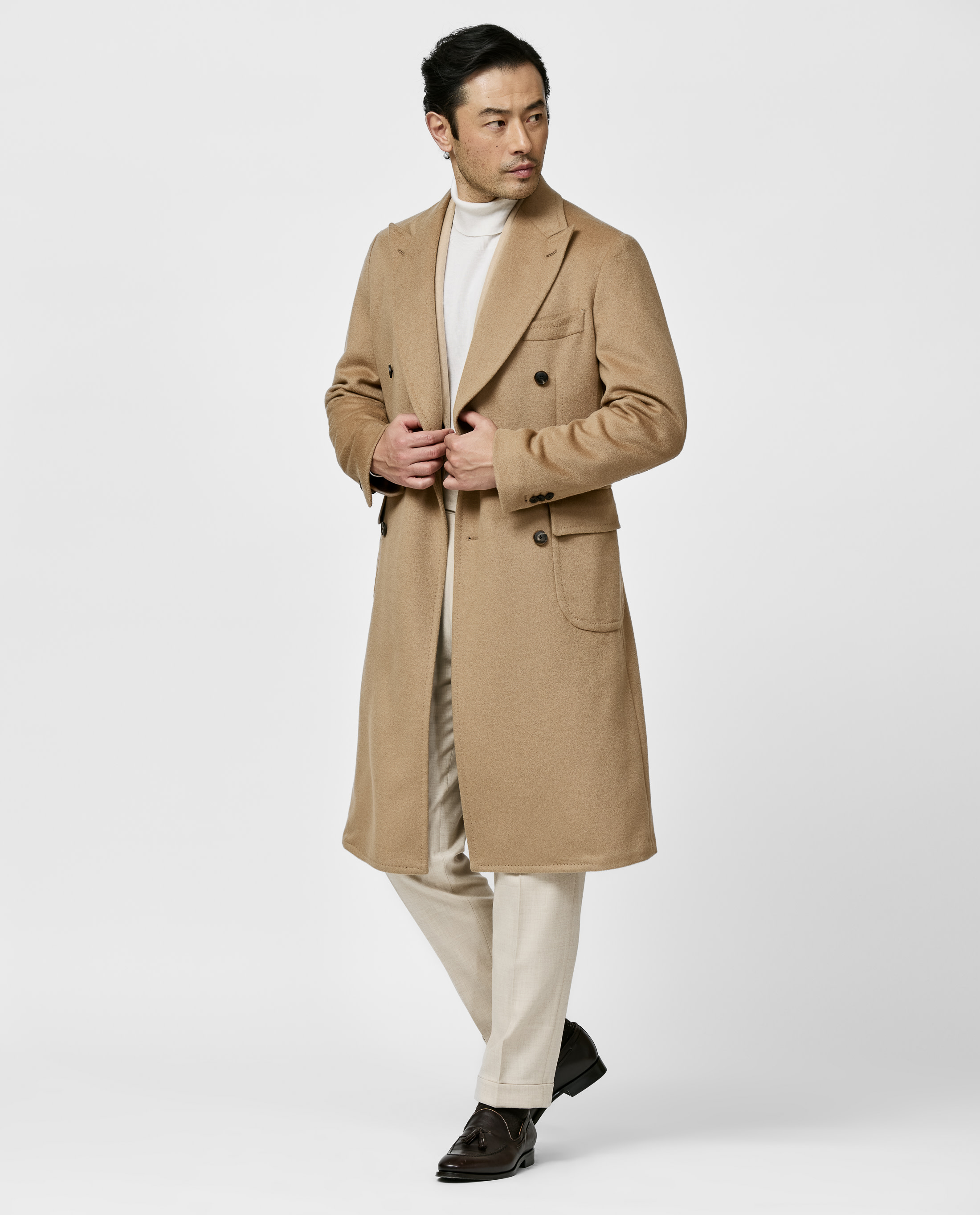 This soft caramel overcoat is crafted from the luxurious Bactrian camel fleece fabric made in Italy by Loro Piana. Sourced from the rare, noble fibers of baby camels in Mongolia, this ancestral quality is known for its exceptional softness, insulation, and natural color. Make this coat your own with our many customization options to choose from.