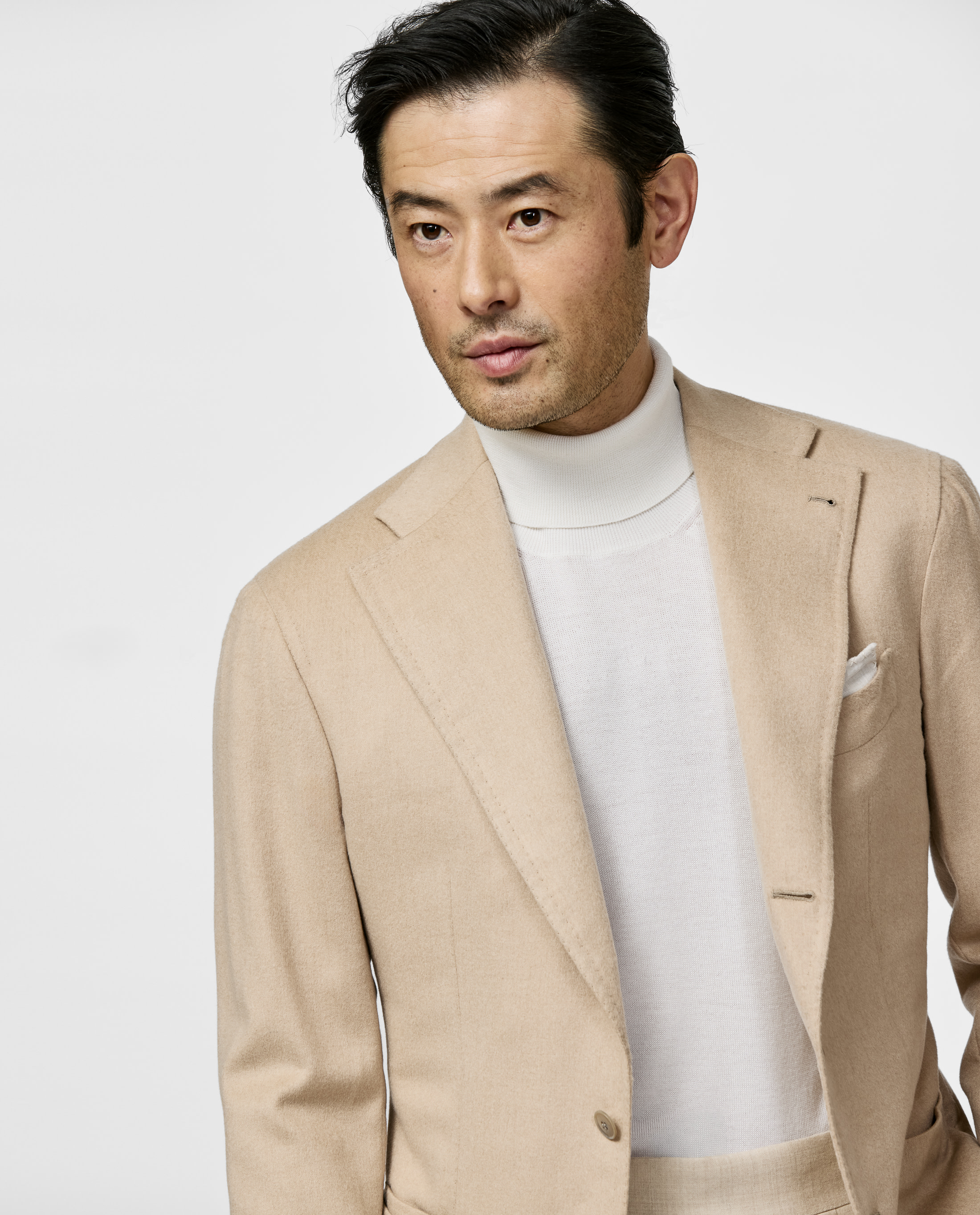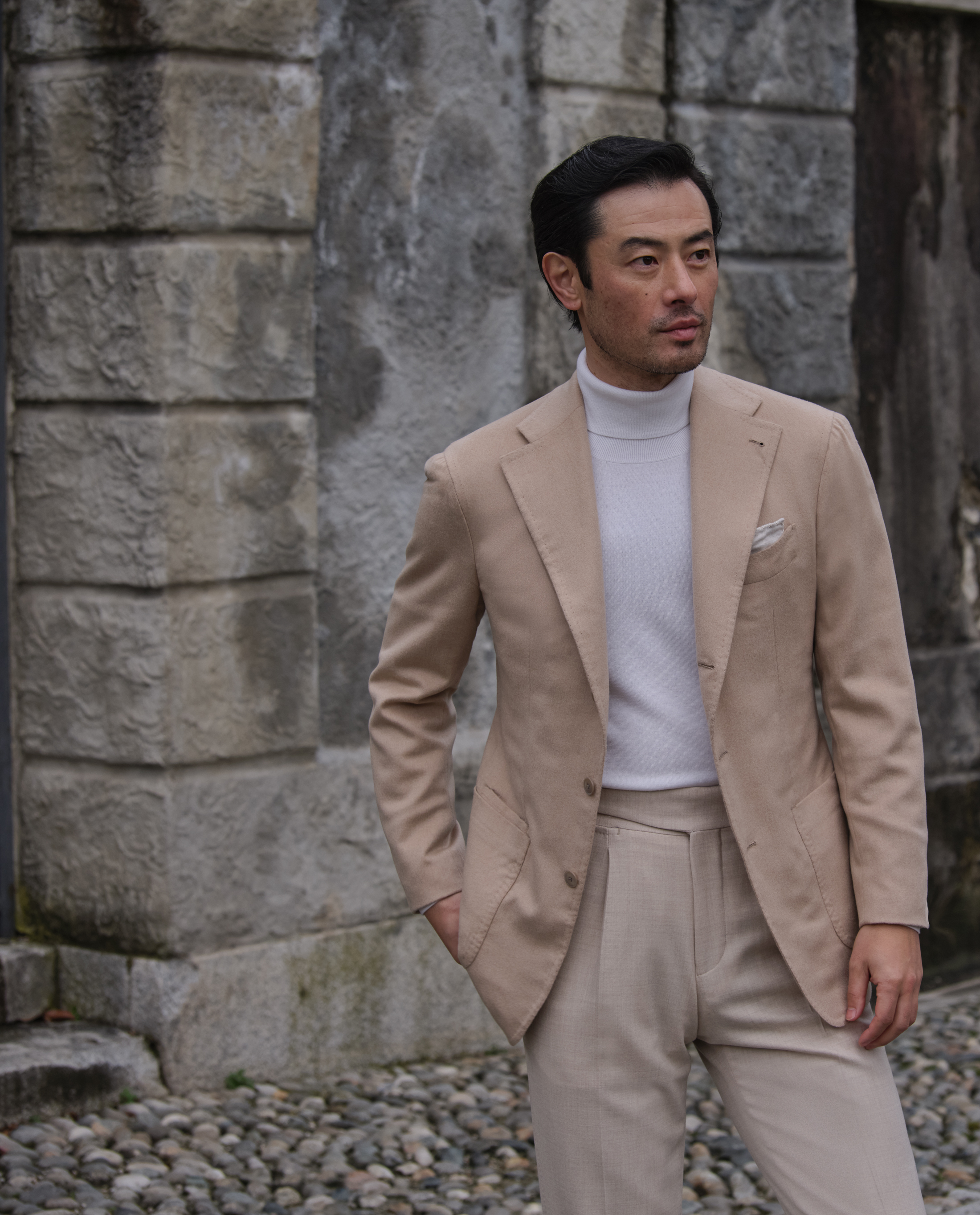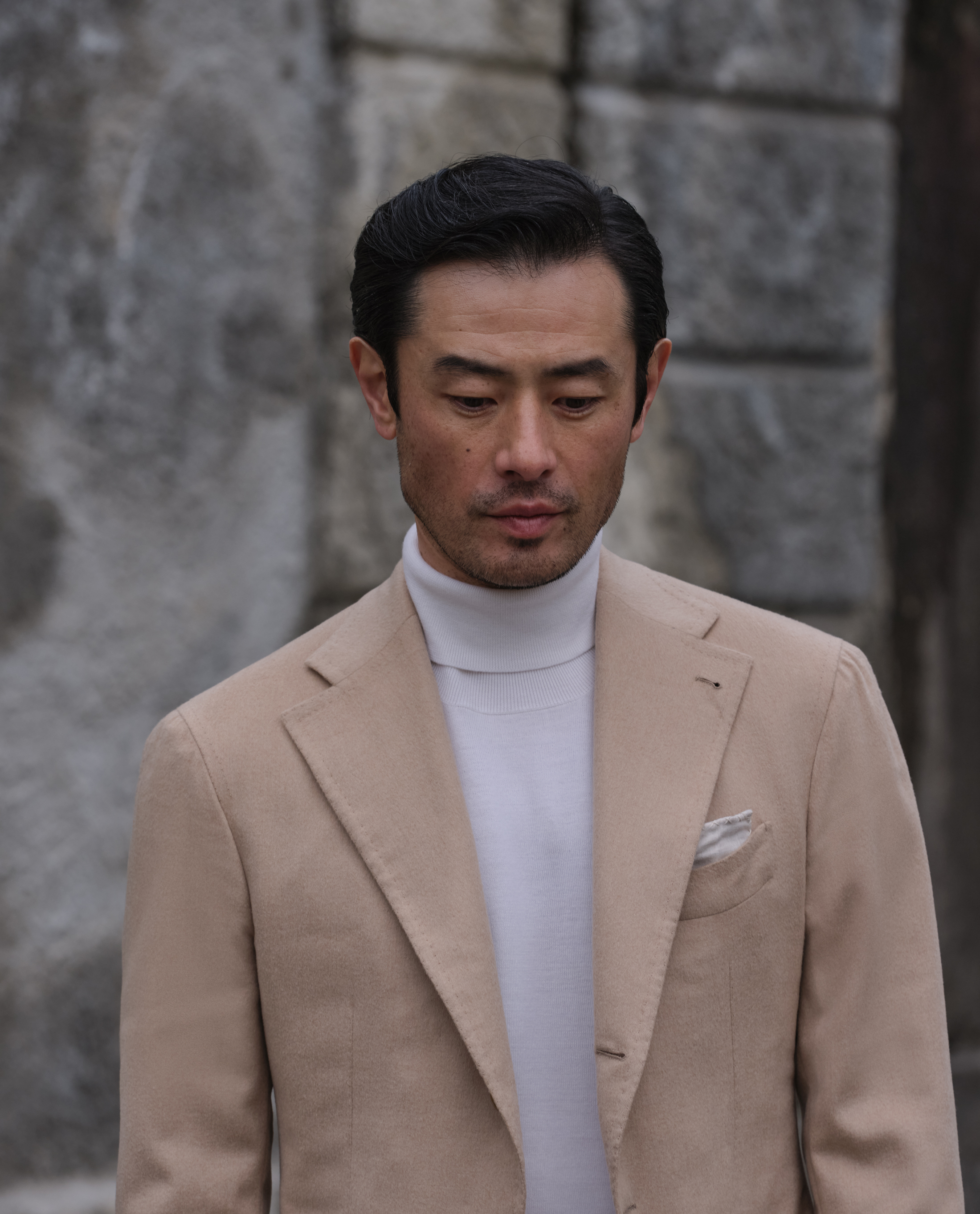 This warm sand jacket is crafted from the luxurious Bactrian camel fleece fabric made in Italy by Loro Piana. Sourced from the rare, noble fibers of baby camels in Mongolia, this ancestral quality is known for its exceptional softness, insulation, and natural color. Style it with a cashmere turtle neck, wool trousers, and dark brown loafers. Make this jacket your own with our many customization options to choose from.