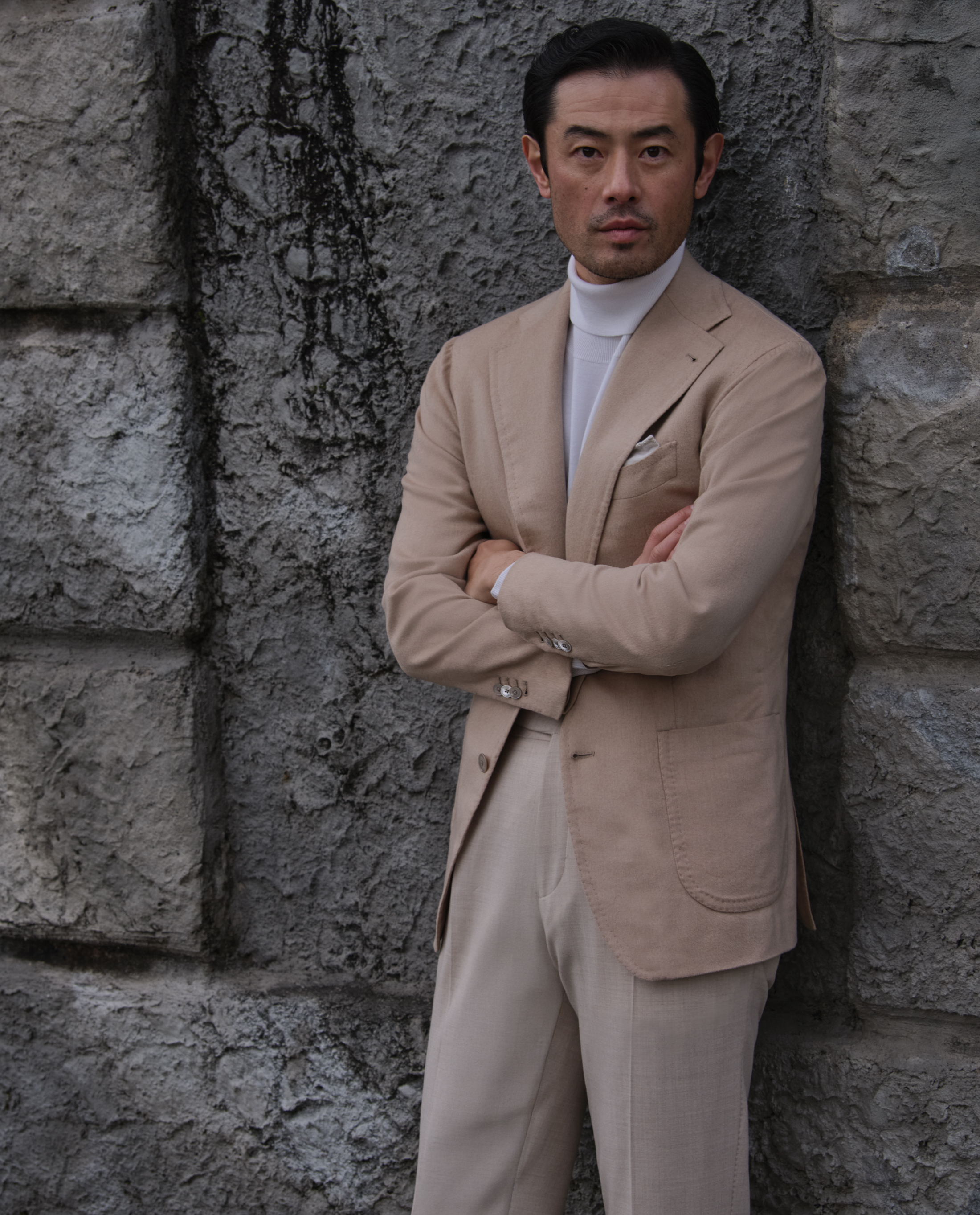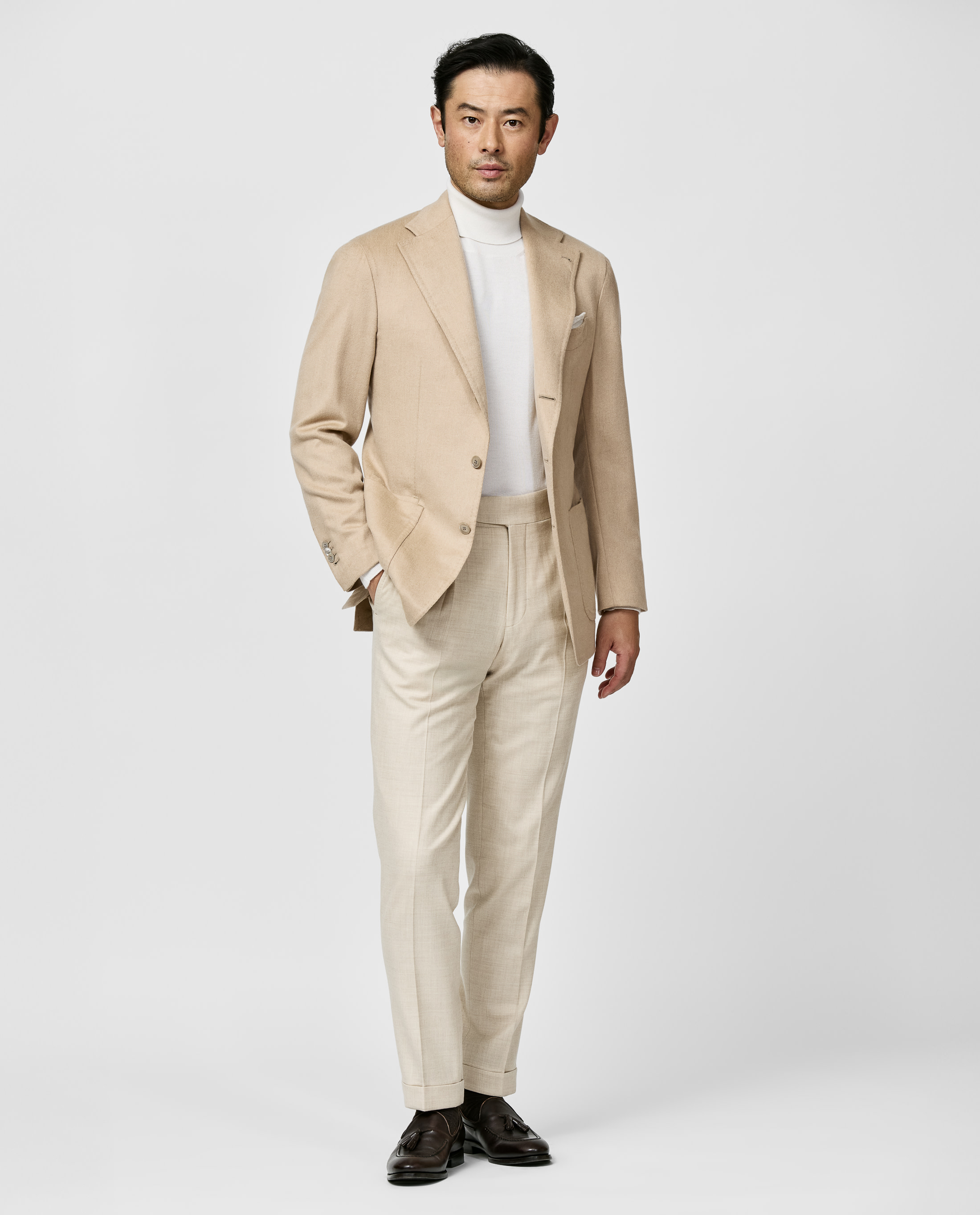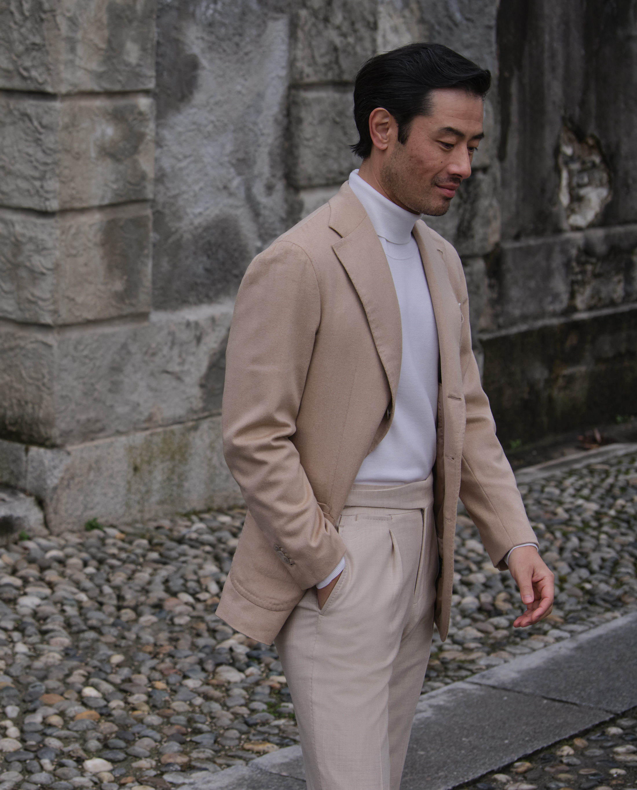 This warm sand jacket is crafted from the luxurious Bactrian camel fleece fabric made in Italy by Loro Piana. Sourced from the rare, noble fibers of baby camels in Mongolia, this ancestral quality is known for its exceptional softness, insulation, and natural color. Style it with a cashmere turtle neck, wool trousers, and dark brown loafers. Make this jacket your own with our many customization options to choose from.