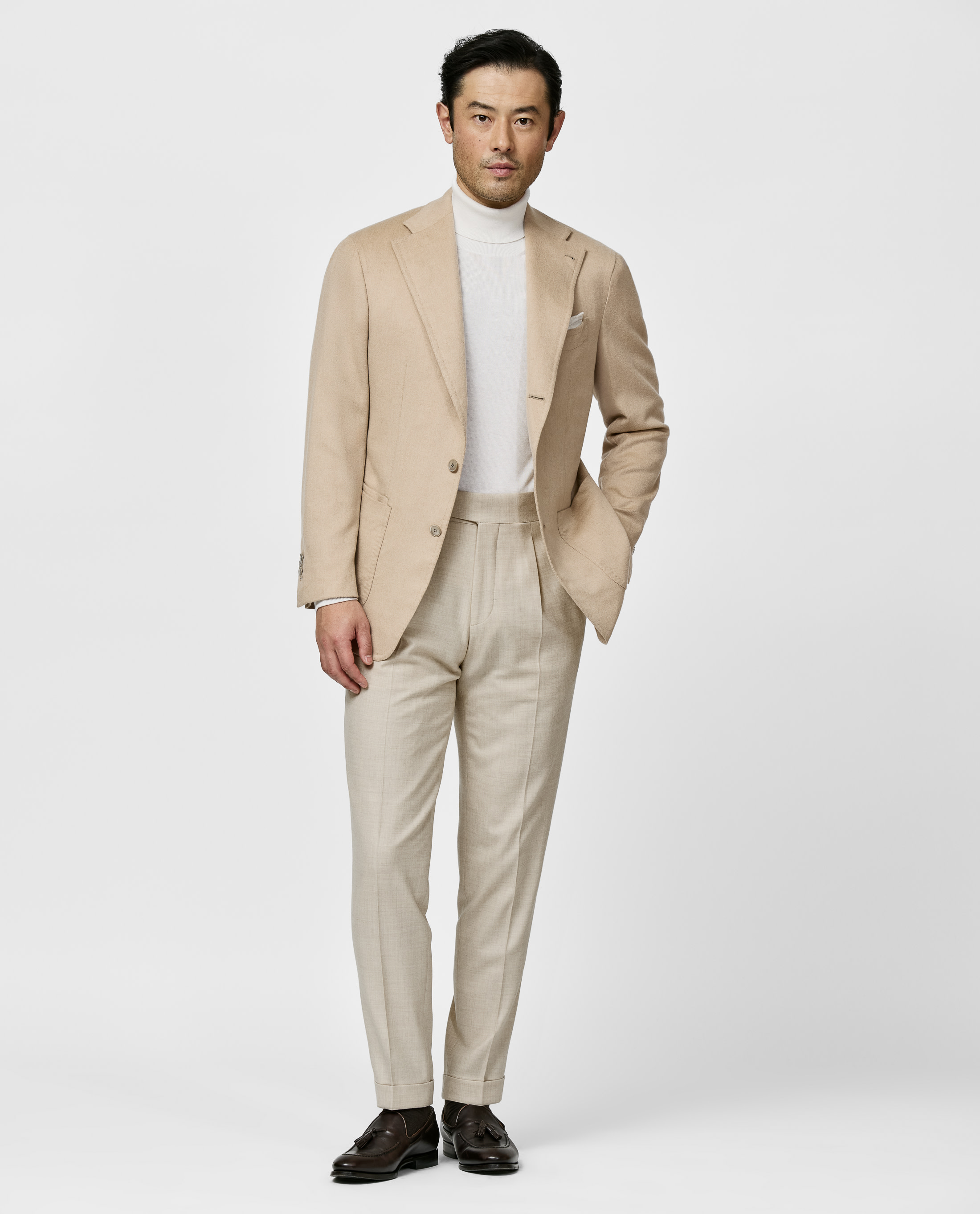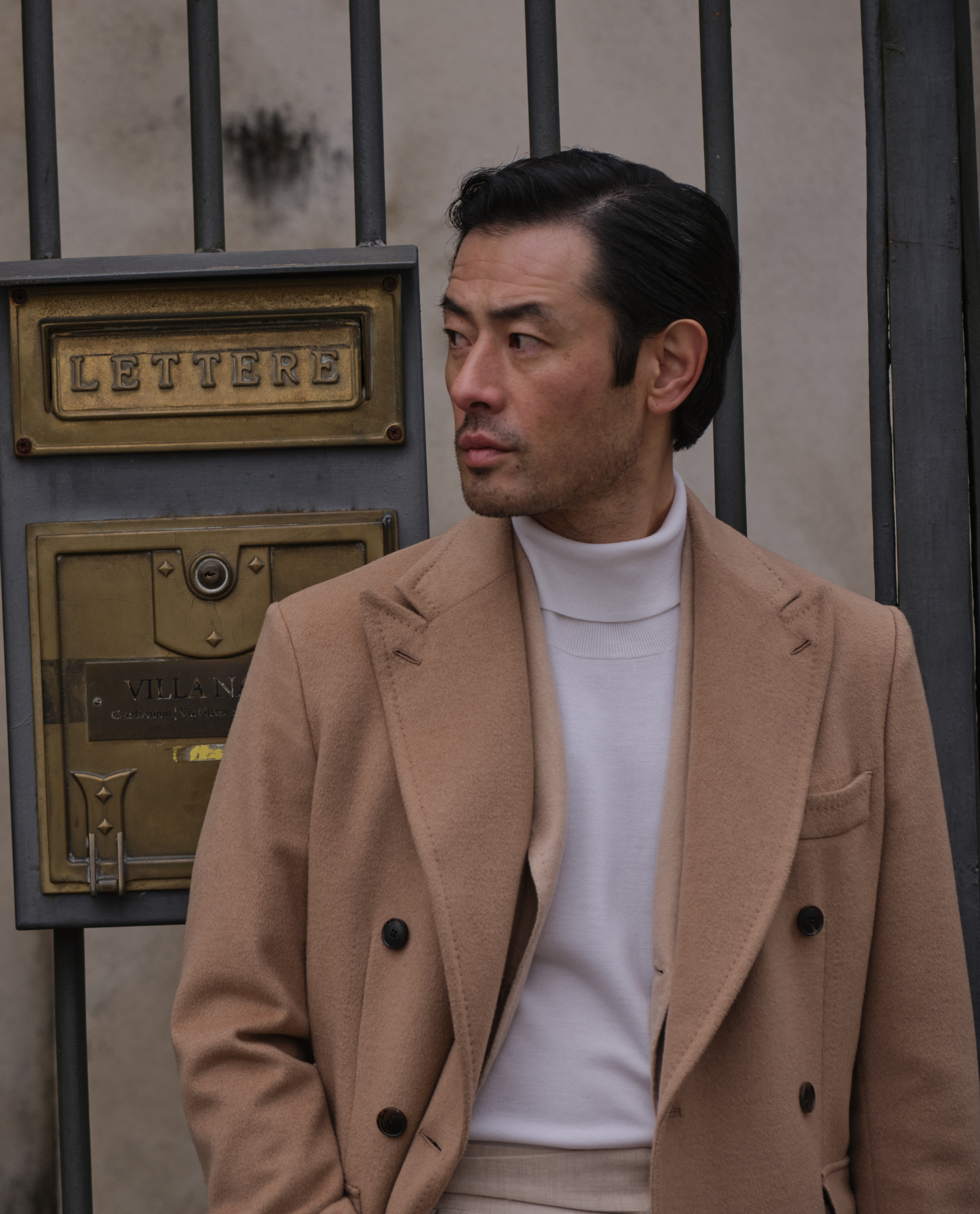 This soft caramel brushed camel overcoat is the ultimate in winter refinement. Paired with a cohesive color palette including a matching jacket, sand trousers, an off-white knit, and dark brown tassel loafers, the look becomes a timeless reflection of elegant menswear.