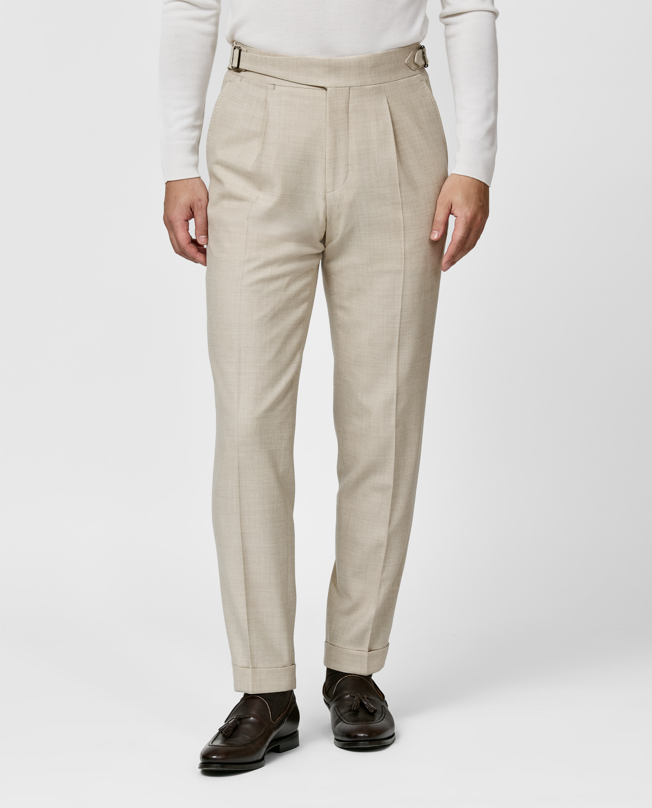 These sand trousers elevates your casual layering in comfort and in style. Crafted from Jersely® fabric made in Italy by Loro Piana. Combining the finest pure wool and a small percentage of stretch, this blend is woven on a shuttle loom to create the elasticity of knitted jersey for a soft and breathable garment that moves with the body. Designed here with a high waistband and pleats. Make these trousers your own with our many customization options to choose from.