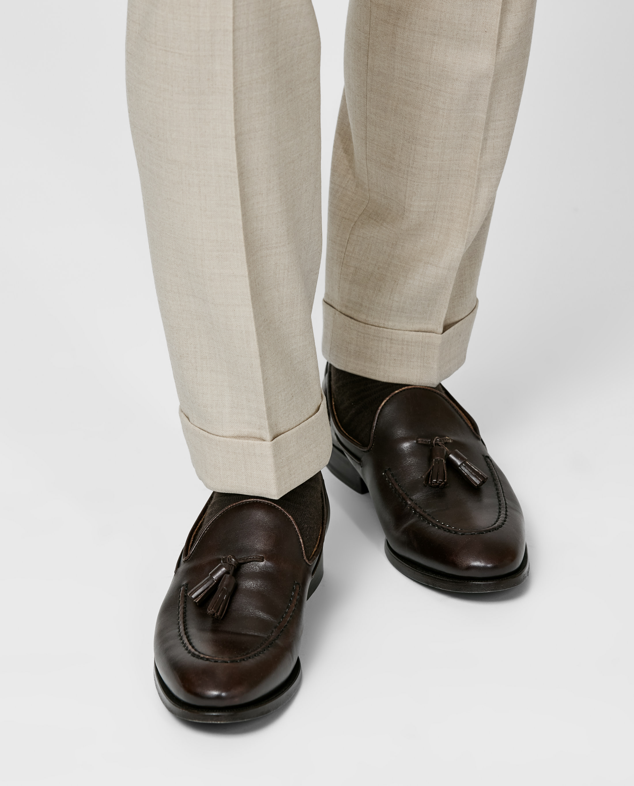 These dark brown loafers offer an elegant and formal look. Handmade from chrome-tanned calfskin leather, washed and buffed by hand before hand-dying, ensuring a naturally marbled finish. Designed here as tassel loafers. Make these shoes your own with our many customization options to choose from. Handmade Calfskin leather Chrome tanned