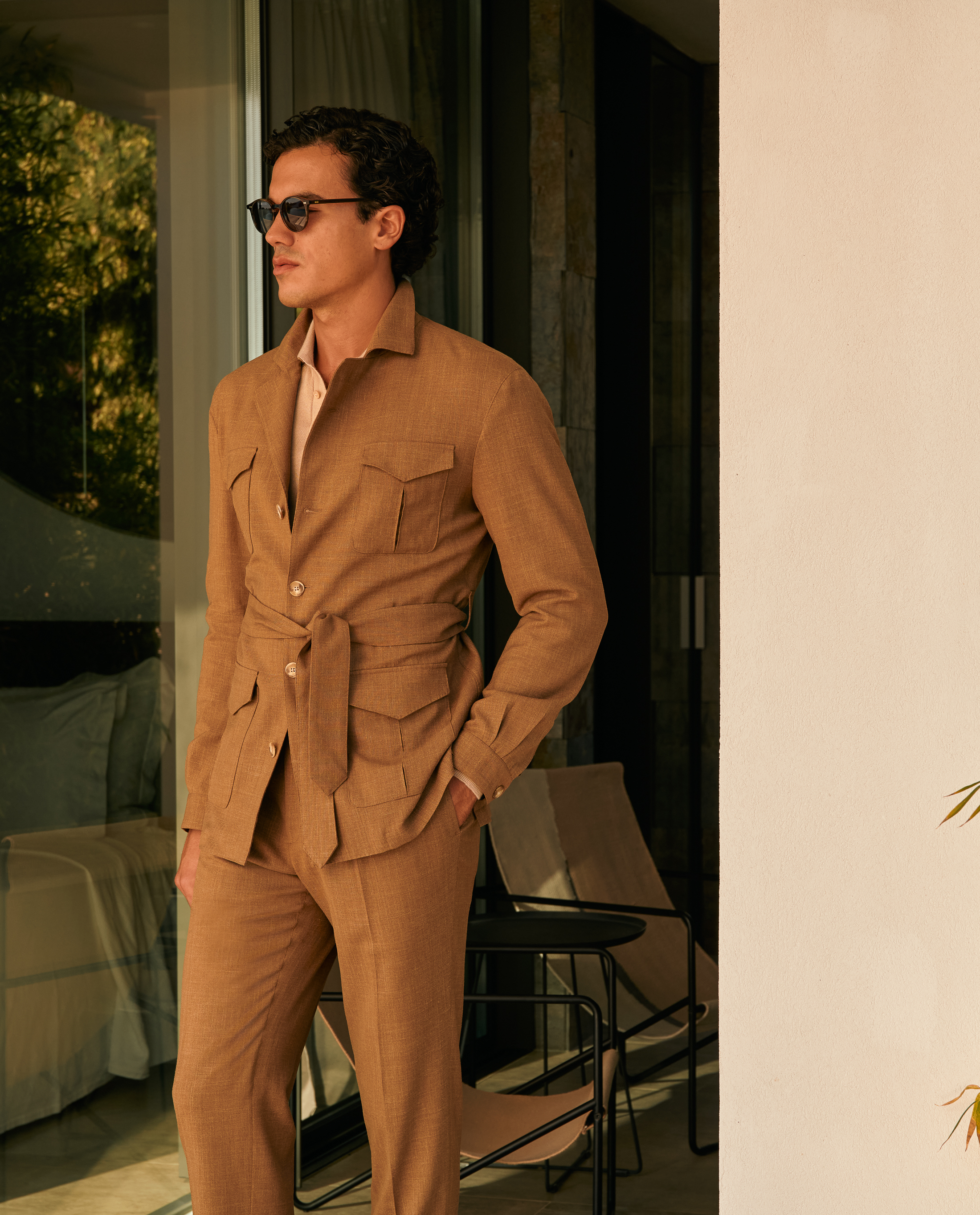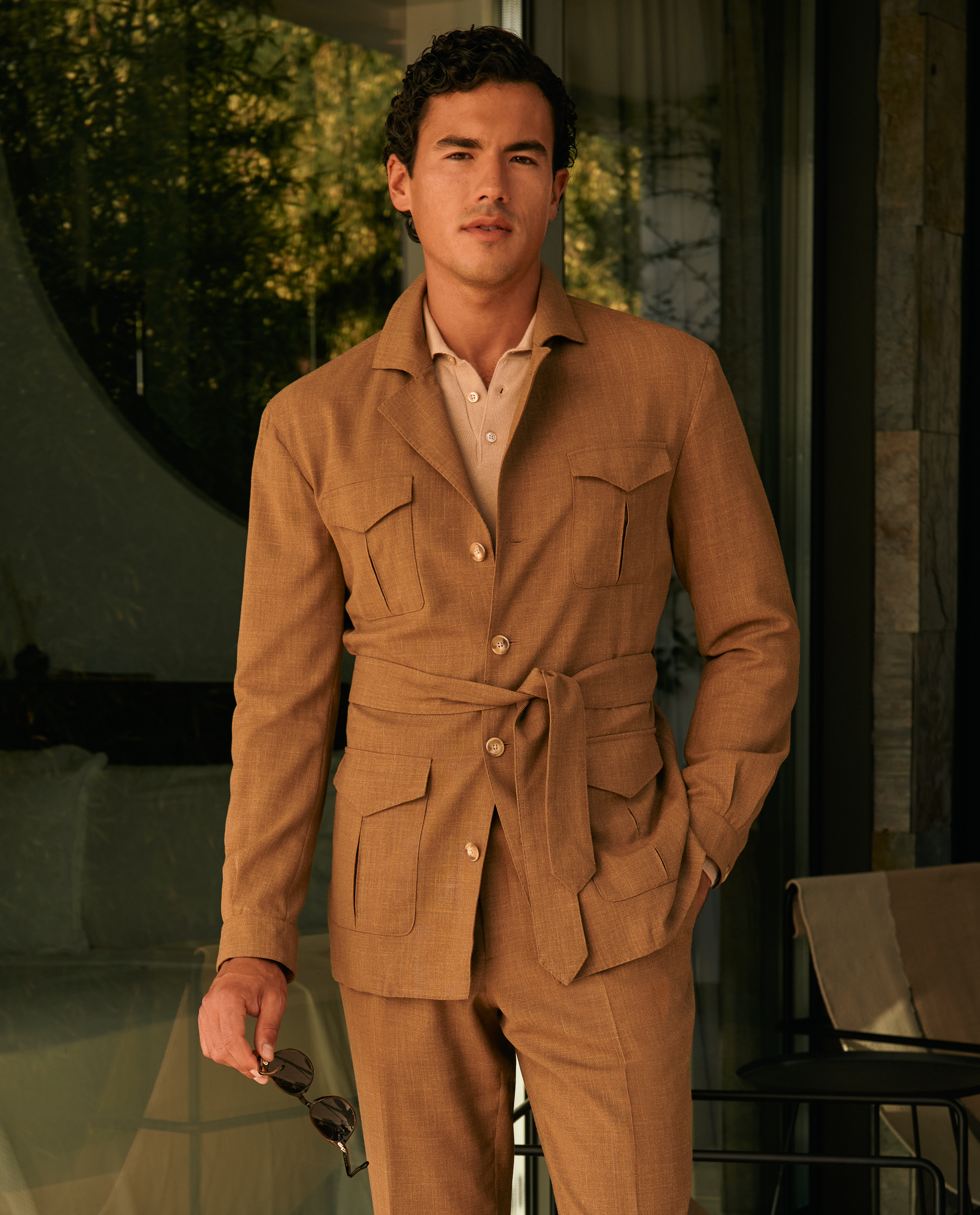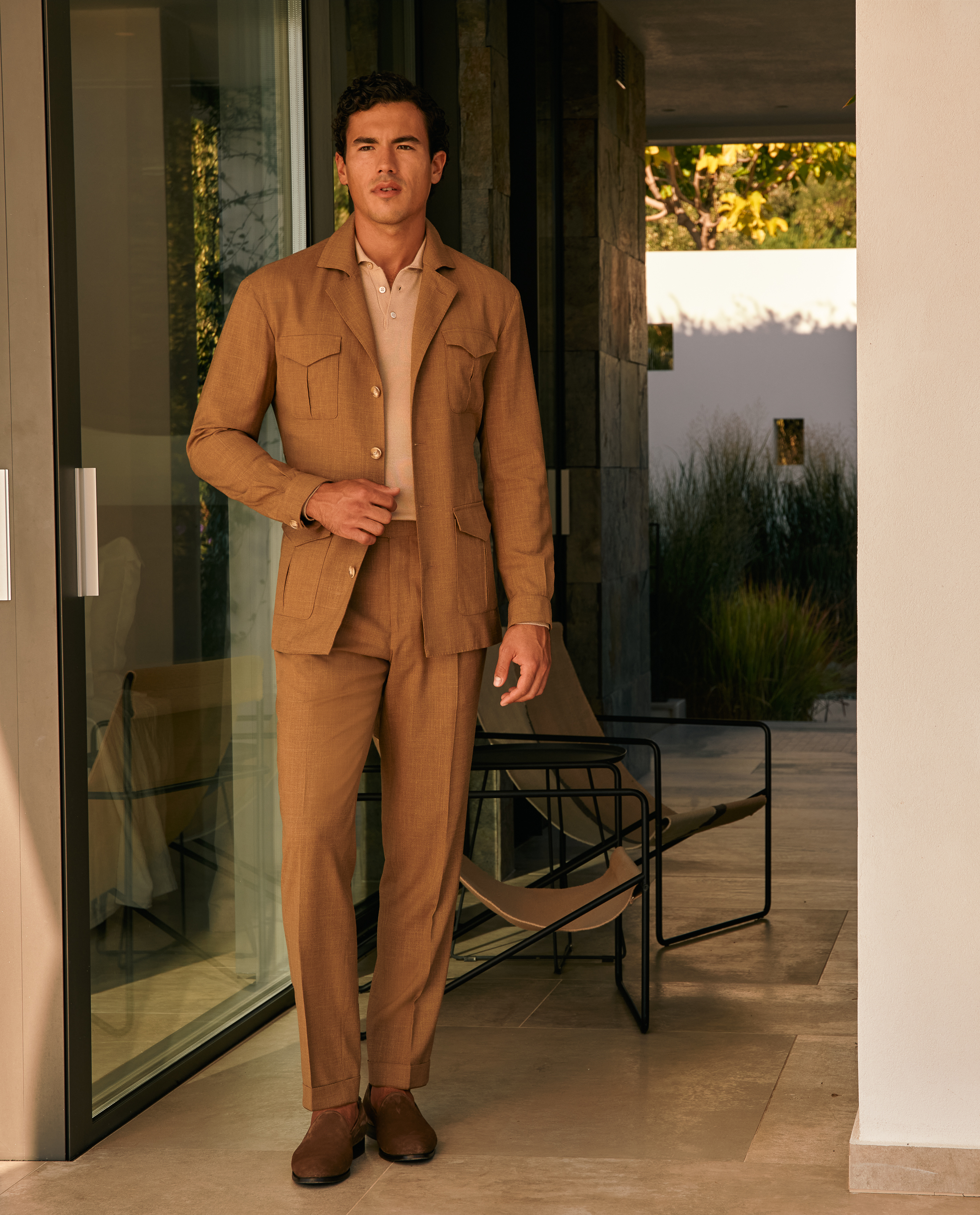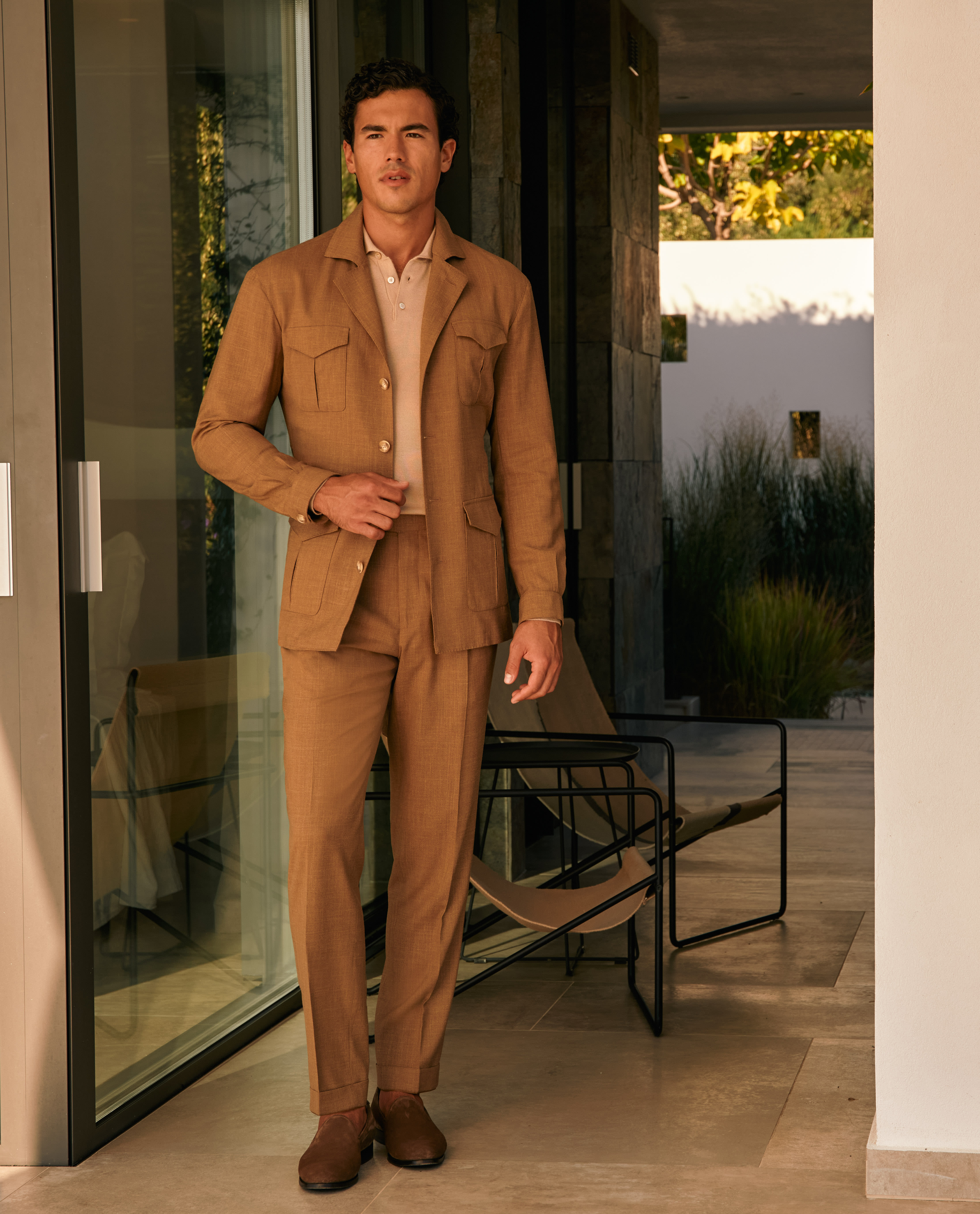 Few garments combine practicality and sophistication quite like the safari suit, offering endless ways to mix, match, and style its jacket and trousers. Go bold with this breathable caramel 2-piece, styled here with a beige polo knit and chocolate suede loafers to create an instant summer-ready statement.