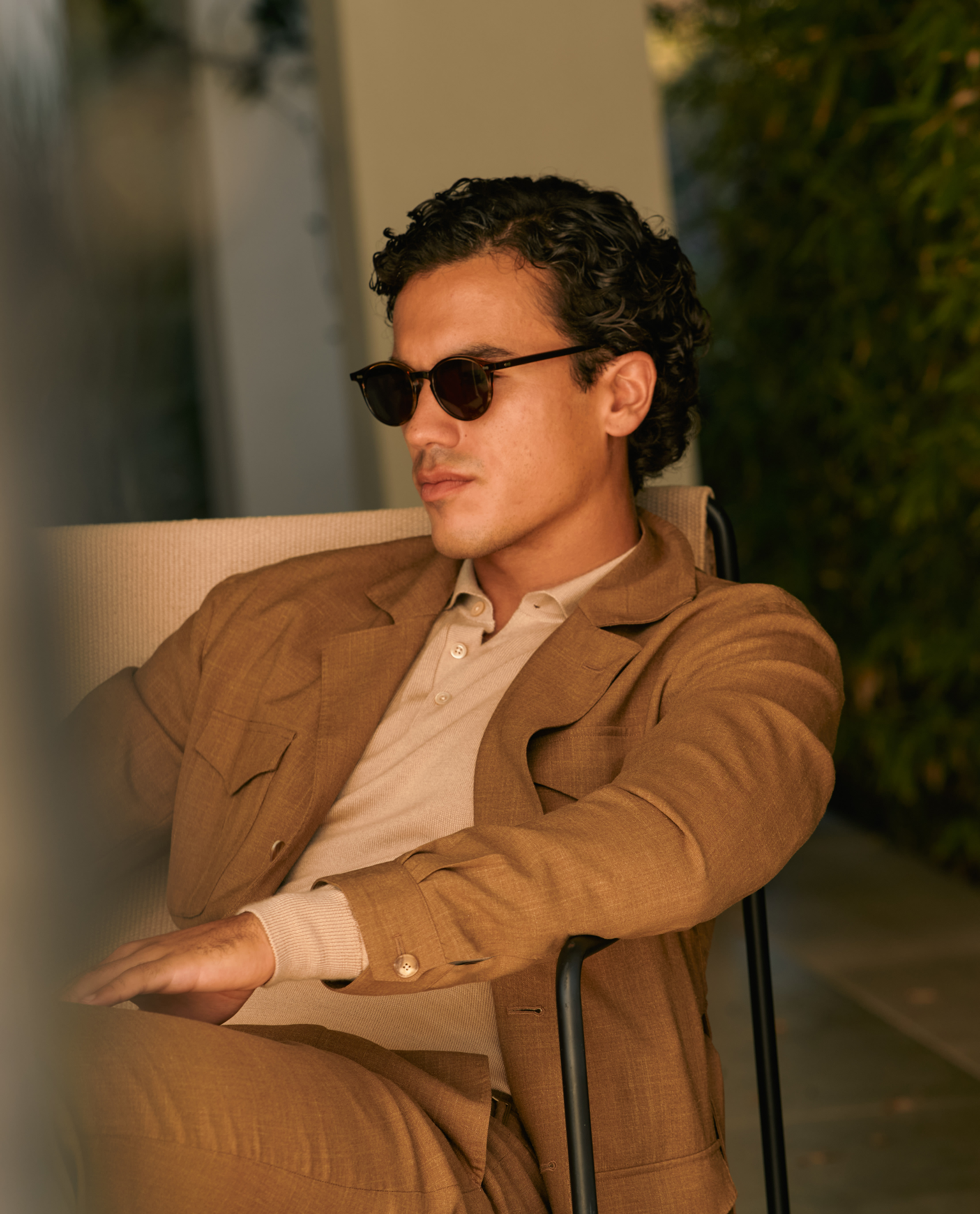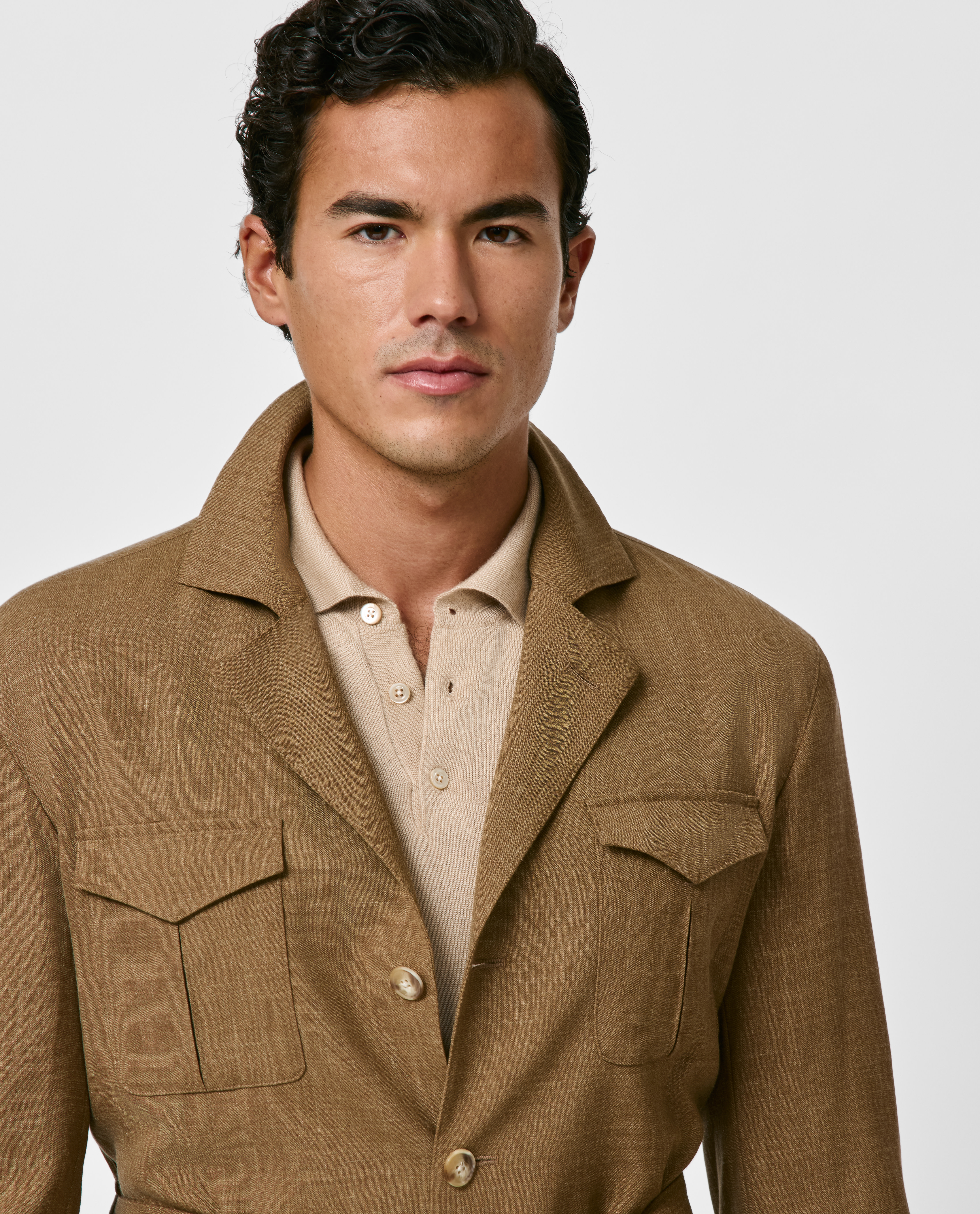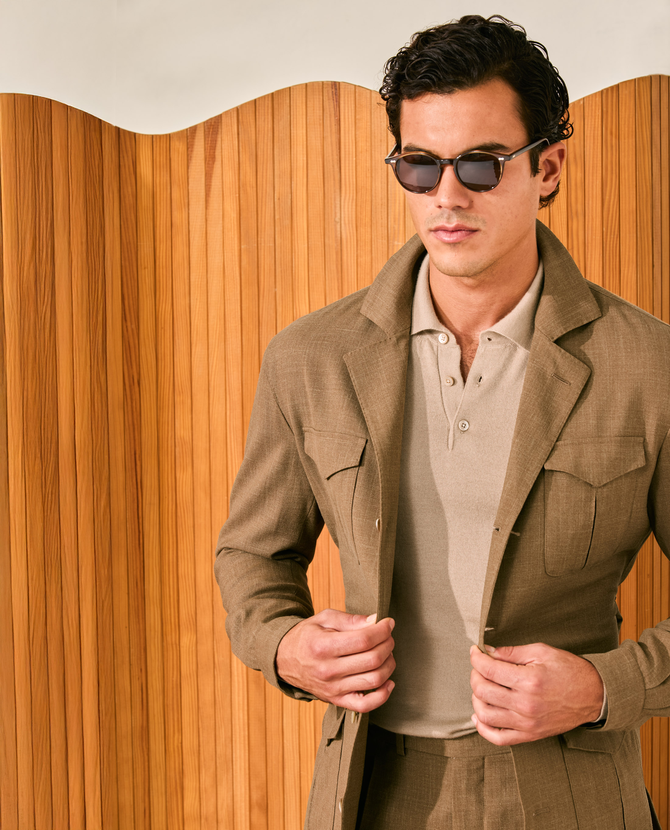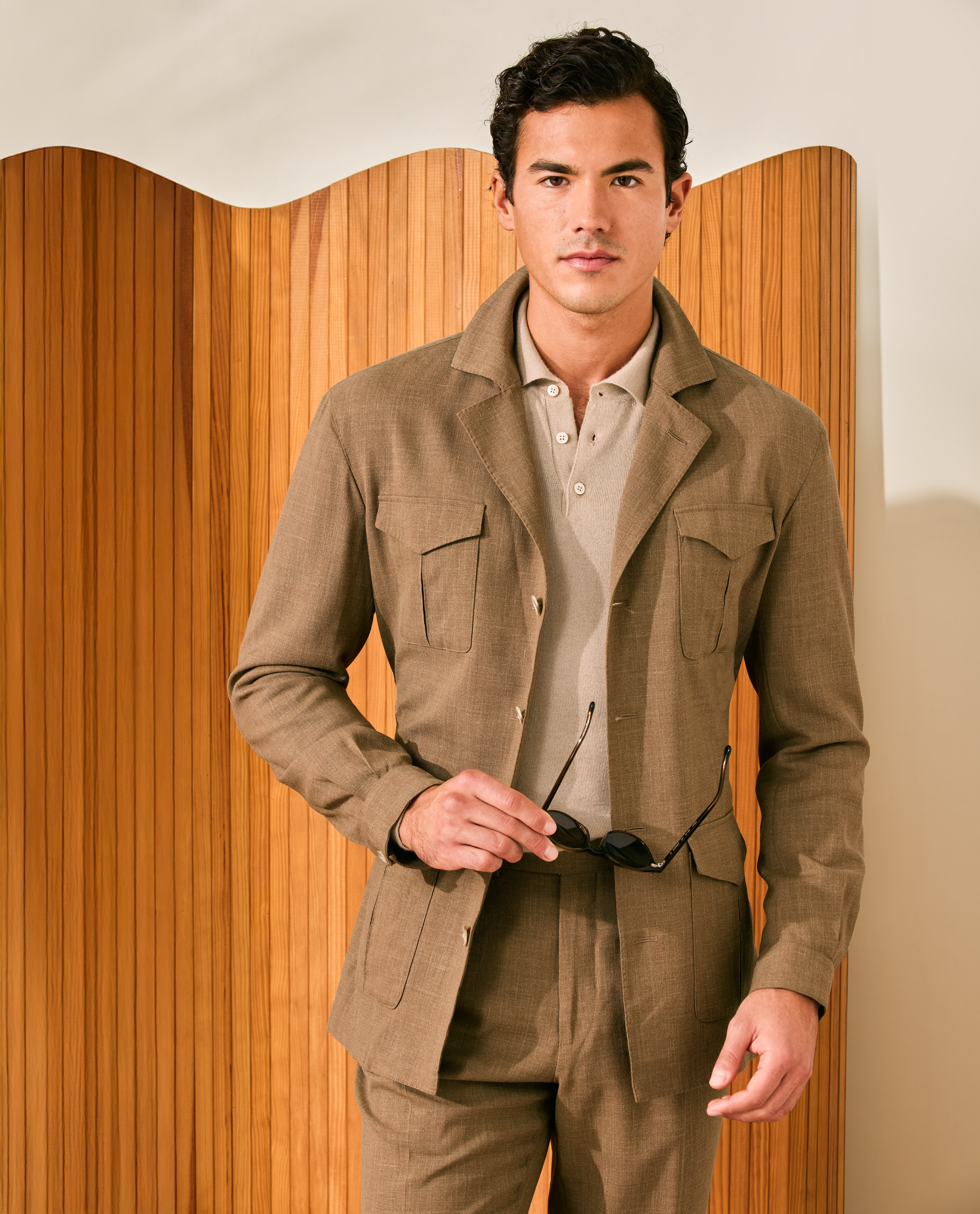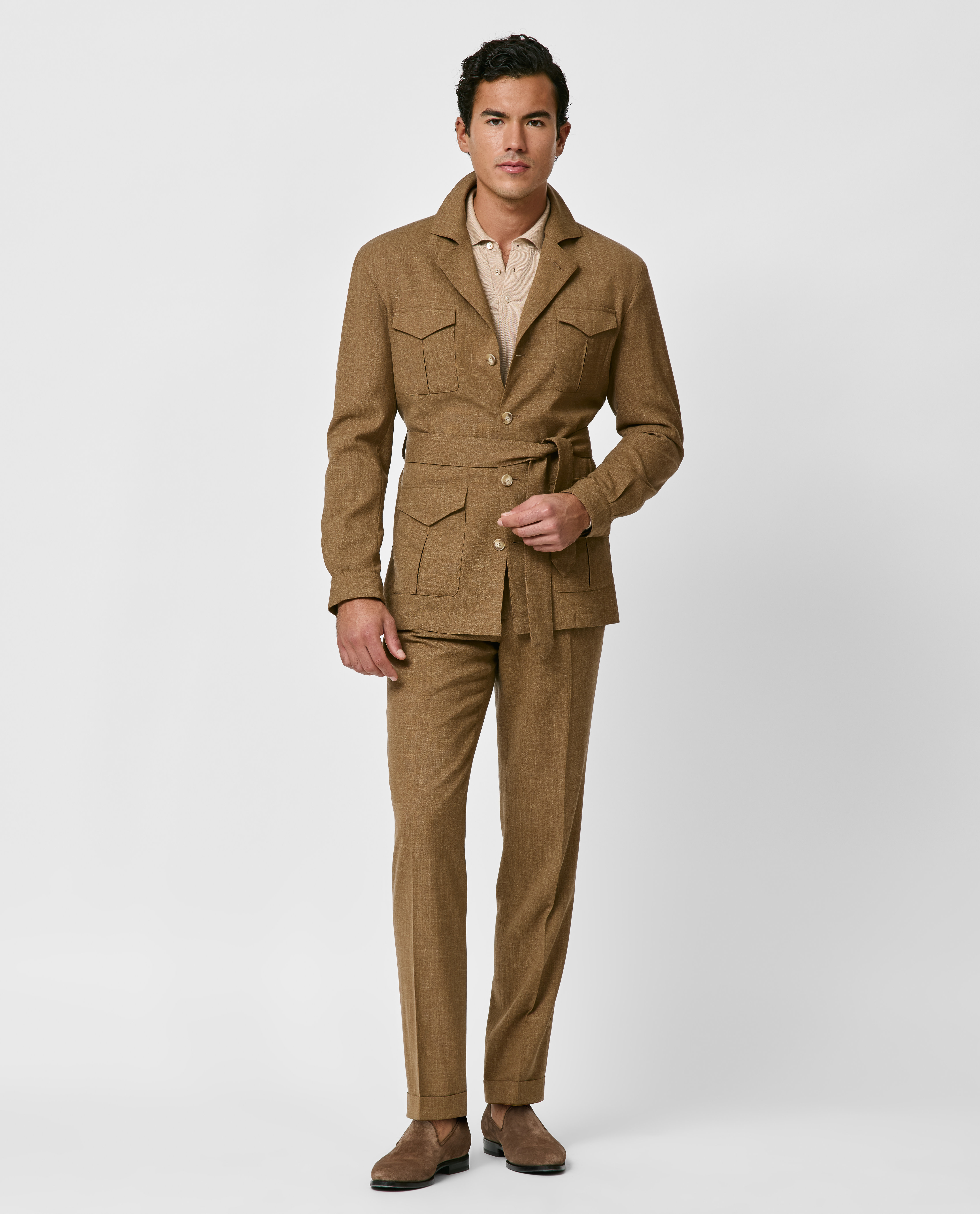 Few garments combine practicality and sophistication quite like the safari suit, offering endless ways to mix, match, and style its jacket and trousers. Go bold with this breathable caramel 2-piece, styled here with a beige polo knit and chocolate suede loafers to create an instant summer-ready statement.