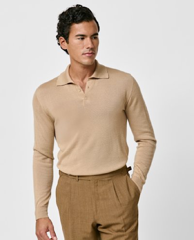 This beige knit will keep you cool in summer and warm enough in winter. The high-quality blend combines the drape and shine of silk with luxurious cashmere. Crafted on 3D-knitting machines for a sophisticated seamless look. Designed here as a polo with buttons, in double ply. Make this knitwear your own with our customization options.