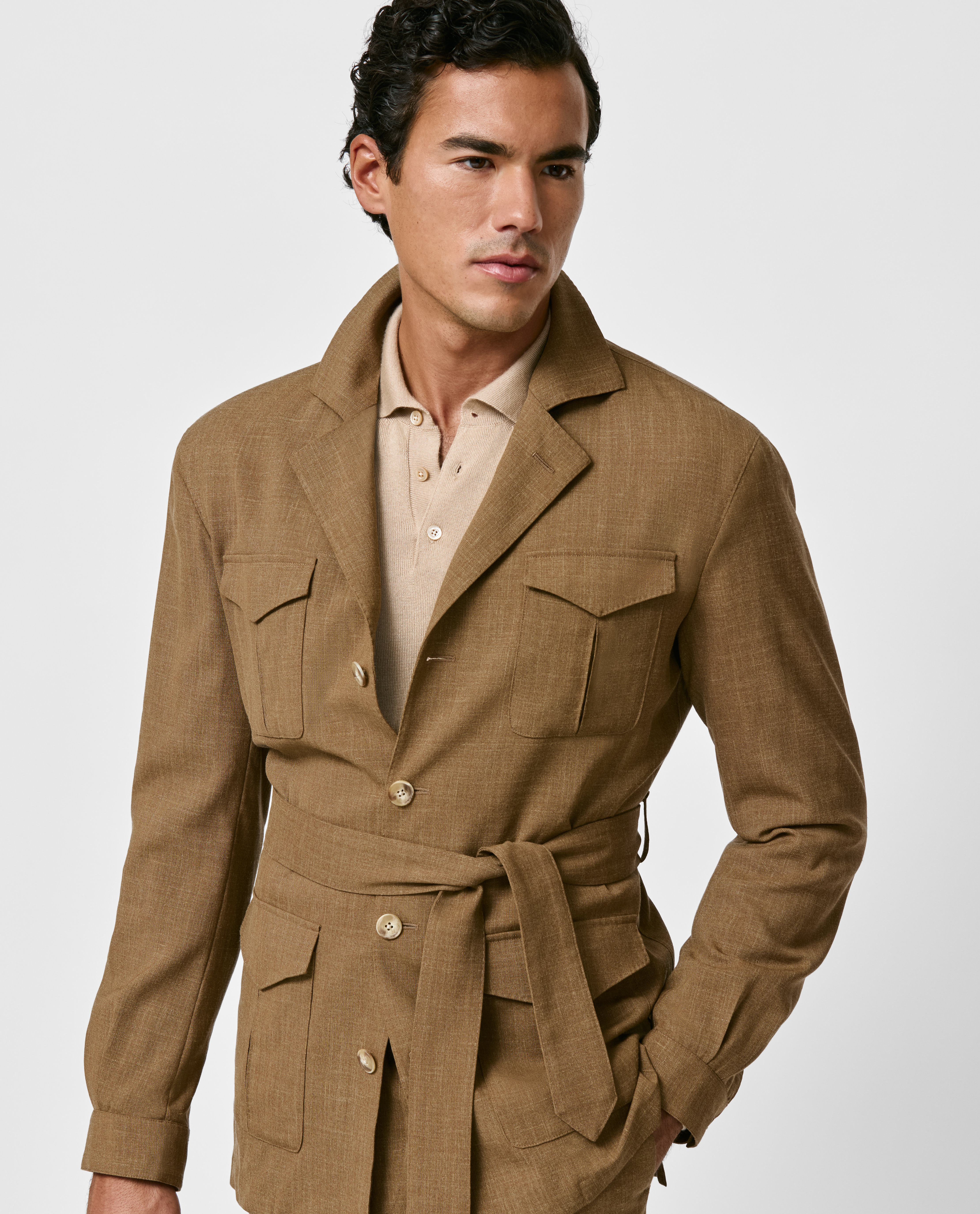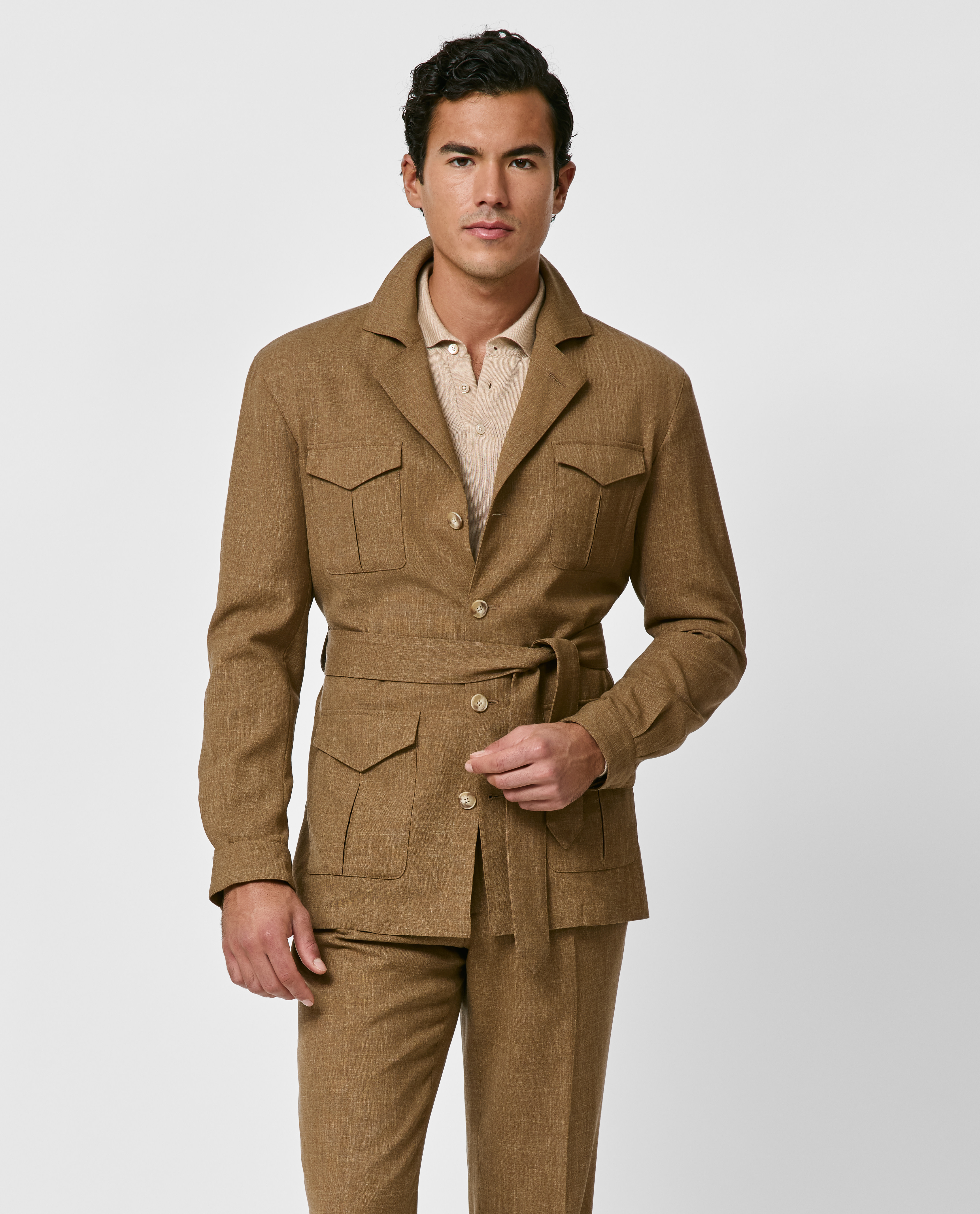 Crafted from luxurious Summertime® fabric made in Italy by Loro Piana, this striking caramel-colored suit combines the notoriously breathable tropical weave with a subtle, elegant shine. Designed here with a modern 4-button closure, safari pockets, and a removable safari belt. Pair it with a lightweight tonal knit and suede loafers to enhance its breezy seasonal charm.