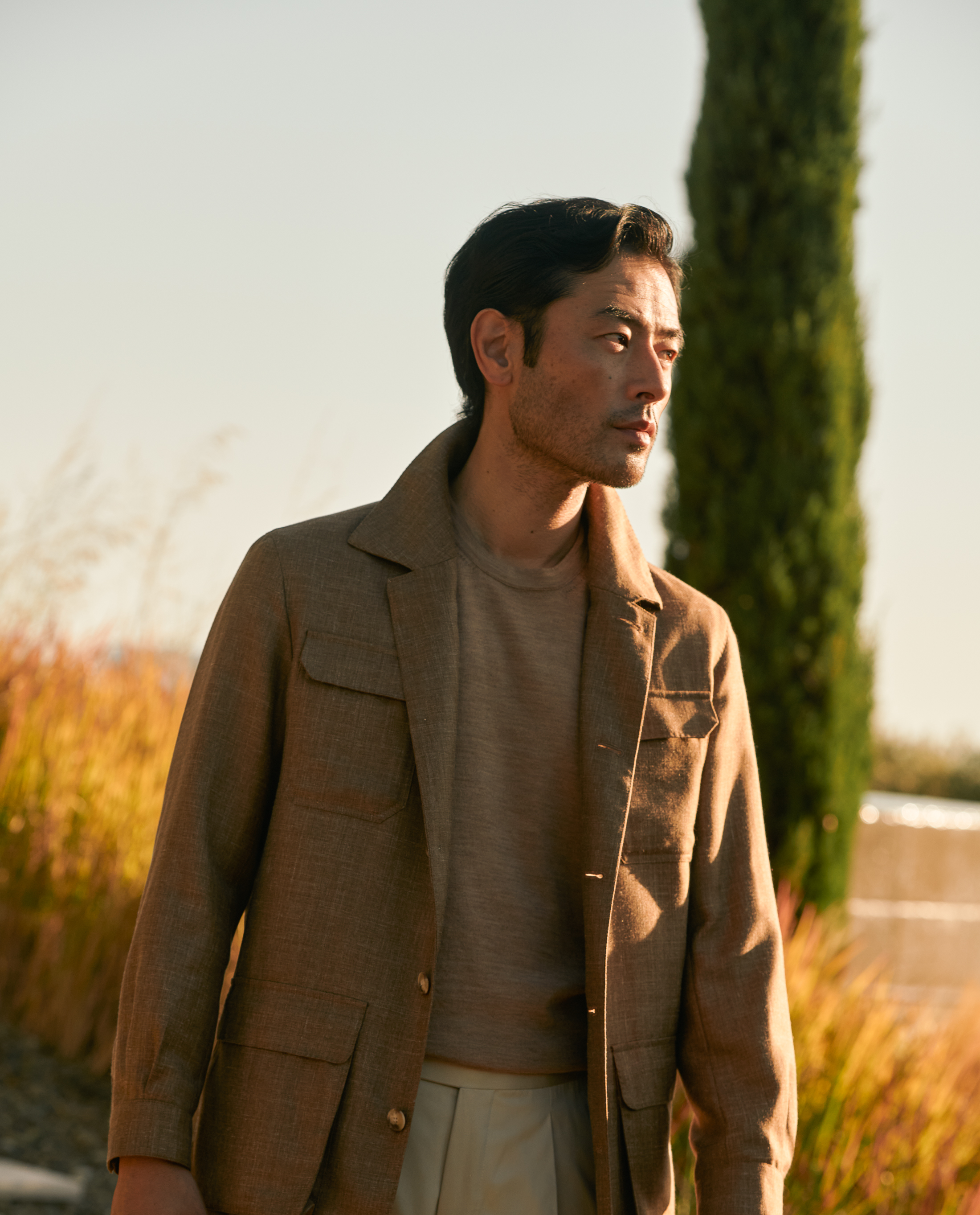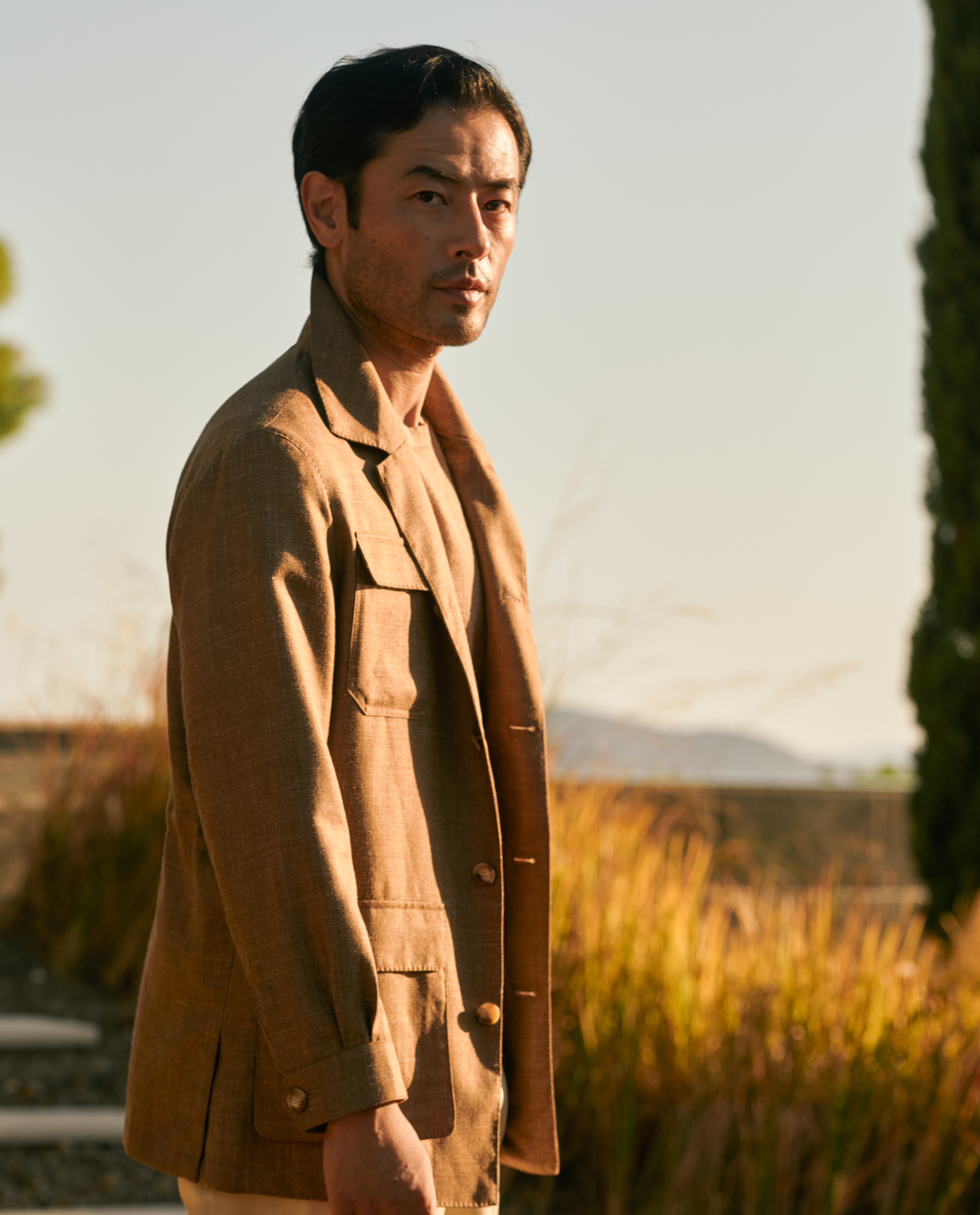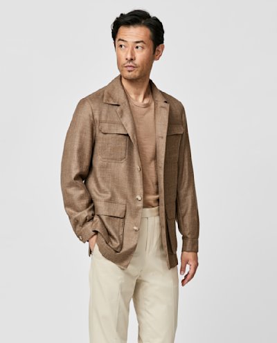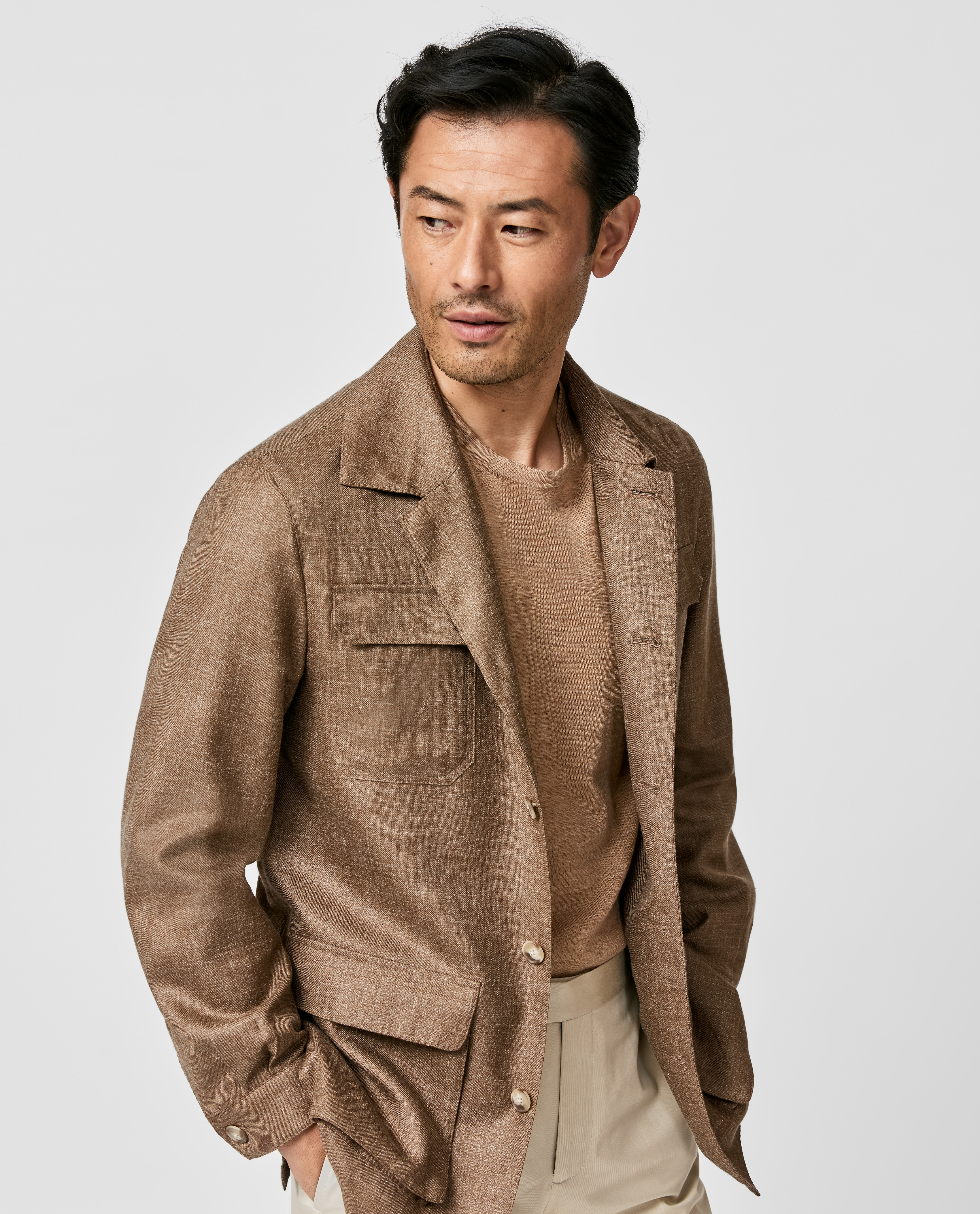 Crafted from a lightweight wool-silk-linen twill weave with outstanding breathability, this caramel-colored utility jacket was designed with a 5-button closure, utility patch with flap chest pockets, and bellow side pockets. Pair it with a lightweight knit, trousers, and loafers to create a smart-casual seasonal look. Prefer a different style? Every piece is made exclusively for you, with your choice of design options.