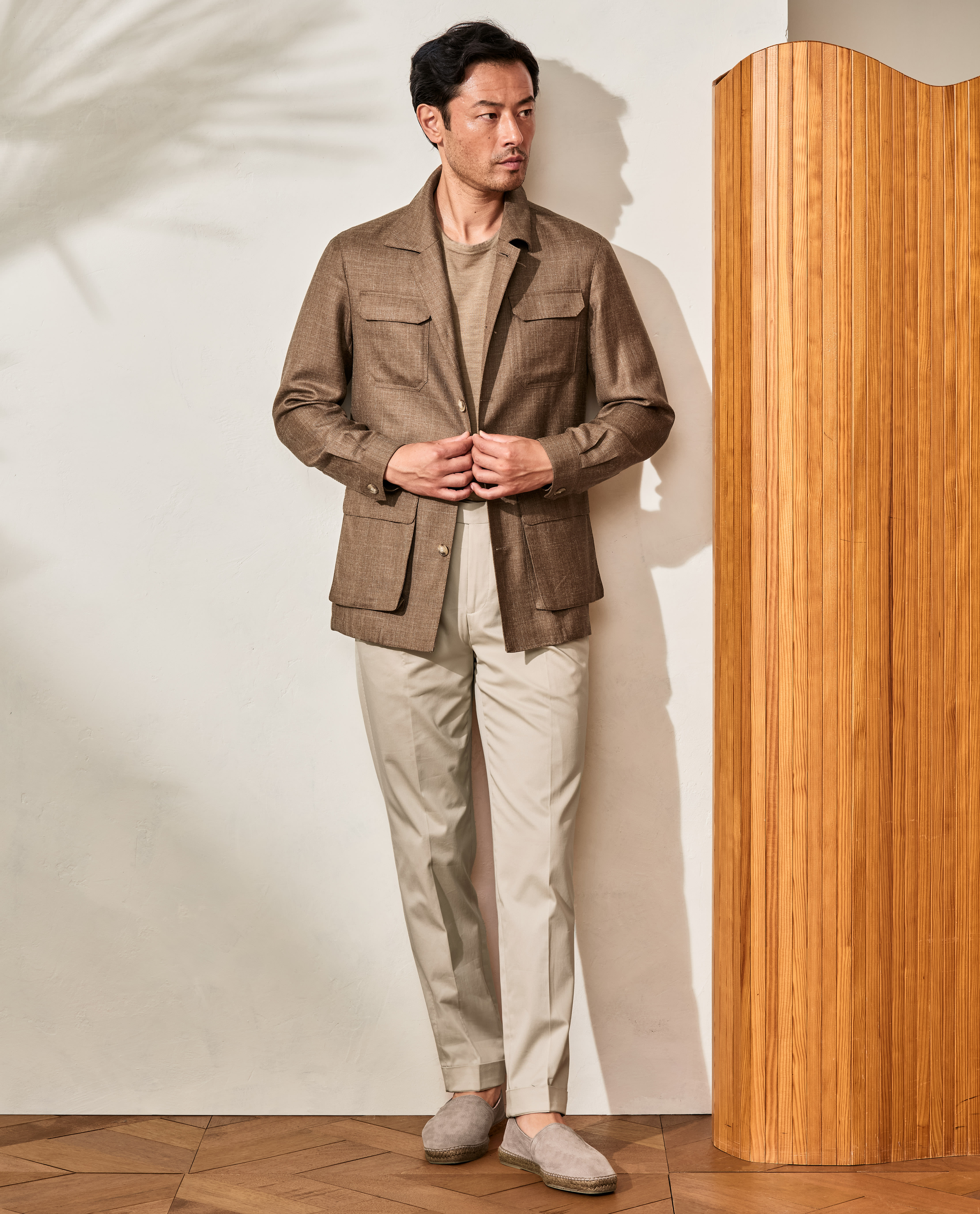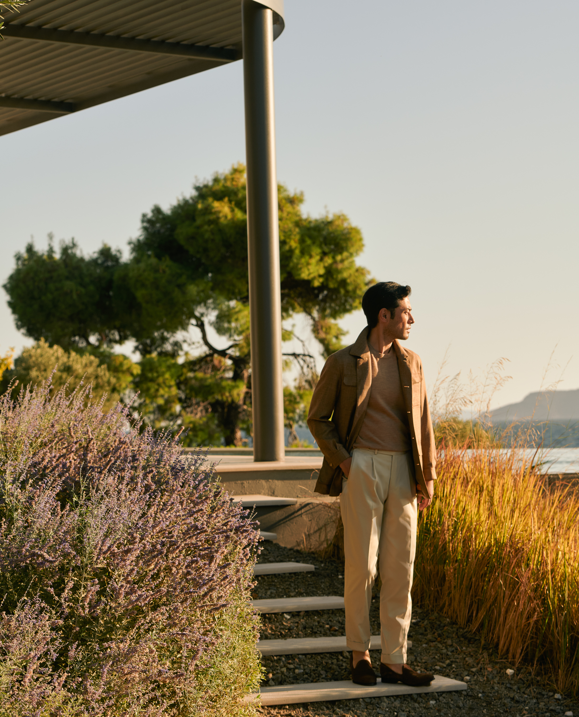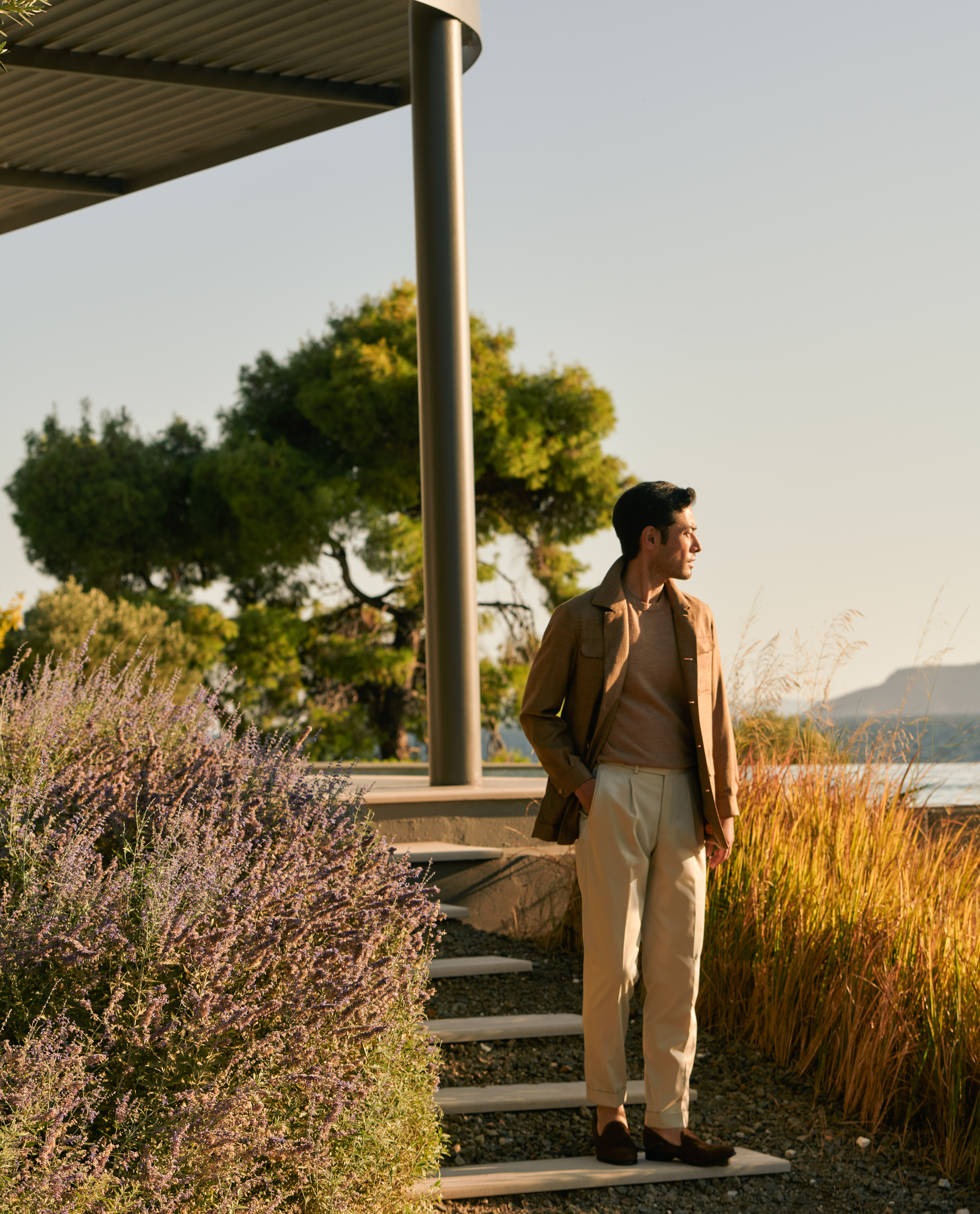 Versatility is the name of the game with this caramel wool-silk-linen utility jacket. Less outspoken than our safari styles but with an equal dose of understated elegance, this jacket is easy to pair with smart-casual separates across the sartorial spectrum – such as this beige t-shirt knit, sand stretch trousers, and chocolate brown suede loafers.