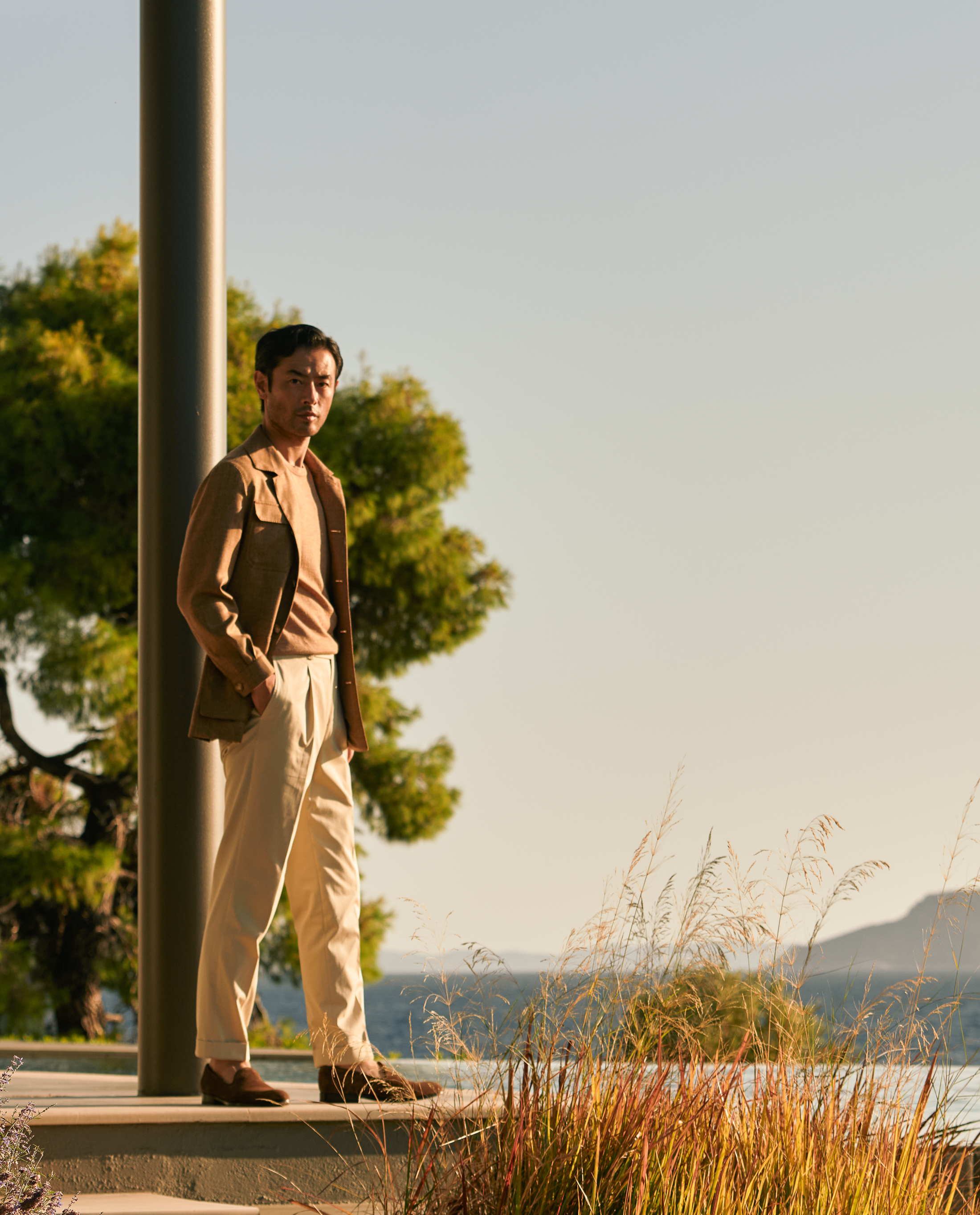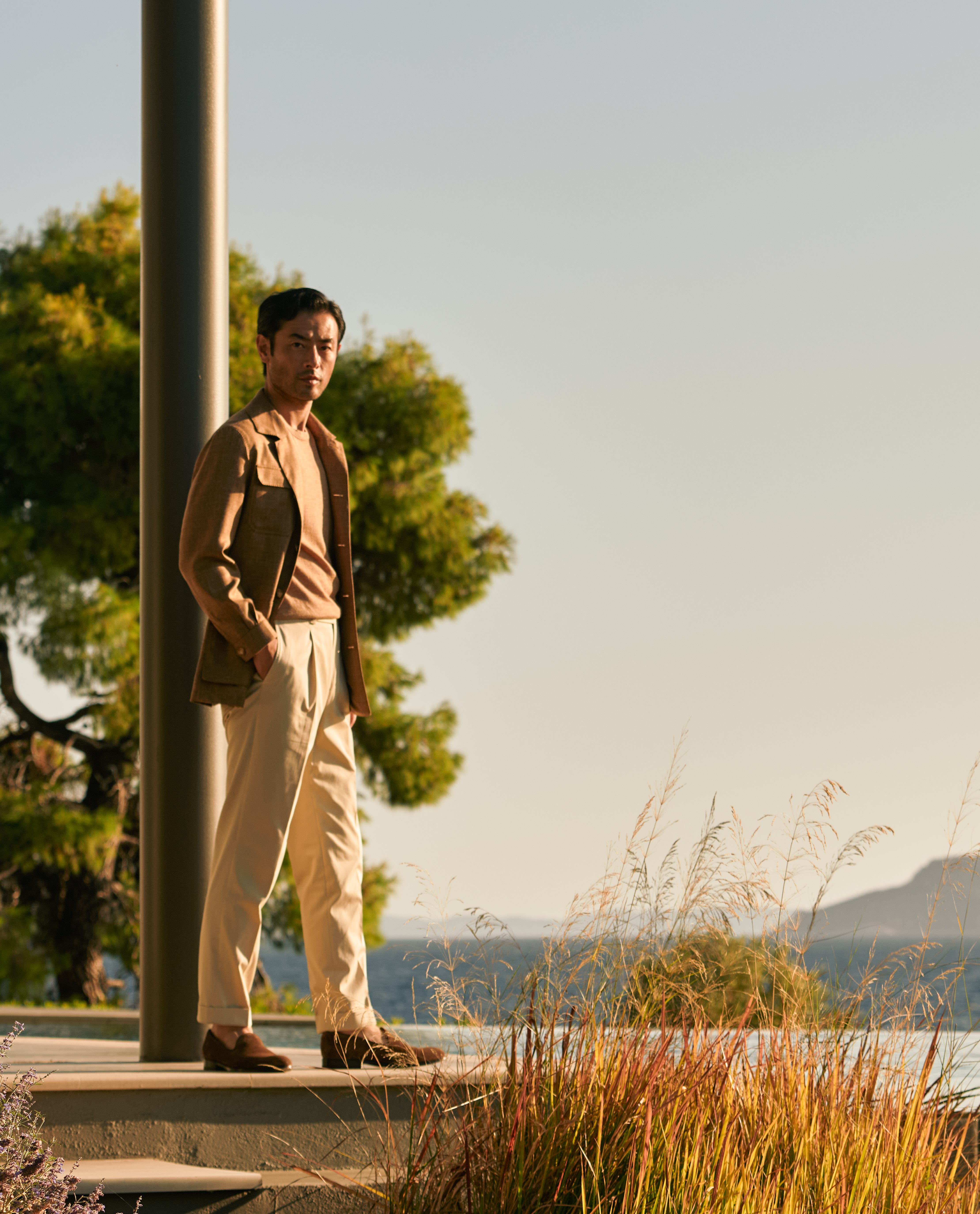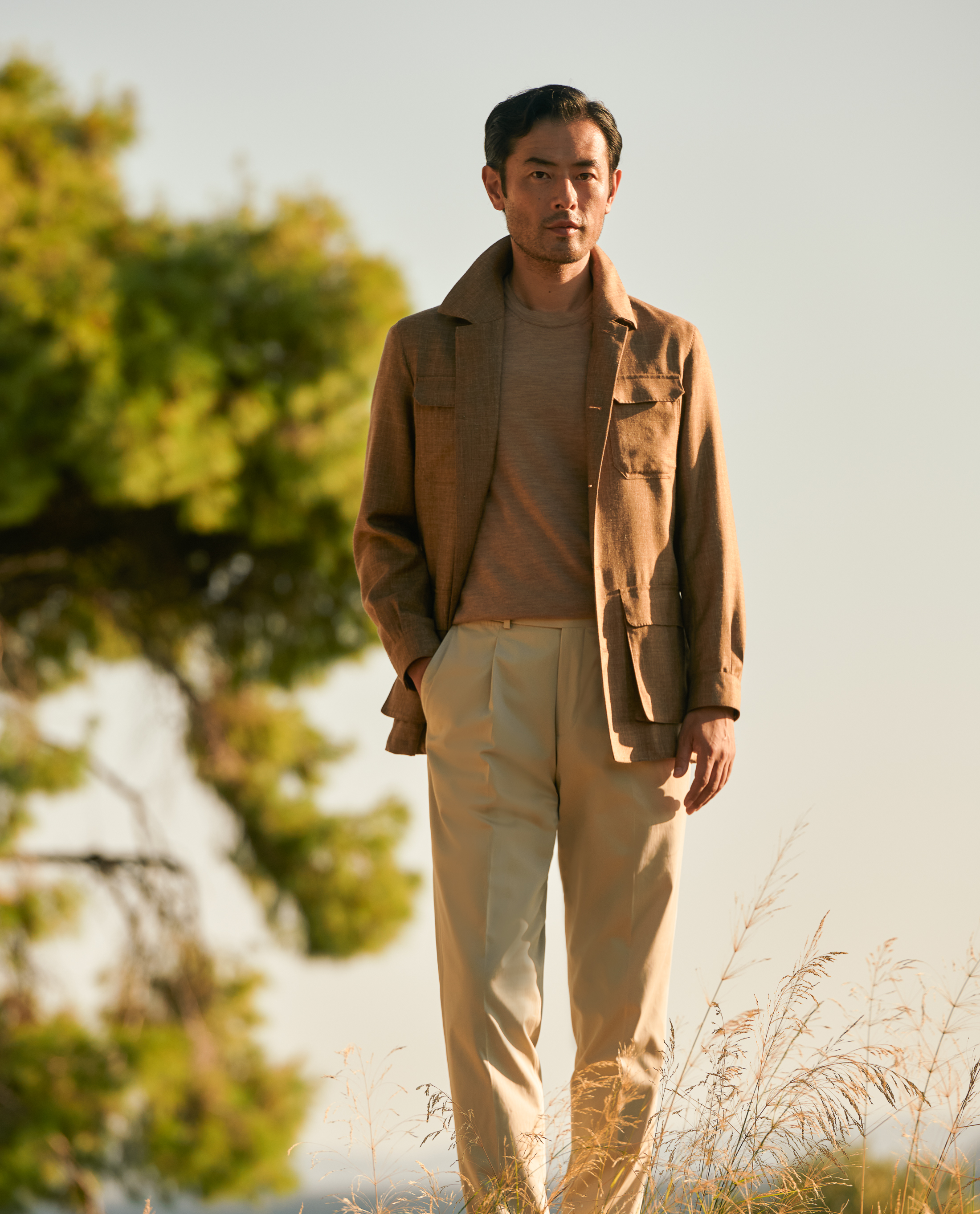Versatility is the name of the game with this caramel wool-silk-linen utility jacket. Less outspoken than our safari styles but with an equal dose of understated elegance, this jacket is easy to pair with smart-casual separates across the sartorial spectrum – such as this beige t-shirt knit, sand stretch trousers, and chocolate brown suede loafers.