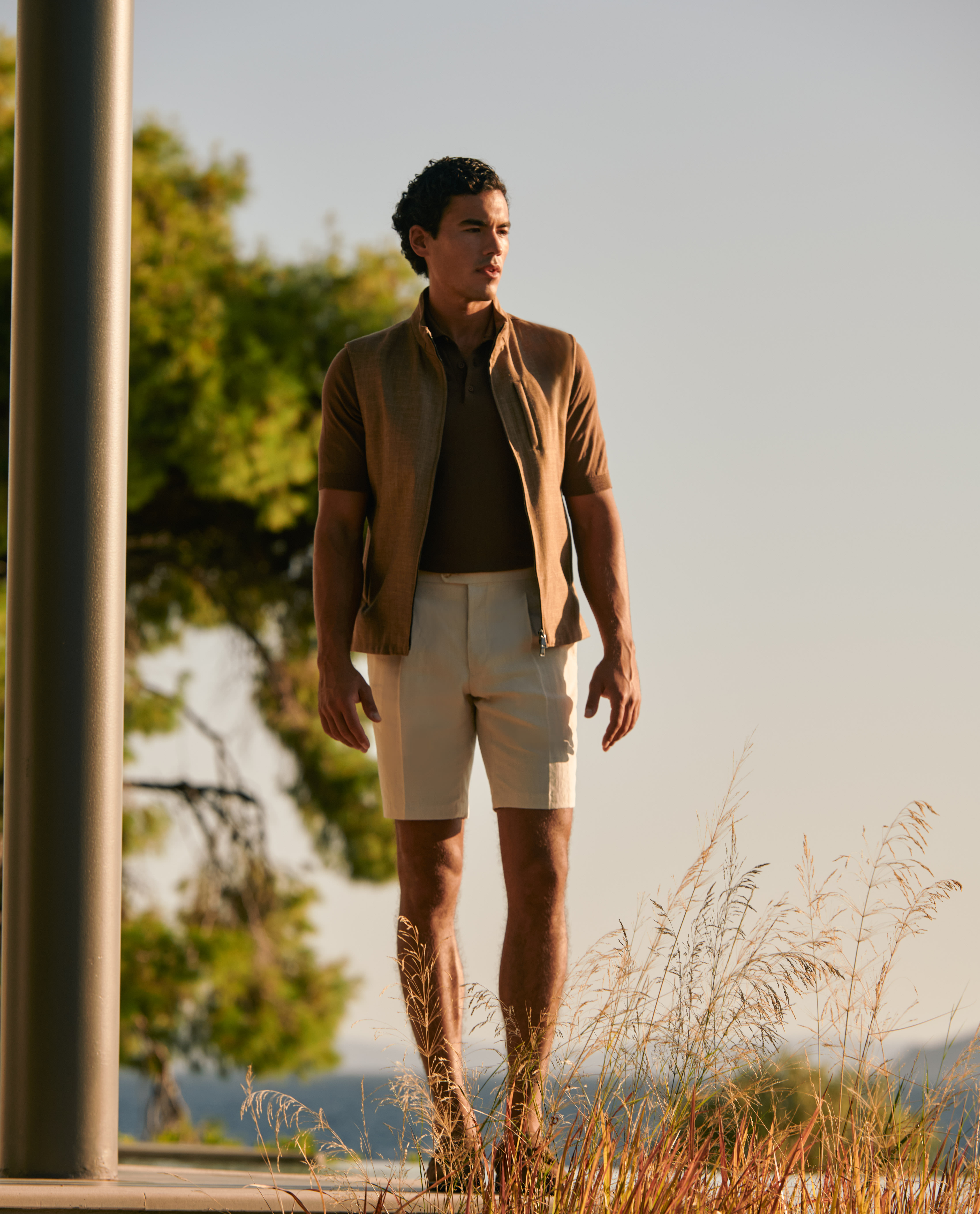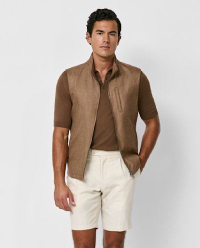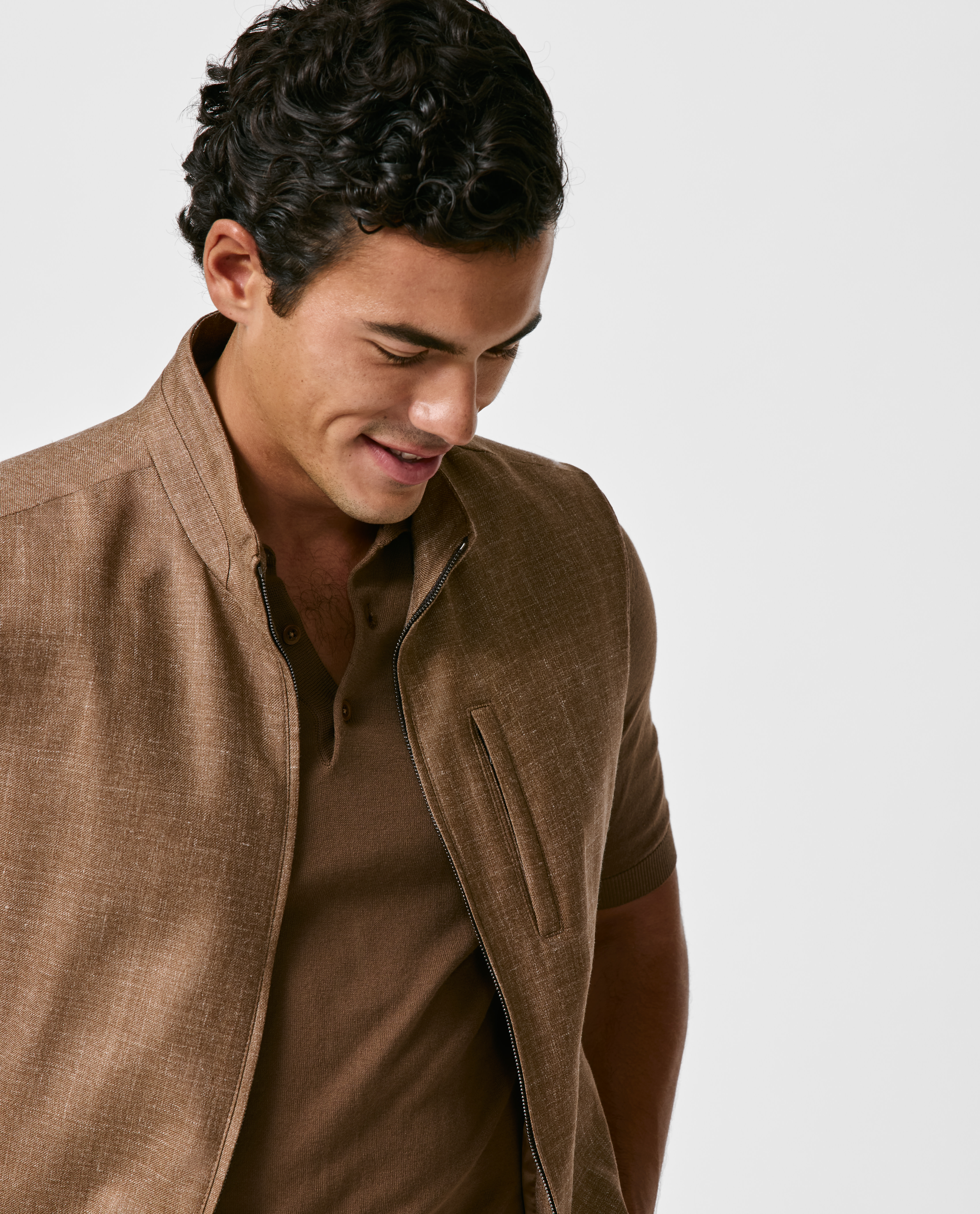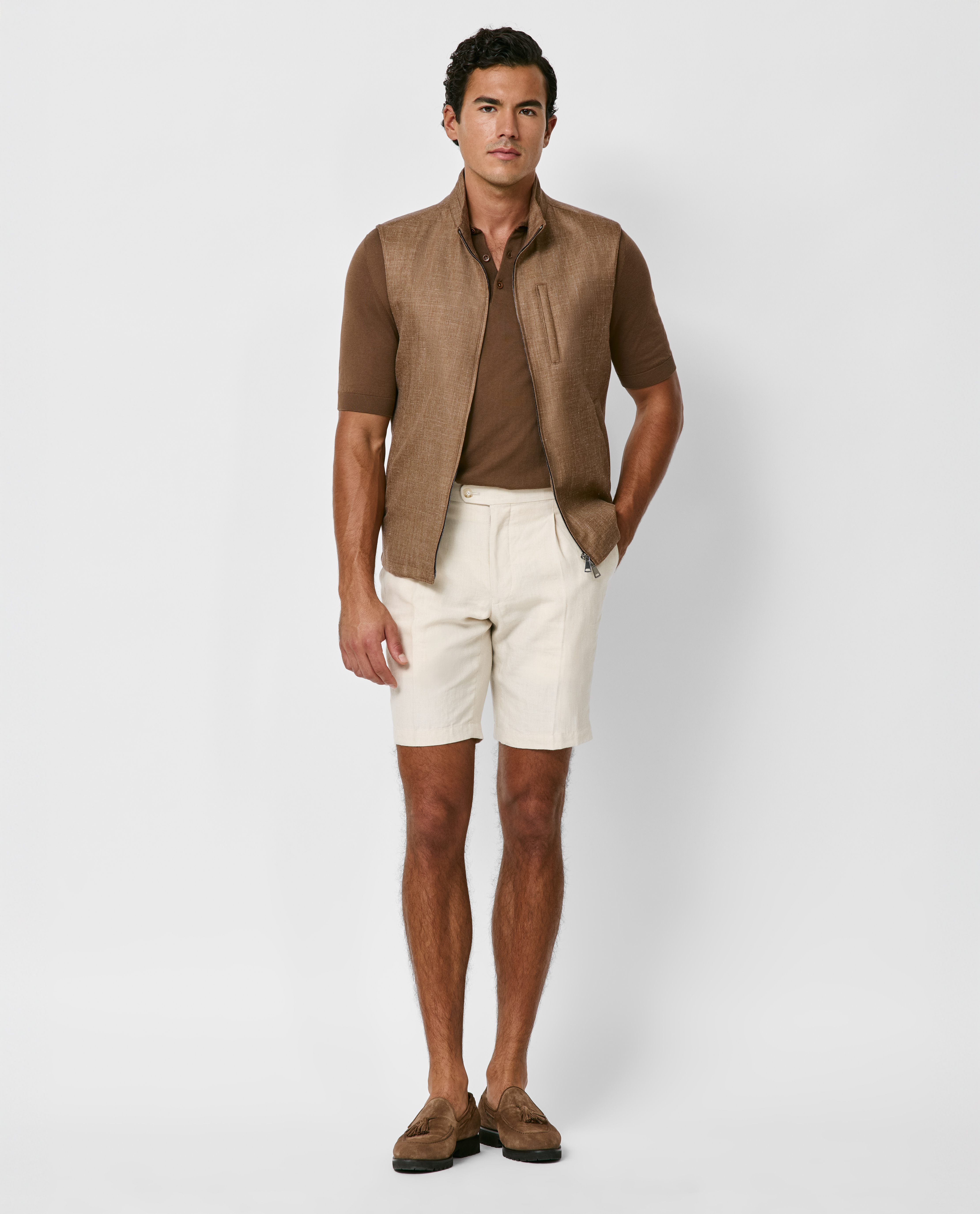 Think layering is just for the colder seasons? Think again. This caramel twill two-way zip vest is light, breathable, and easy to slip on and off as needed. Styled for casual coolness with varied textures and neutral tones: a cotton-silk polo knit, linen shorts, and chocolate brown suede tassel loafers.