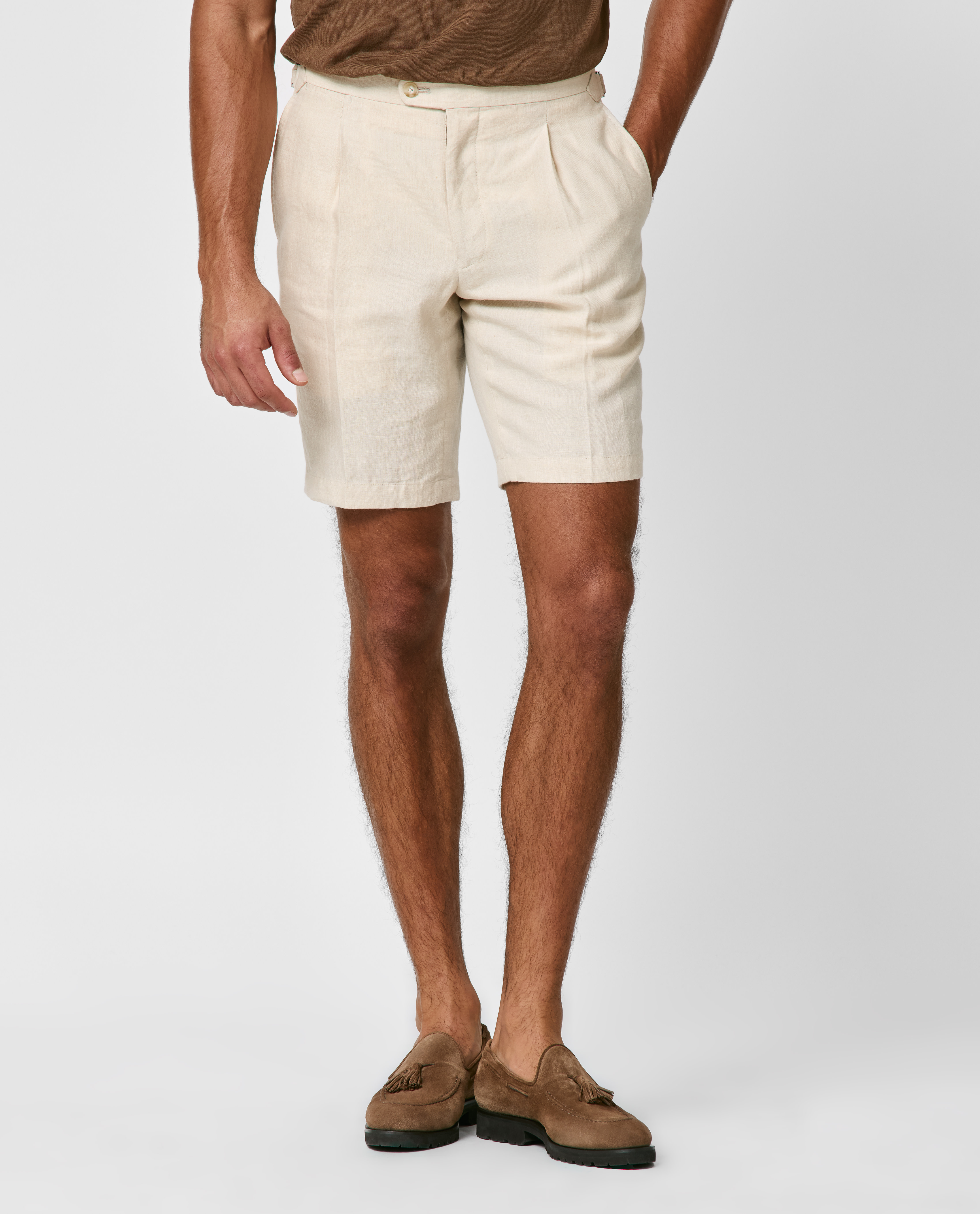 Bring freshness to your warm-weather wardrobe with these sand-colored linen shorts. Crafted from robust and hollow fibers, allowing for excellent regulation of body temperature and moisture absorption with durability. Designed here as bermuda shorts with a single pleat. Make these shorts your own with our many customization options to choose from. 100% linen Summer fiber Breathable Durable