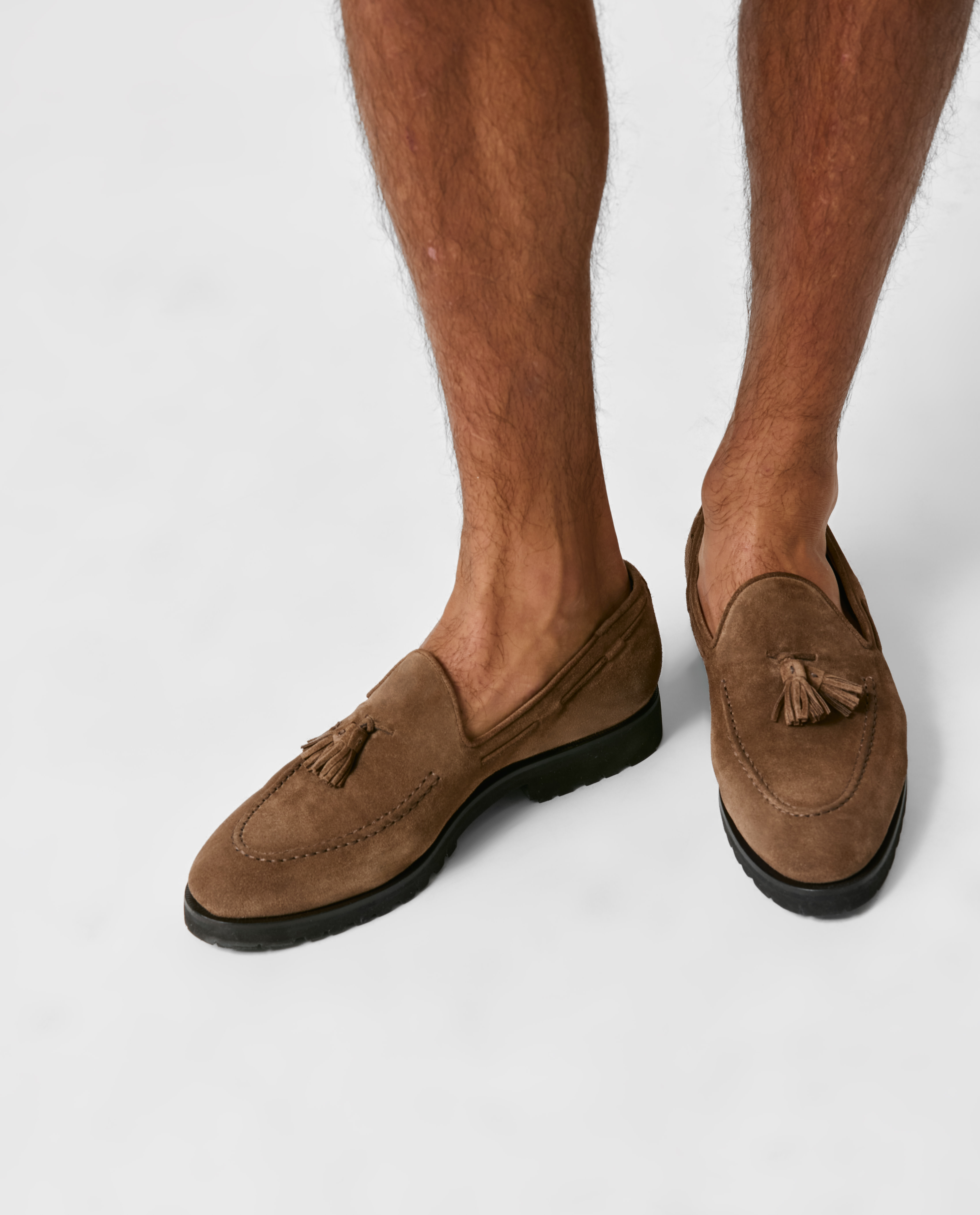 Embrace summer comfort in these lightweight loafers in chocolate brown. The light suede is made from flexible chrome-tanned calfskin with a short nap for a touch of softness. Designed here as tassel loafers for extra adornment. Make these shoes your own with our many customization options to choose from. Handmade Light suede Calfskin leather Chrome tanned