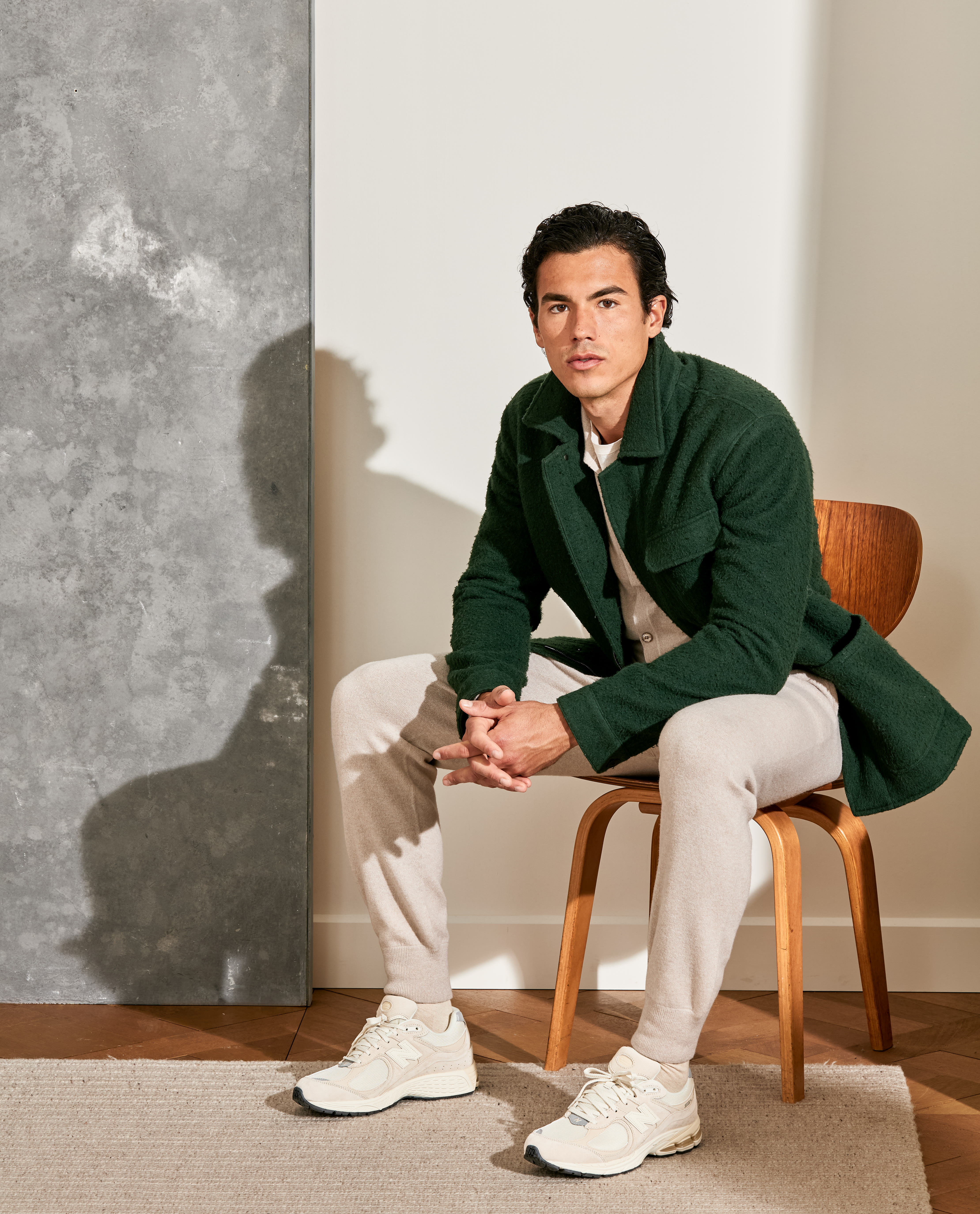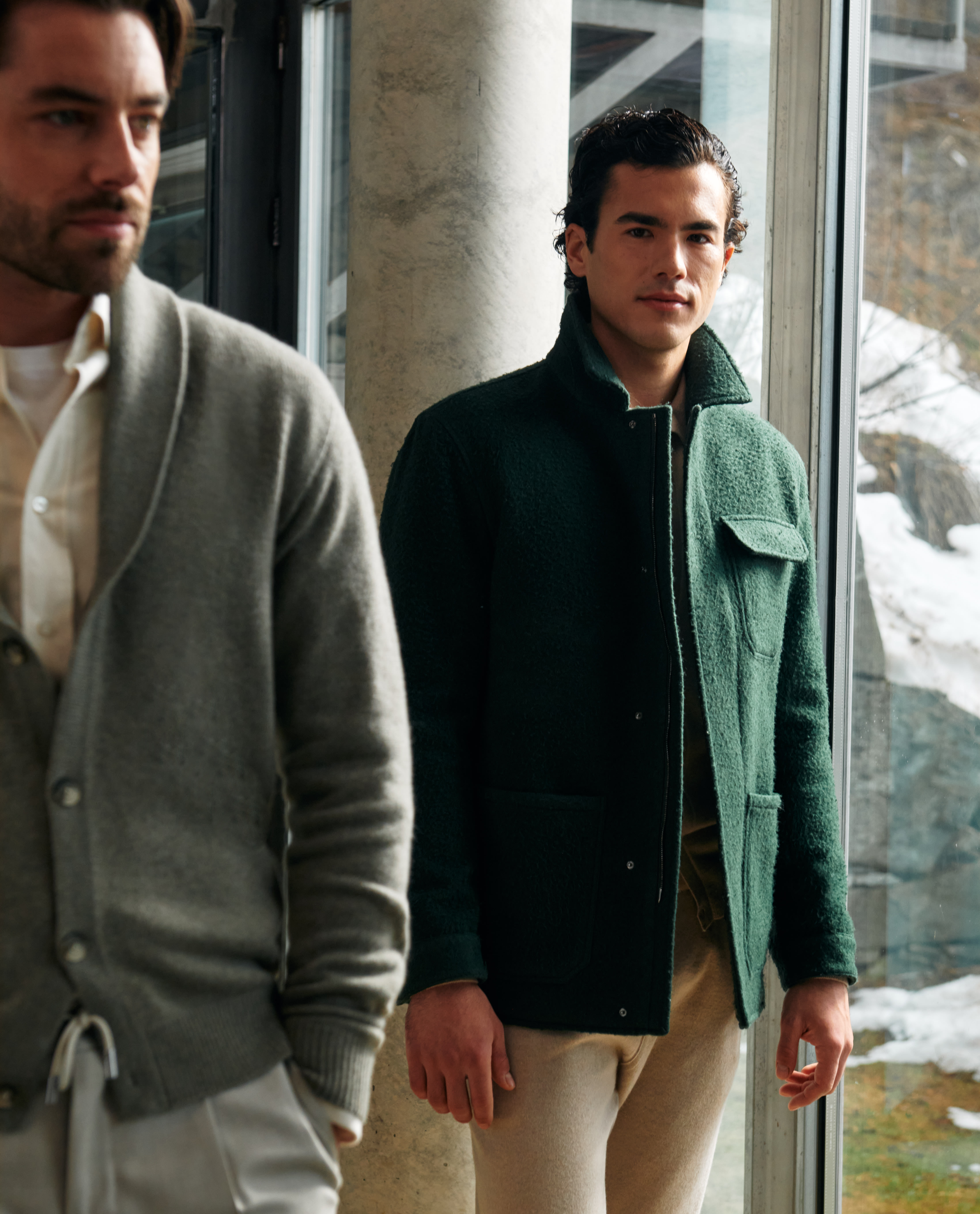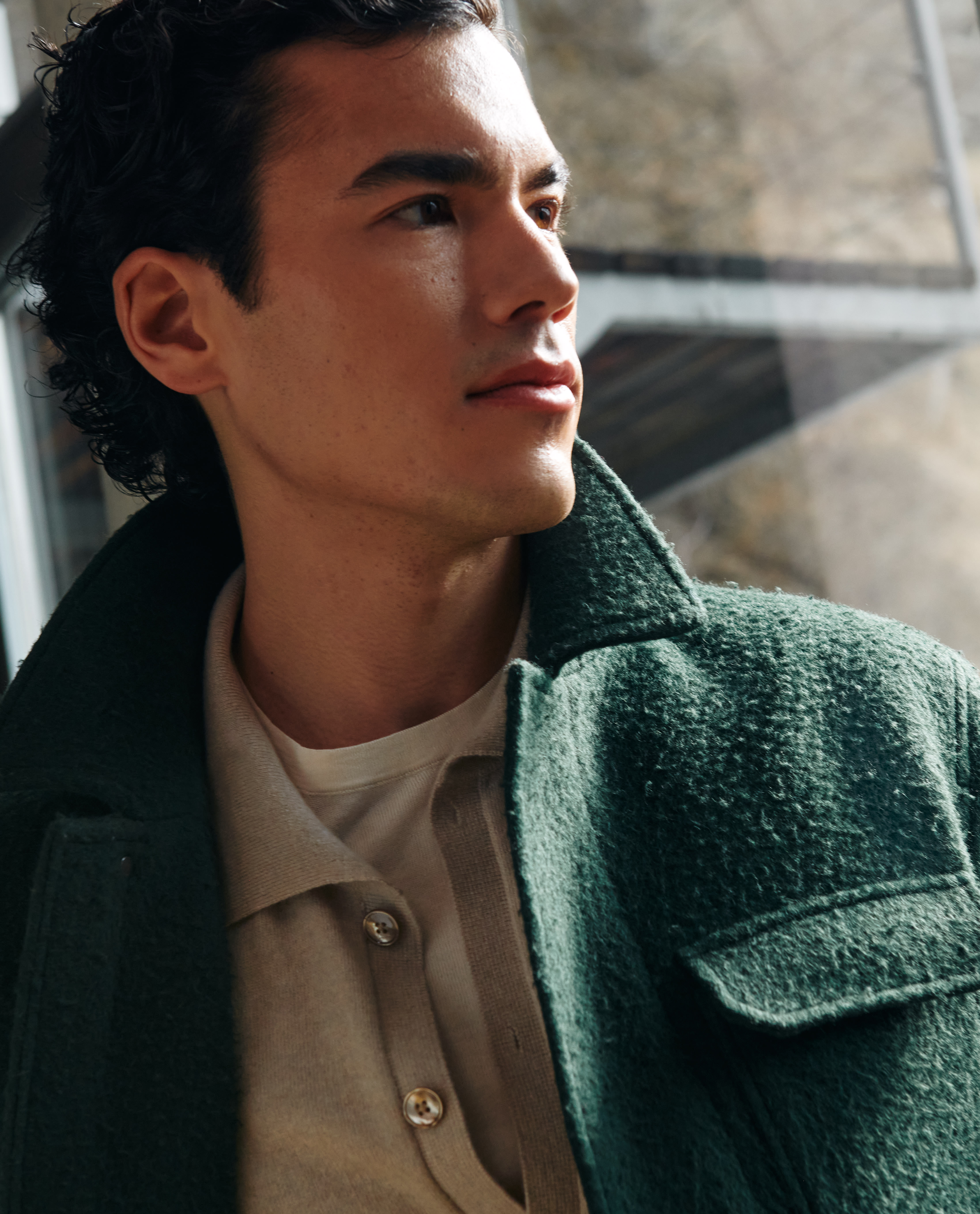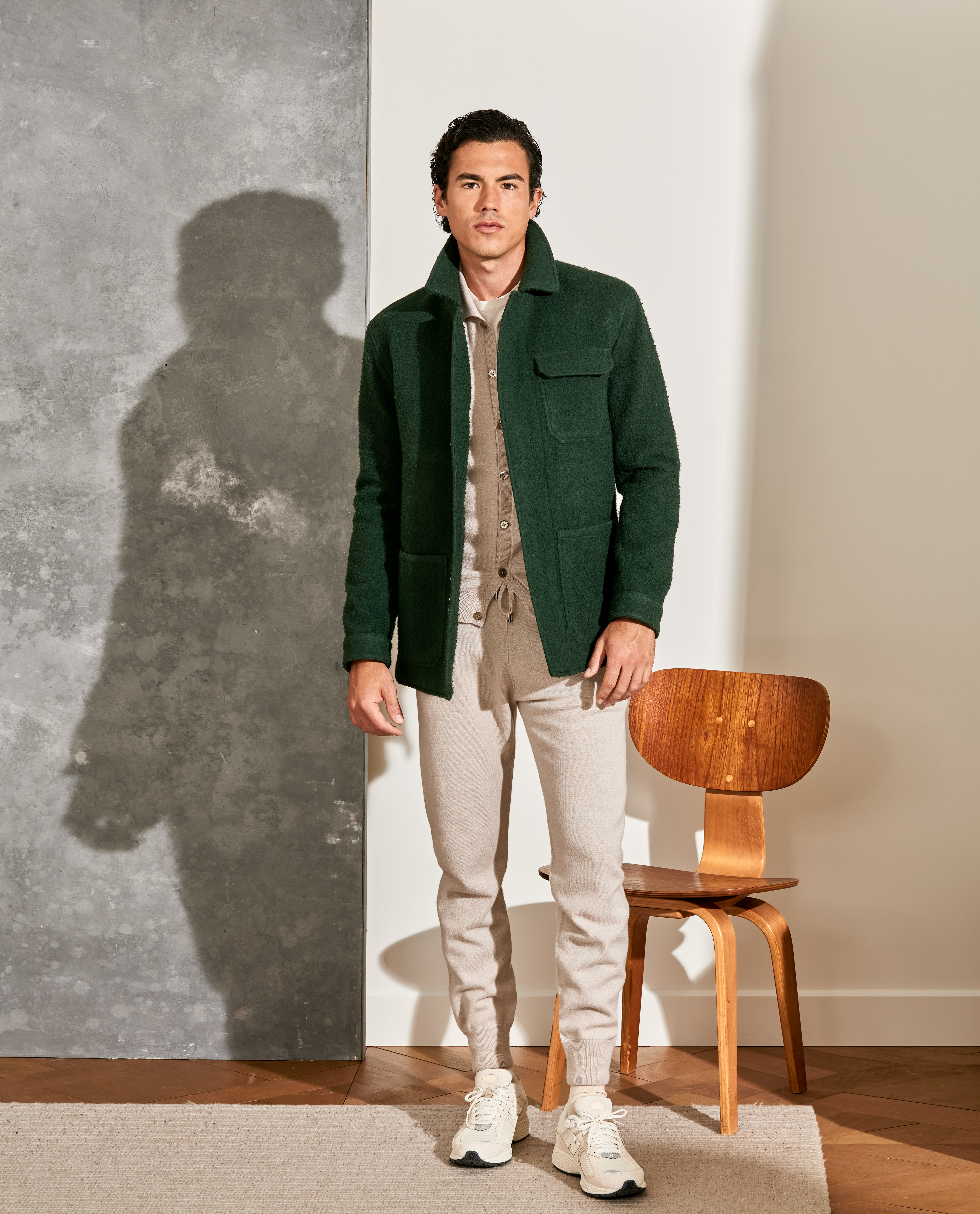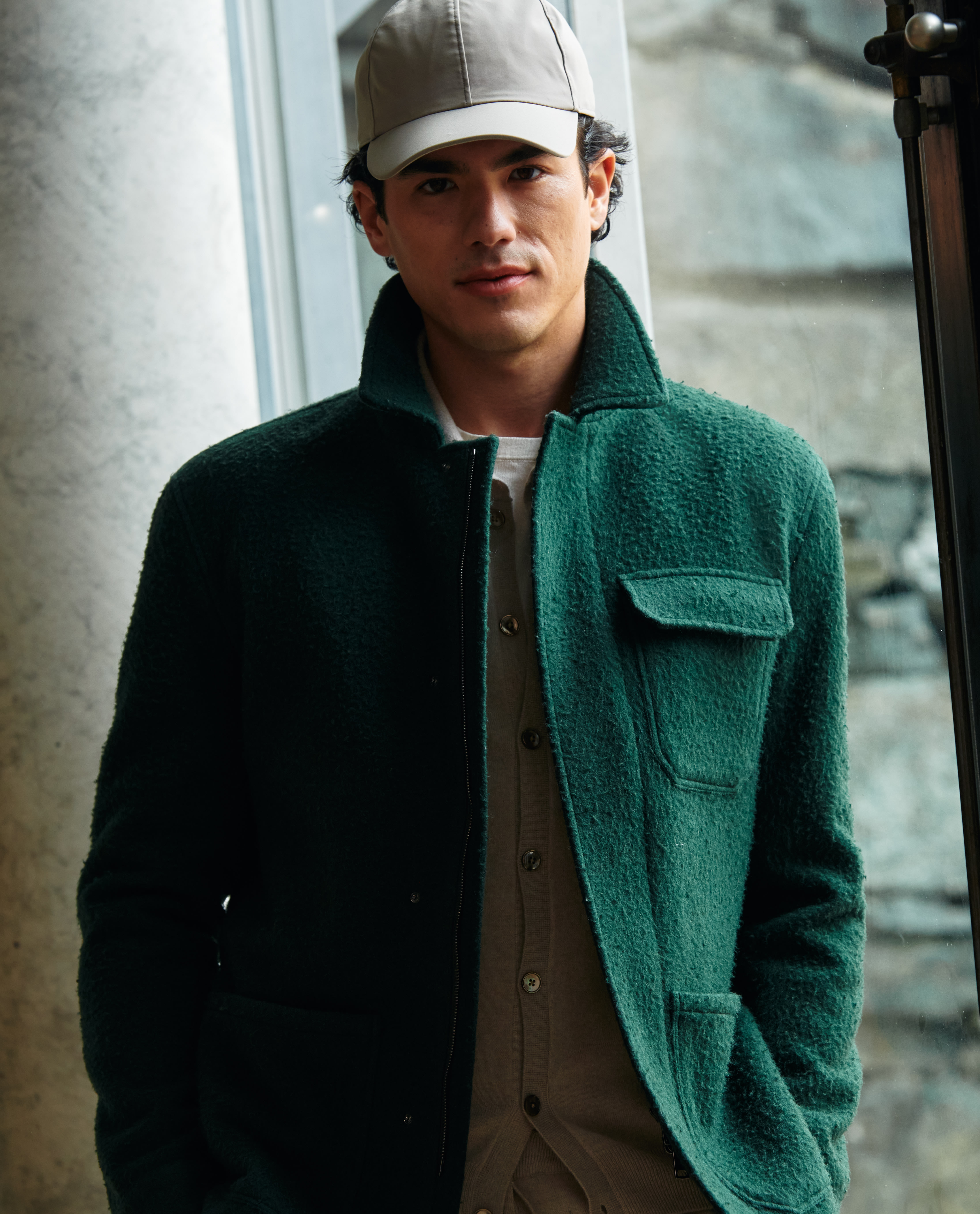 Made from nubby Casentino wool, this bottle green utility jacket combines our most lightweight construction with a robust overcoat fabric to create an outstanding piece of hybrid outerwear. Curated for transitional-weather weekends with a matching leisure set and your favorite pair of New Balance sneakers.