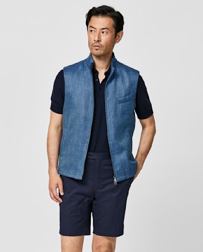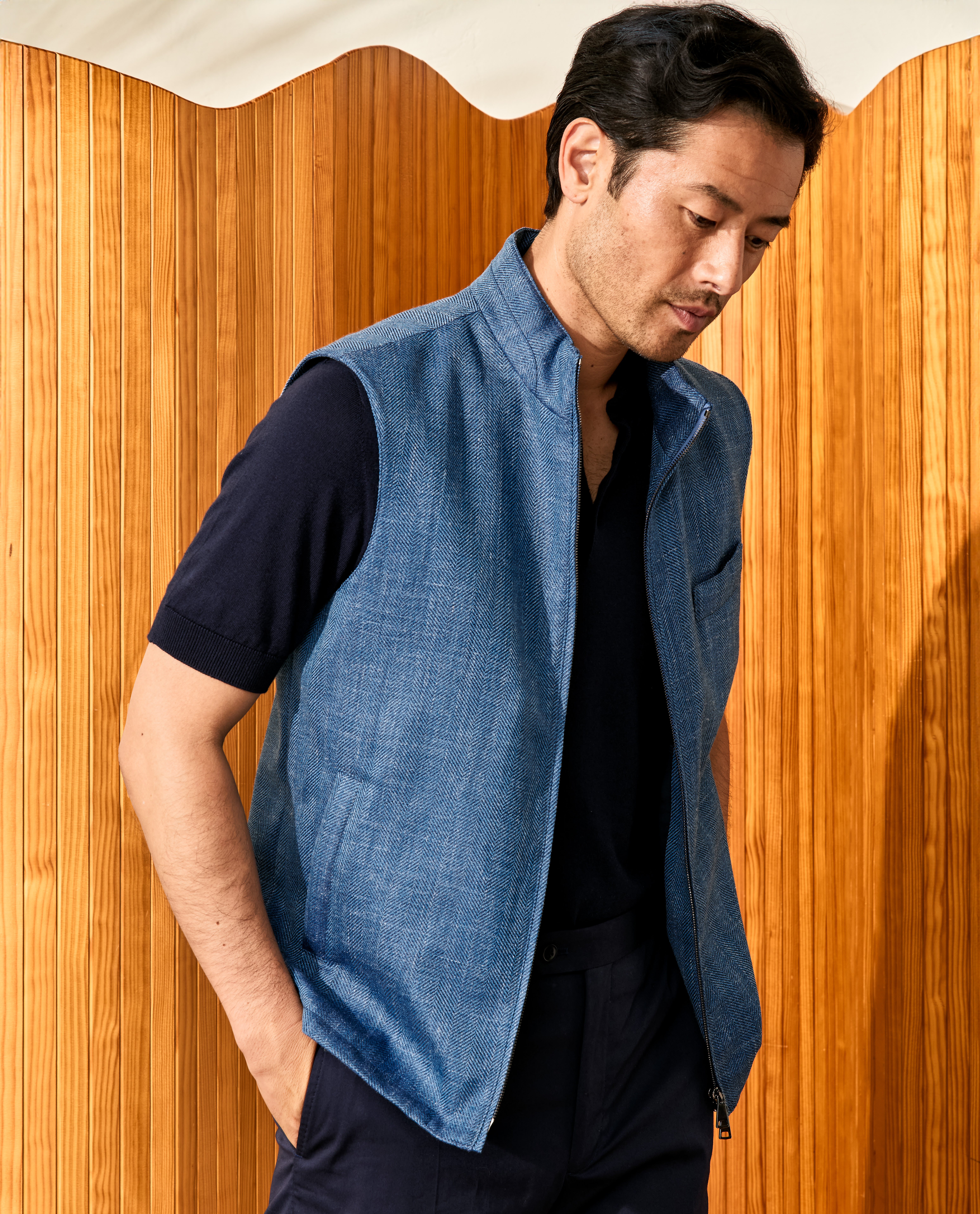 Crafted from a lightweight wool-silk-linen herringbone weave, this versatile cobalt blue vest was designed with a practical two-way zip closure and timeless rounded welt chest pocket. Pair it with dark blue summer essentials and your favorite espadrilles to create a comfortable, smart-casual seasonal look.