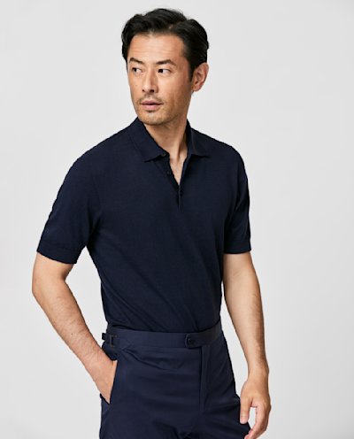 This navy blue knit is summer friendly with a seamless finish. Crafted from a blend of breathable Turkish cotton and soft Inner Mongolian cashmere. Designed here as a polo with buttons, in double yarn. Make this knitwear your own with our many customization options to choose from.