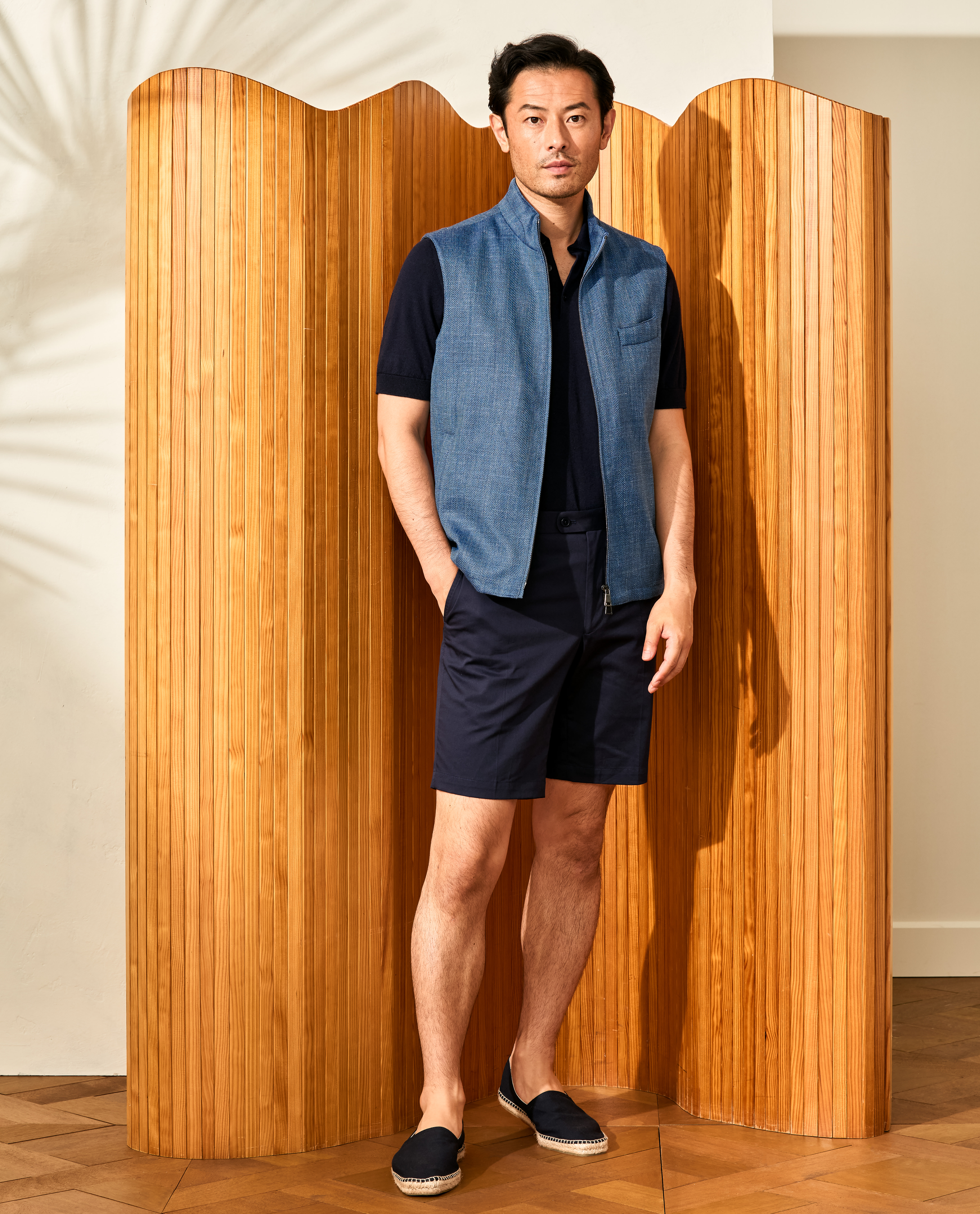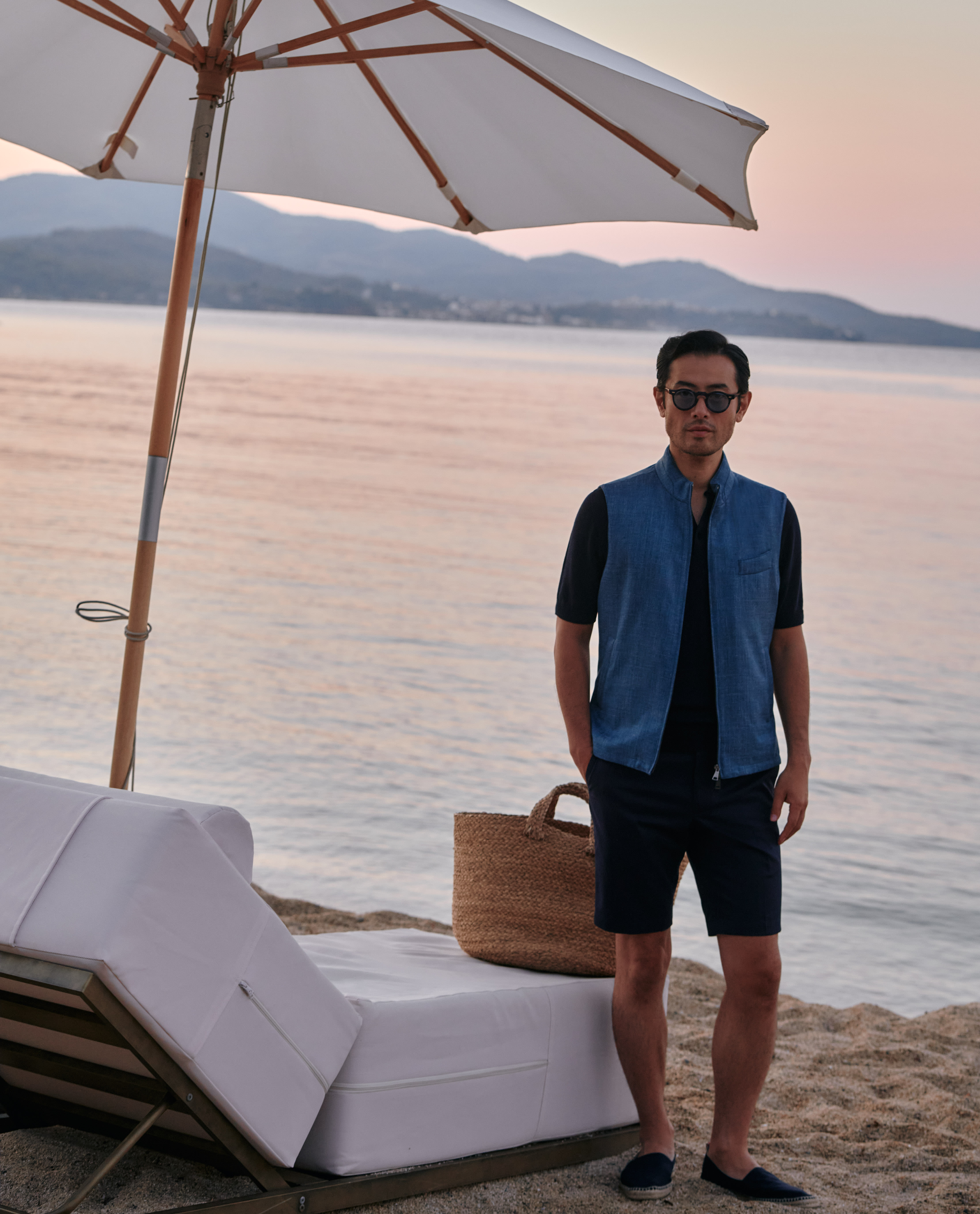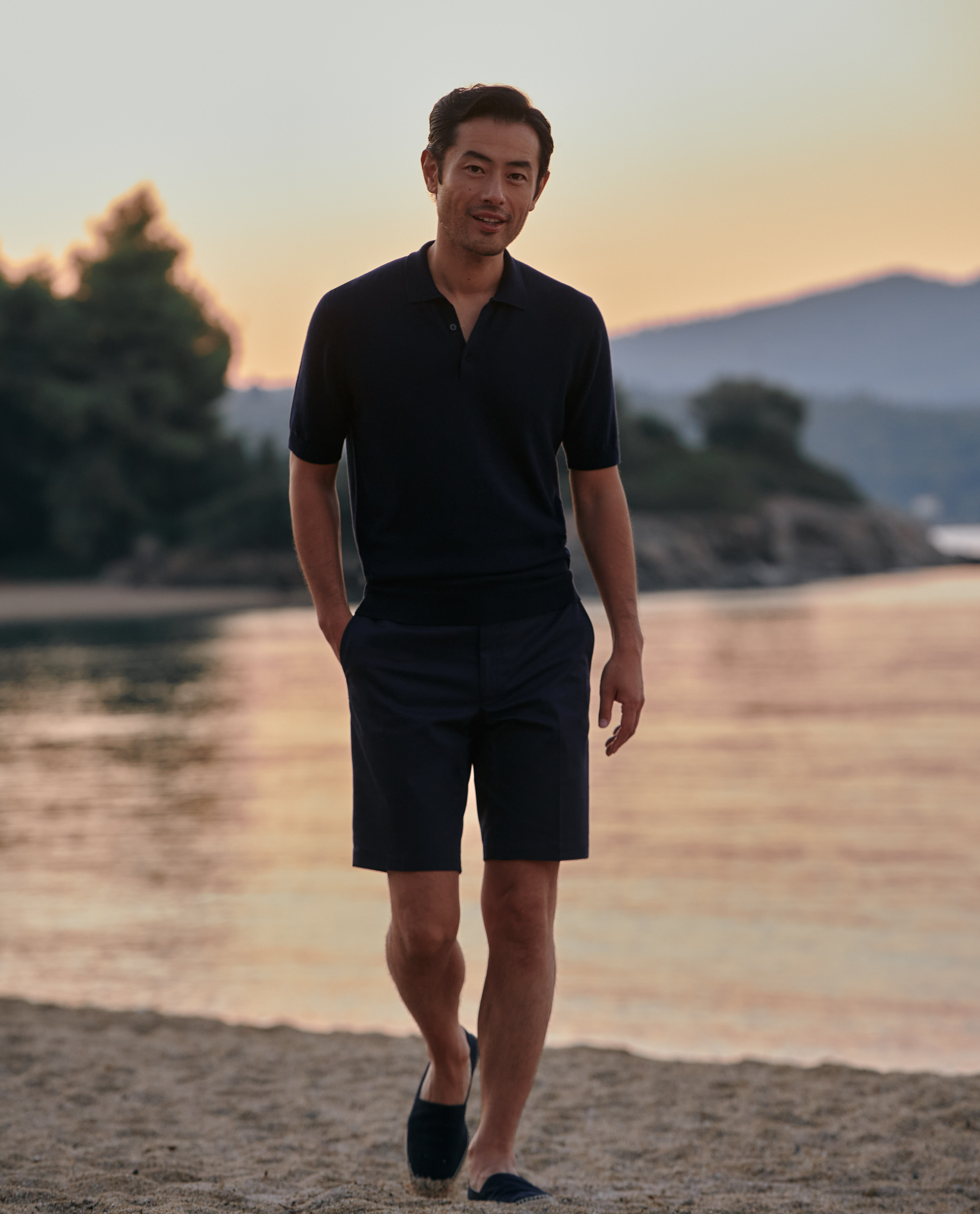 A study in blue: our cobalt herringbone vest, navy stretch cotton Bermuda shorts, and navy cotton-cashmere polo knit make for the ultimate summer trio. Captured here by the beach, but just as stylish in the city. All it takes is your favorite pair of espadrilles to complete the look.