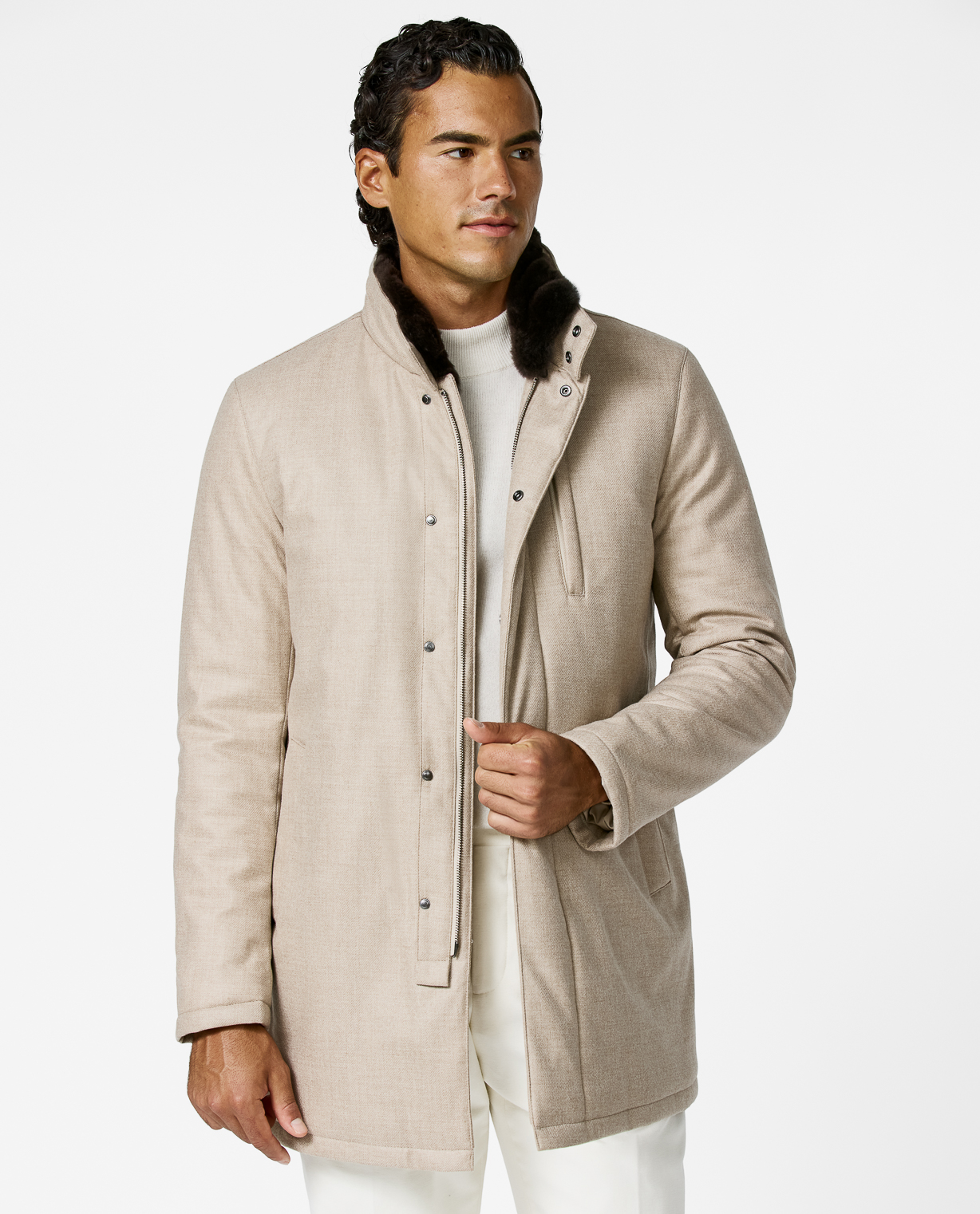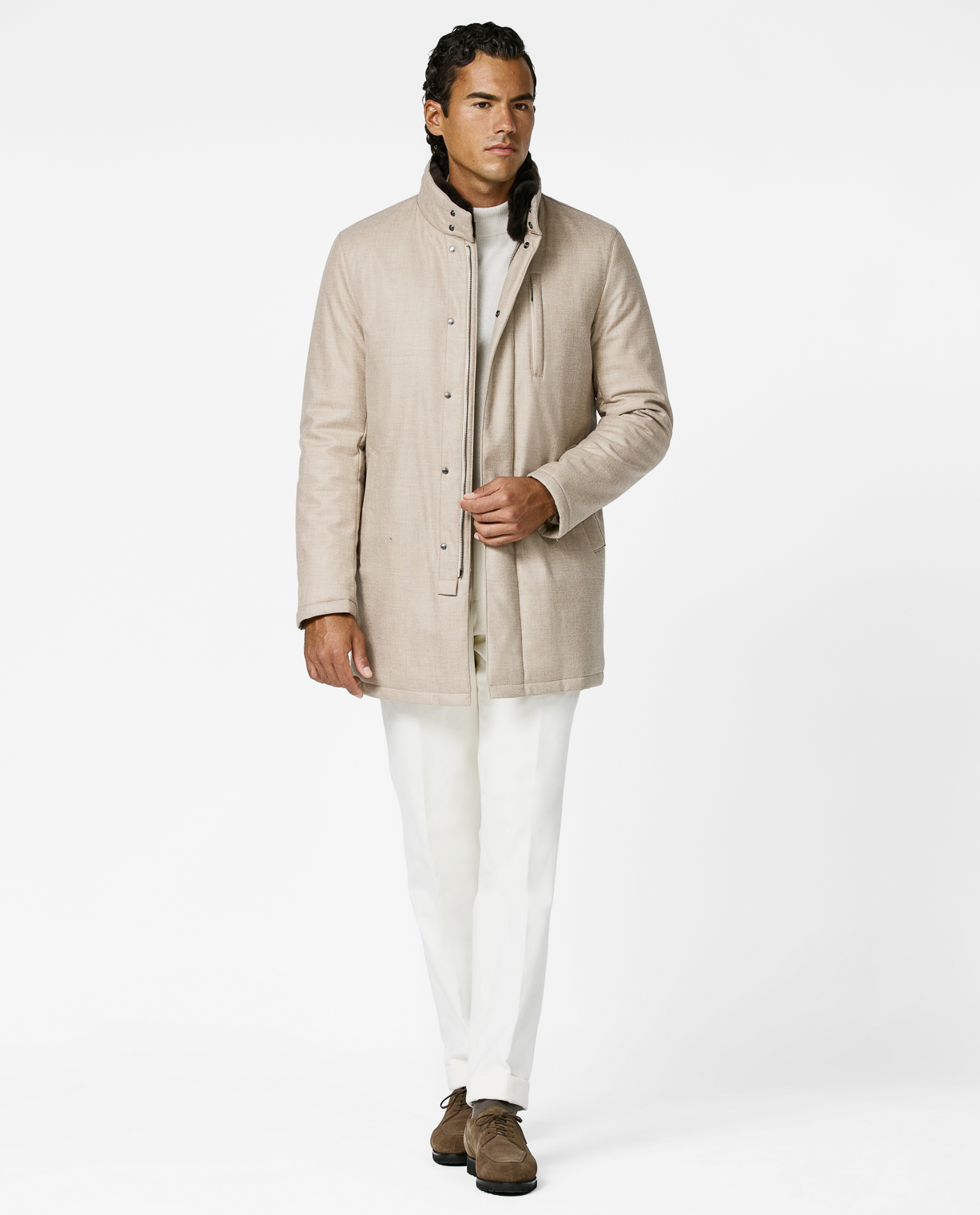 Luxurious and protective, the fur-collared Connor coat, made in Italy by Loro Piana, is designed to shield against the elements while exuding timeless style. Layered here with a cream wool-cashmere mock neck, off-white stretch cotton moleskin trousers, and finished with taupe suede split-toe Bluchers, the look balances refined comfort with weather-ready sophistication.