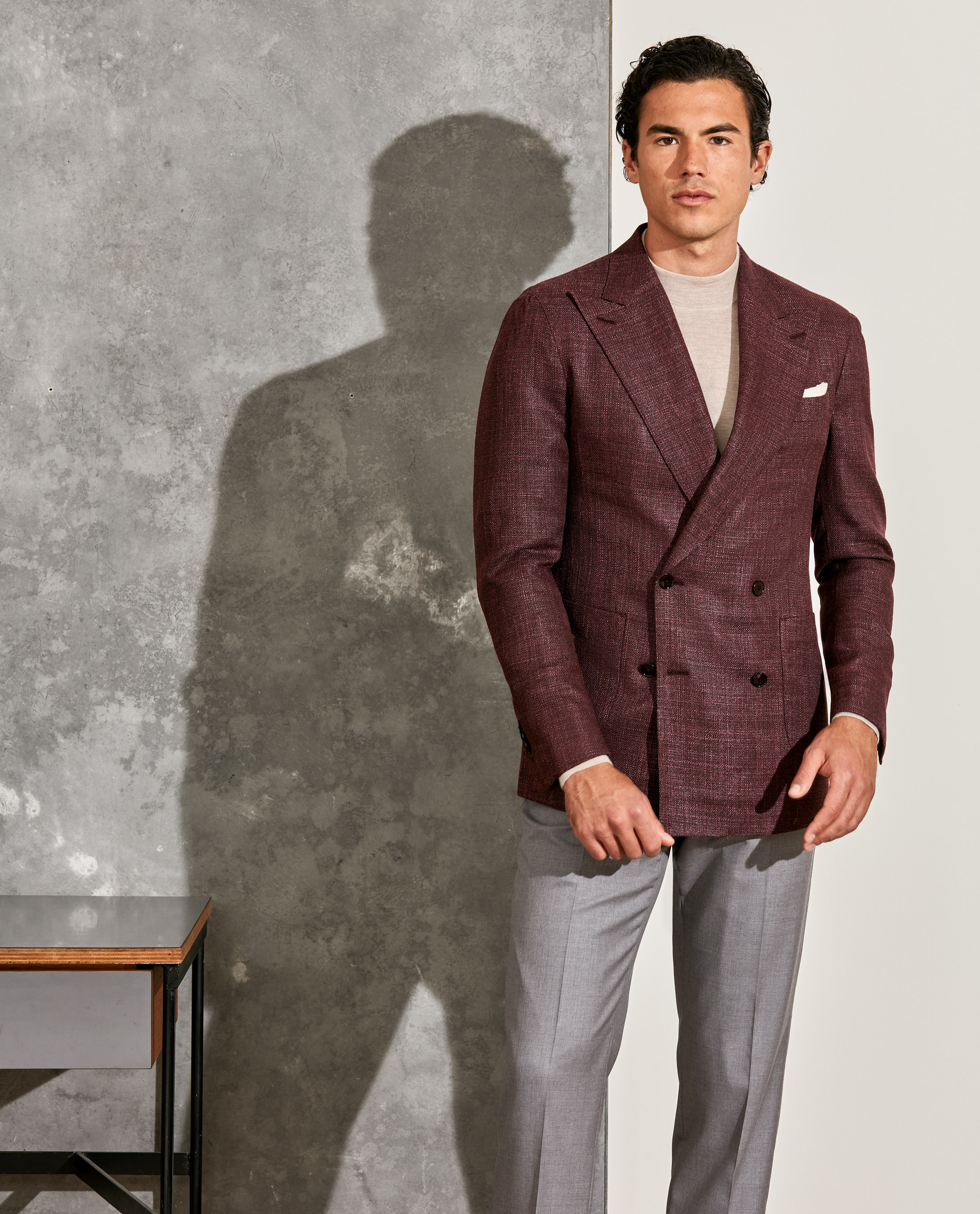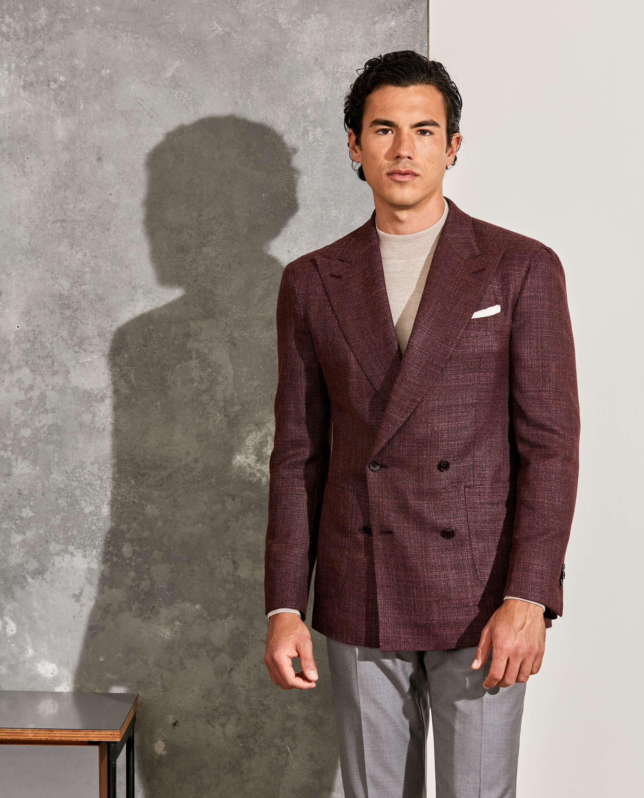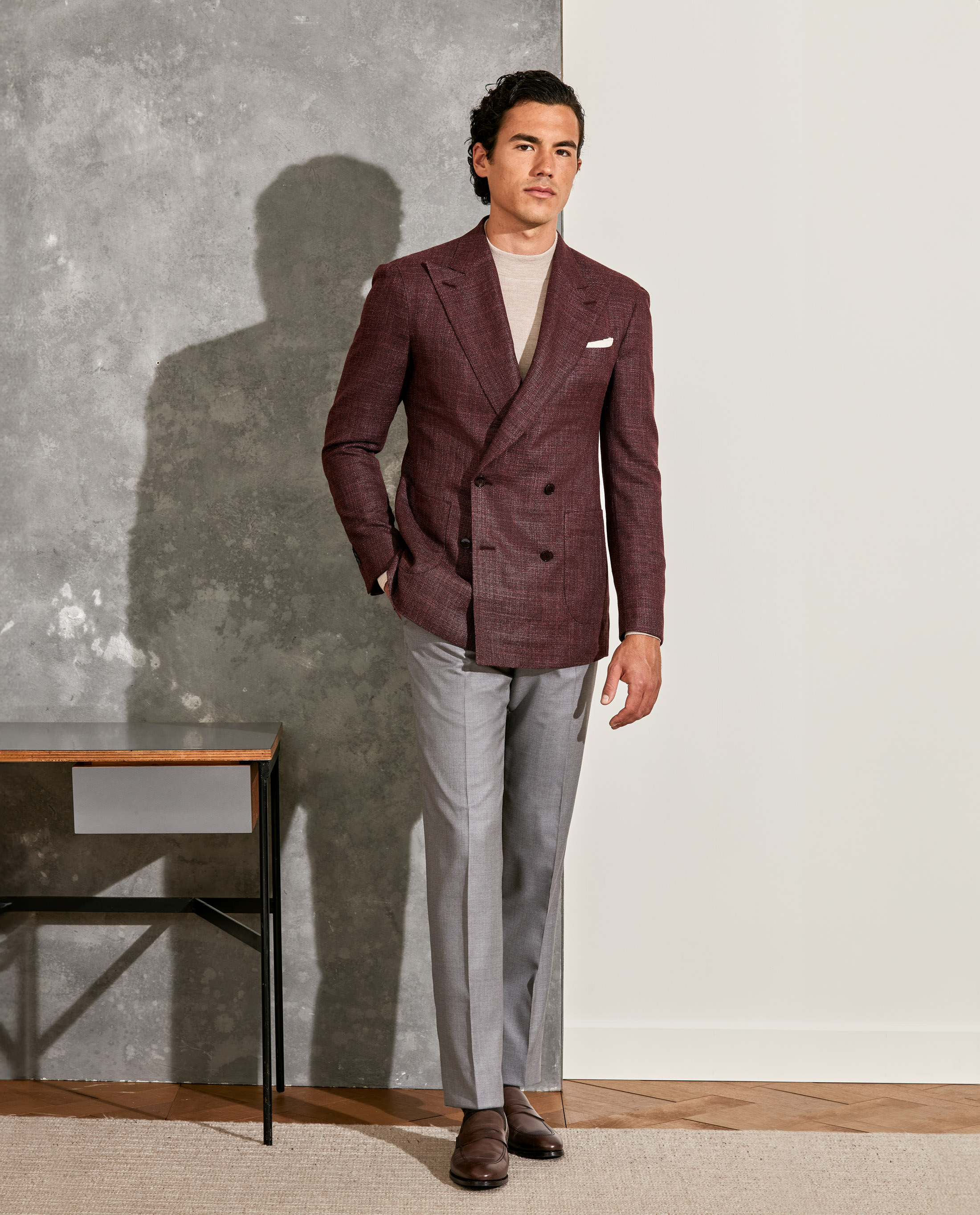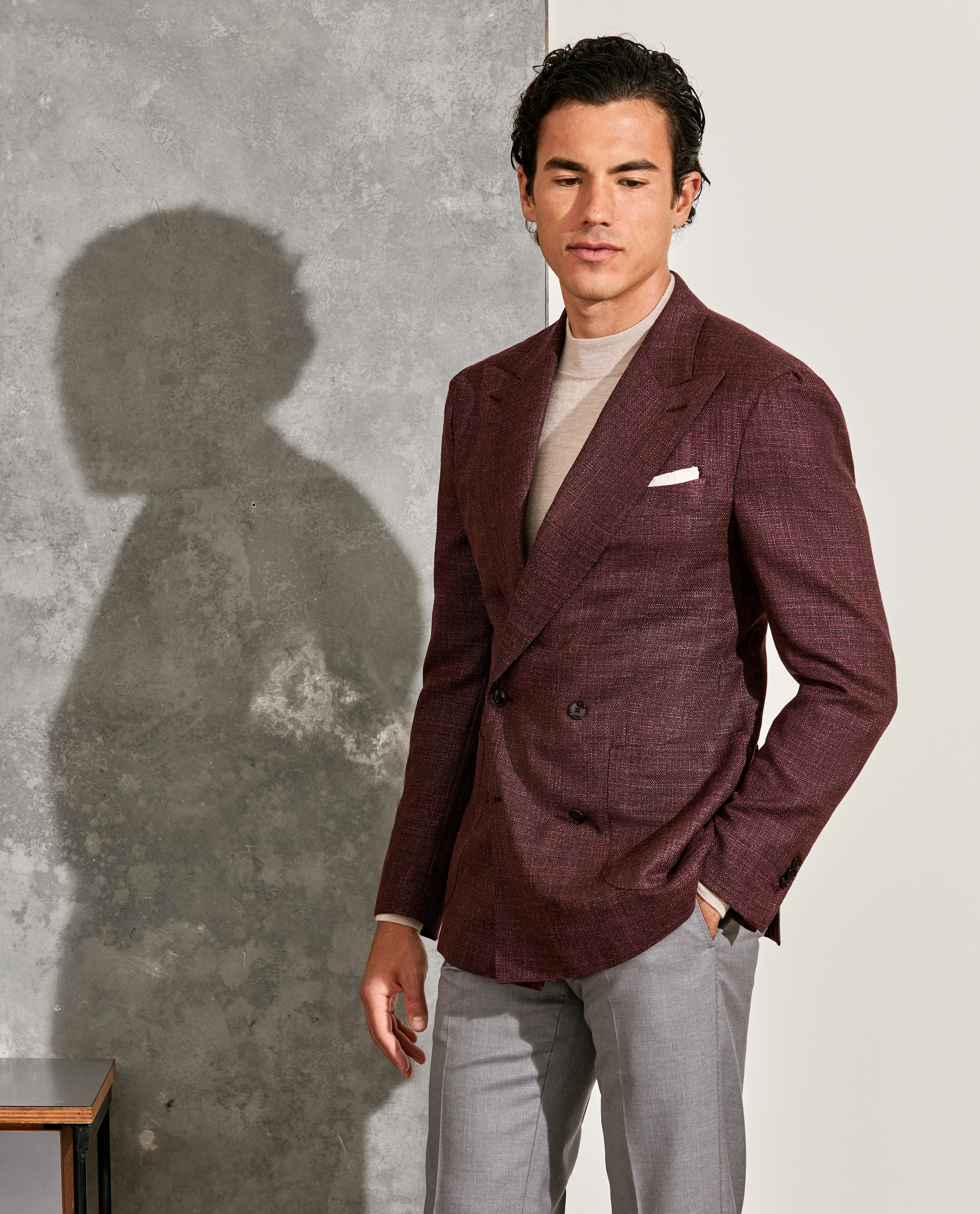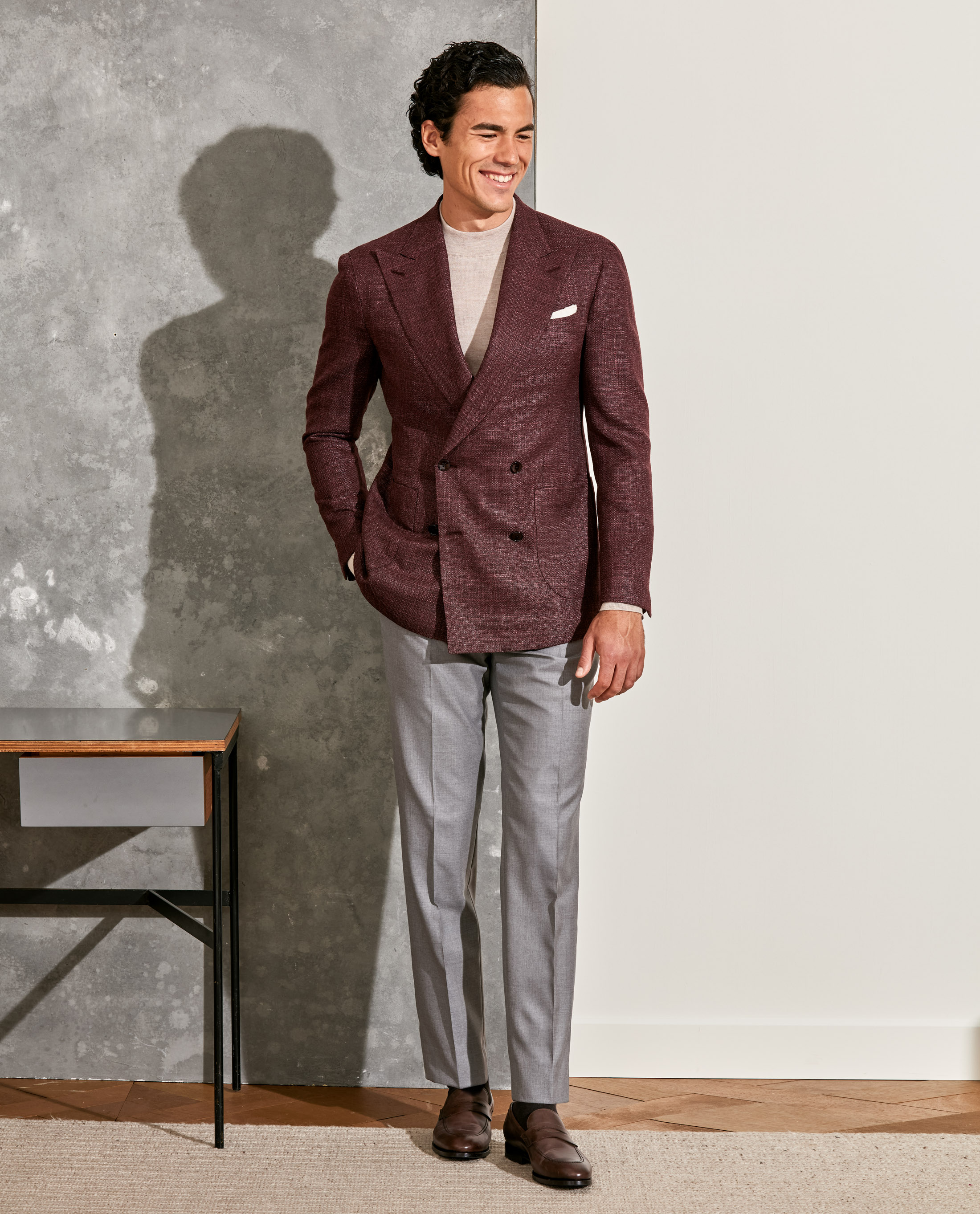 Looking to add distinction without going over the top? This double-breasted construction with peak lapels offers just the right amount of flair — crafted here in a textured, fall red blend of 90% wool and 10% silk with natural stretch. Styled with a cashmere-silk mock neck knit, gray S130 trousers, a beige flannel pocket square, and dark brown calfskin penny loafers.