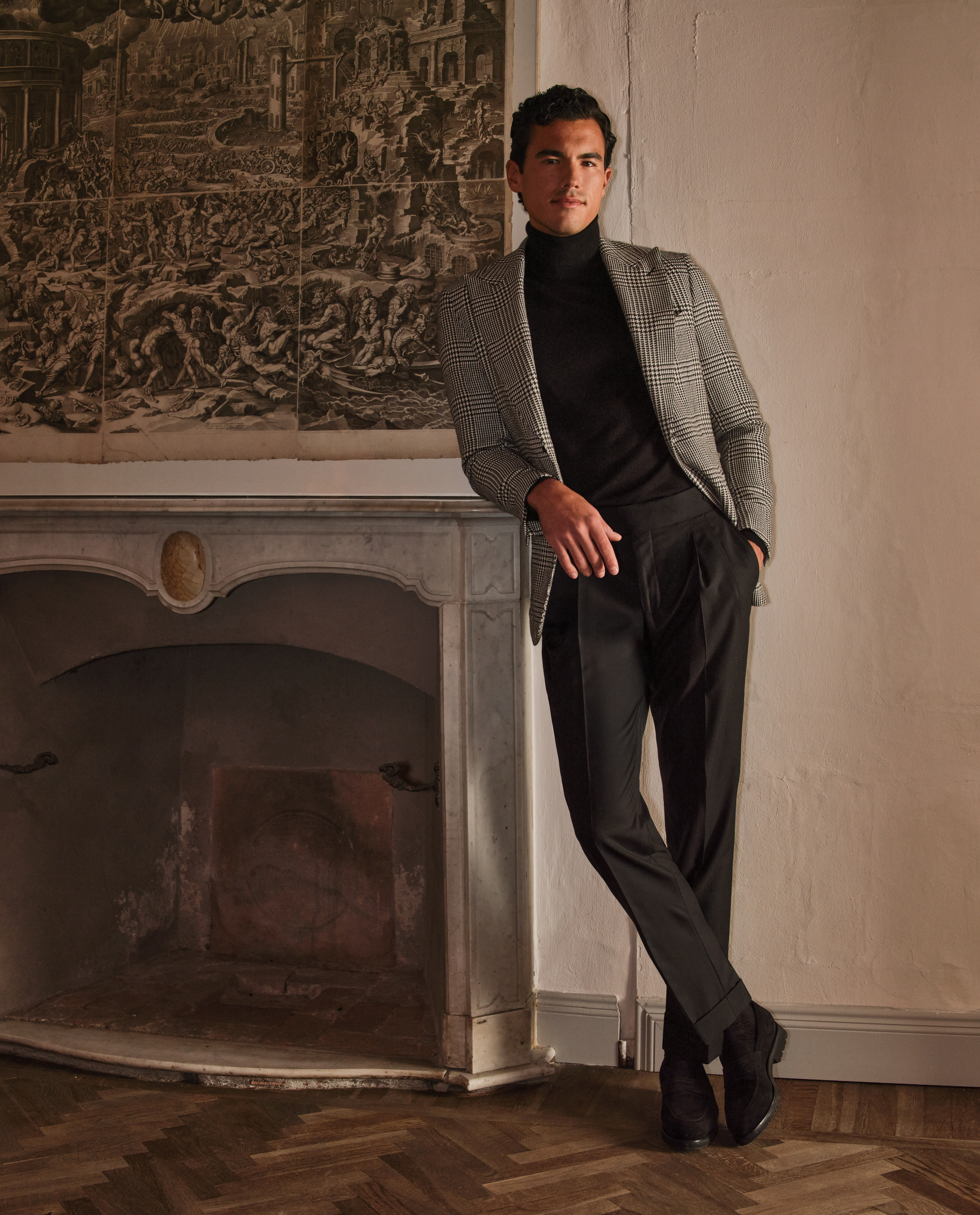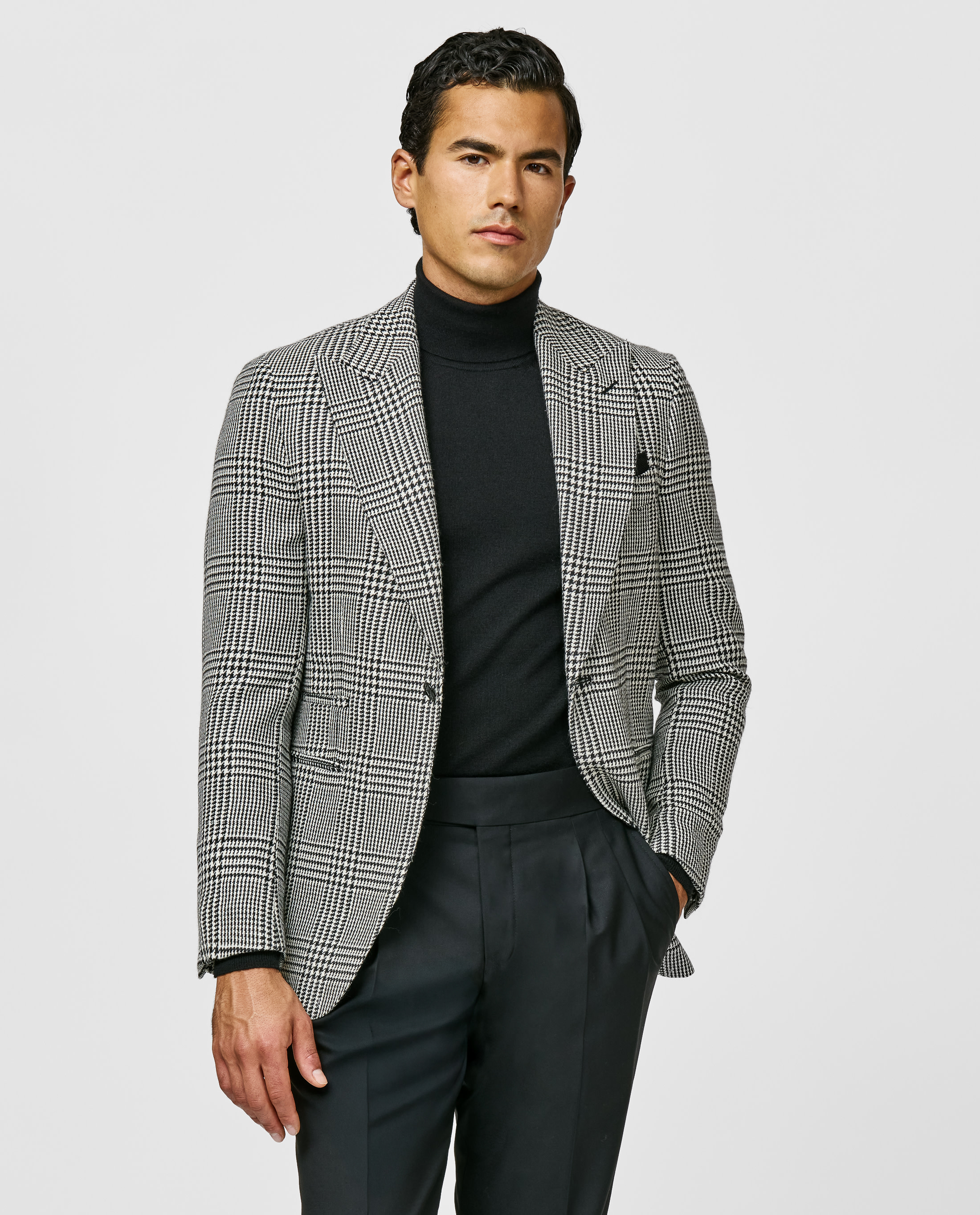 Elevate this statement Glen plaid jacket with a sleek and tonal black ensemble. A black turtleneck, black S150 wool trousers, and black suede penny loafers create a look that is both distinctive and effortlessly versatile.