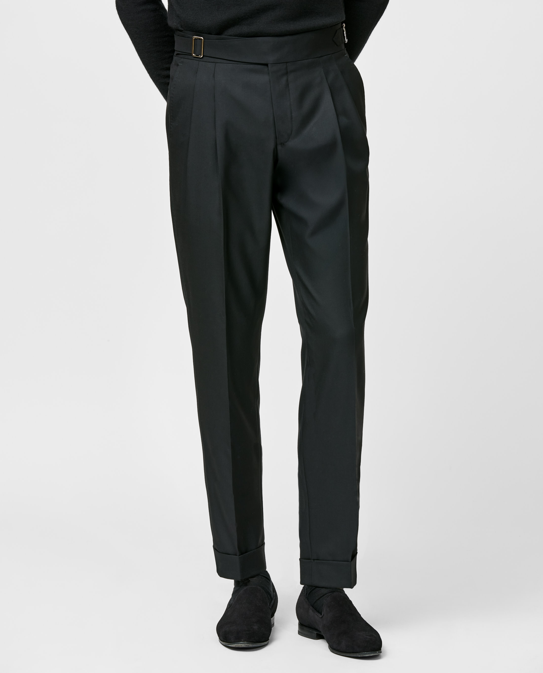 Luxurious and clean cut, these black trousers strike a harmonious balance between indulgence, comfort, and charm. Crafted from S150 wool with a smooth feel and excellent drape. Ideal for a memorable special occasion in any season. Designed here in our high-waisted Gurkha-style trousers, featuring an extended waistband and double pleats. Make these trousers your own with our many customization options to choose from.