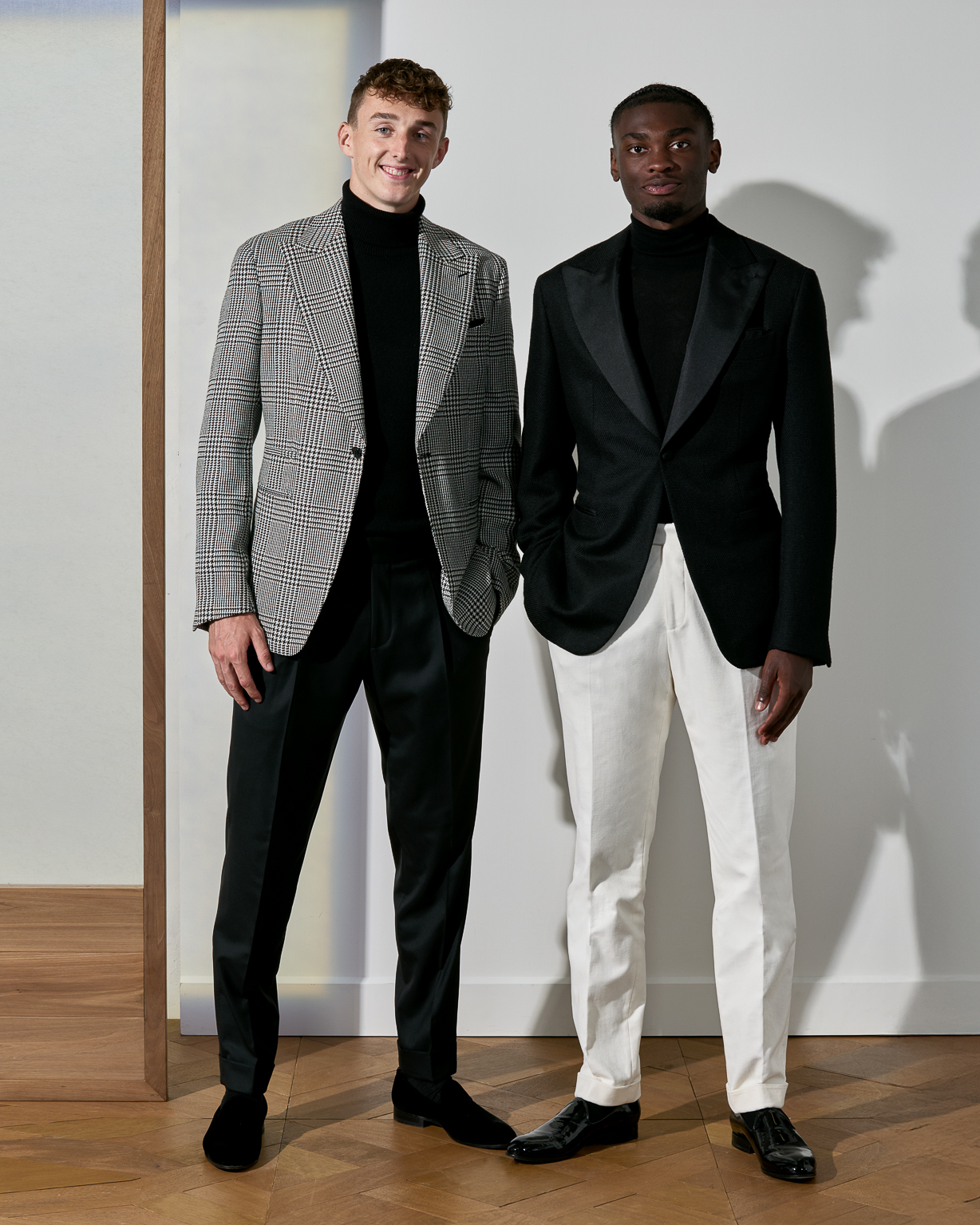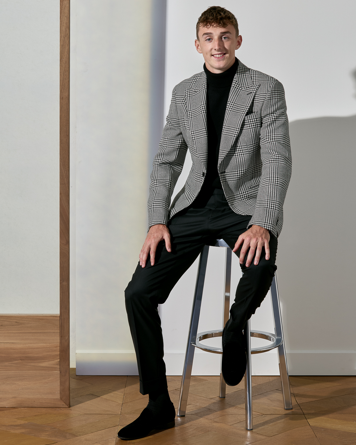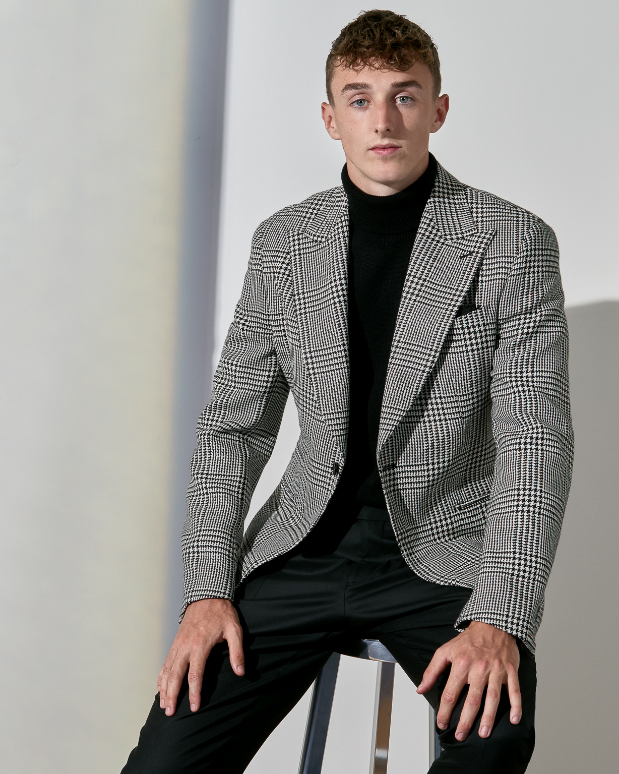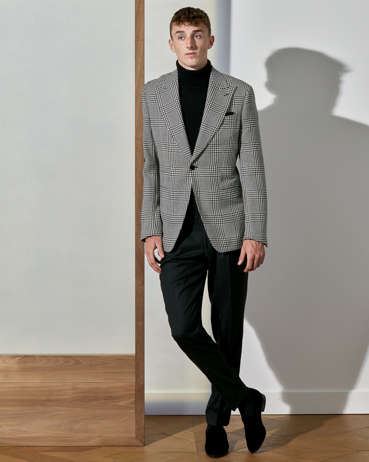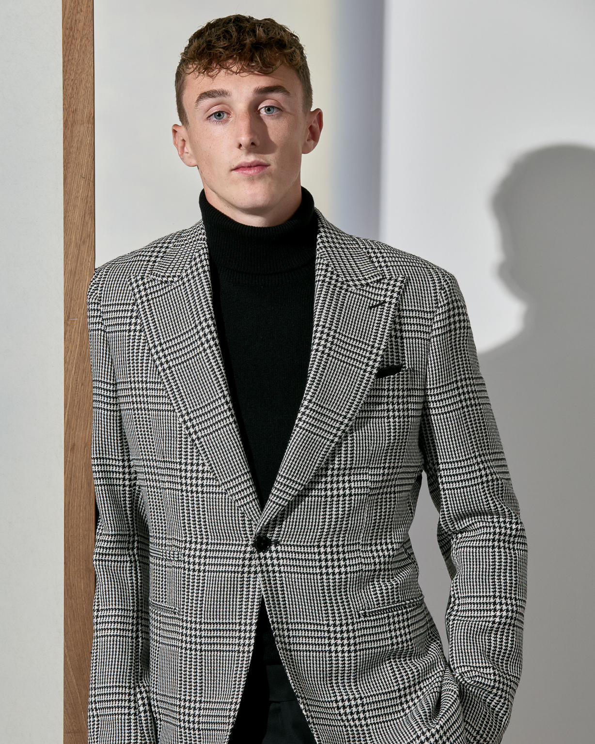 Youri Baas, central defender at AFC Ajax, elevates this statement Glen plaid jacket with a sleek tonal black ensemble. A black turtleneck, black S150 wool trousers, and black velvet loafers create a look that is both distinctive and effortlessly versatile.