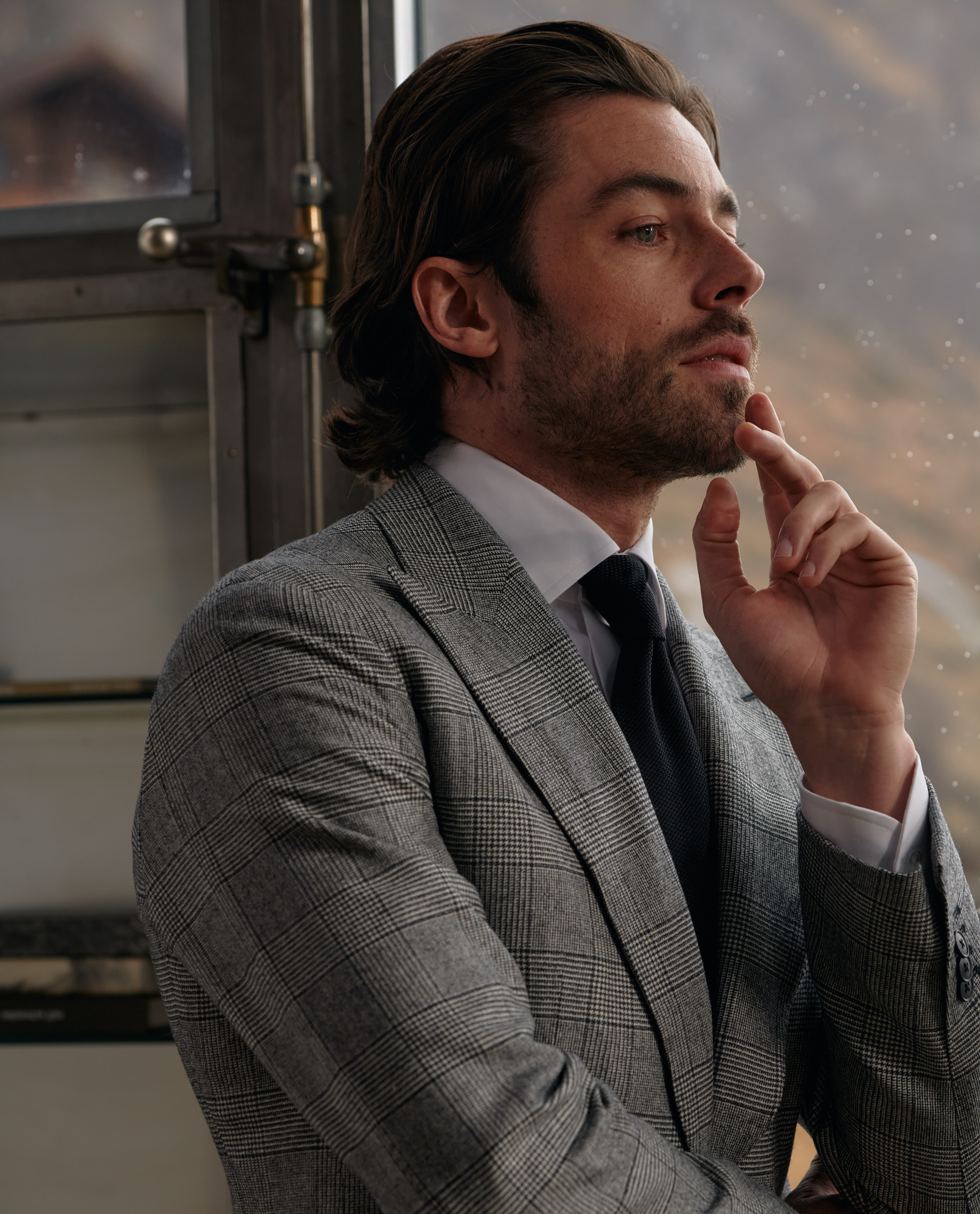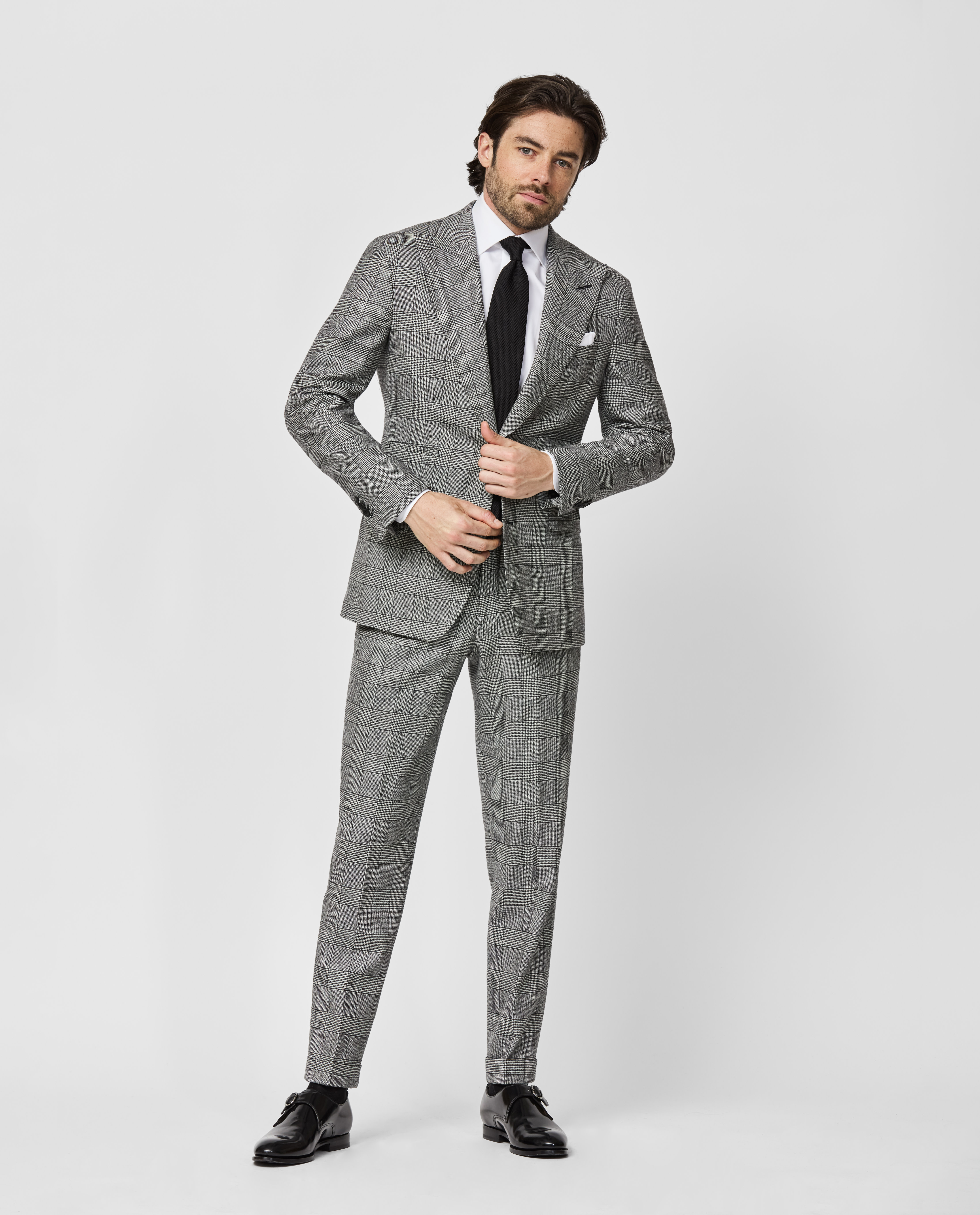 Comfortable, crease-resistant, and entirely timeless, this stretch gray Glen plaid suit will get a workout this winter. Curated for the office with a classic white shirt and silk tie combo. Shown here with black polished plain tip monks for an extra-formal finish.