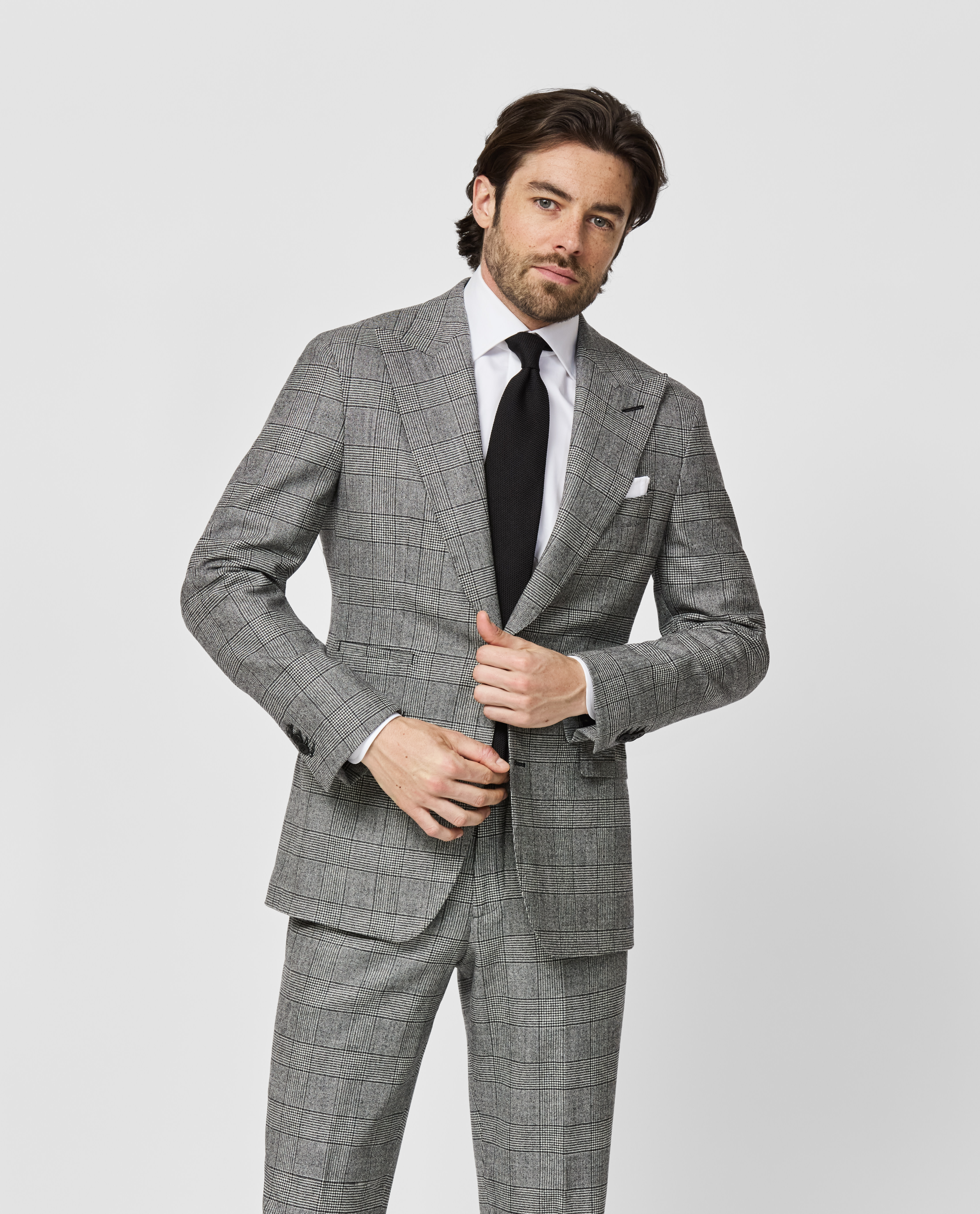 This gray plaid jacket unites performance, comfort, and elegance. Crafted from Jersely® fabric made in Italy by Loro Piana. Combining the finest pure wool and a small percentage of stretch, this blend is woven on a shuttle loom to create the elasticity of knitted jersey. A soft and breathable garment that moves with the body. Designed here with wide peak lapels and a straight single welt ticket pocket. Style it with a white shirt, black grenadine tie, and calfskin shoes to complete the look. Make this suit your own with our many customization options. Wool blend Stretch Glen plaid Comfortable Breathable