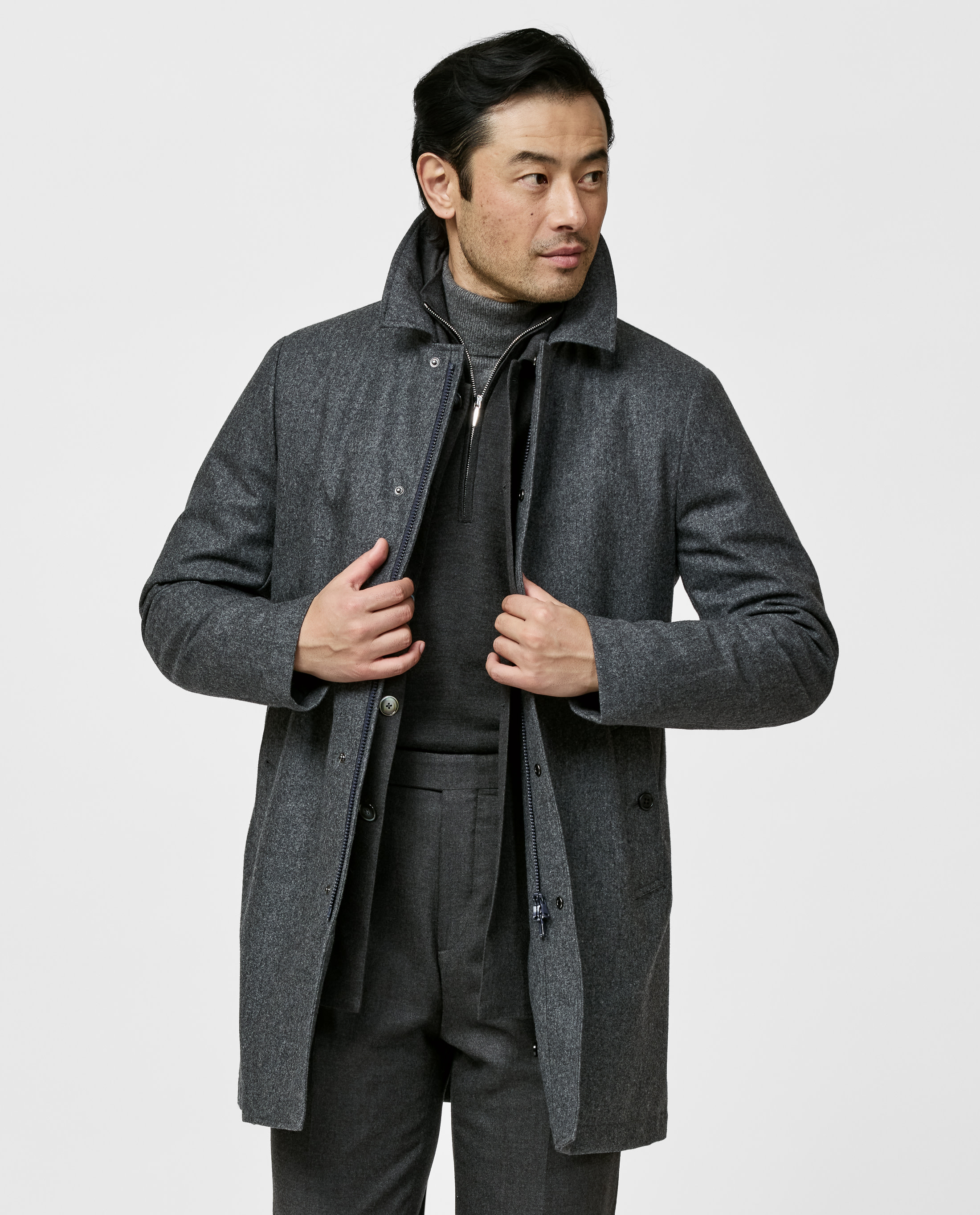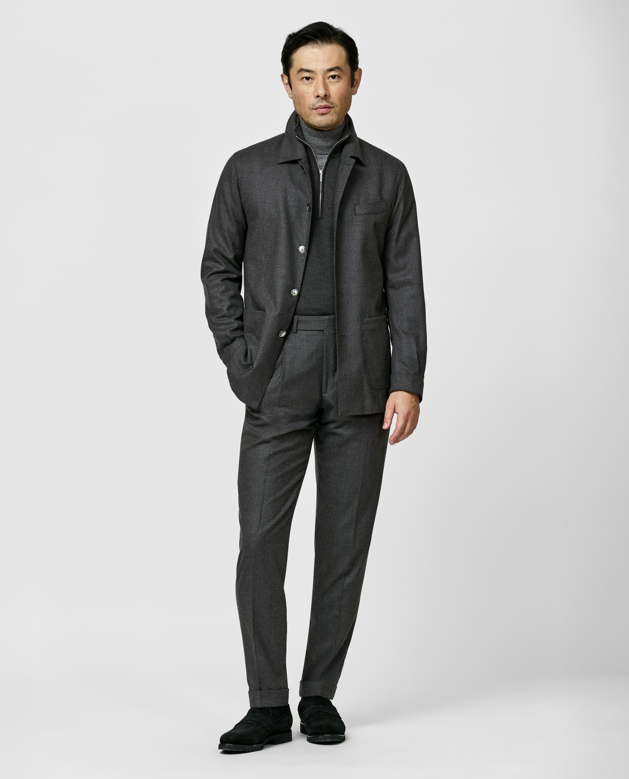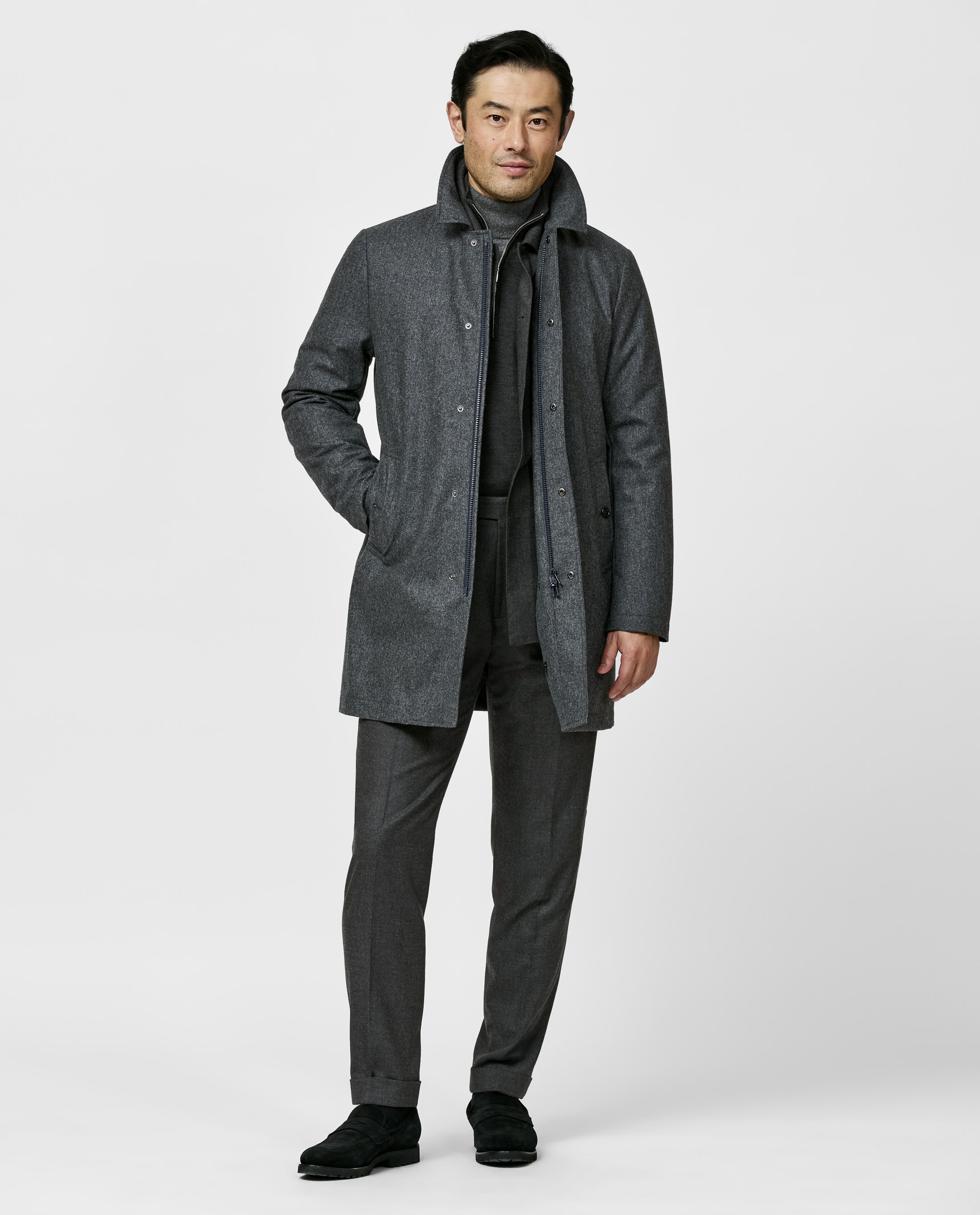 Stay ahead of the fall weather with a heathered gray technical coat, crafted from premium S120 wool. When paired with an anthracite cashmere suit and a gray mélange extra-fine merino turtleneck, this ensemble offers exceptional texture and refined depth.