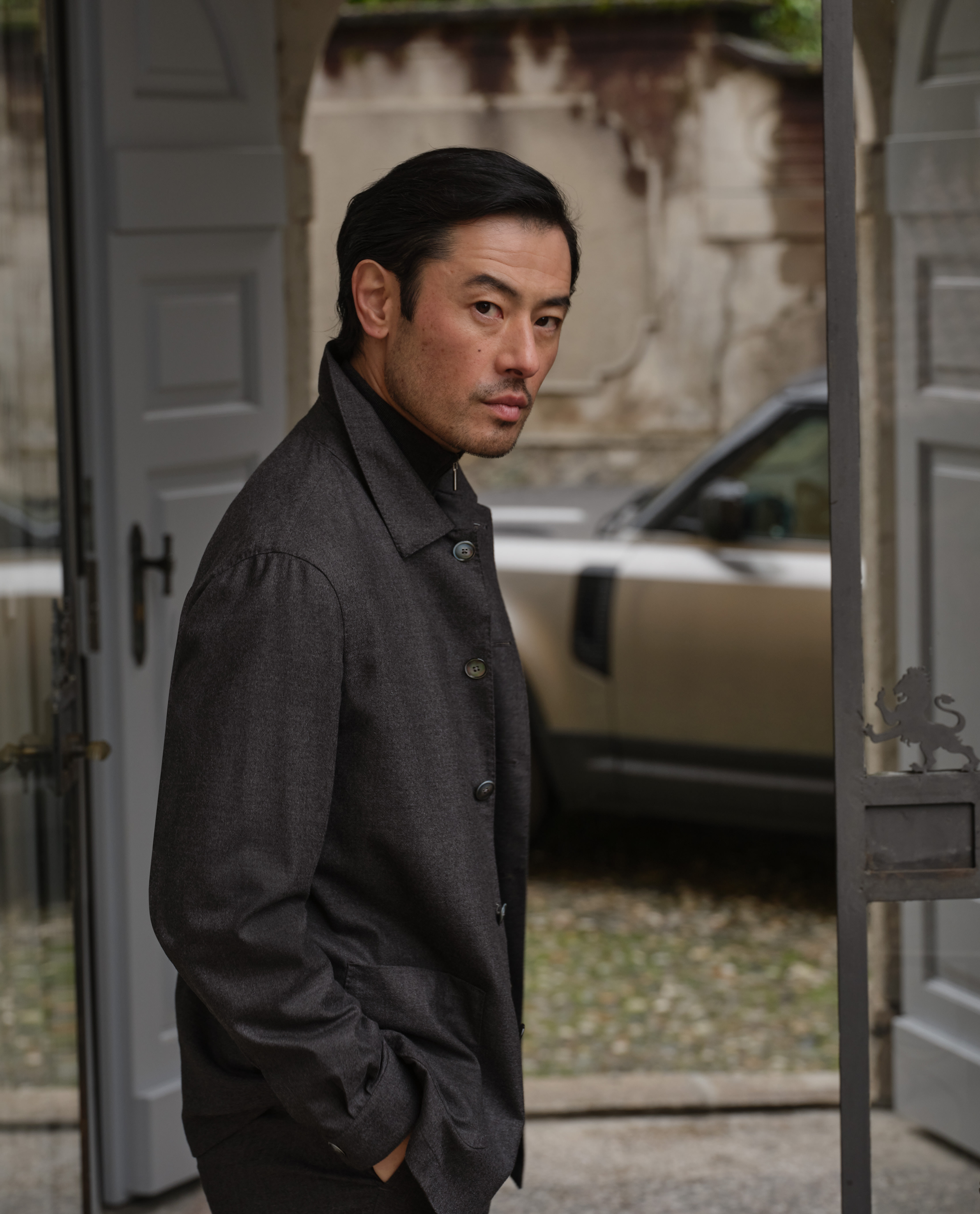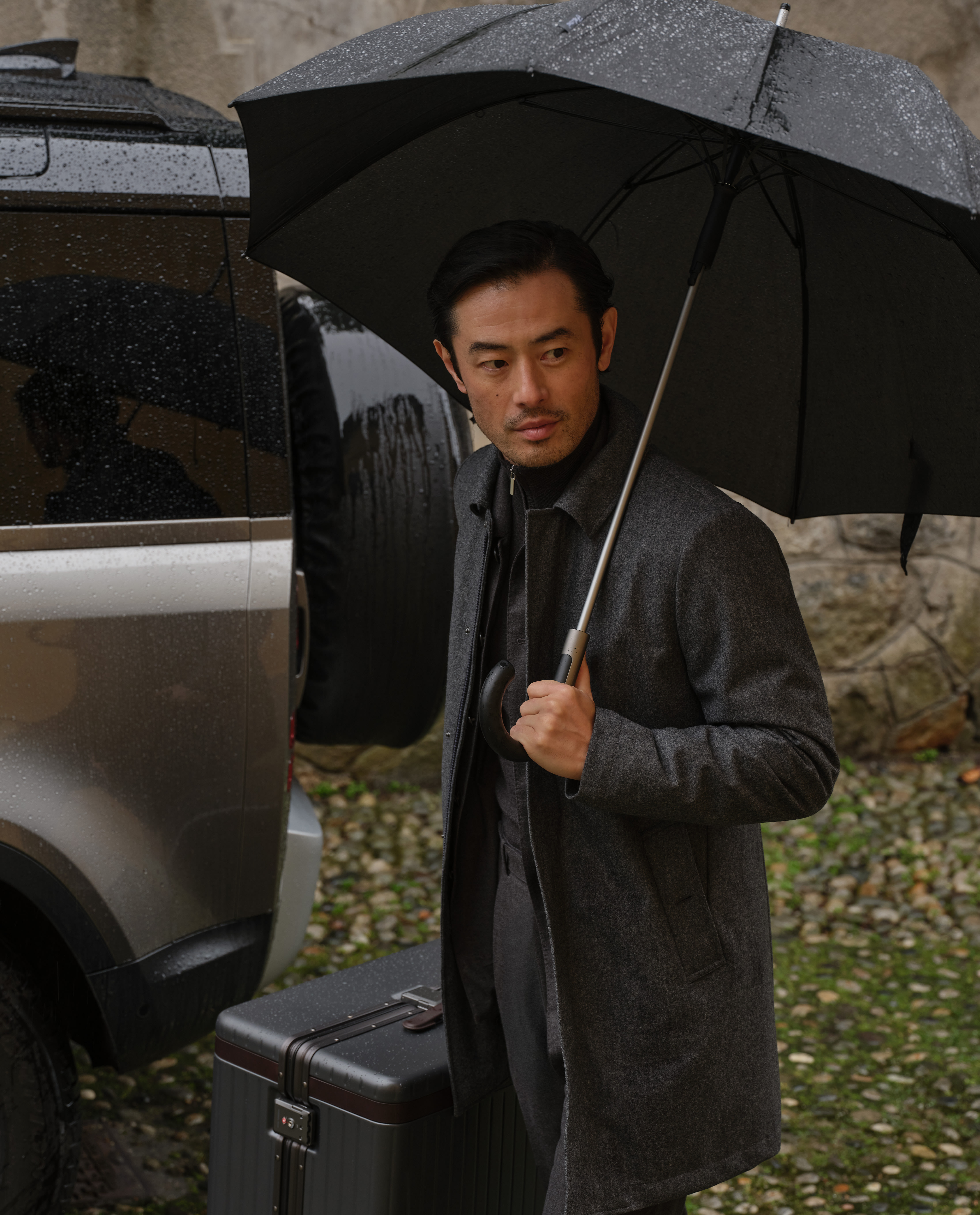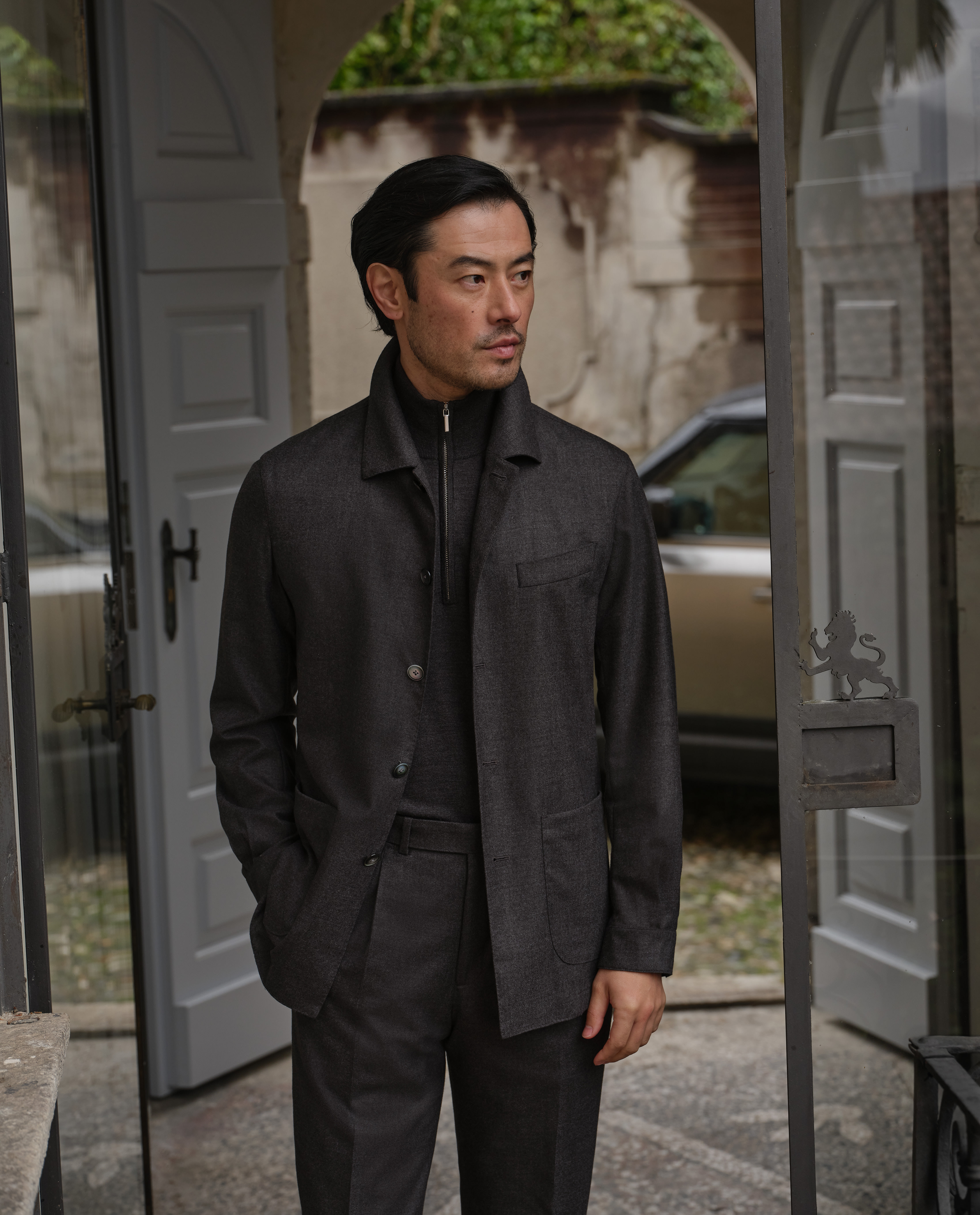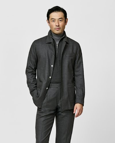 Stay ahead of the fall weather with a heathered gray technical coat, crafted from premium S120 wool. When paired with an anthracite cashmere suit and a gray mélange extra-fine merino turtleneck, this ensemble offers exceptional texture and refined depth.