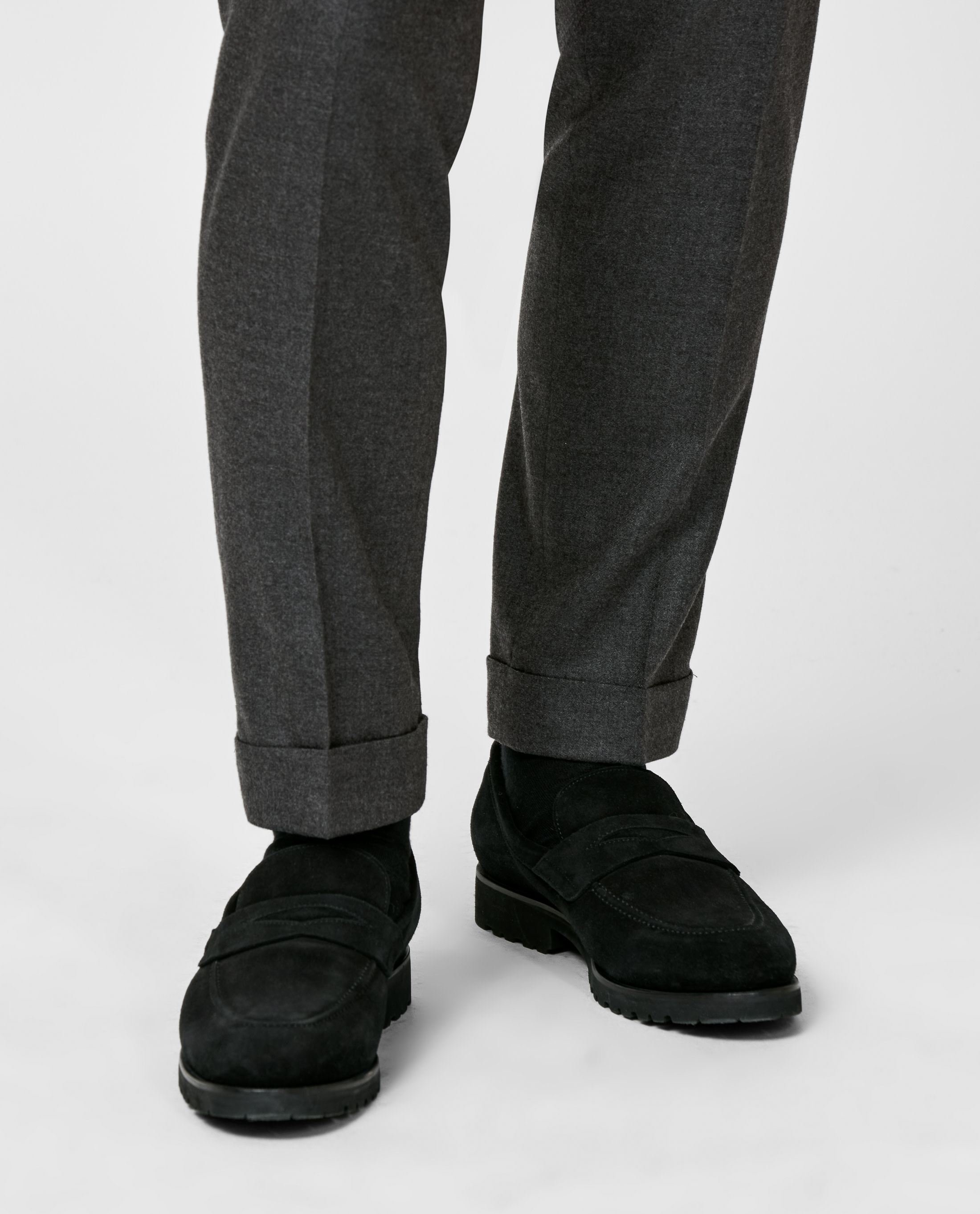 Classic meets casual, these black handmade loafers are a comfortable option for everyday. The soft suede on chrome-tanned calfskin leather features a water-resistant finish. Make these shoes your own with our many customization options to choose from. Handmade Suede Chrome-tanned leather Water-resistant finish