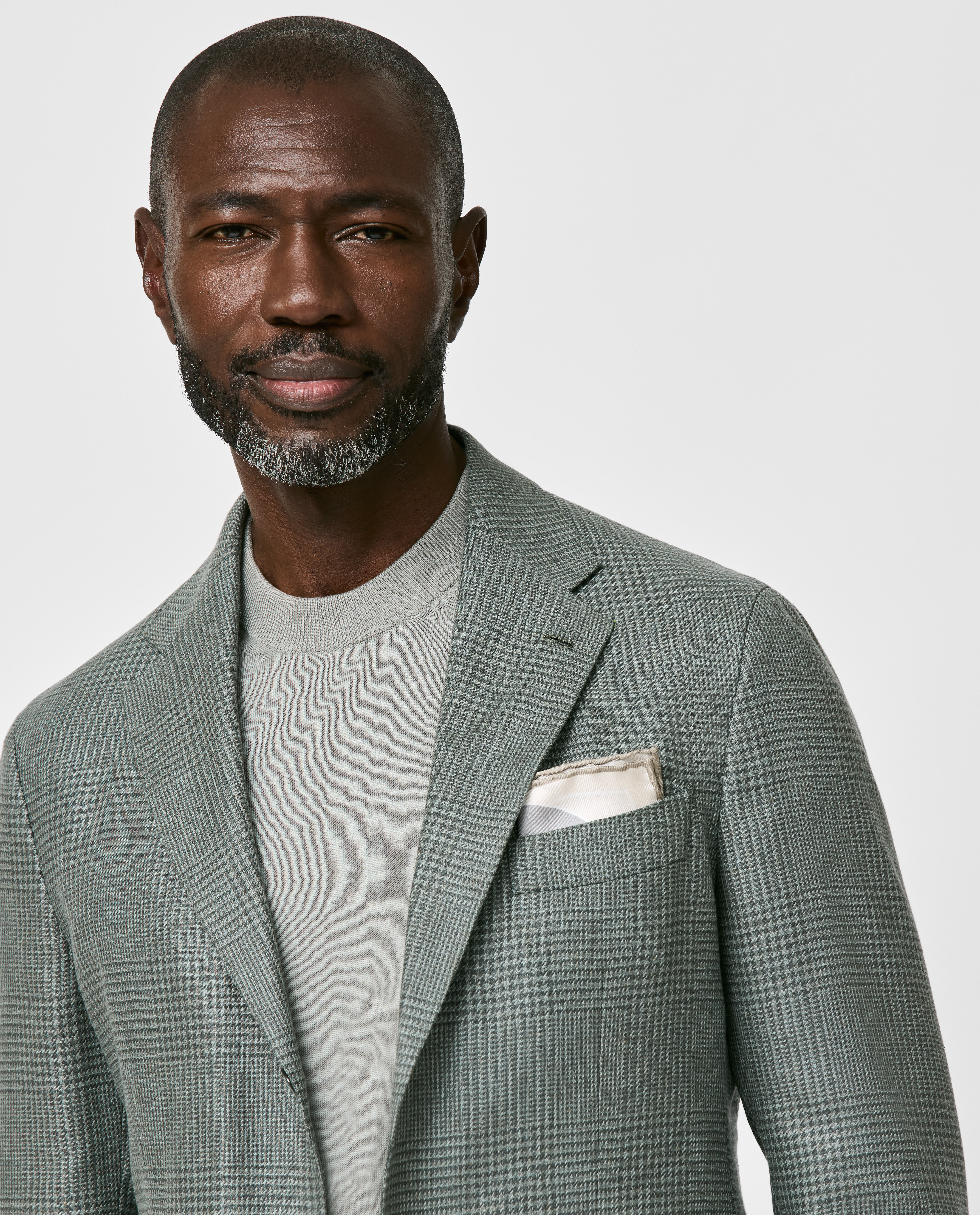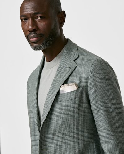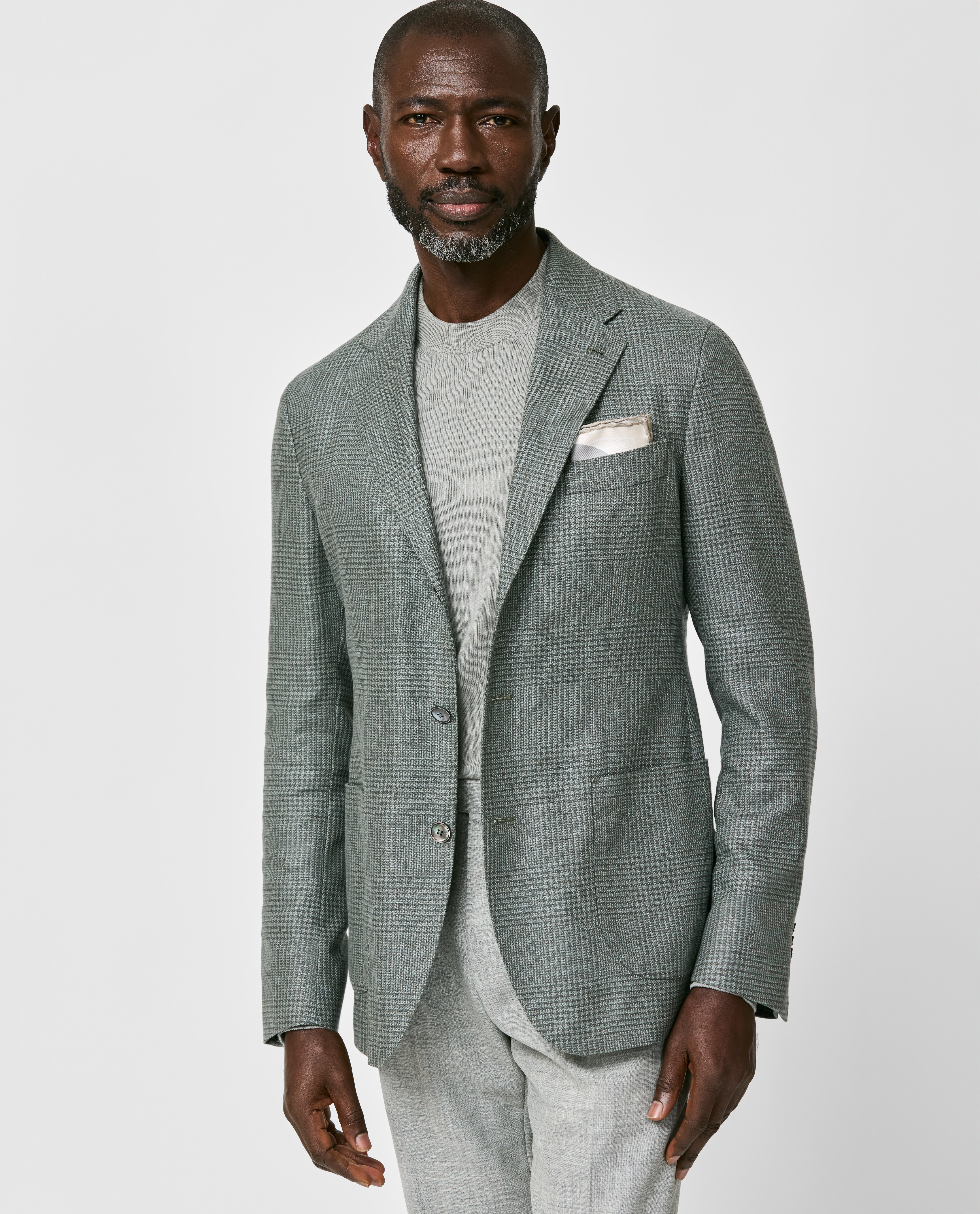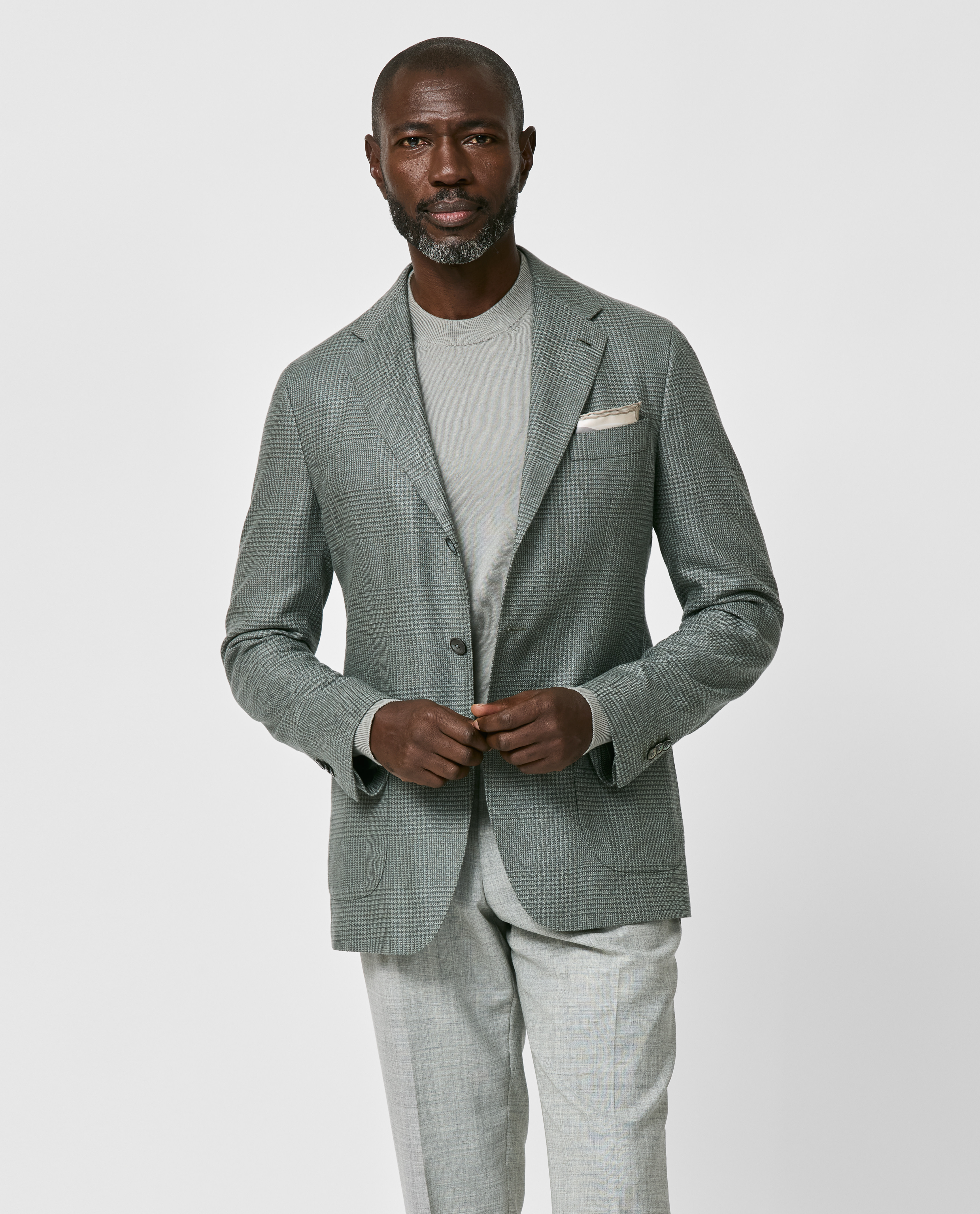 Crafted from luxurious, mélange-spun pure silk, this breathable sage and light green Glen plaid jacket was designed with an elegant 2.5-button closure, low-gorge notch lapels, and modern patch side pockets. Pair it with a lightweight knit, trousers, and loafers to create a modestly extravagant seasonal look. Prefer a different style? Every piece is made exclusively for you, with your choice of design options. Pure silk Glen plaid Subtle shine Light four-season weight