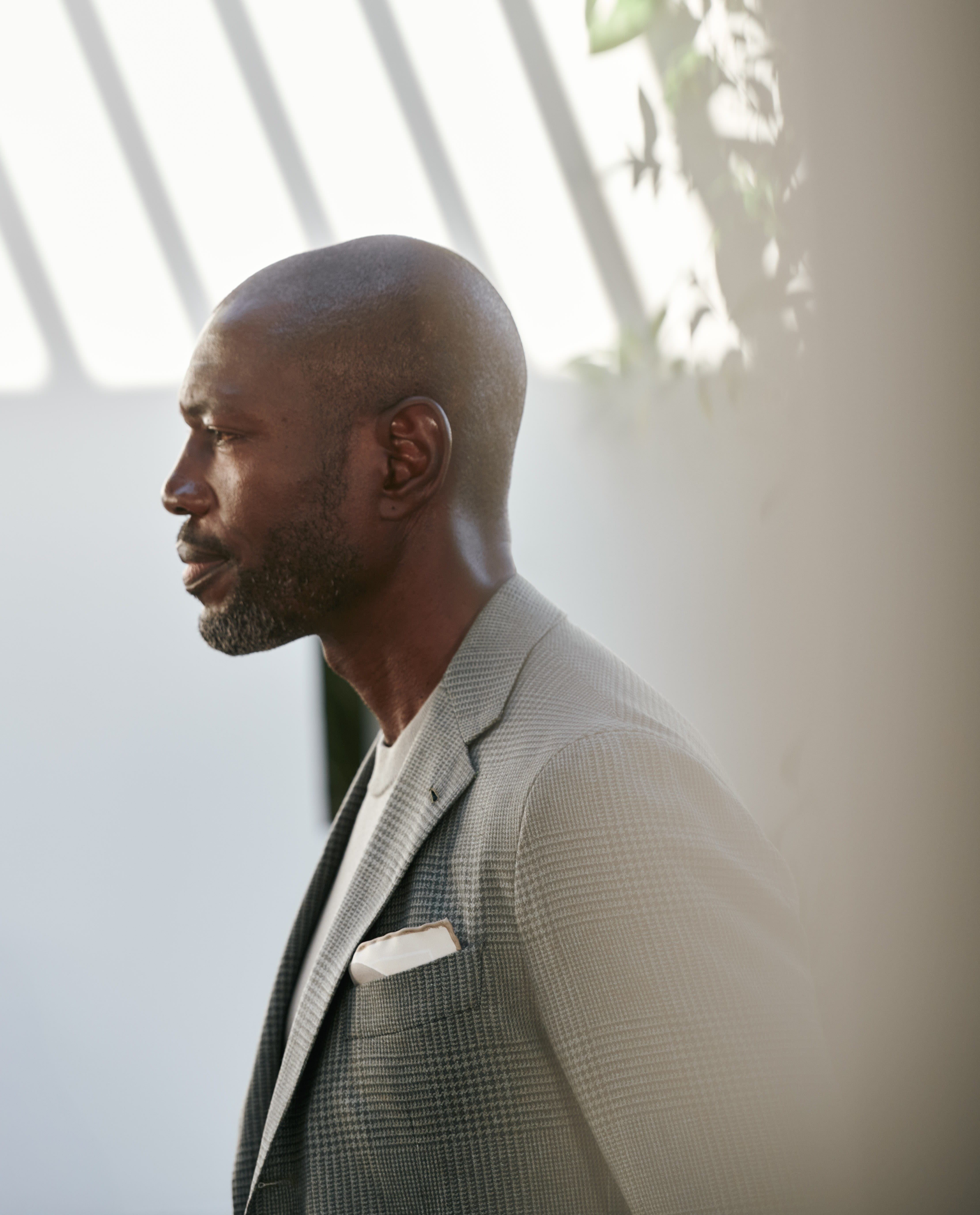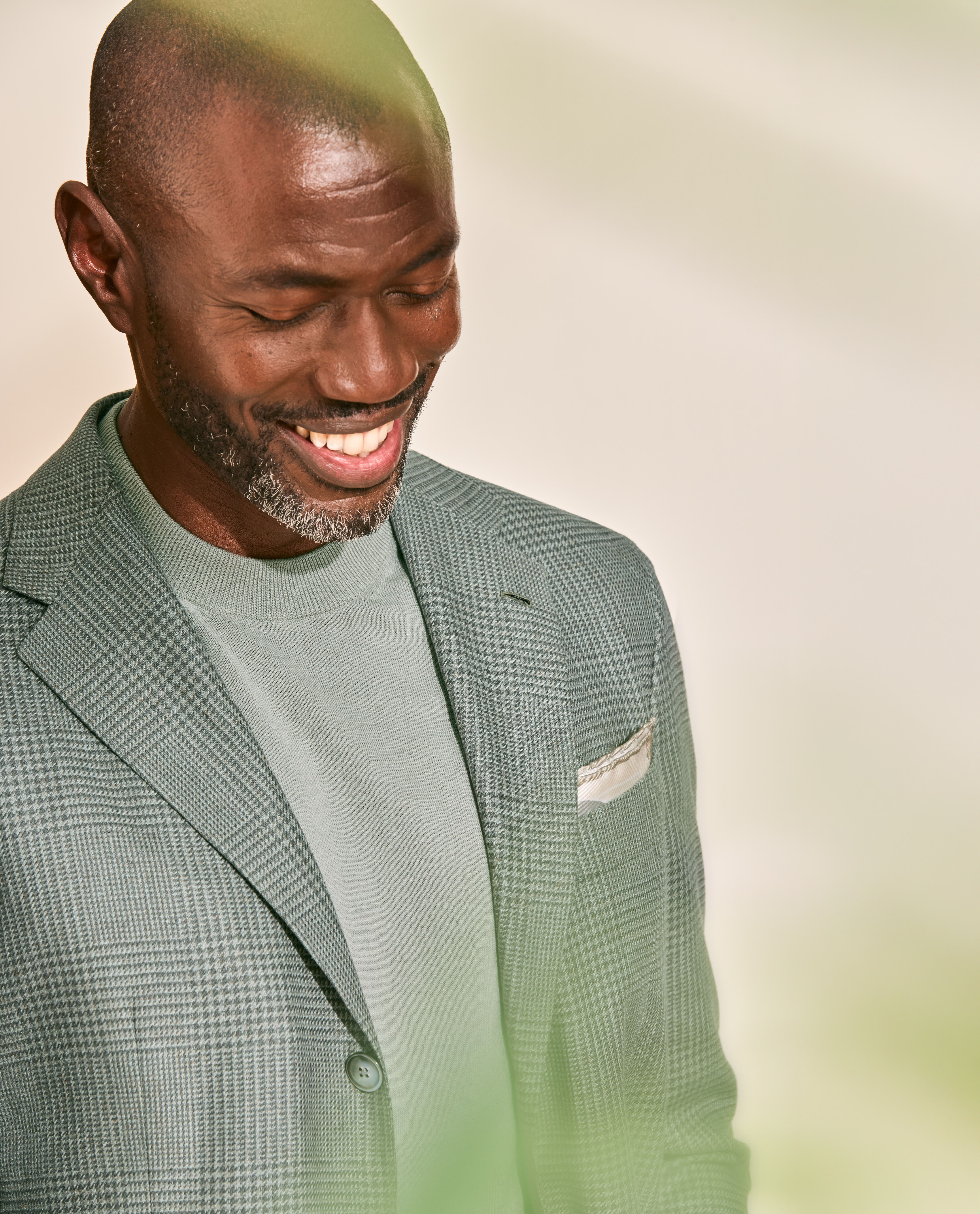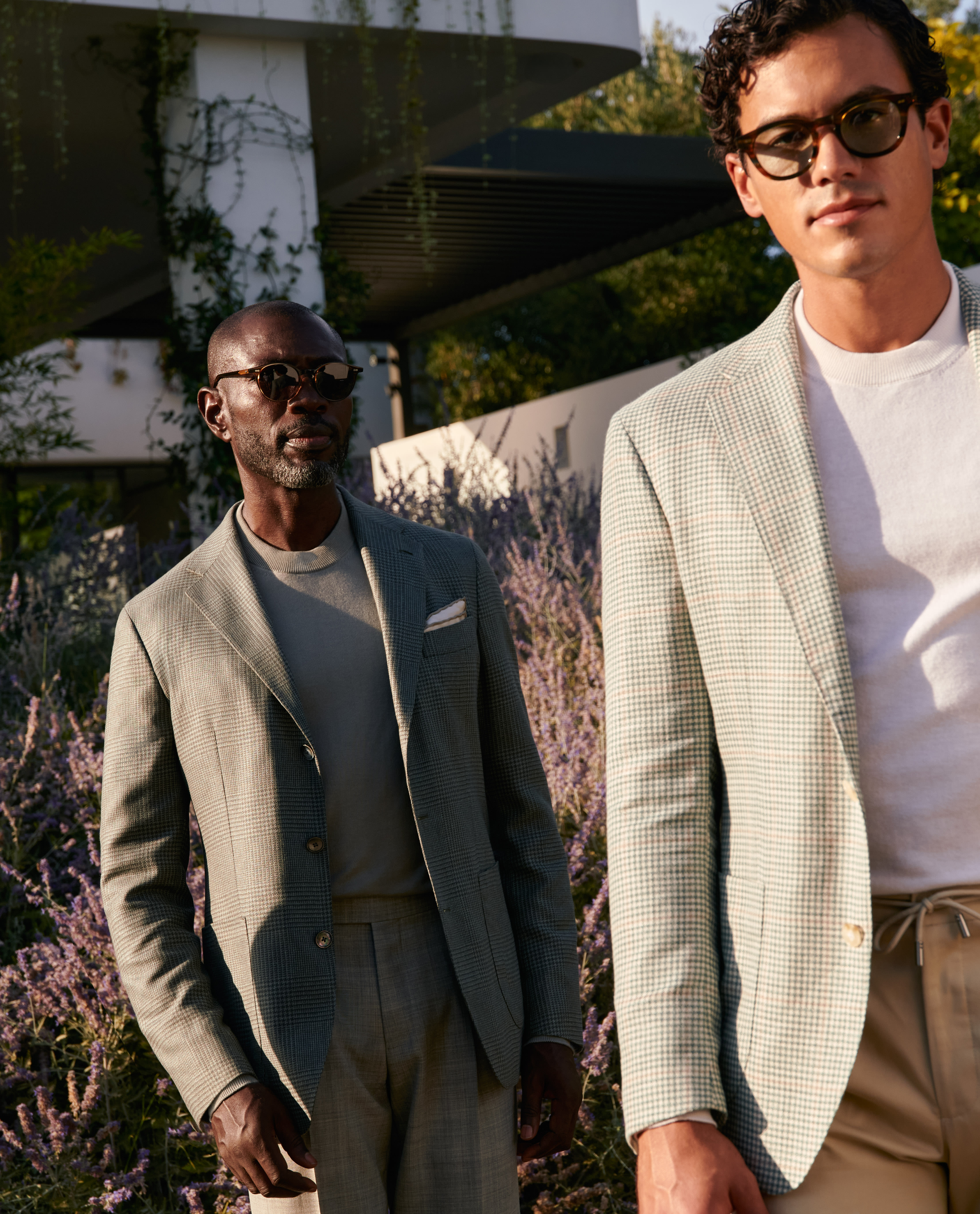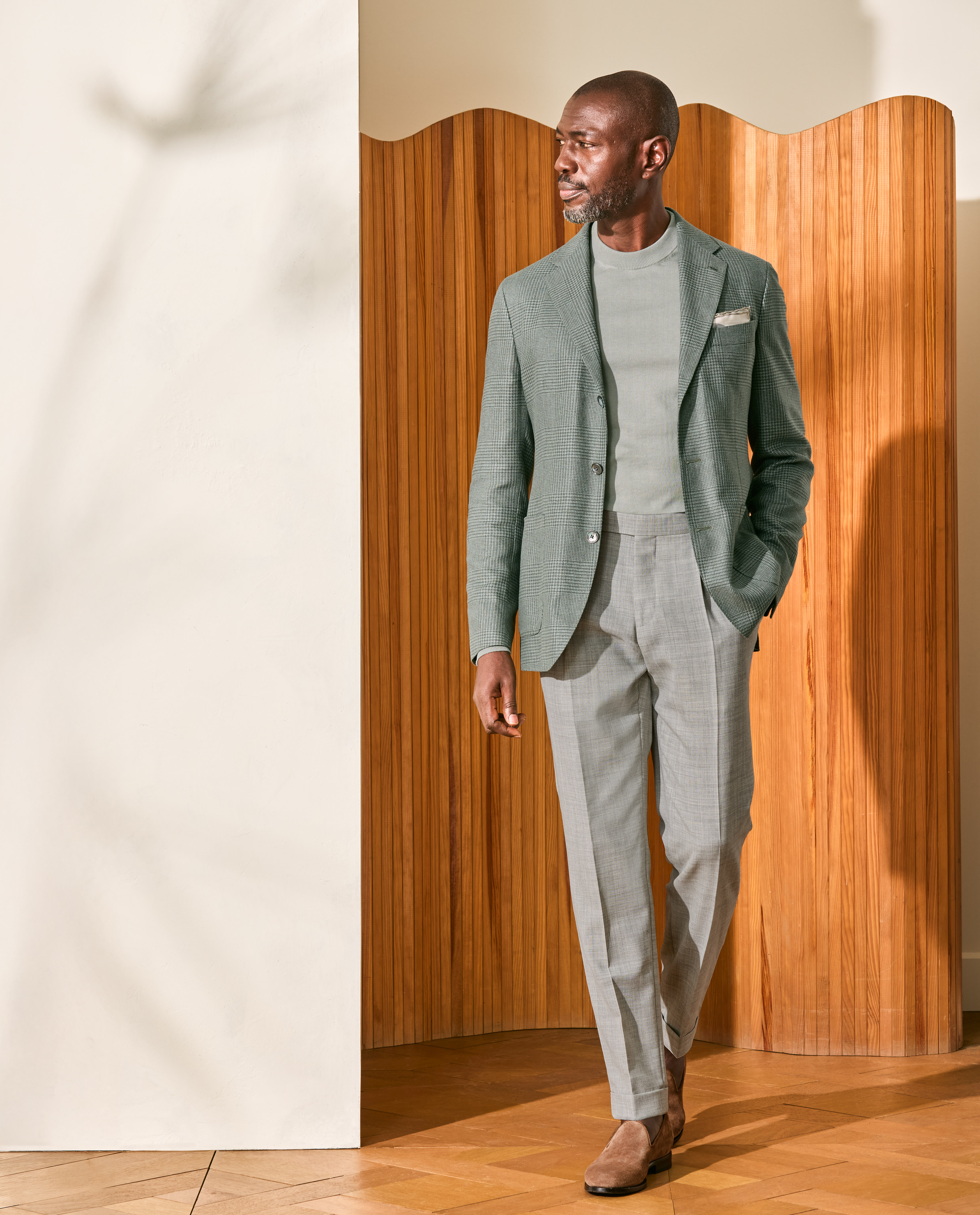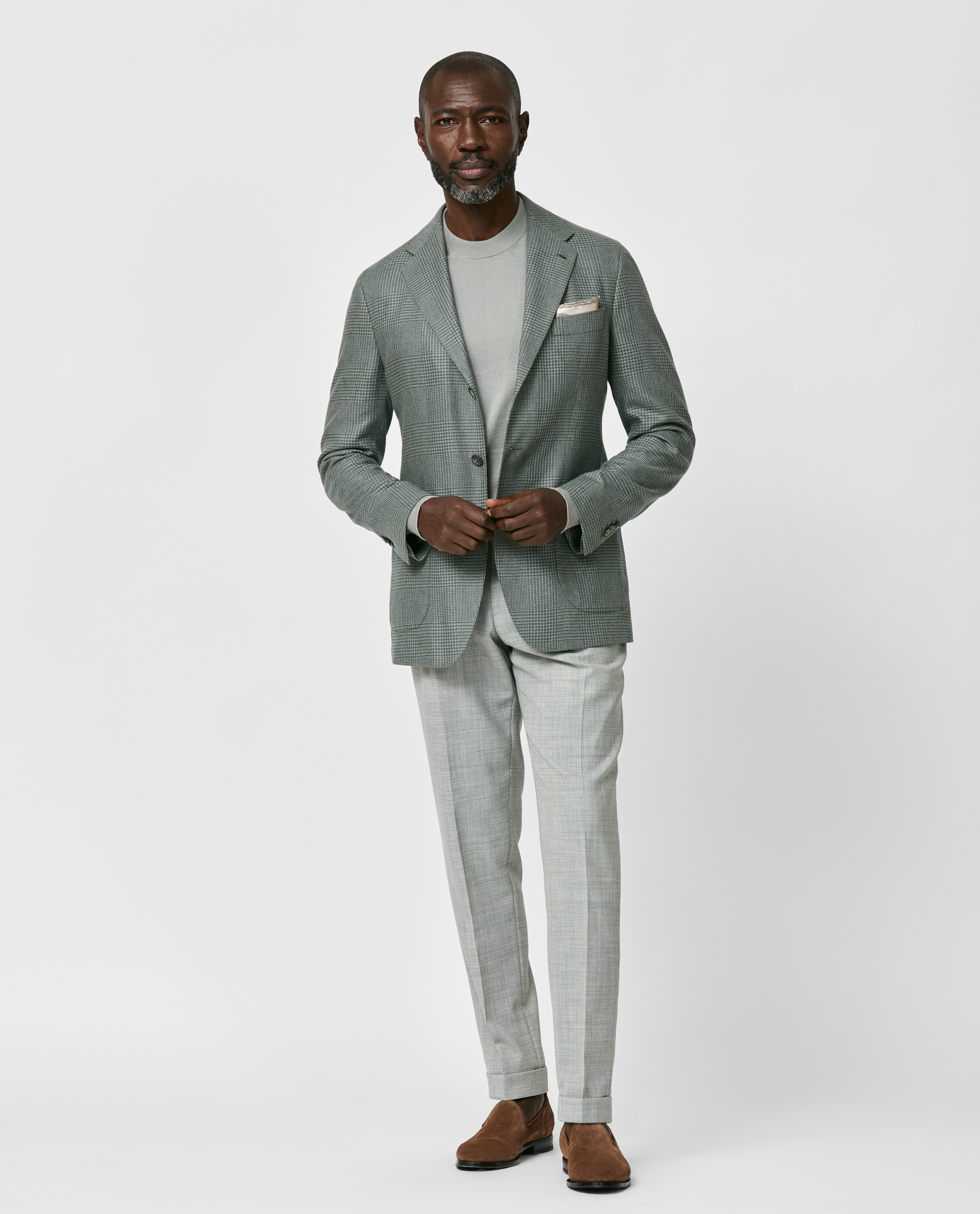 Wondering how to style a bold statement jacket? Simply anchor your separates in any of the colors found in its design to instantly amplify its impact. Shown here to reflect this characteristic green Glen plaid with a summer knit, wool trousers, and water-repellent coat all in gray – together creating a natural and refined feel.