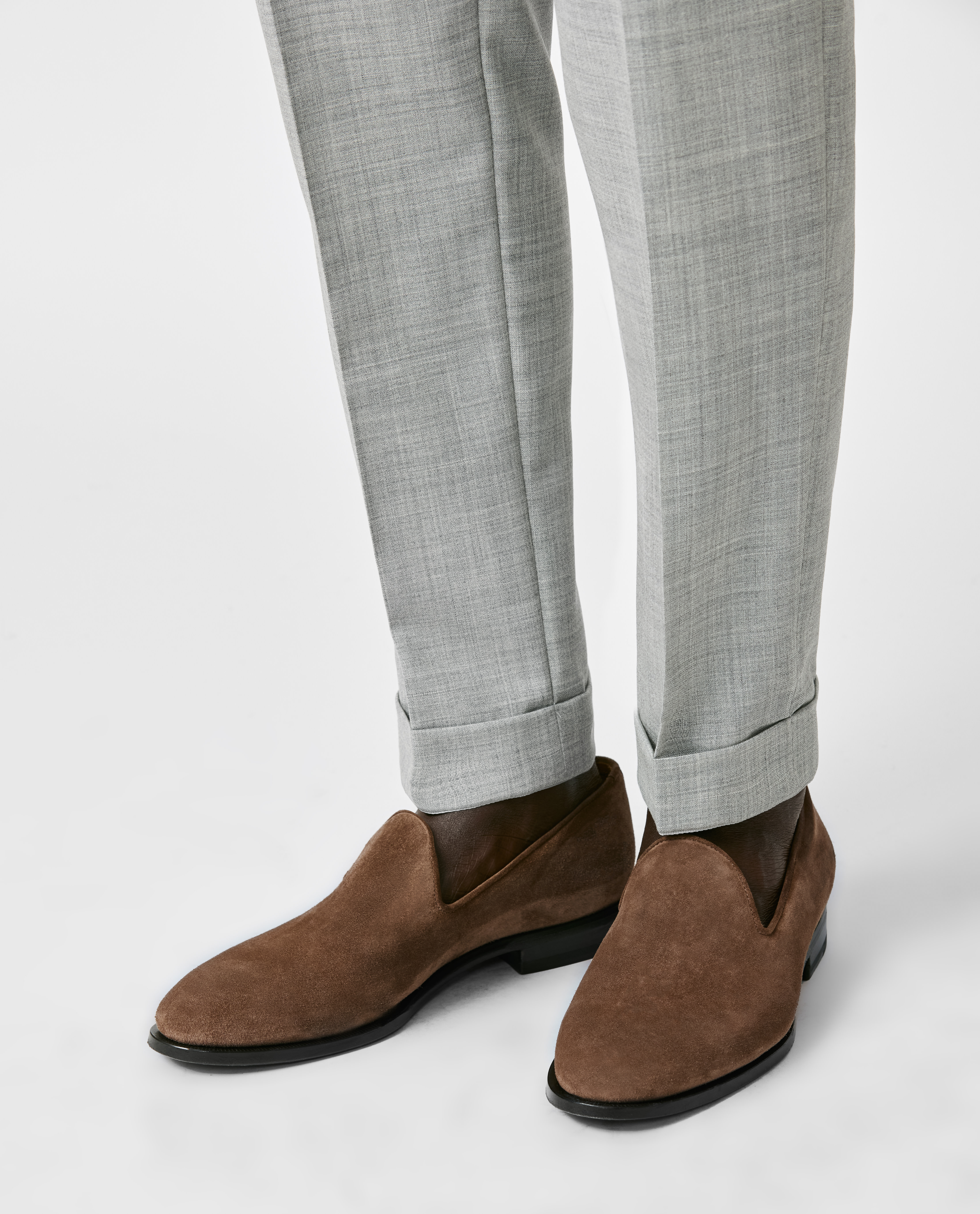 An elegant suede loafer in chocolate brown. Handmade from a flexible chrome-tanned calfskin leather, this light suede features a short nap for a touch of softness. Designed here as a plain toe loafer. Make these shoes your own with our many customization options to choose from.