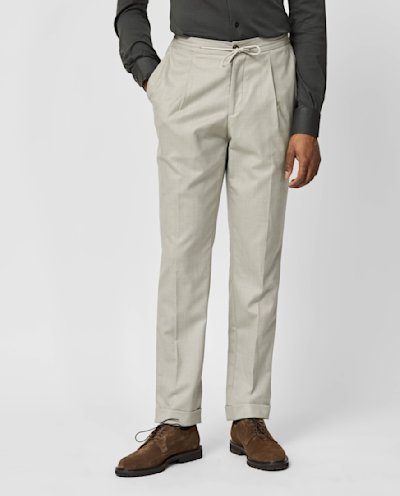 These oatmeal-hued trousers are as classic as they are comfortable. Naturally stretchy and breathable, the S120 wool flannel by VBC is woven with double-twisted yarns. Designed here as pleated drawstring trousers with a turn up for a more modern look. Make these trousers your own with our many customization options to choose from. S120 wool Flannel Double-twisted yarns Natural stretch Breathable