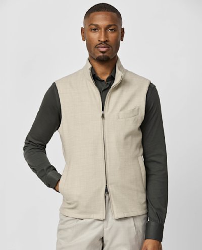 Elevate your casual layering in comfort and in style with this sand flannel vest. Crafted from Jersely® fabric made in Italy by Loro Piana. Combining the finest pure wool and a small percentage of stretch, this blend is woven on a shuttle loom to create the elasticity of knitted jersey for a soft and breathable garment that moves with the body. Designed here with a two-way zip for a classic look. Style it with a knit shirt, flannel trousers, and suede shoes to complete the look. Make this vest your own with our many customization options. Wool blend Stretch Flannel Comfortable Breathable