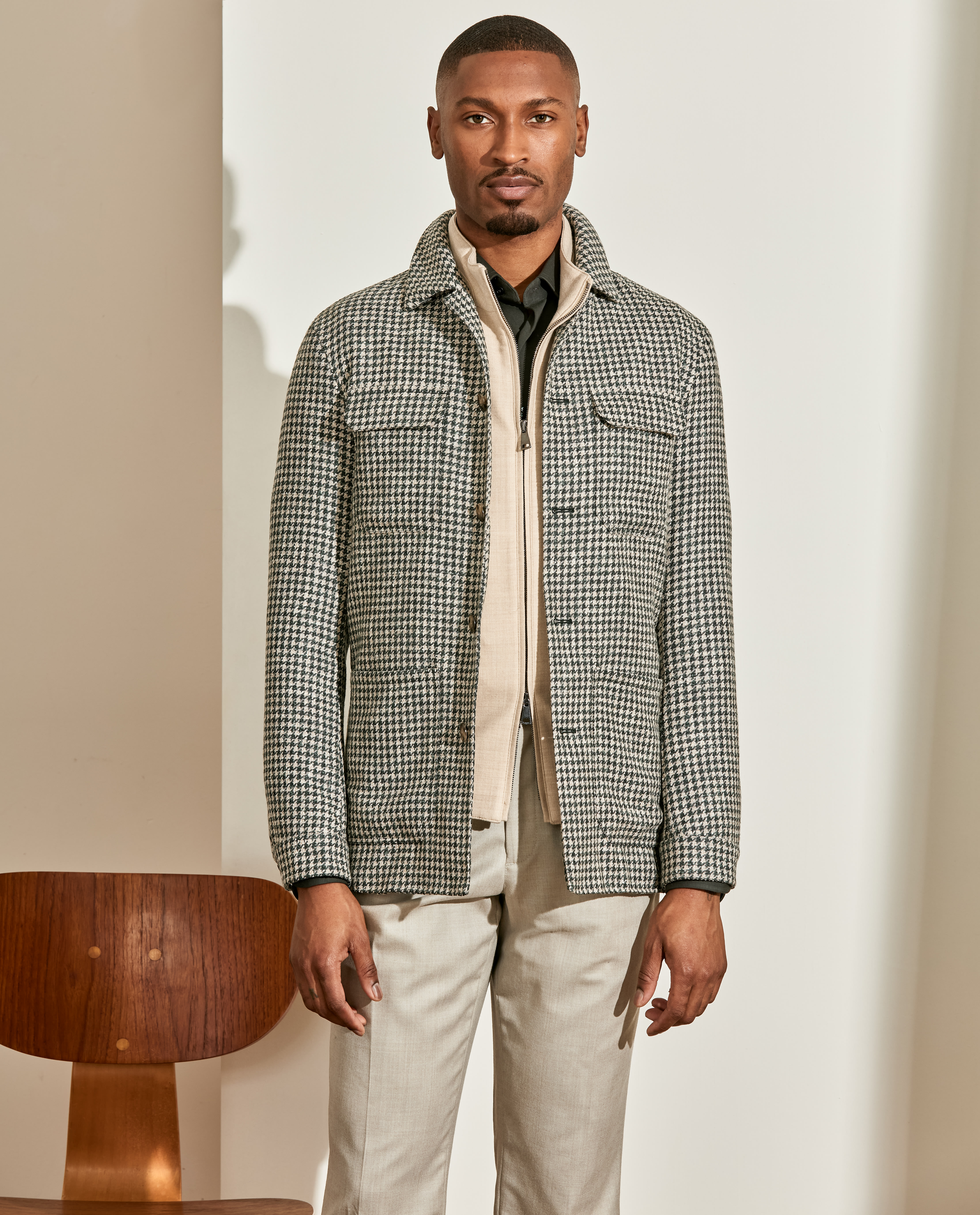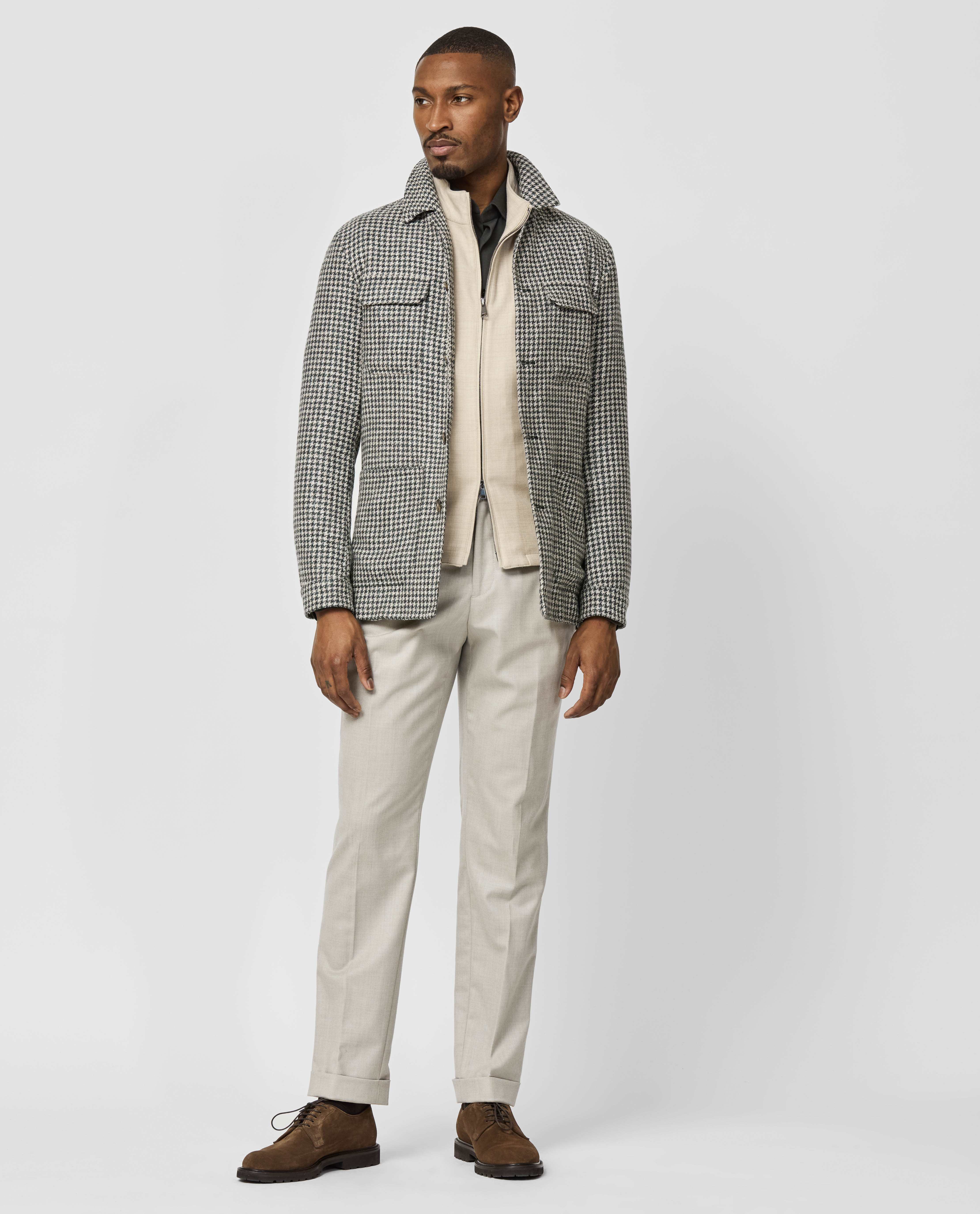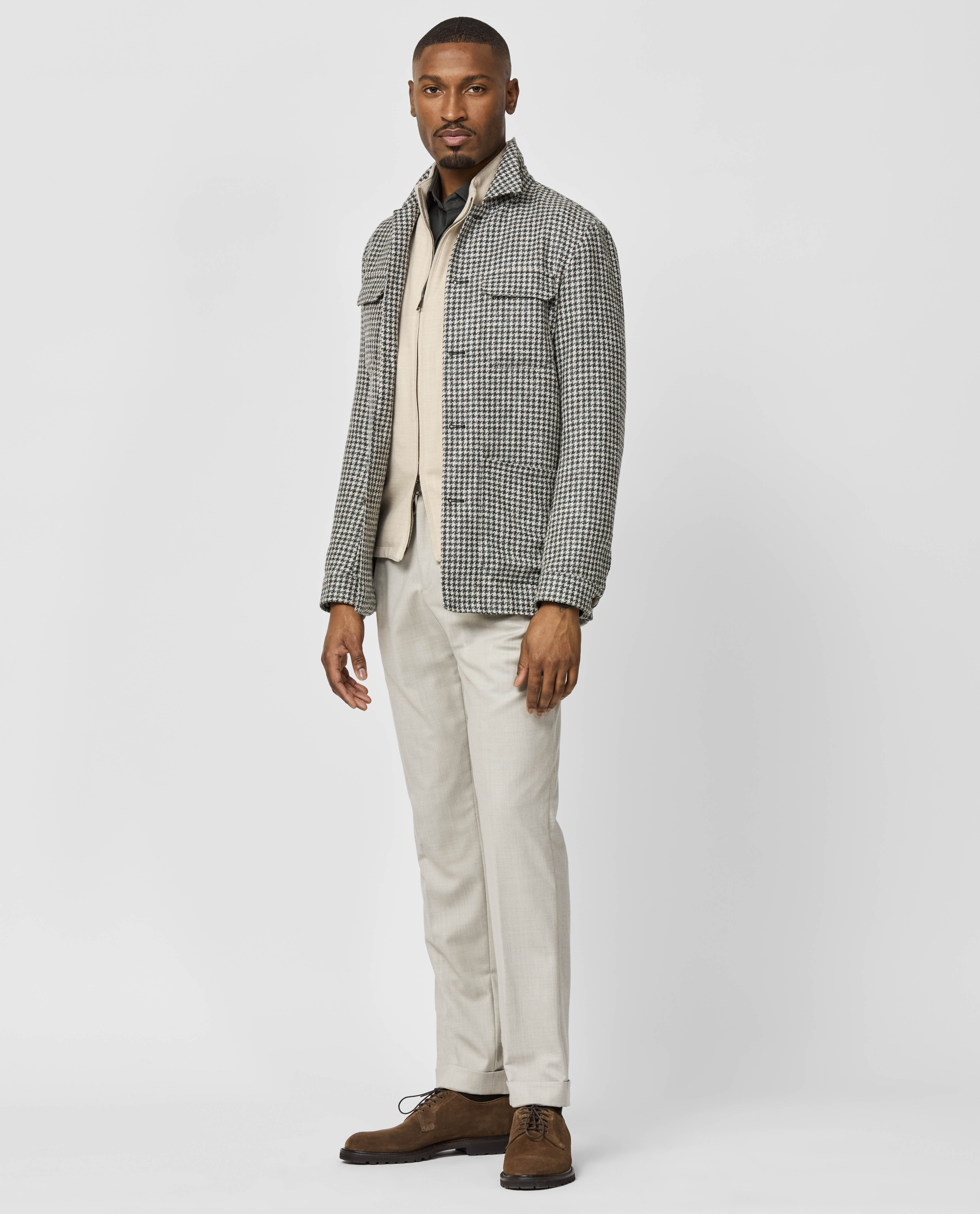 Your new go-to for weekends throughout the colder seasons. This houndstooth utility jacket takes a more minimalist approach with only chest pockets. Layer it over a dark olive shirt in lightweight stretch interlock, flannel drawstring trousers, and chocolate suede Bluchers for a stylish mix of fall and winter elements.