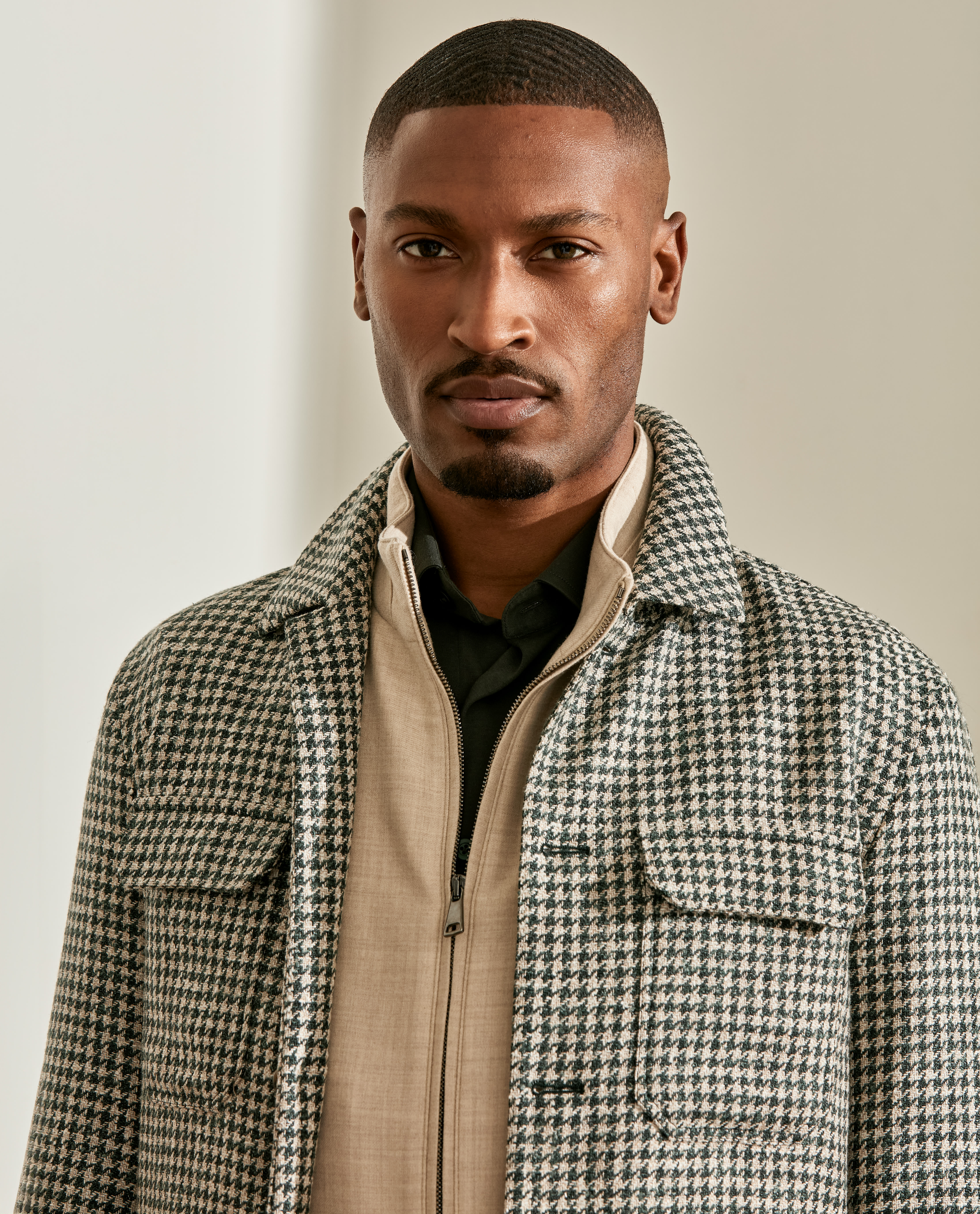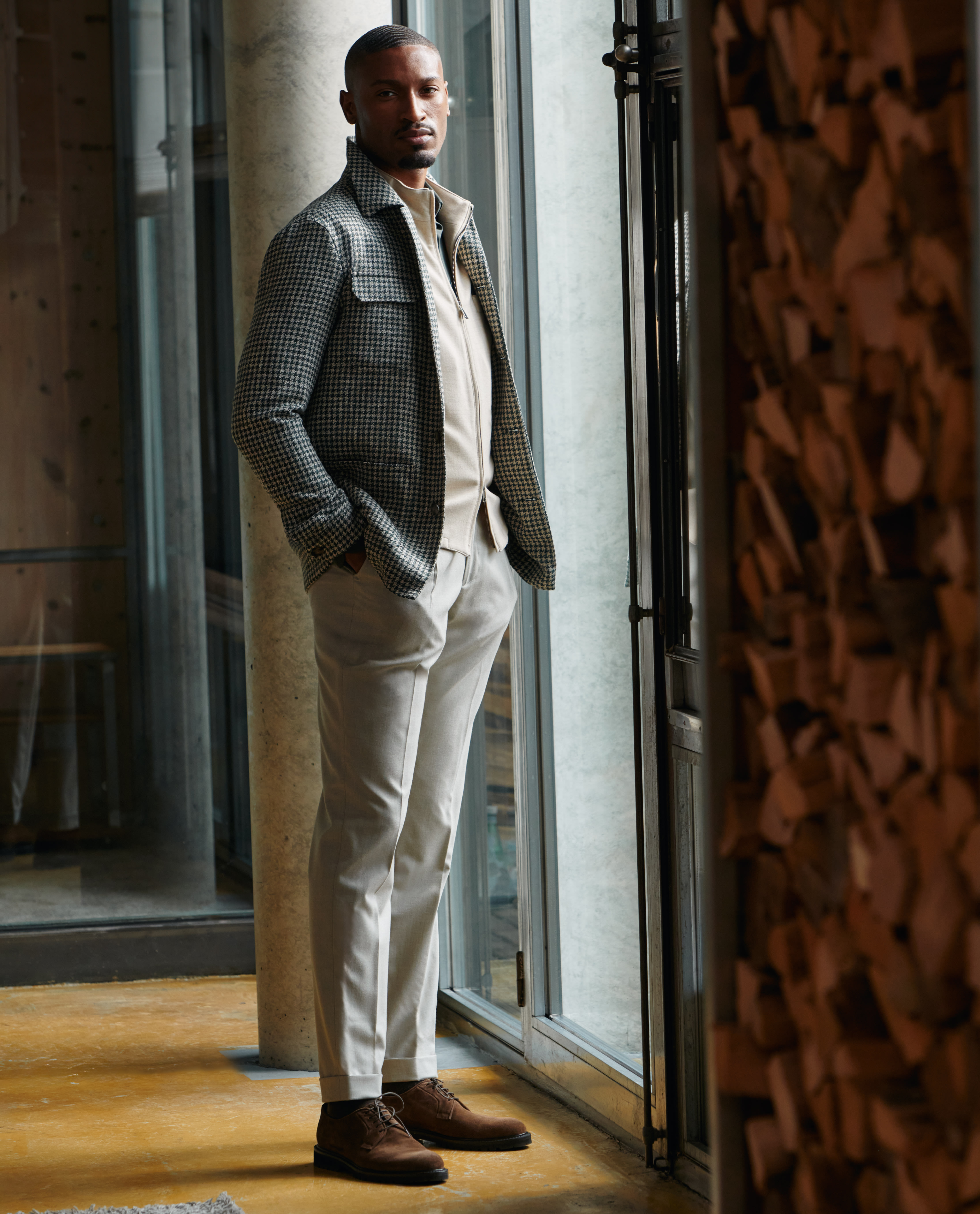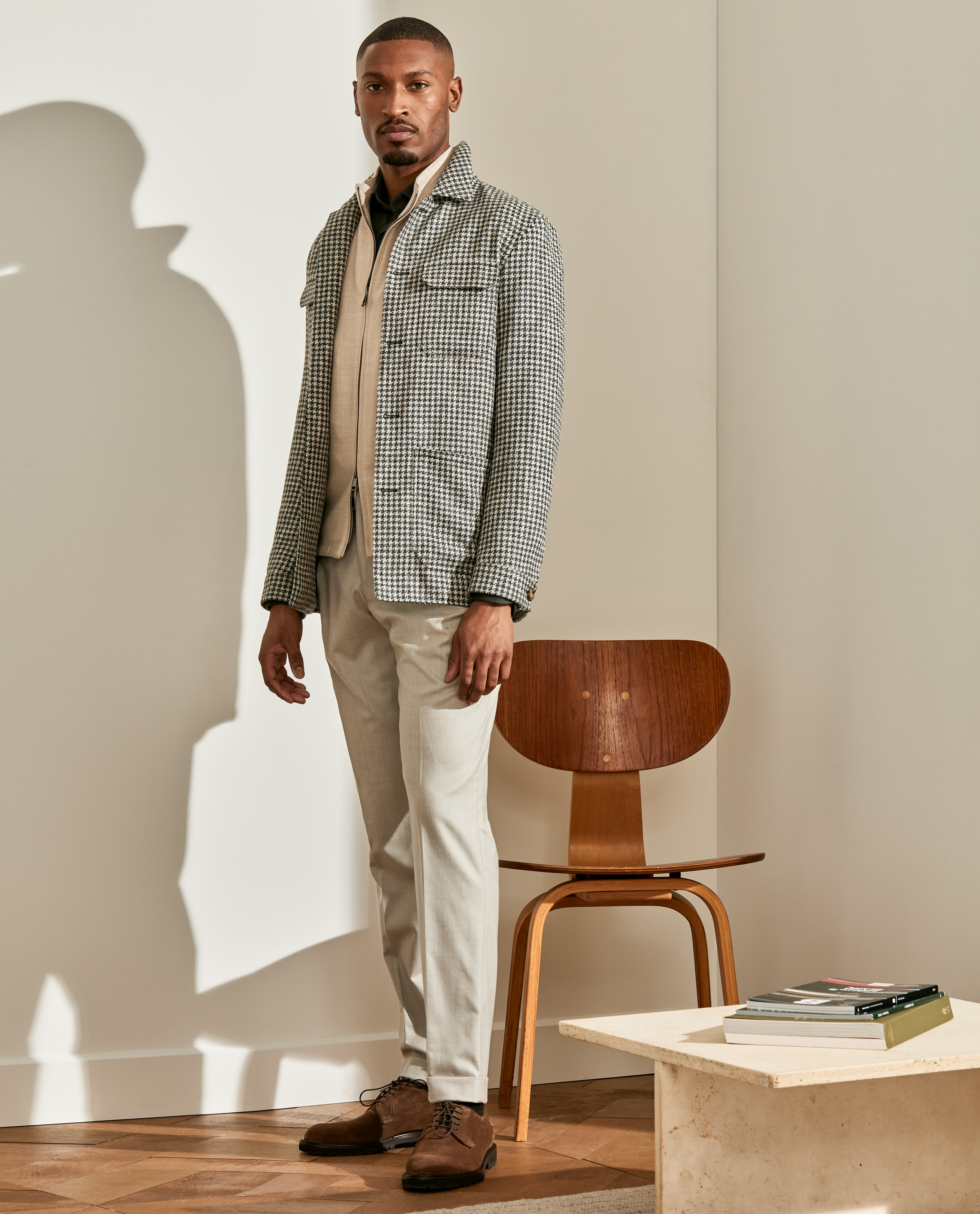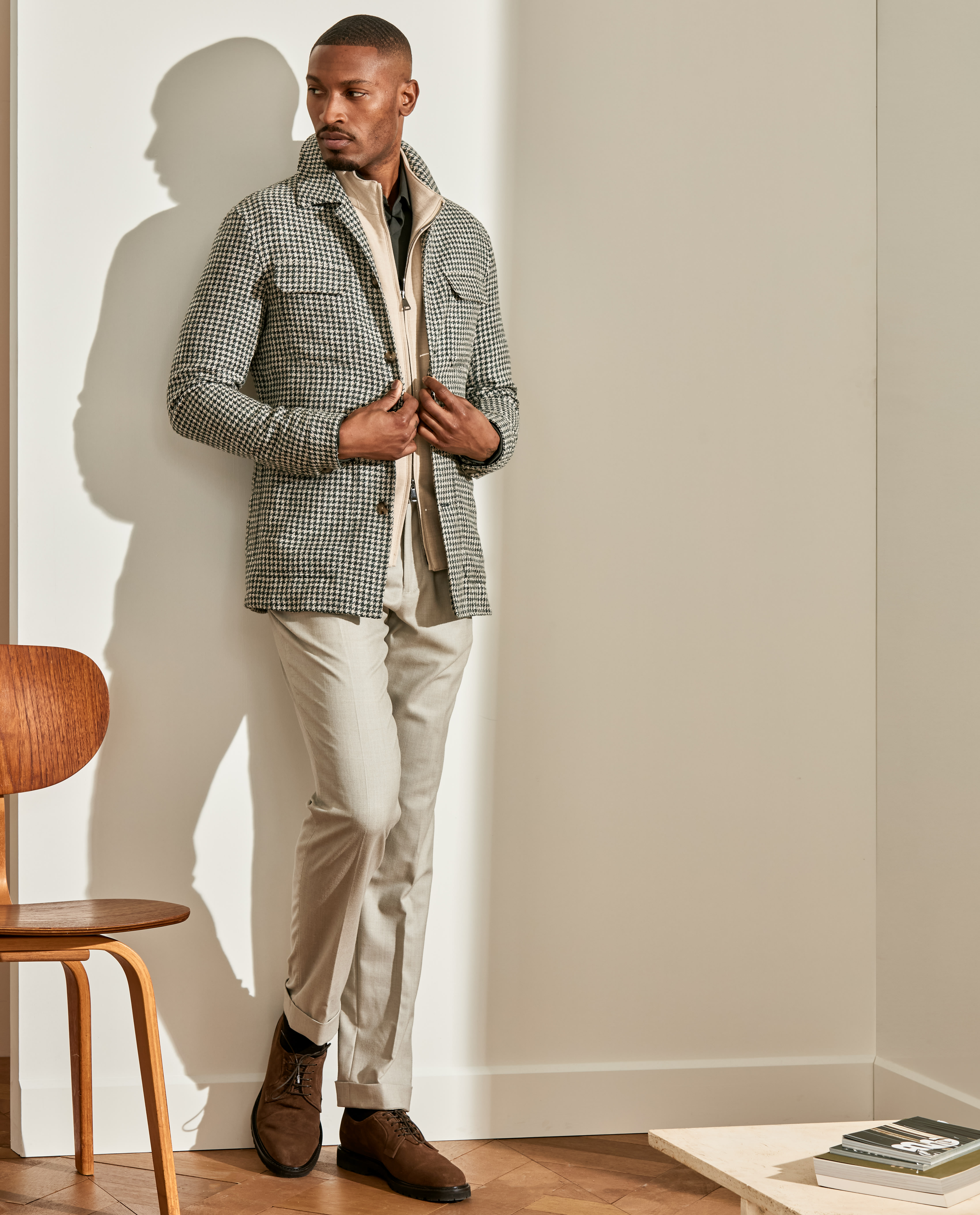 Your new go-to for weekends throughout the colder seasons. This houndstooth utility jacket takes a more minimalist approach with only chest pockets. Layer it over a dark olive shirt in lightweight stretch interlock, flannel drawstring trousers, and chocolate suede Bluchers for a stylish mix of fall and winter elements.