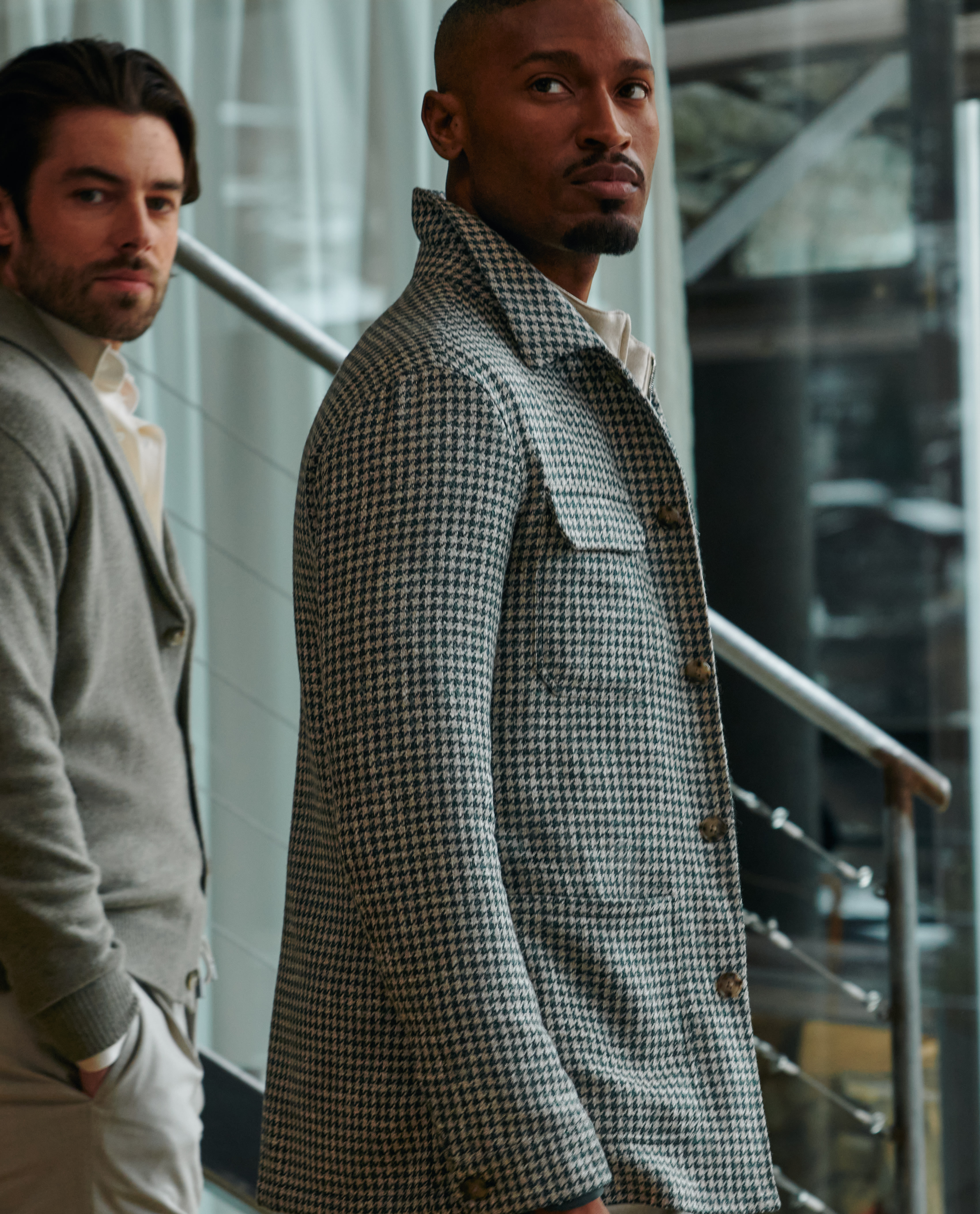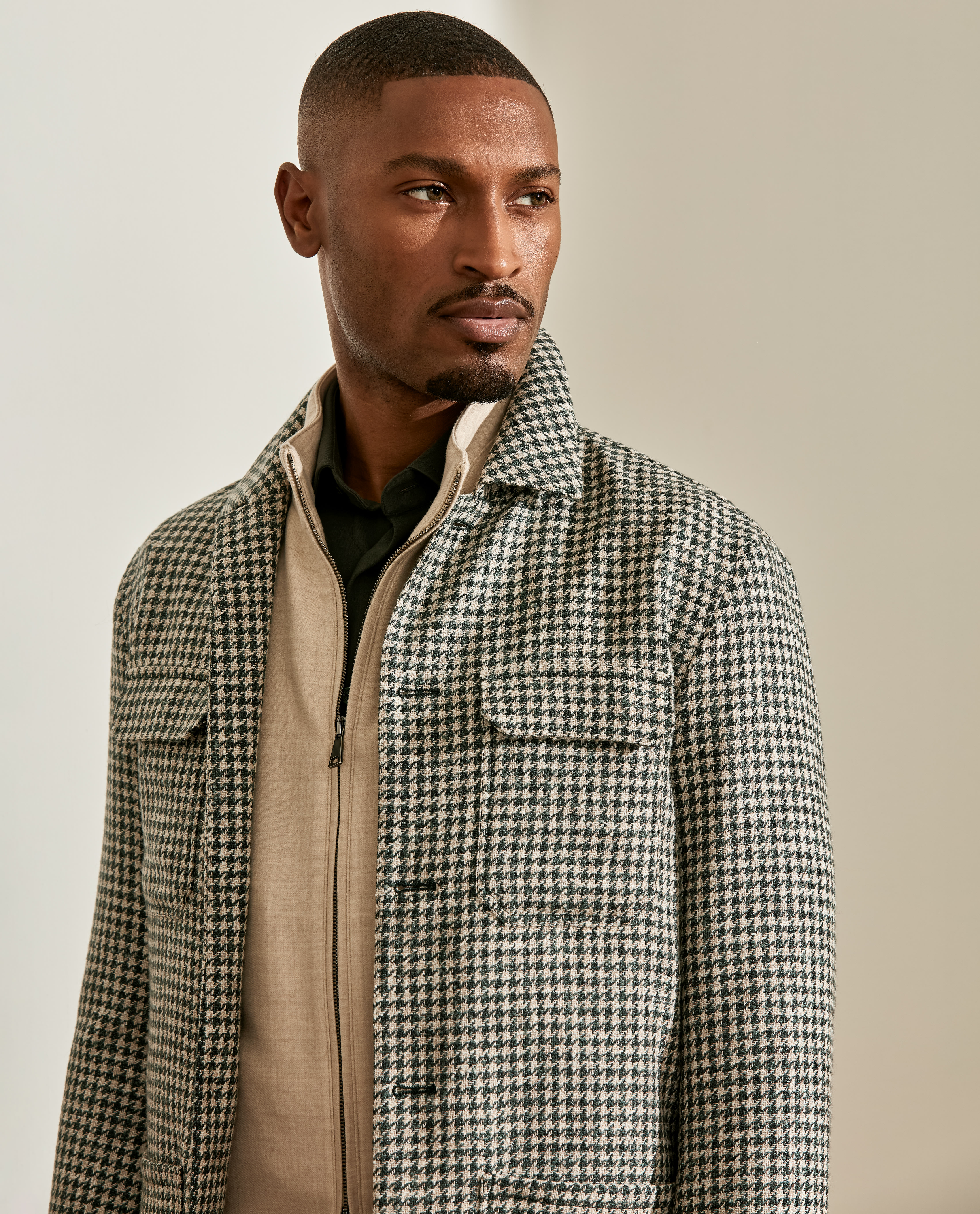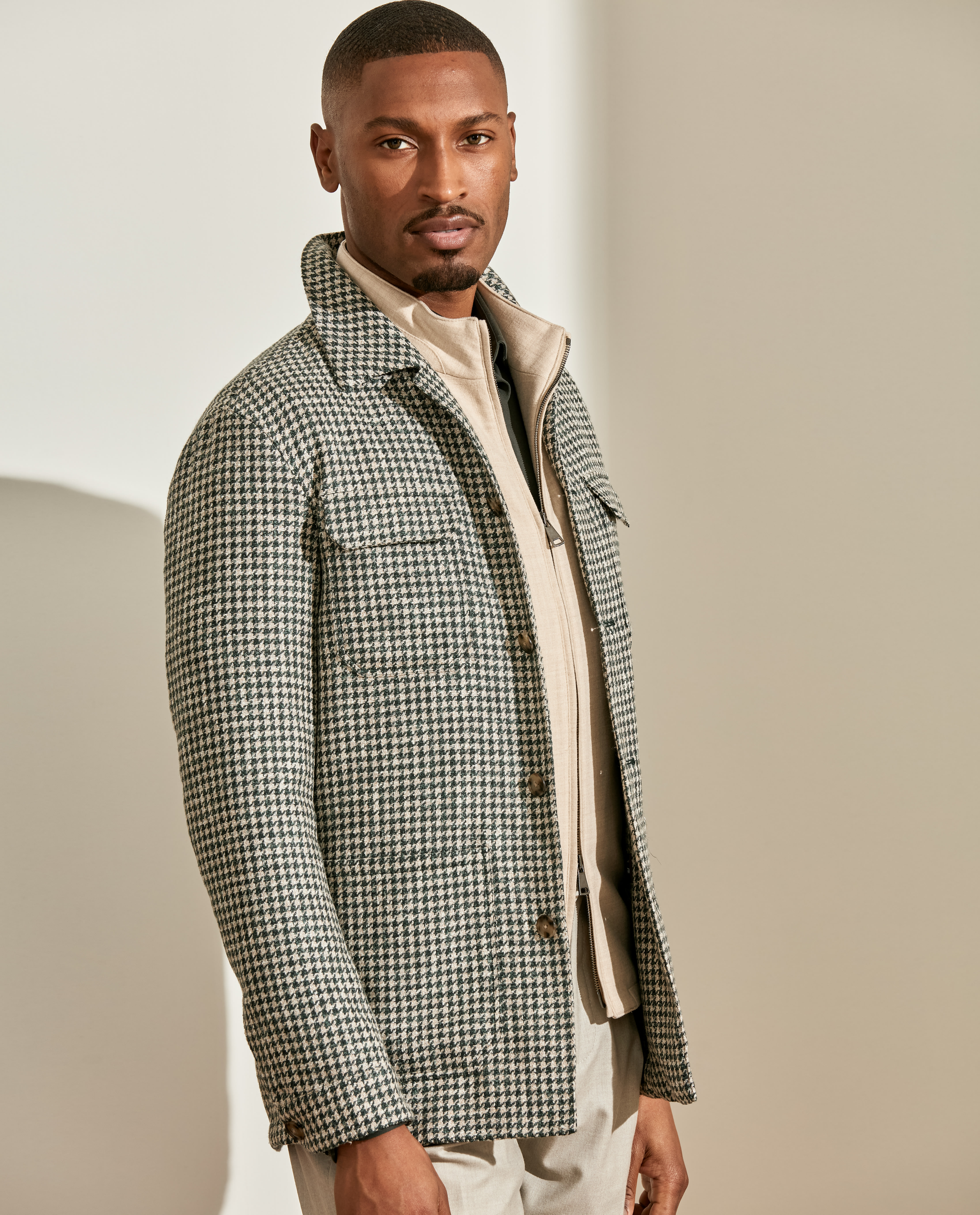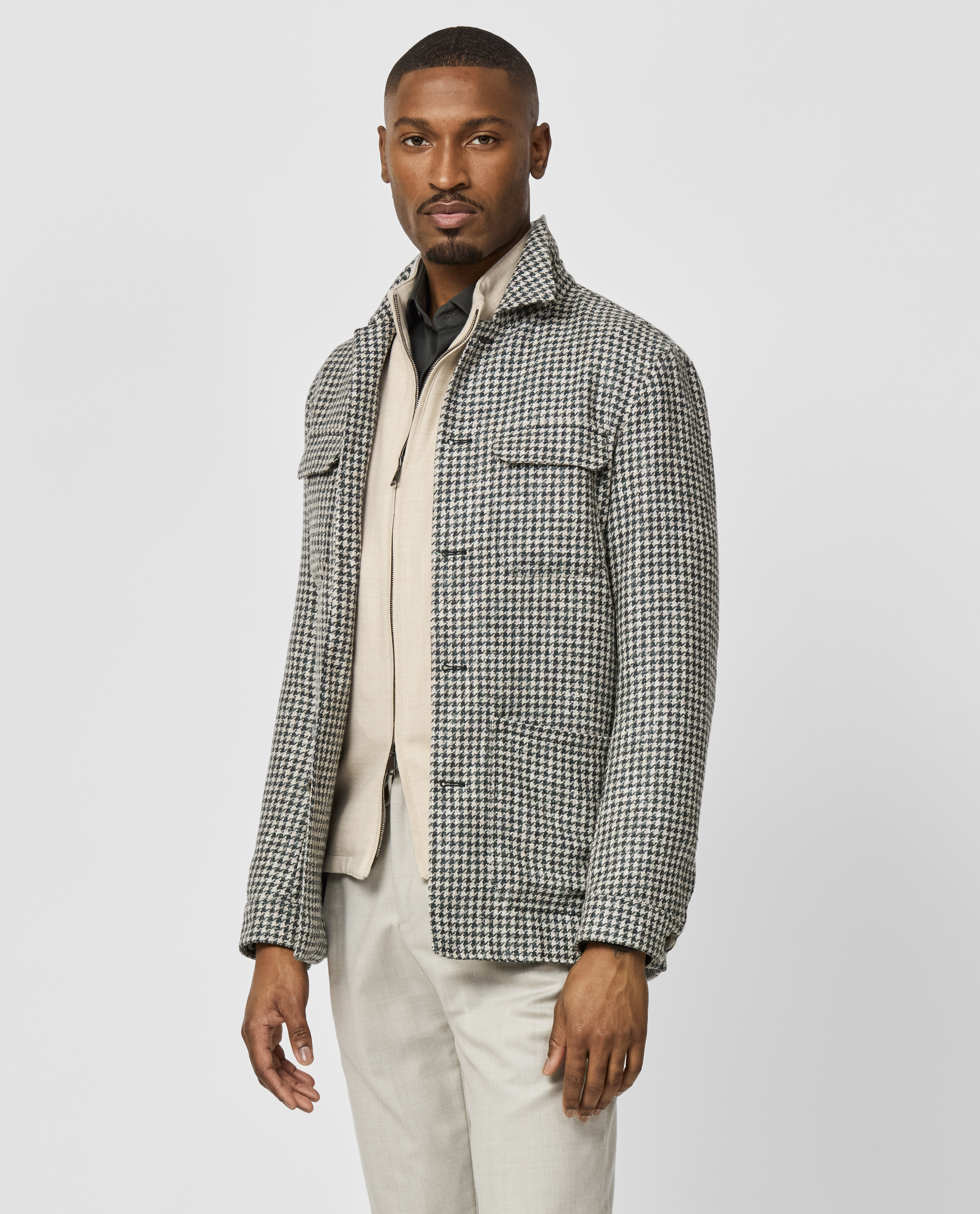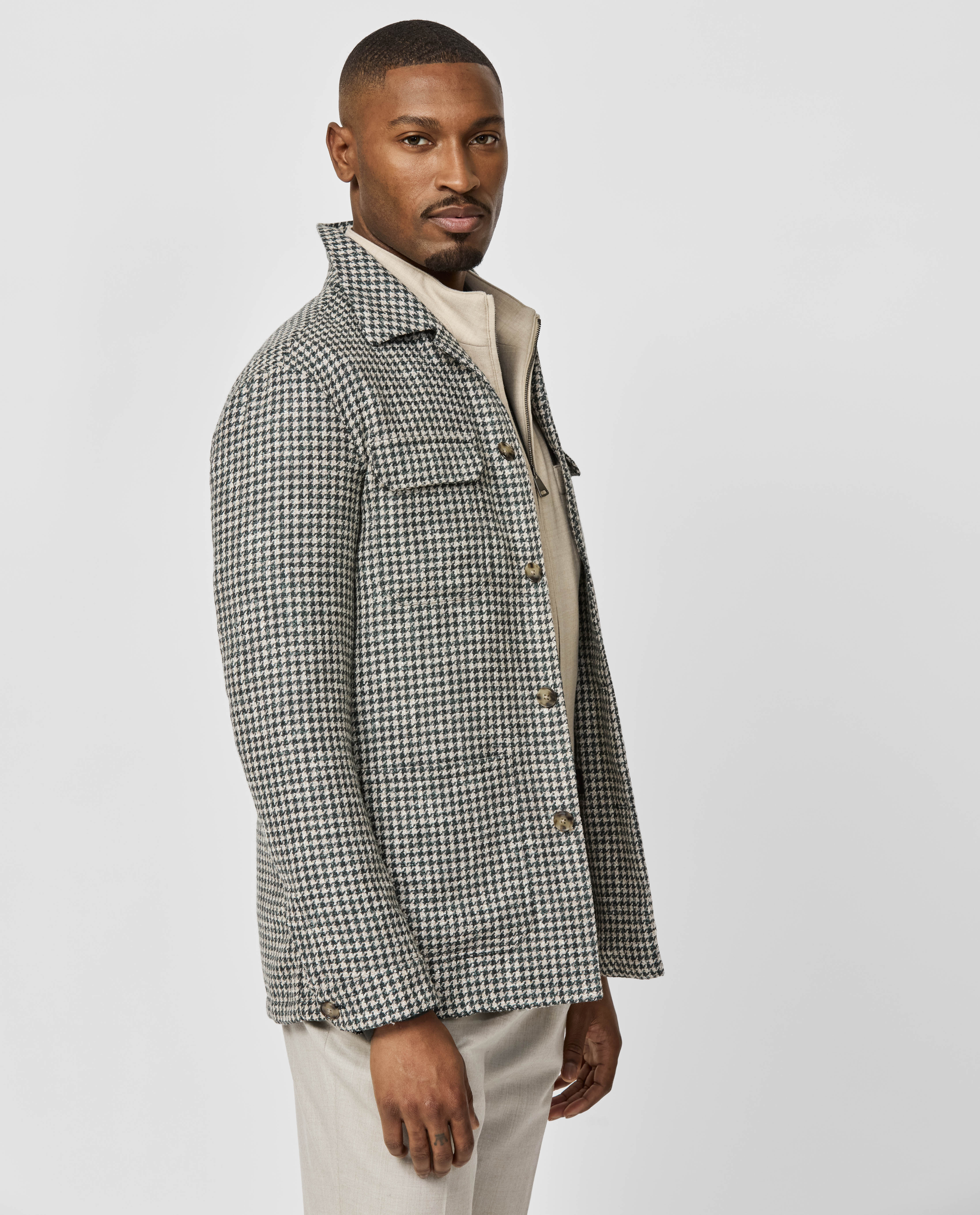 This jade green and bone houndstooth offers up a luxe and intriguing twist on a classic. Made from a soft blend of flamed merino wool yarns twisted with baby alpaca and linen for a tweed-like dimension. Designed here as a utility jacket with four practical pockets. Style it with a knitted shirt, vest, flannel trousers and suede shoes to complete the look. Make this jacket your own with our many customization options. Merino wool, baby alpaca, & linen Luxury blend Houndstooth Soft feel