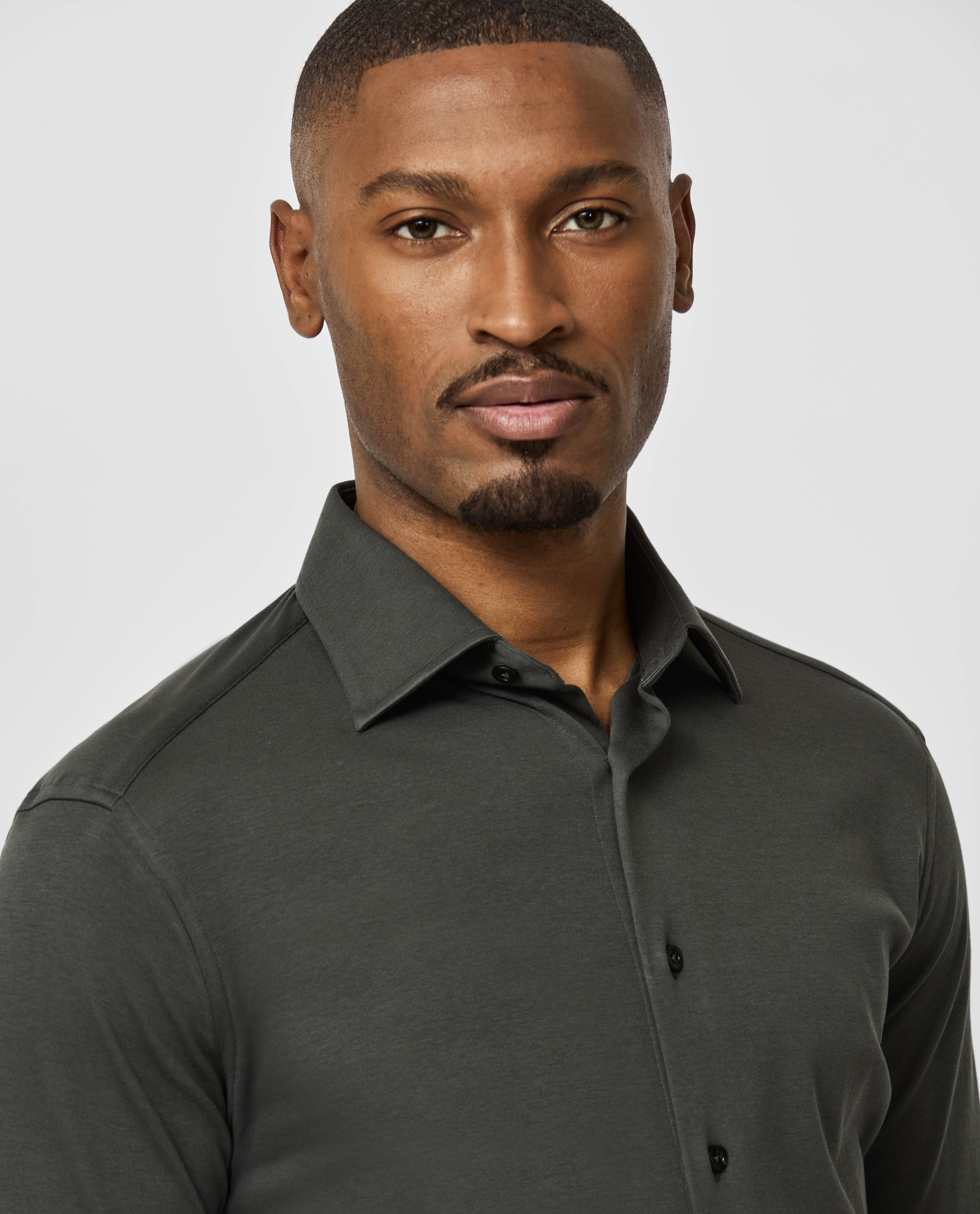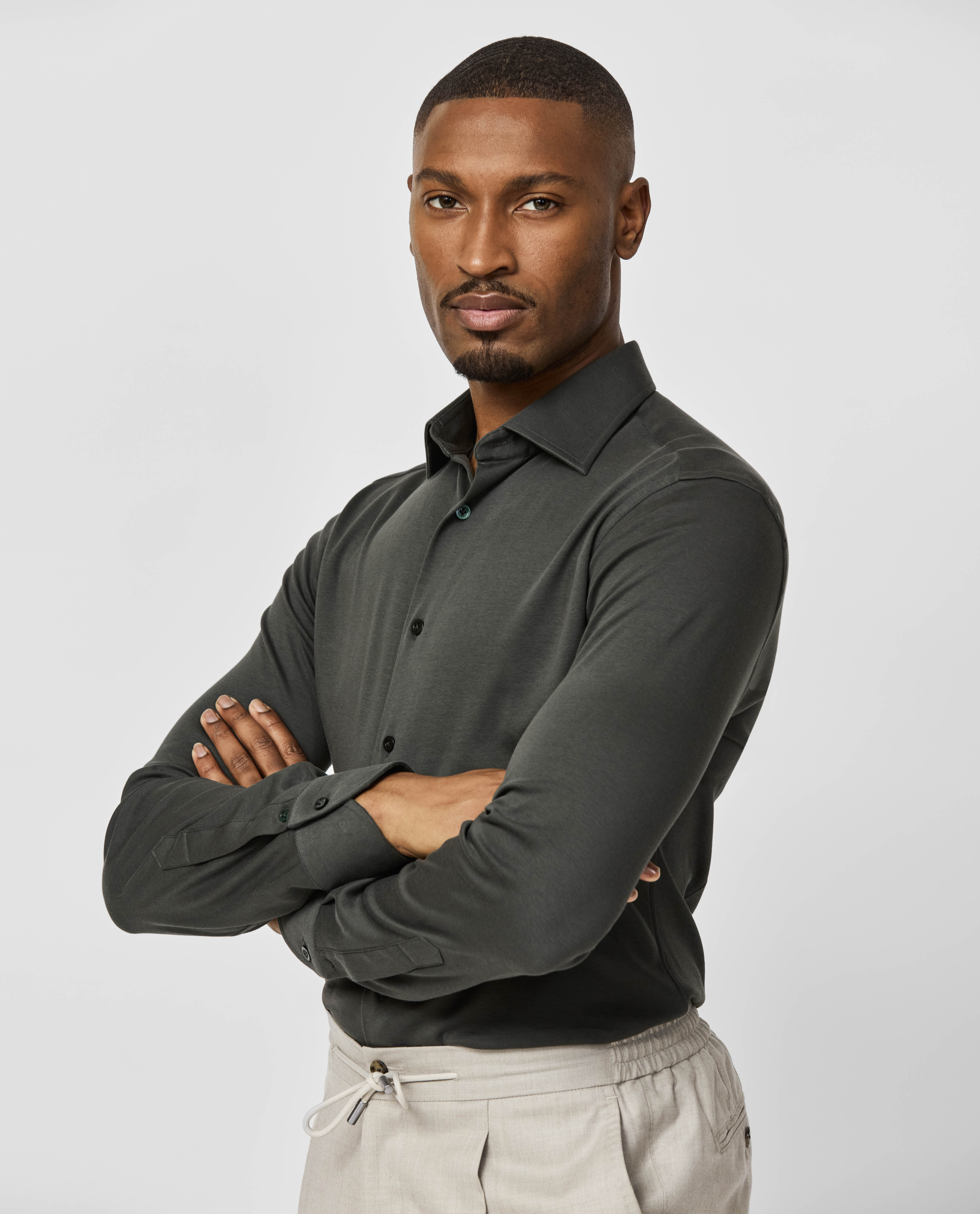 This dark olive green shirt is a comfortable classic. Made from soft 100% GOTS-certified organic cotton in a stretchy interlock knit. Designed here with a semi-cutaway collar. Make this shirt your own with our many customization options to choose from. 100% organic cotton Interlock knit Natural stretch