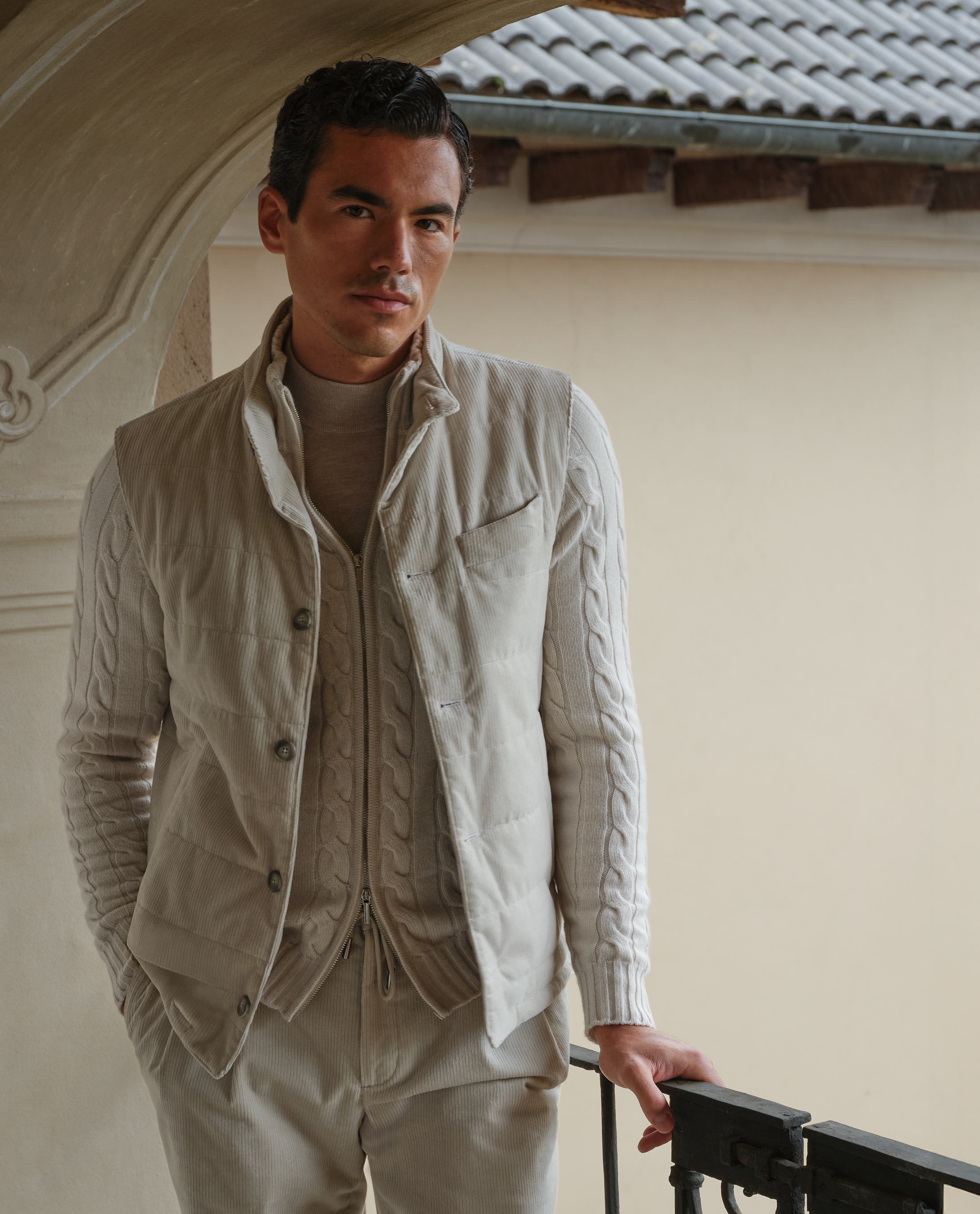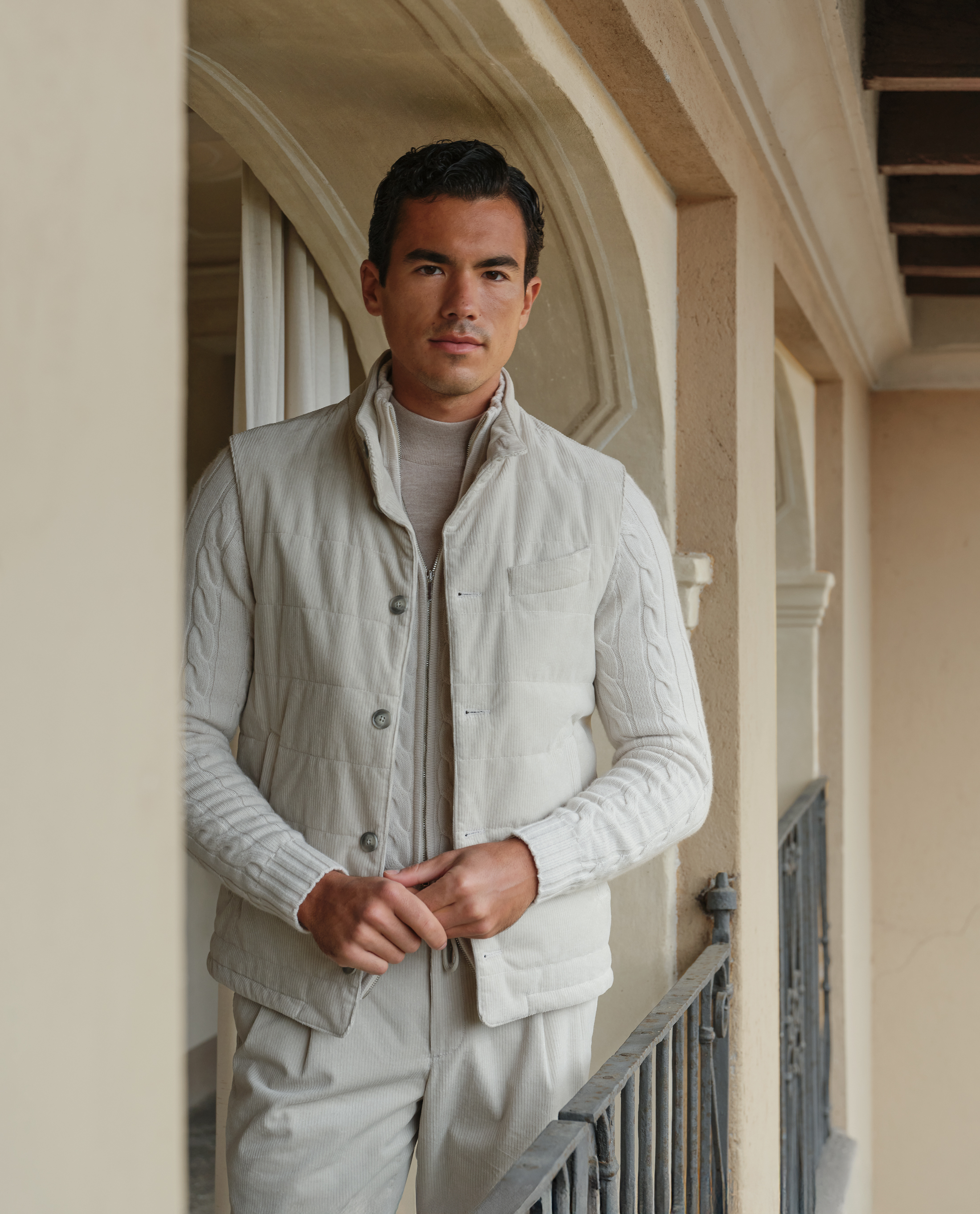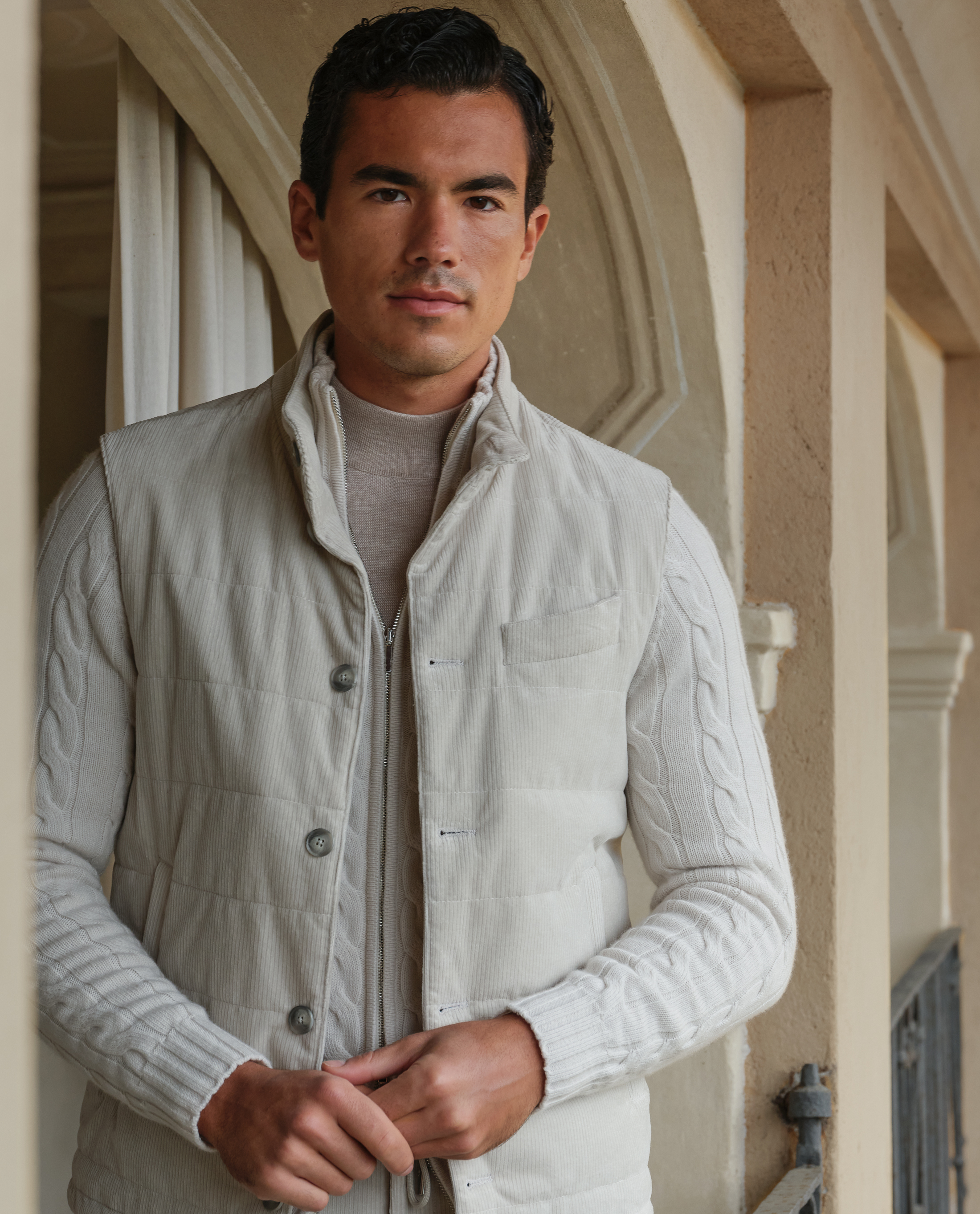 This refined winter palette harmonizes the tactile luxury of cashmere, cotton corduroy, and cashmere-silk blends. A mock neck layered beneath a full-zip knit paired with insulating trousers creates the perfect winter foundation. Warm, buttery, and inviting, the ice grey stretch cotton corduroy vest adds the ideal elegant finishing touch.