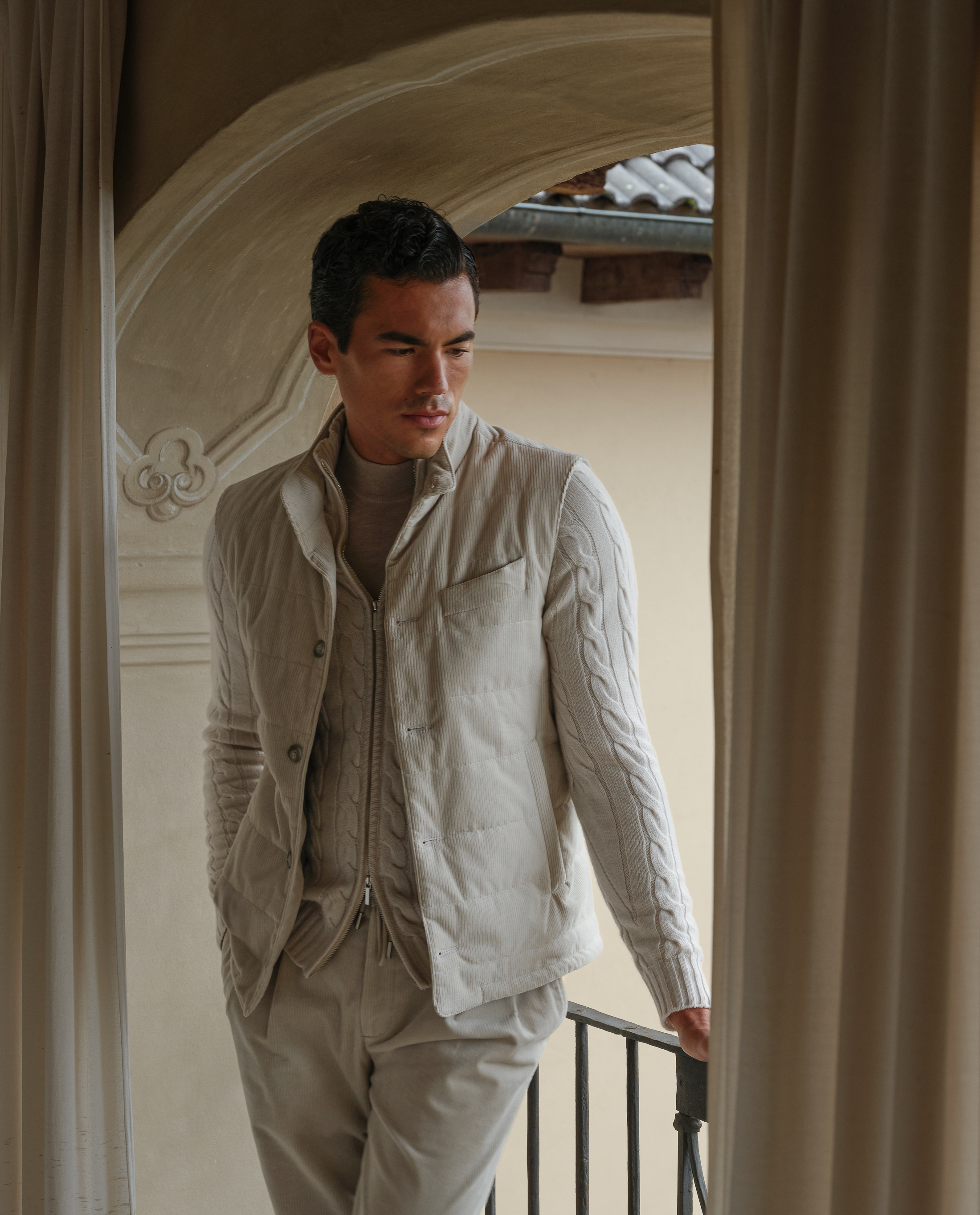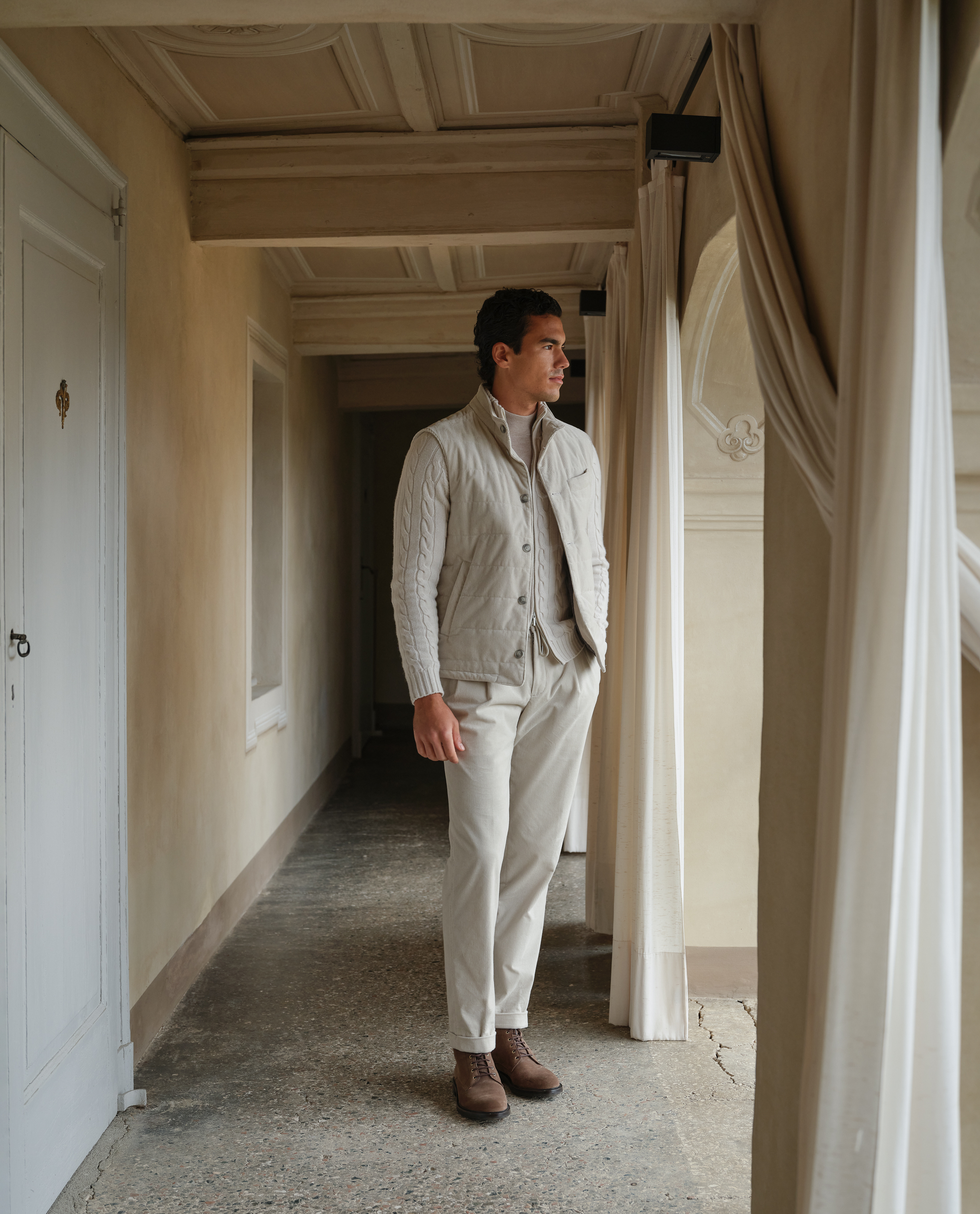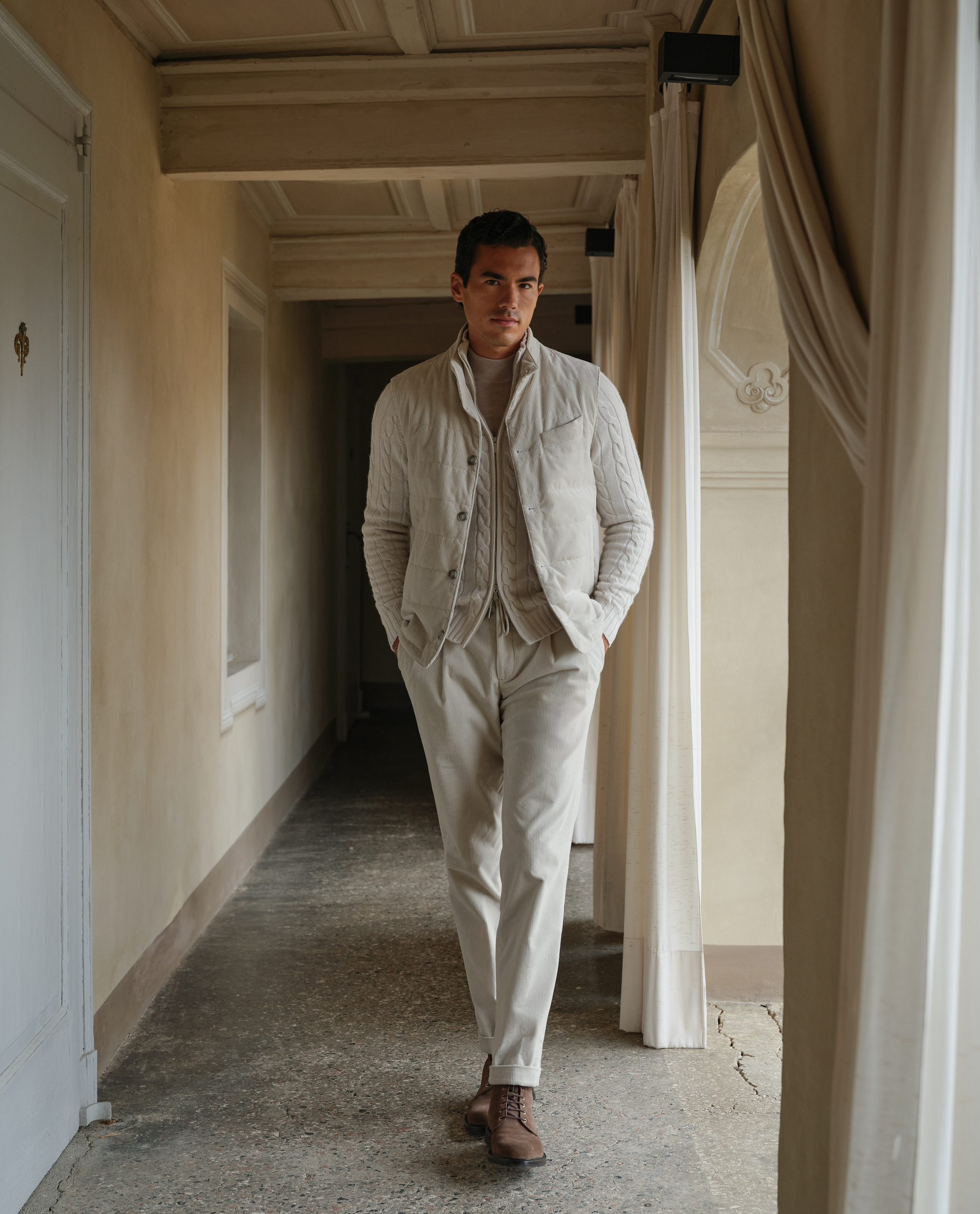 This refined winter palette harmonizes the tactile luxury of cashmere, cotton corduroy, and cashmere-silk blends. A mock neck layered beneath a full-zip knit paired with insulating trousers creates the perfect winter foundation. Warm, buttery, and inviting, the ice grey stretch cotton corduroy vest adds the ideal elegant finishing touch.