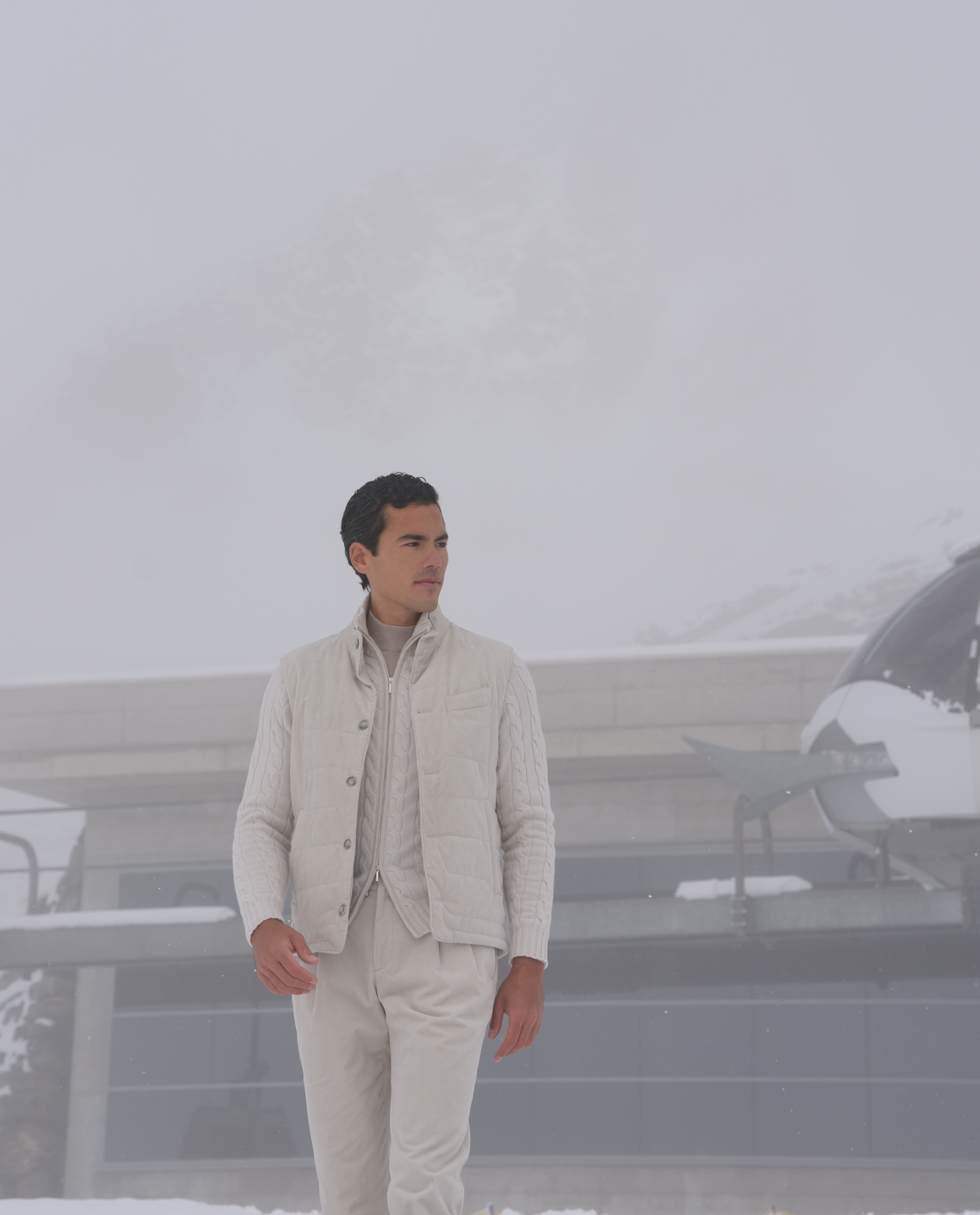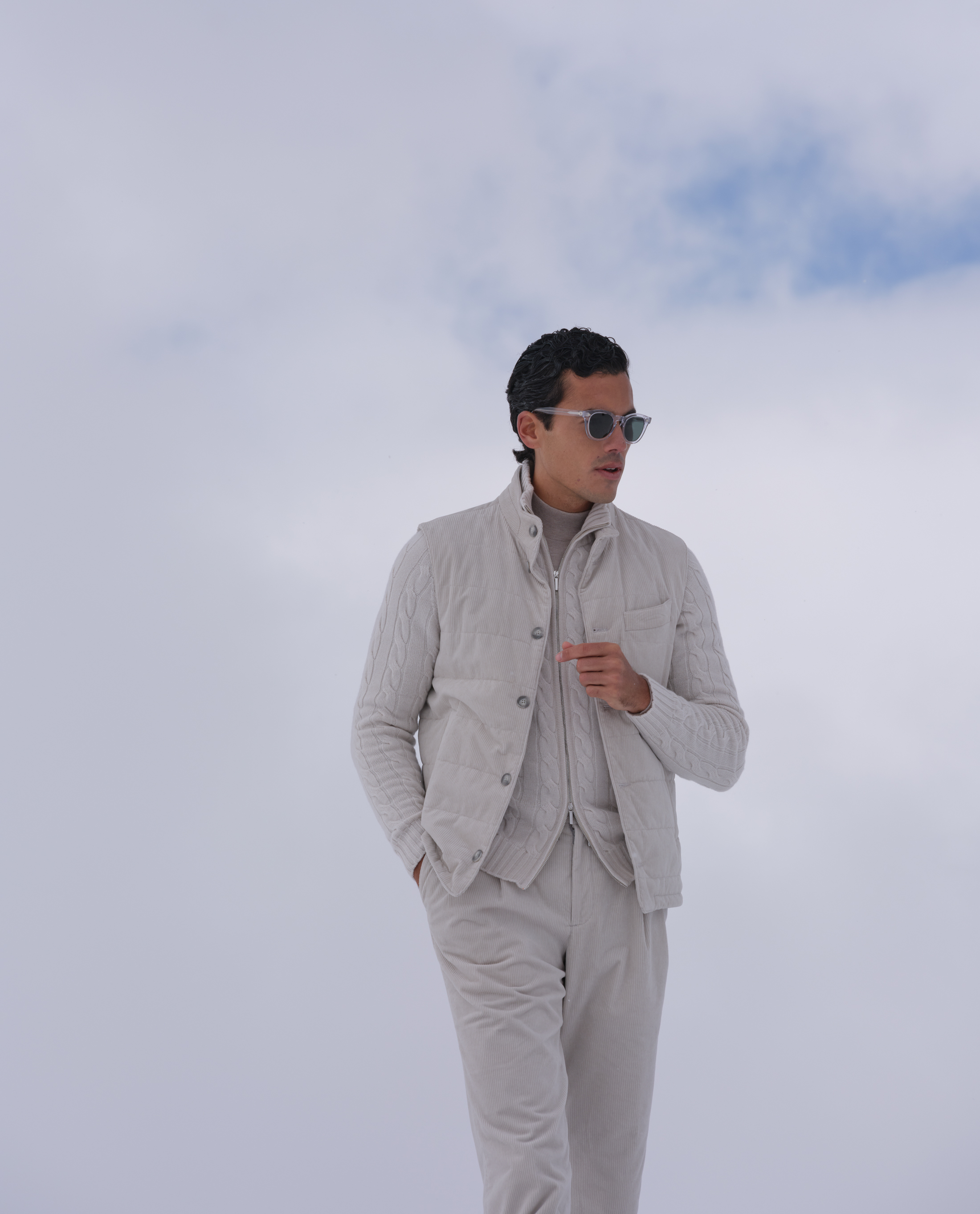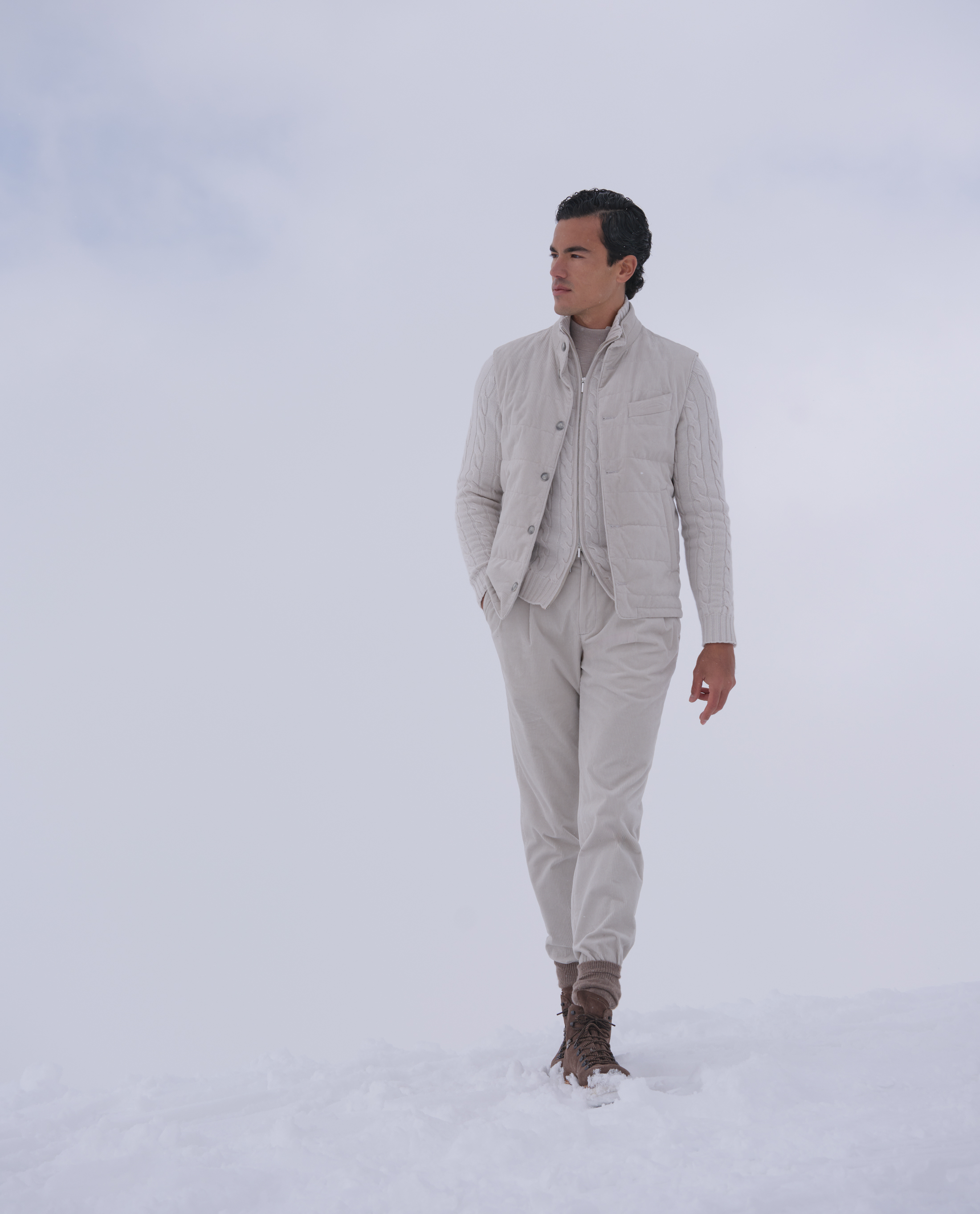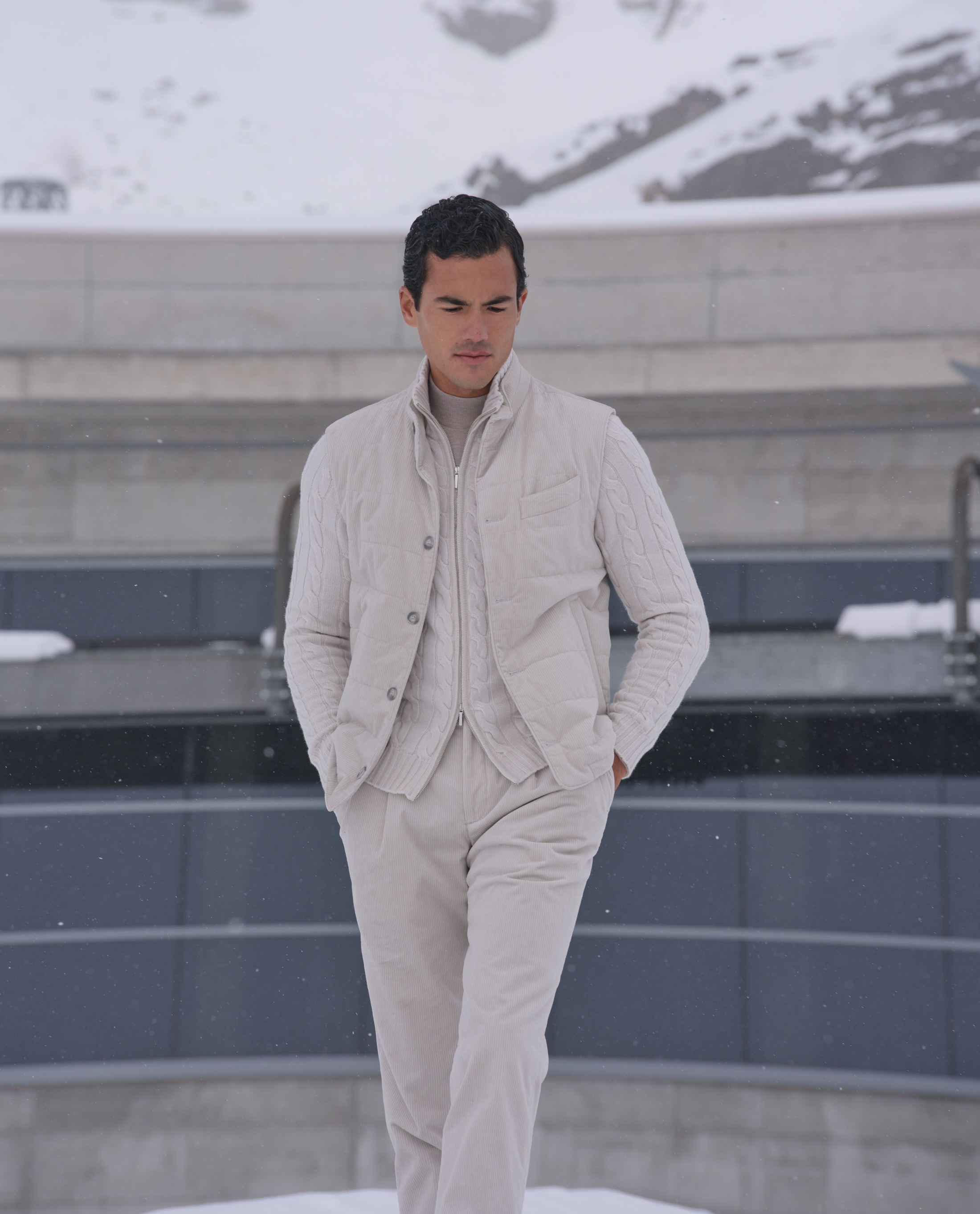 This refined winter palette harmonizes the tactile luxury of cashmere, cotton corduroy, and cashmere-silk blends. A mock neck layered beneath a full-zip knit paired with insulating trousers creates the perfect winter foundation. Warm, buttery, and inviting, the ice grey stretch cotton corduroy vest adds the ideal elegant finishing touch.