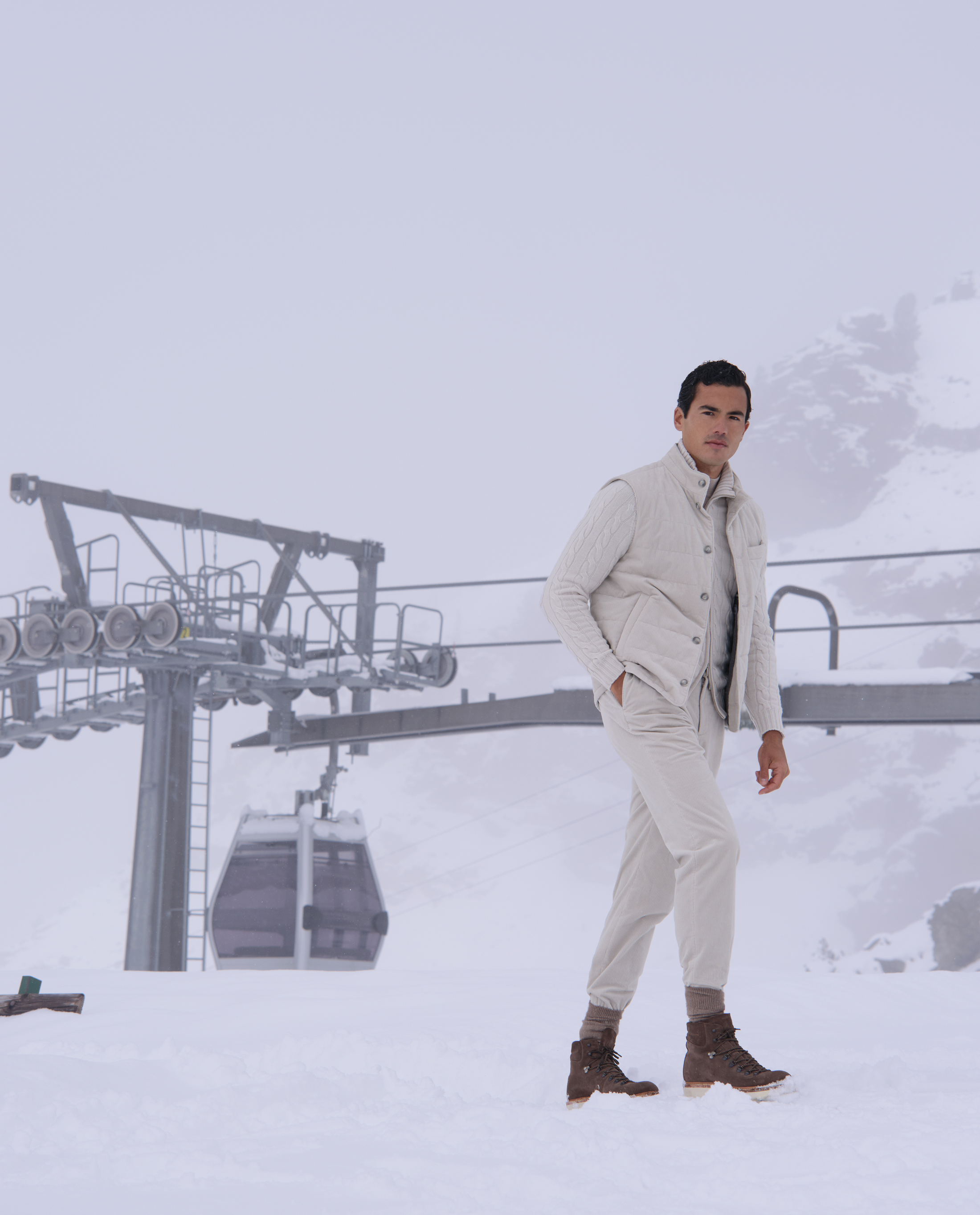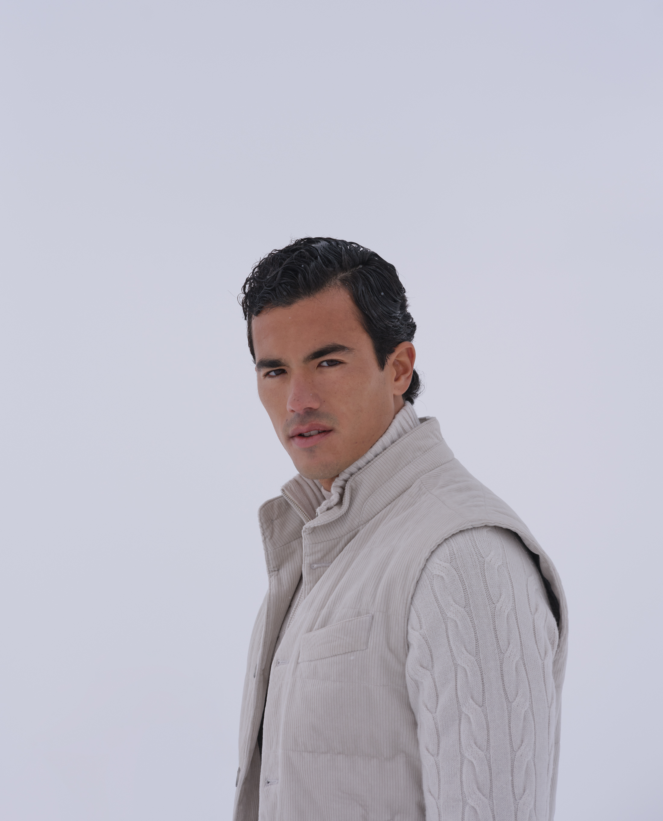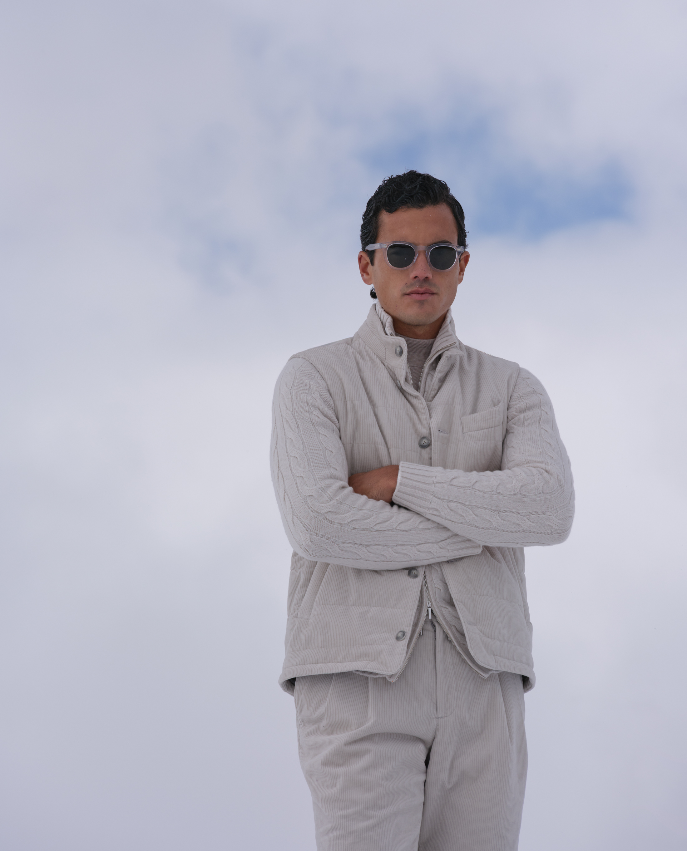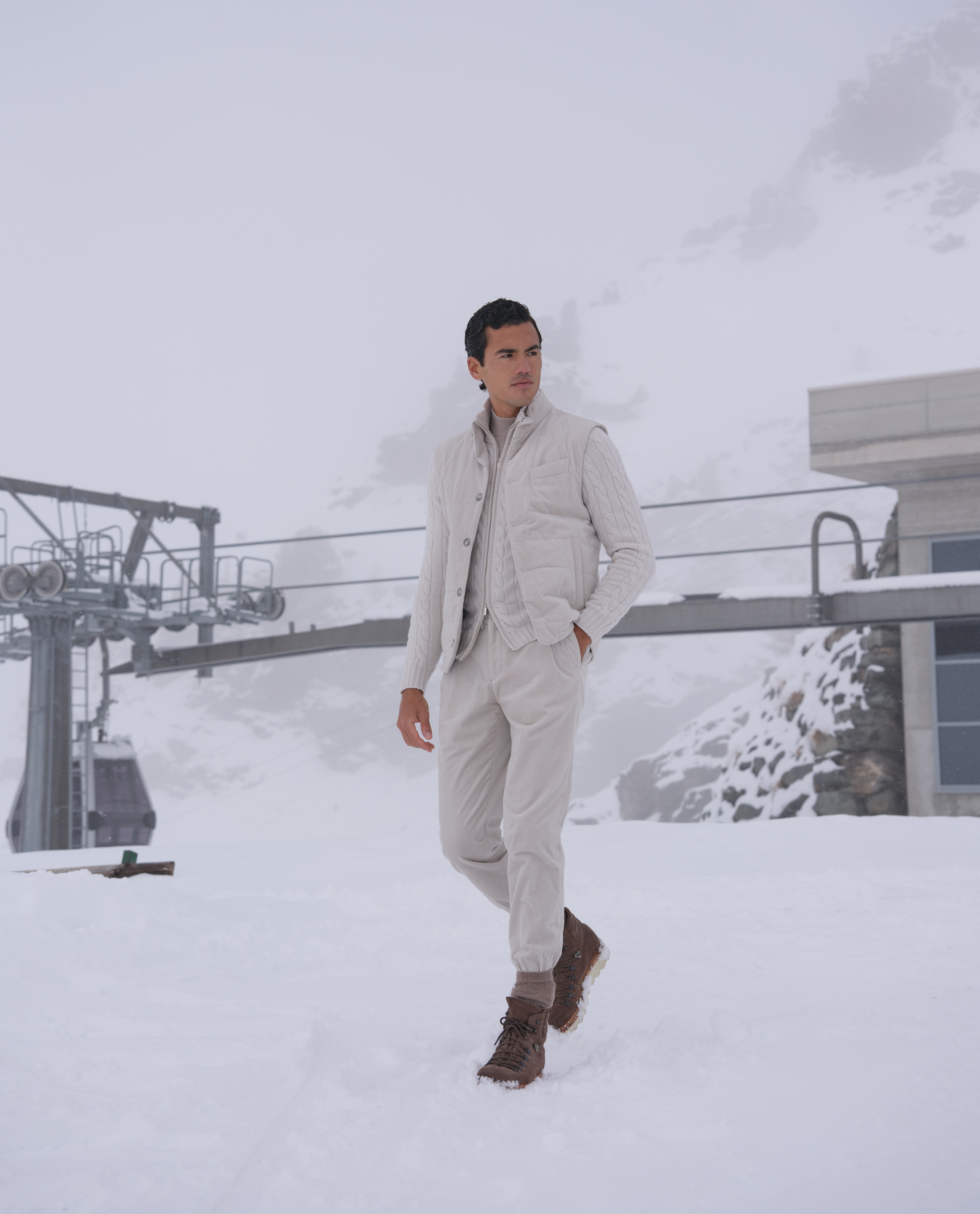 This refined winter palette harmonizes the tactile luxury of cashmere, cotton corduroy, and cashmere-silk blends. A mock neck layered beneath a full-zip knit paired with insulating trousers creates the perfect winter foundation. Warm, buttery, and inviting, the ice grey stretch cotton corduroy vest adds the ideal elegant finishing touch.