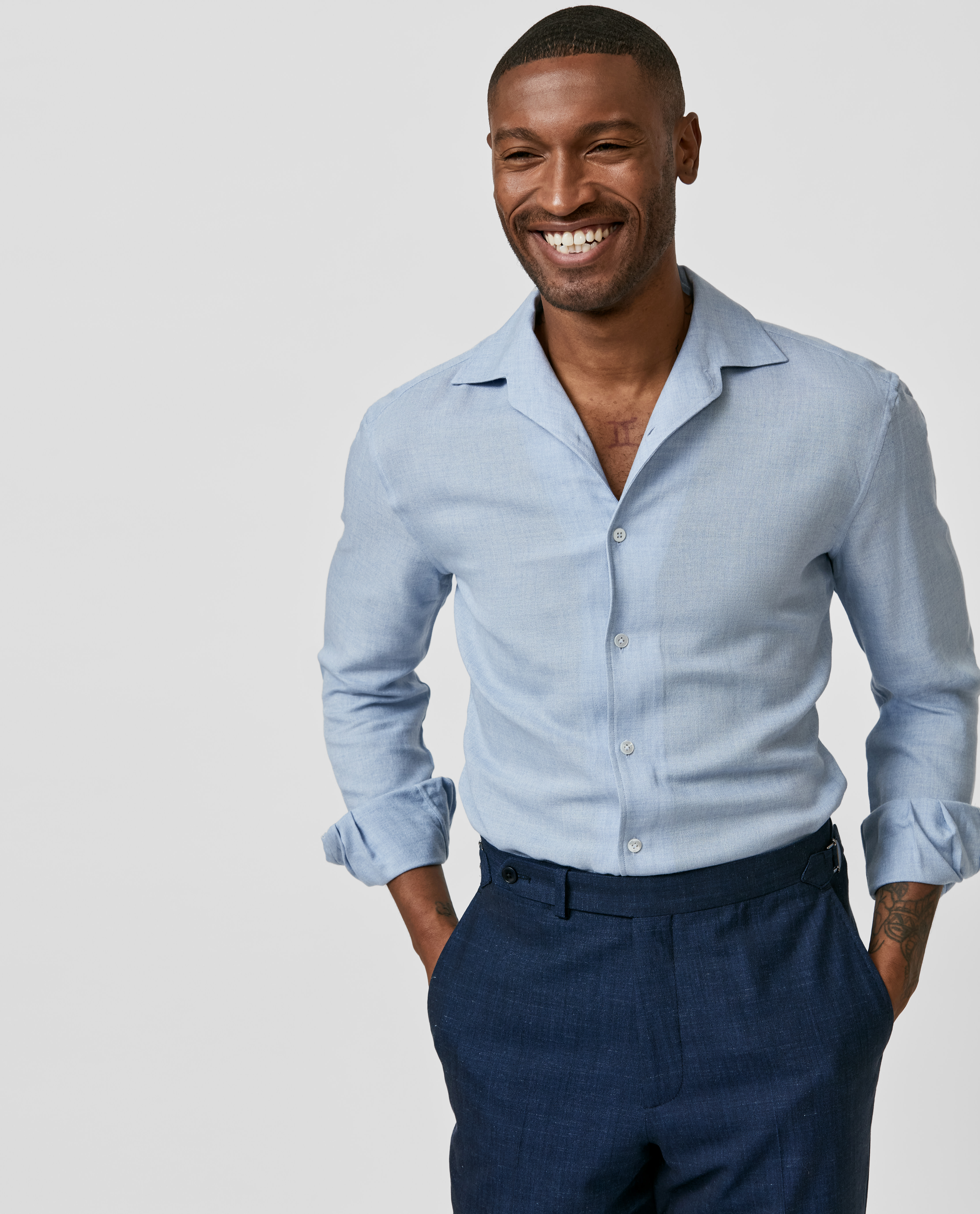 Relaxed summer days are complete with this multi-functional mouliné shirt in light blue. The unique blend combines the softness and elegant drape of modal with the thermoregulation and moisture management of merino wool. Together the fabric possesses a natural stretch for enhanced crease resistance and comfort too. Designed here with a one-piece collar. Make this shirt your own with our many customization options to choose from. Modal & merino wool Natural stretch Elegant drape Breathable Crease resistant