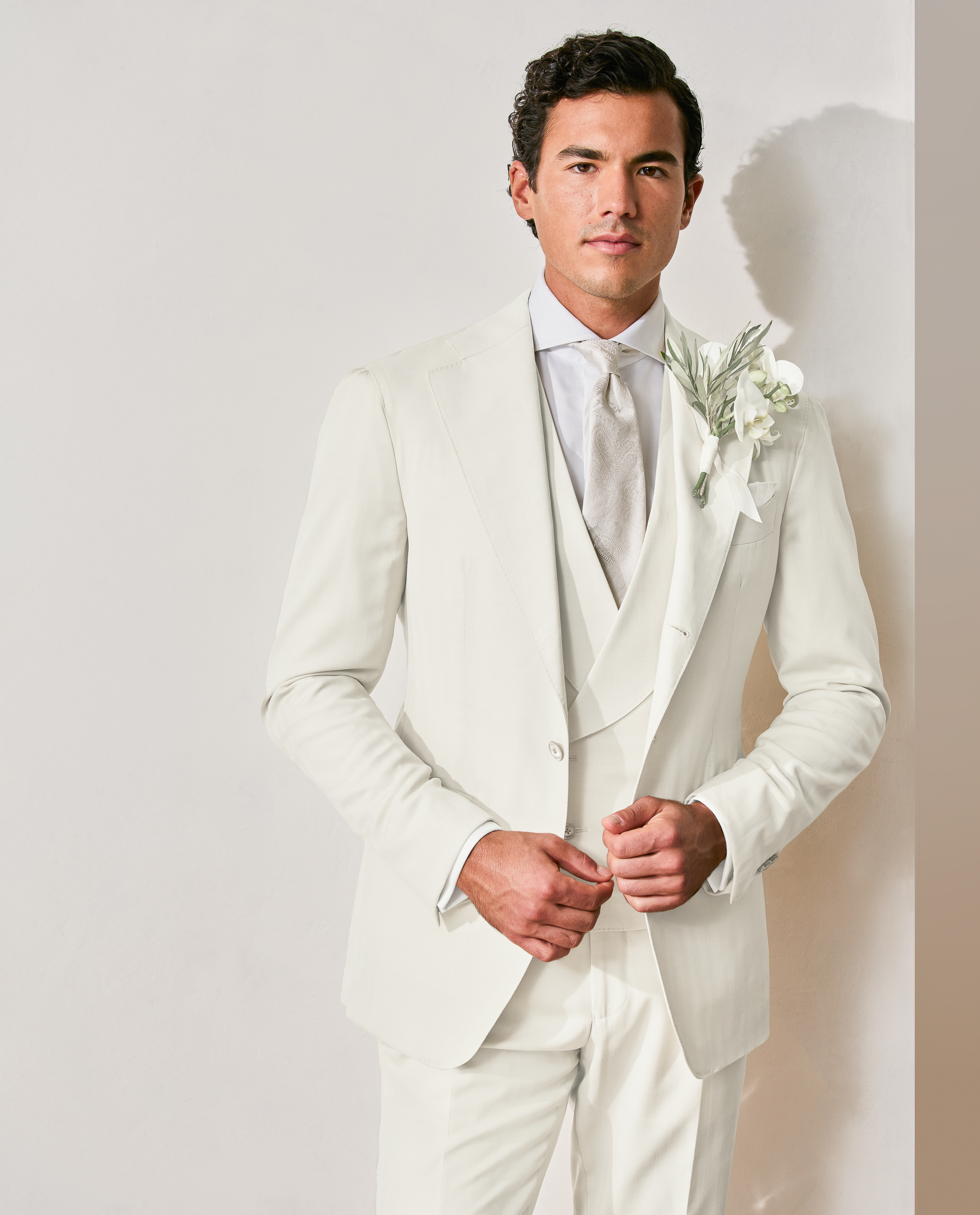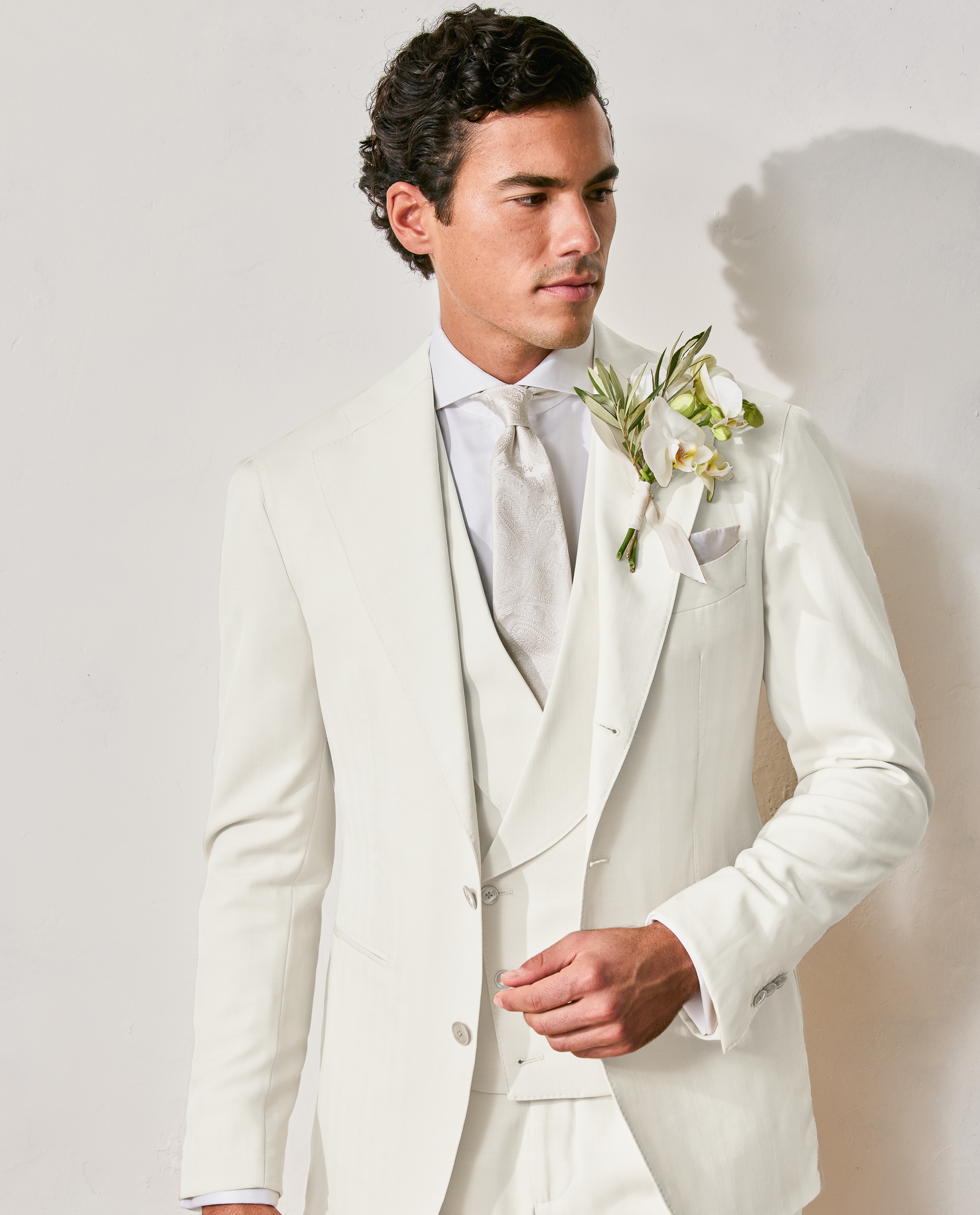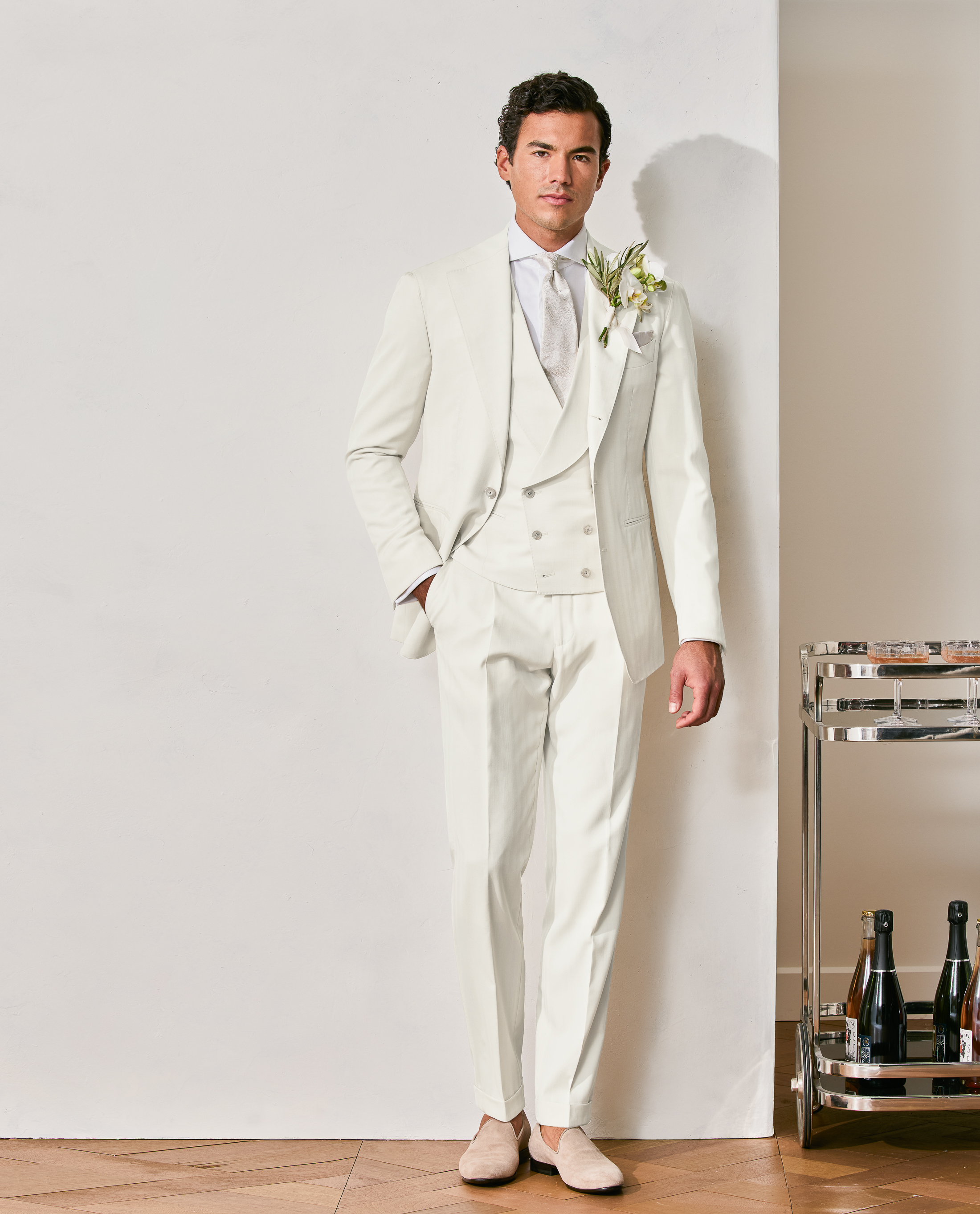 Say “I do” to timeless sophistication with this three-piece ivory suit. Tailored from lightweight and highly breathable S130 wool with natural bi-stretch, its Solaro herringbone weave lends a subtle pattern and elevated finish that shimmers softly in the light. Styled here with a white cotton dobby shirt and pearl paisley silk tie for a standout take on the all-white aesthetic.