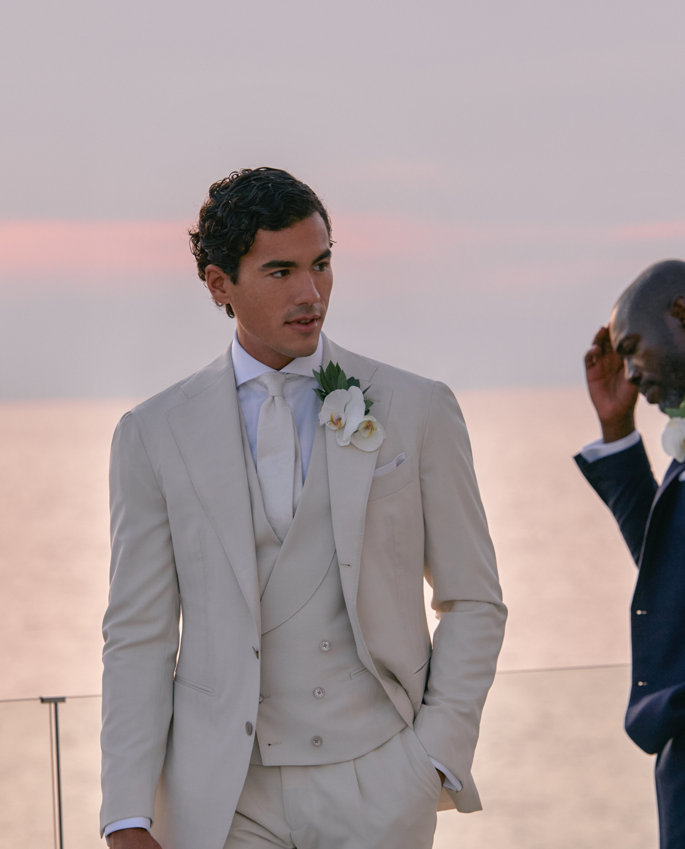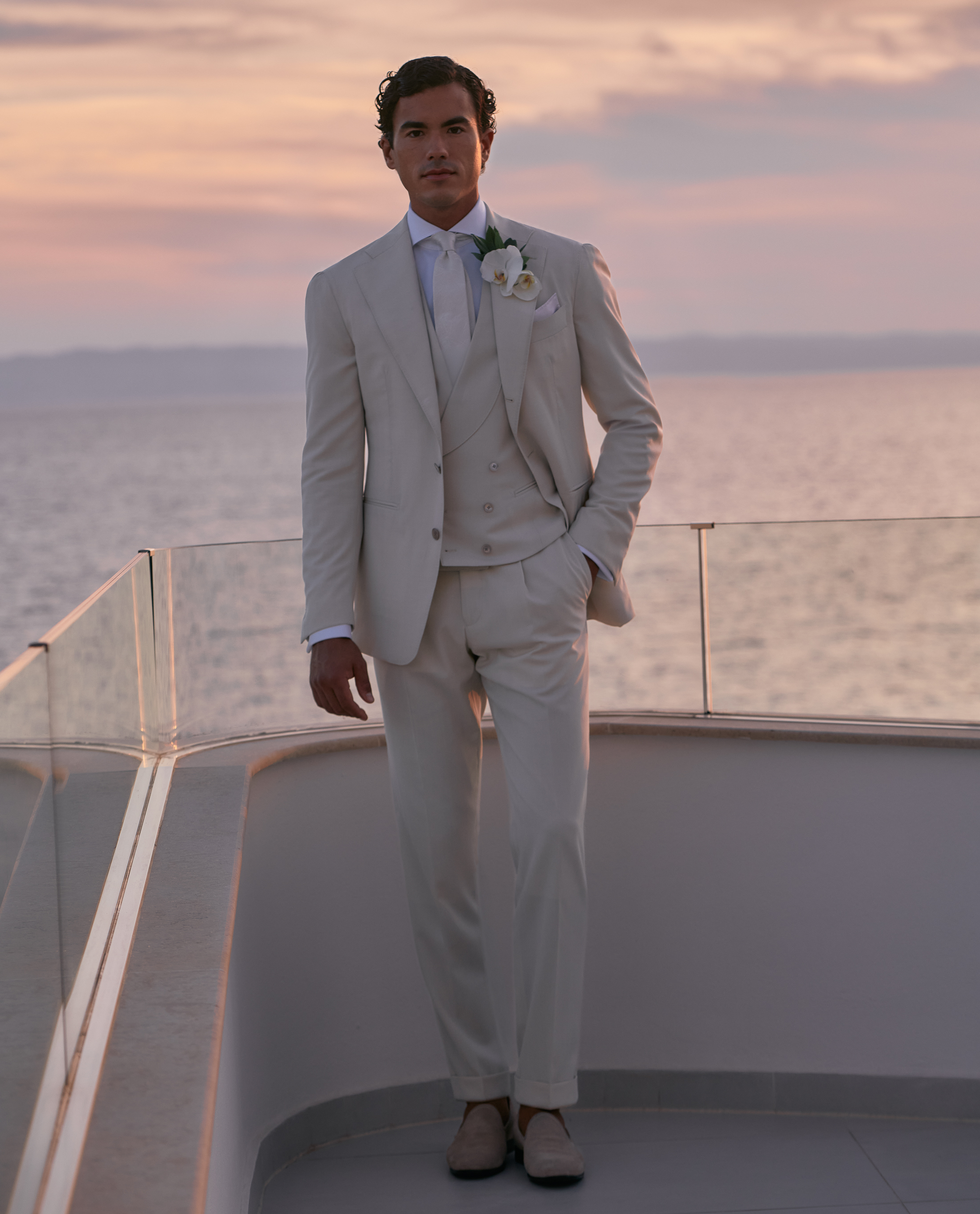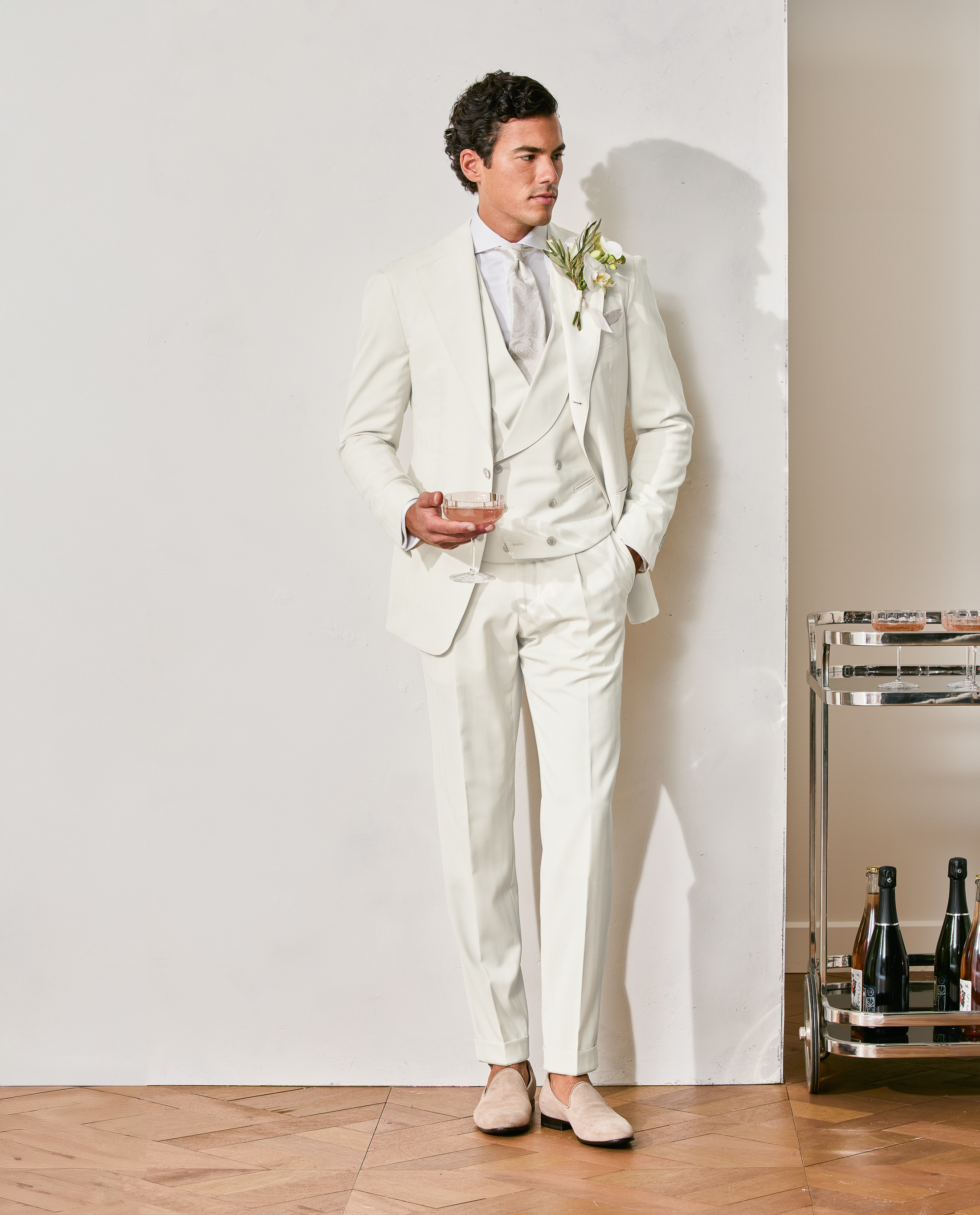 Say “I do” to timeless sophistication with this three-piece ivory suit. Tailored from lightweight and highly breathable S130 wool with natural bi-stretch, its Solaro herringbone weave lends a subtle pattern and elevated finish that shimmers softly in the light. Styled here with a white cotton dobby shirt and pearl paisley silk tie for a standout take on the all-white aesthetic.